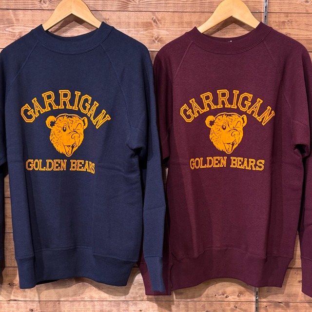 WAREHOUSE ウエアハウス 「"Lot 409 GARRIGAN"」 1950年代にはスポーツウェアとしてのスウエットシャツがラグランスリーブになり、ガゼットの補強がなくなったシンプルモデルが誕生しました。そして1960年代には様々な技法でこのスウエットにレタリングが描かれます。ラグランスリーブのステッチが効いたオーセンティックなスウエットです。 フロッキープリント LOT:409 GARRIGAN 素材:COTTON 100% カラー:ネイビー、エンジ プライス:¥17,600 サイズ:40(M),42(L),44(XL) SIZE:40 裄丈84.5cm 身幅54cm 着丈63cm SIZE:42 裄丈86.5cm 身幅59cm 着丈65cm SIZE:44 裄丈87.5cm 身幅60.5cm 着丈67cm *多少の誤差はご了承ください *洗いにより縮みが生じます