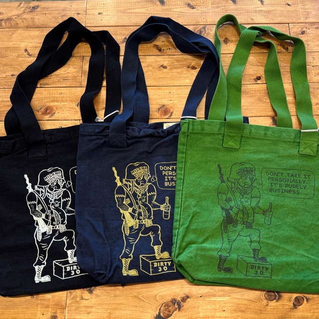 COLIMBO コリンボ 「CARNEGIE LIBRARY TOTE "Dirty Thirty"」 アメリカの図書館や資料館などではお馴染みのライトトートバッグ。ベースをアメリカよりインポートしたオーバーダイドタイプにプリントを施している。 肩掛けできるハンドルの長さです。 Cotton Twill LOT:ZA-0502 素材:COTTON 100% (WASH) カラー:SUMMER GREEN、NAVY、BLACK プライス:¥8,800 サイズ:高さ約33cm 上部幅約34cm 底幅約26cm 底奥行き約11cm