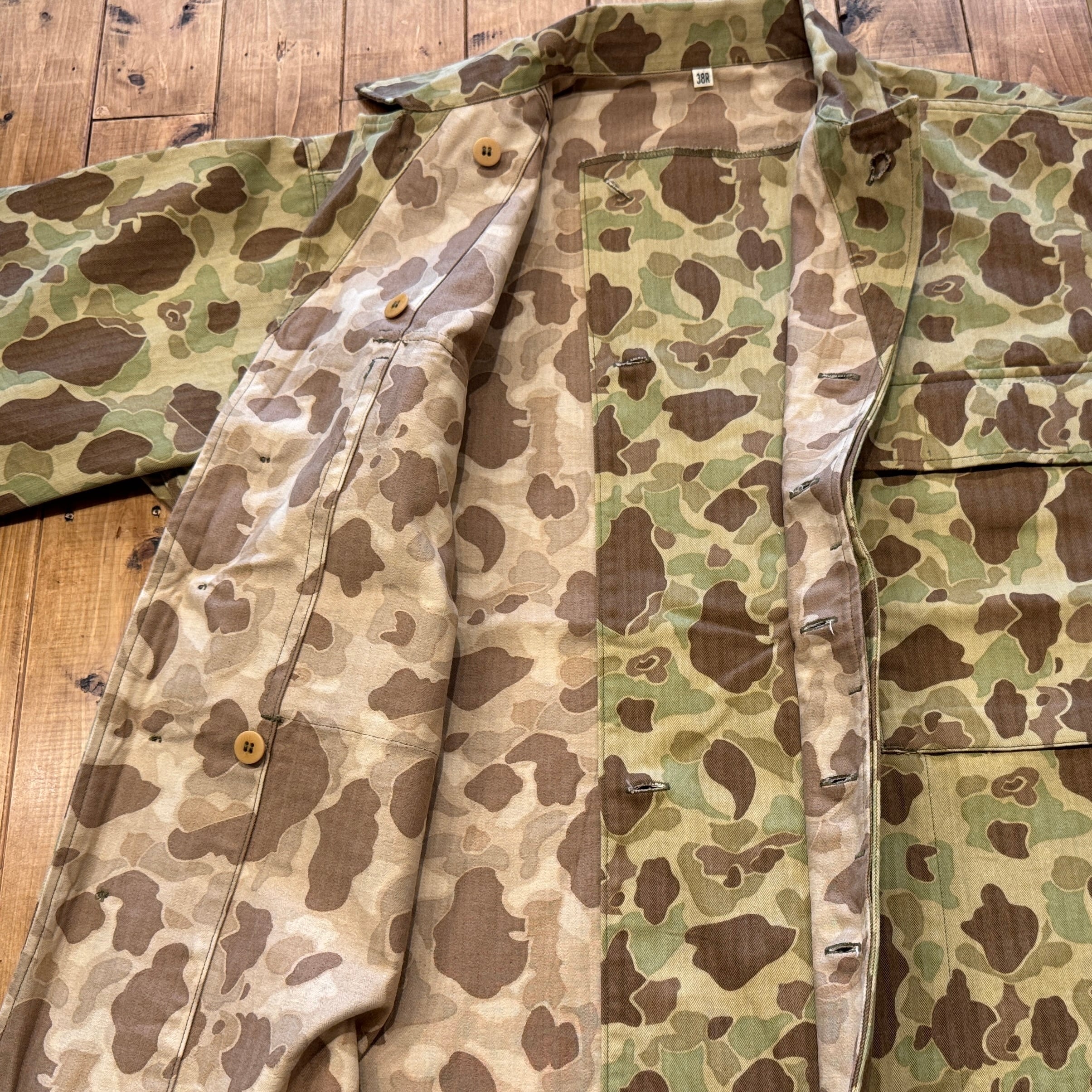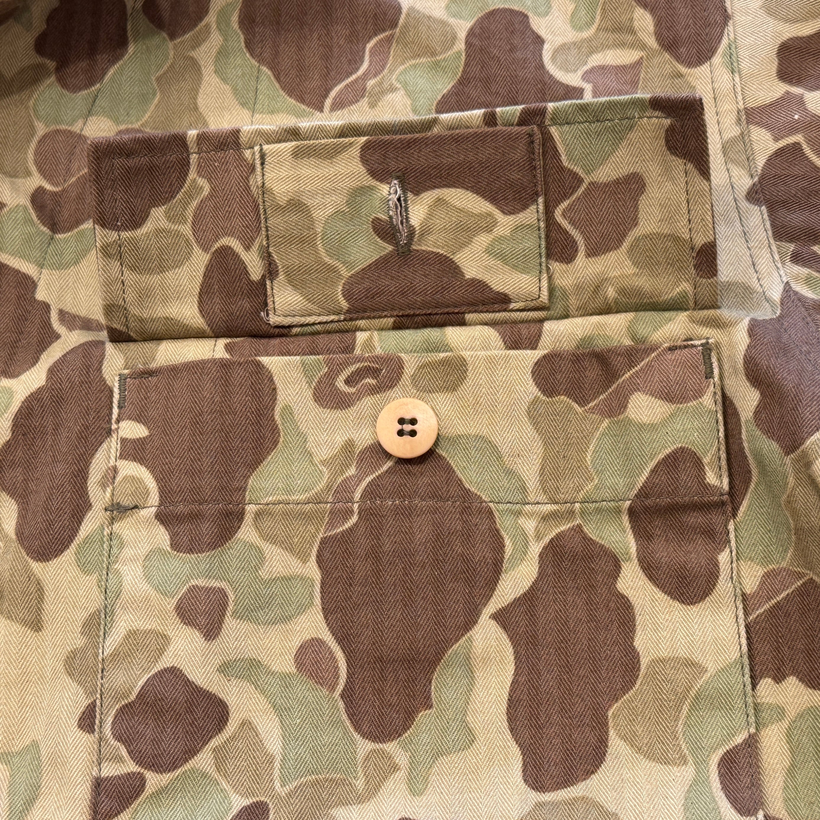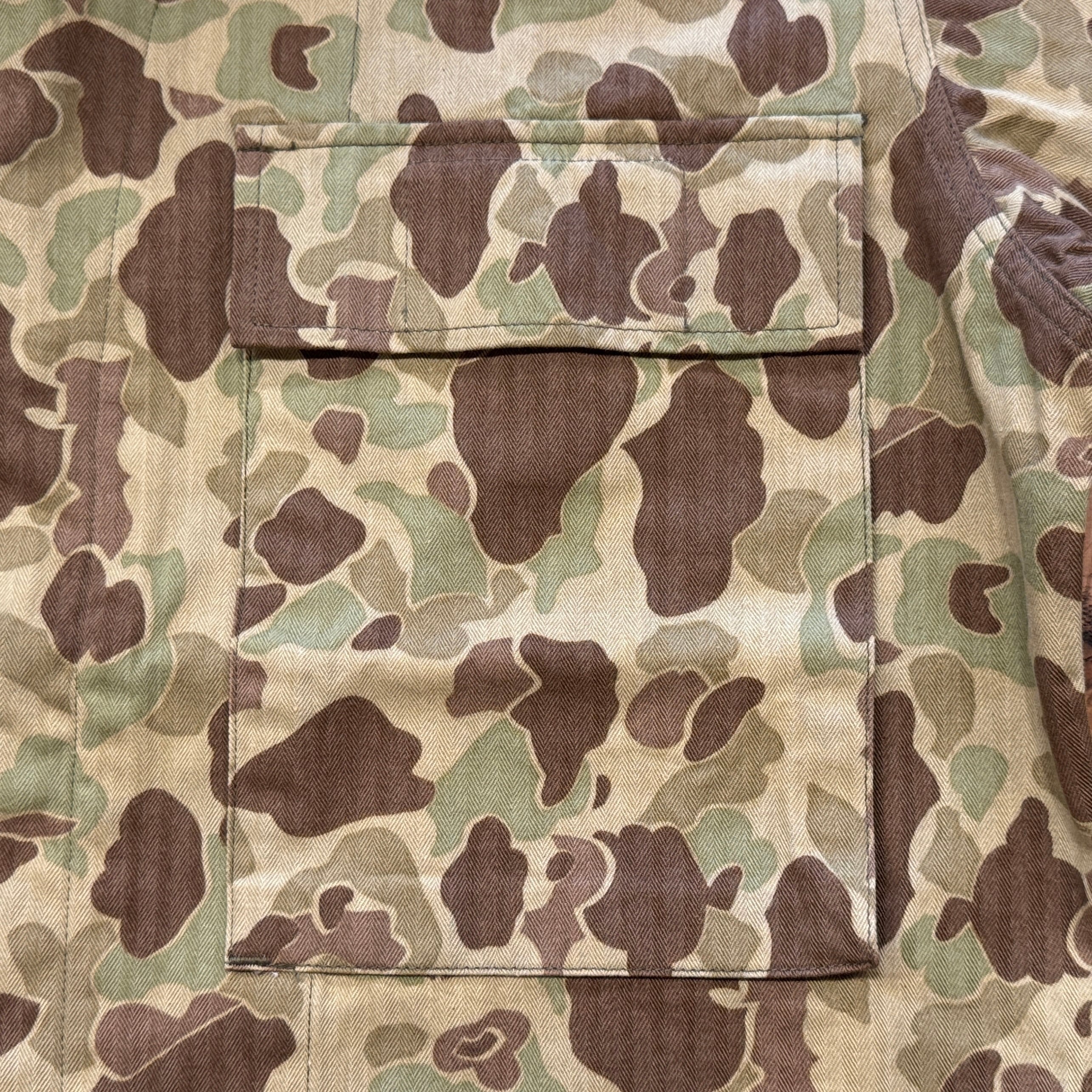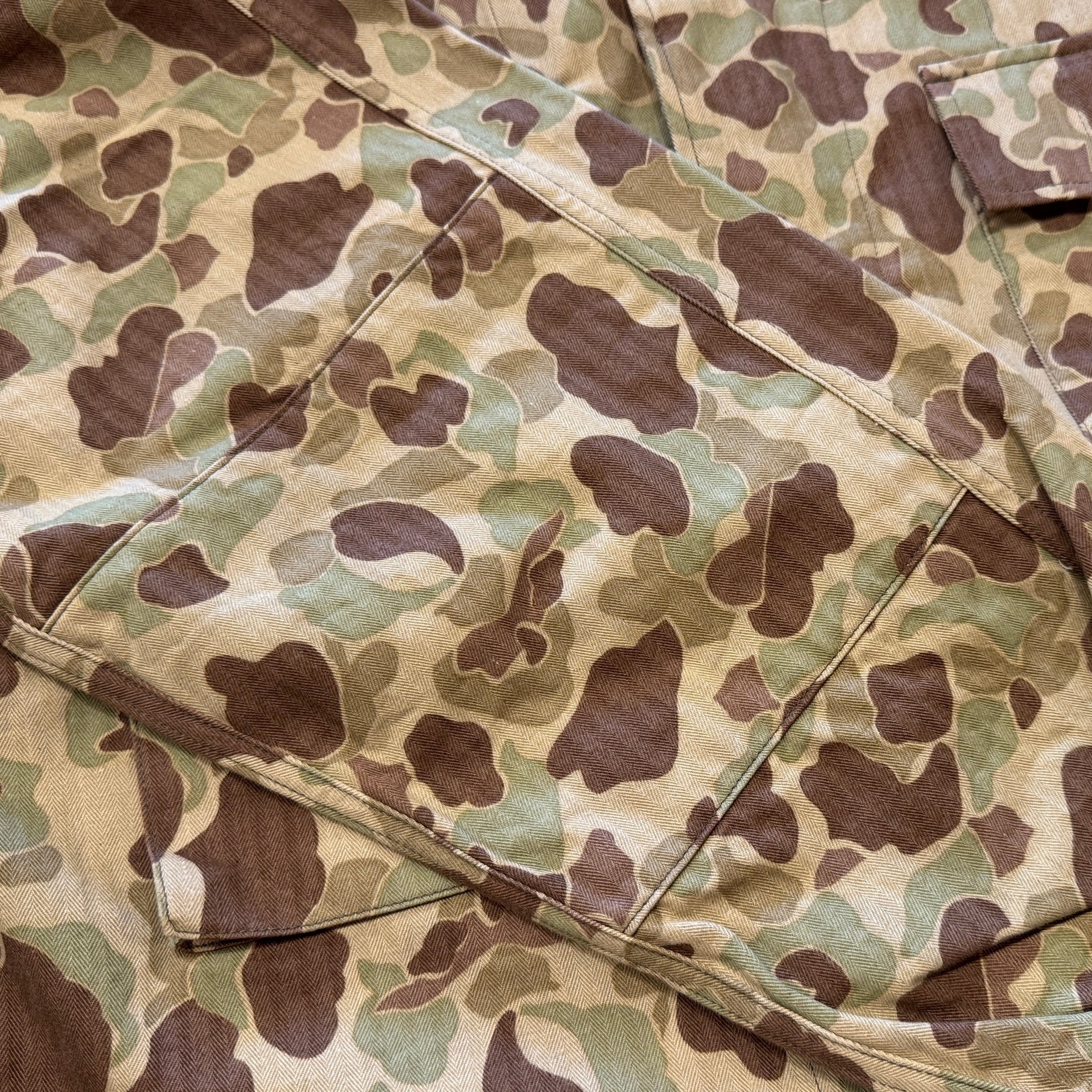 高密度が故に強度のあるヘリンボーンツイルは戦闘服や対ガス防護服に適していた。そのヘリンボーンツイルに迷彩効果を高めるため採用した米陸軍はカモフラージュ柄を1942年に採用した。その生地にはグリーンサイドとタンカラーサイドと両面にプリントしているが、リバーシブルで着用する仕様にはなっていない。胸には容量の大きい縦長のマチ付きポケットが付き、肘は補強として二重になっている。また、前立て裏には毒ガスを侵入させない防護として密閉性を高めるためのガスフラップが設けてある。いずれもグリーンサイドに設置され、タンカラーサイドはプレーンな状態である。型はこの頃採用されたオリーブドラブ色のM-43とほぼ同じ外観だが、装備品の引っ掛かりや地上を這うことを想定してボタンは隠しボタン仕様となっている。