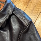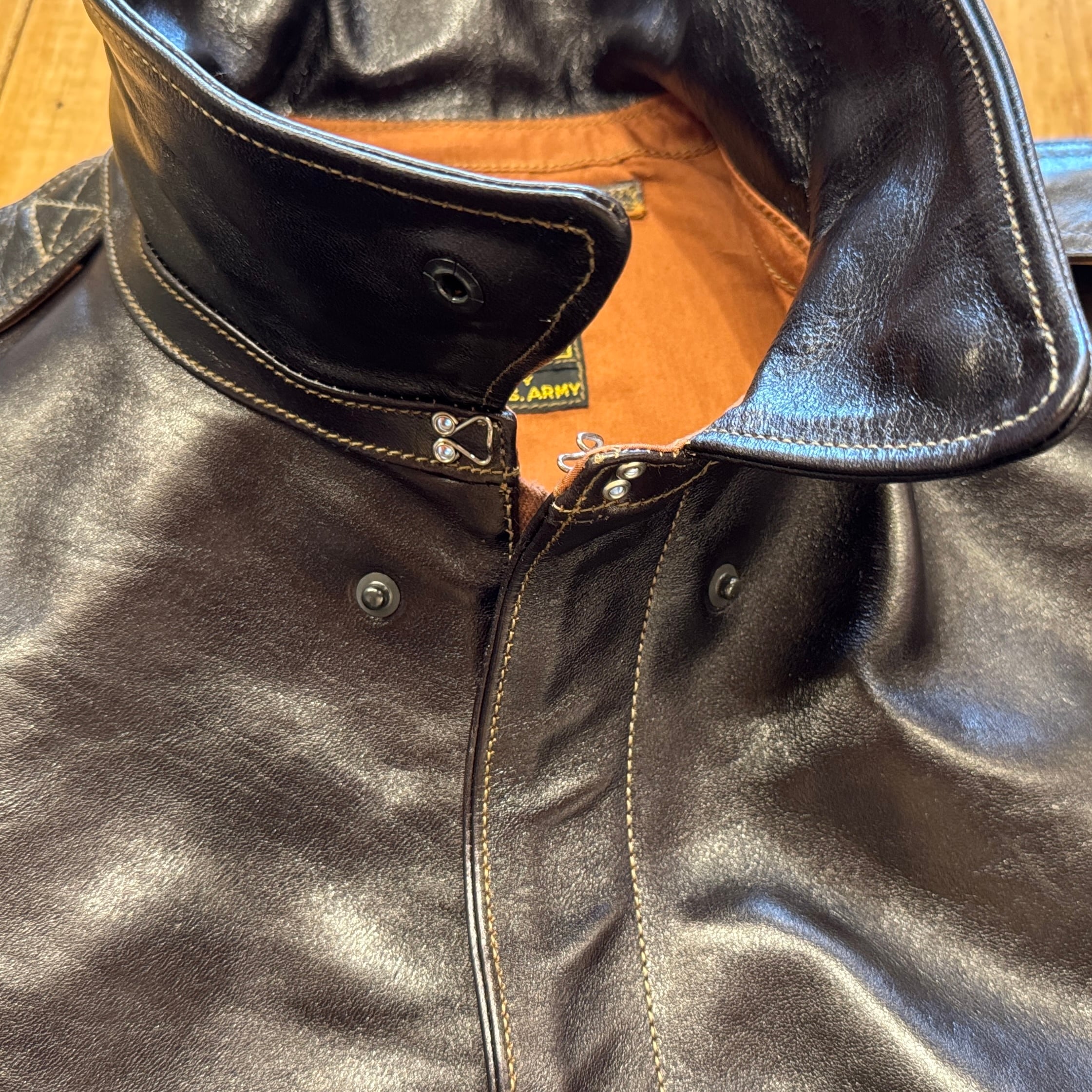 元々実物には茶色の馬革を使うと規定がありましたが、1943年発行の陸軍航空隊装備品カタログ "Class 13" にシールブラウンの馬革を使用することが明記されています。また、実物の中には濃い焦げ茶色のものも存在しています。下地に紫色の染料を入れ、その上から濃い焦げ茶色で着色する2工程で実物にもあるダークシールブラウンを再現しています。
