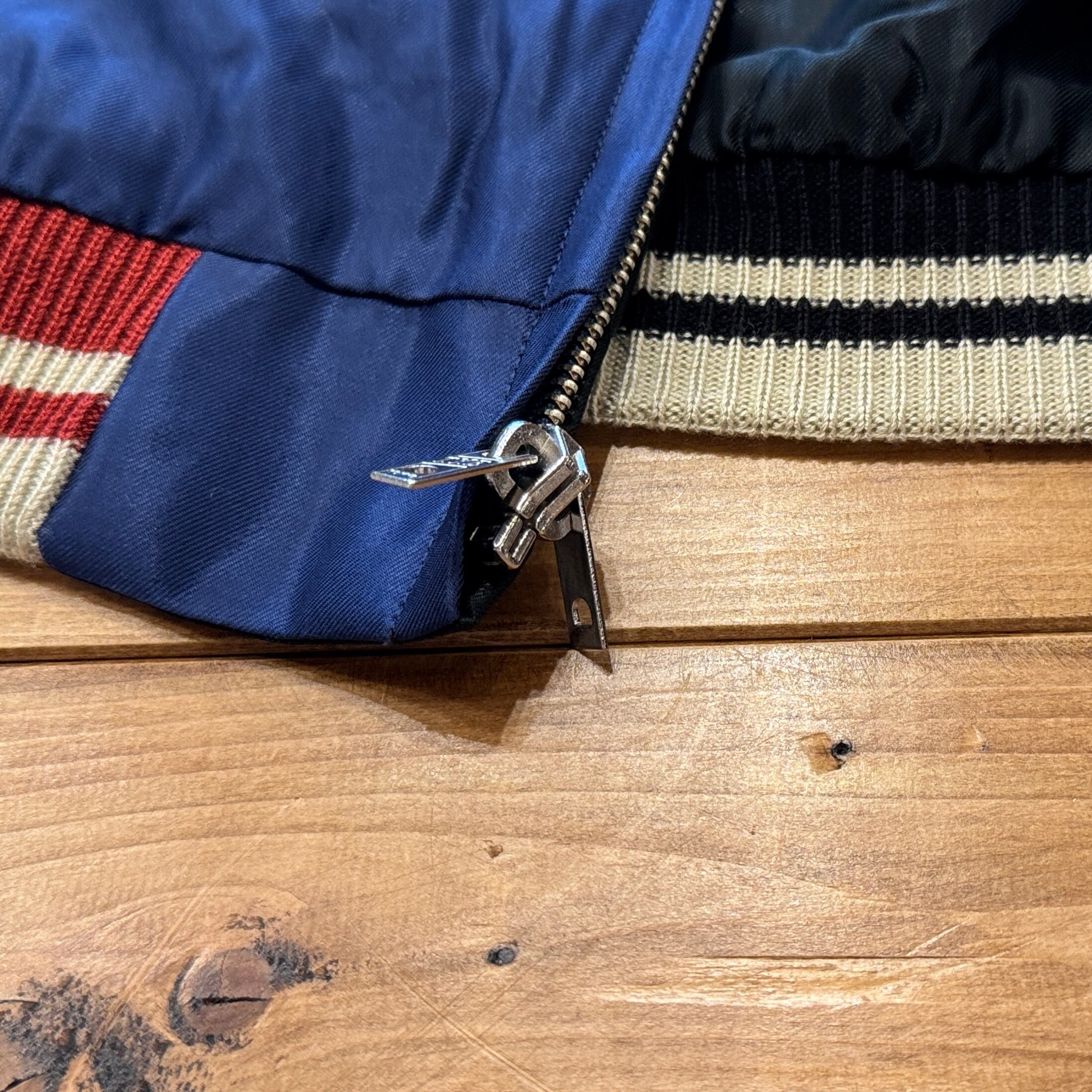 非常にレアで人気も高いアラスカ柄のスーベニアジャケット、通称「アラスカジャン」。表面は1950年代後期のヴィンテージをもとに、胸に稲妻と白熊、背には流氷の上空を舞う白頭鷲とマッキンリー山の刺繍を再現。大自然が残るアラスカは「アメリカ最後のフロンティア」と呼ばれ、そのメッセージも下部に刺繍されている。星条旗を想わせるボディのトリコロール配色や、アラスカジャンならではの袖の3本ラインも特徴。