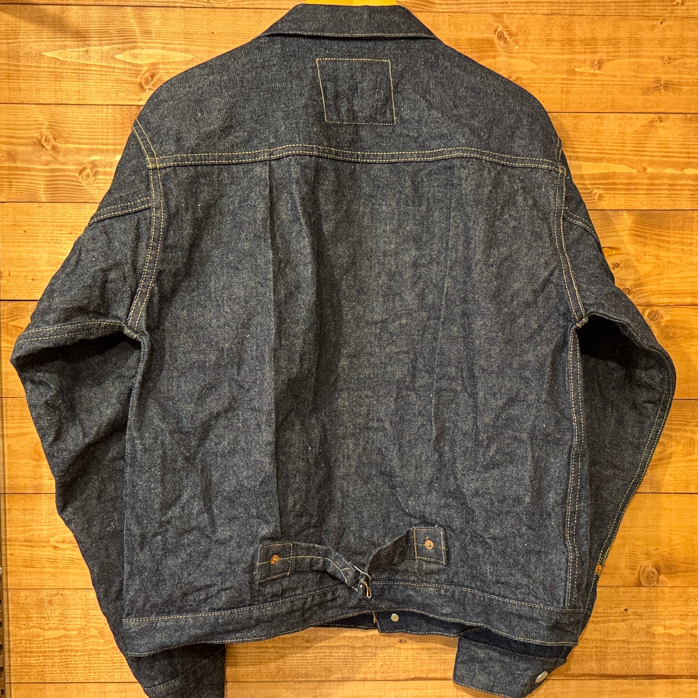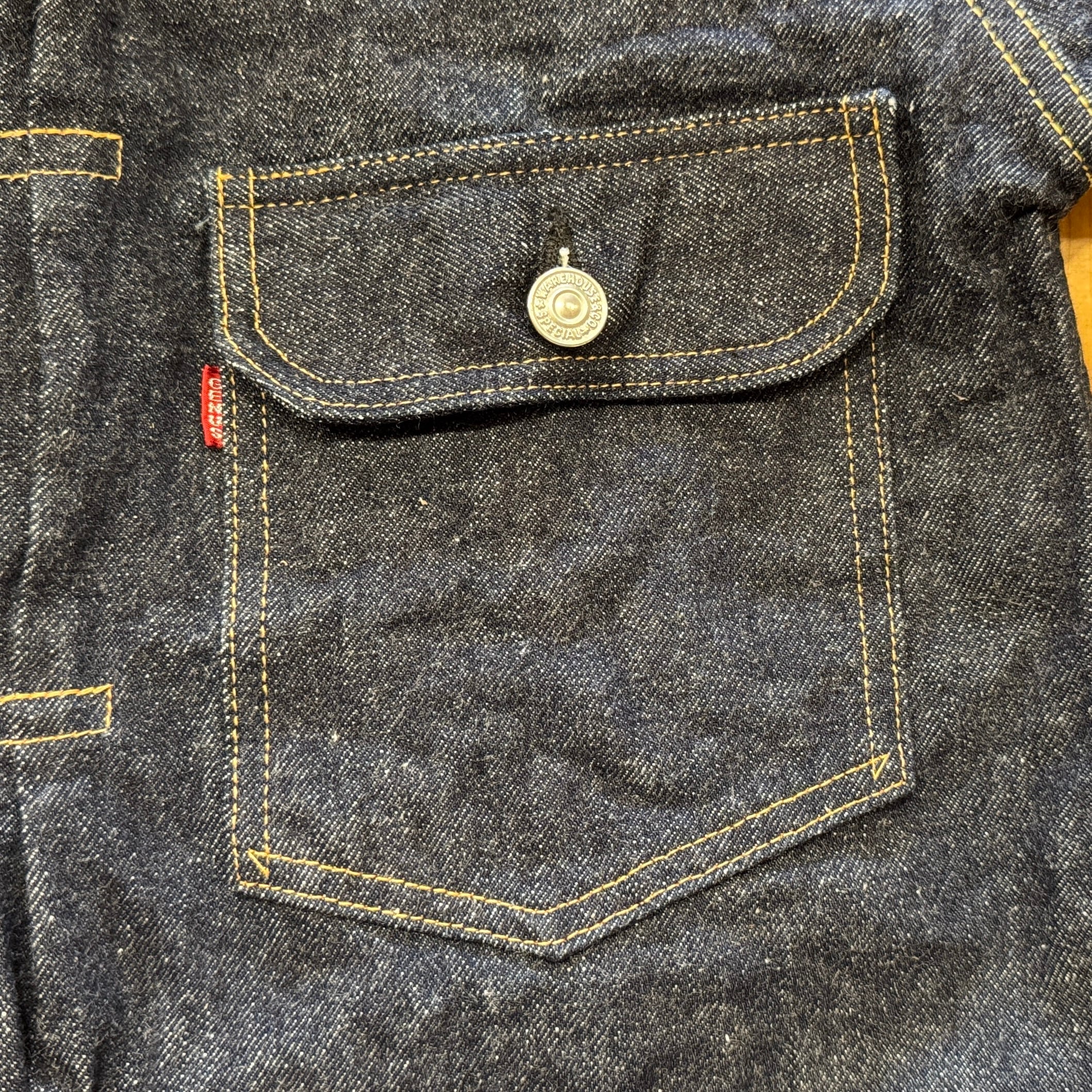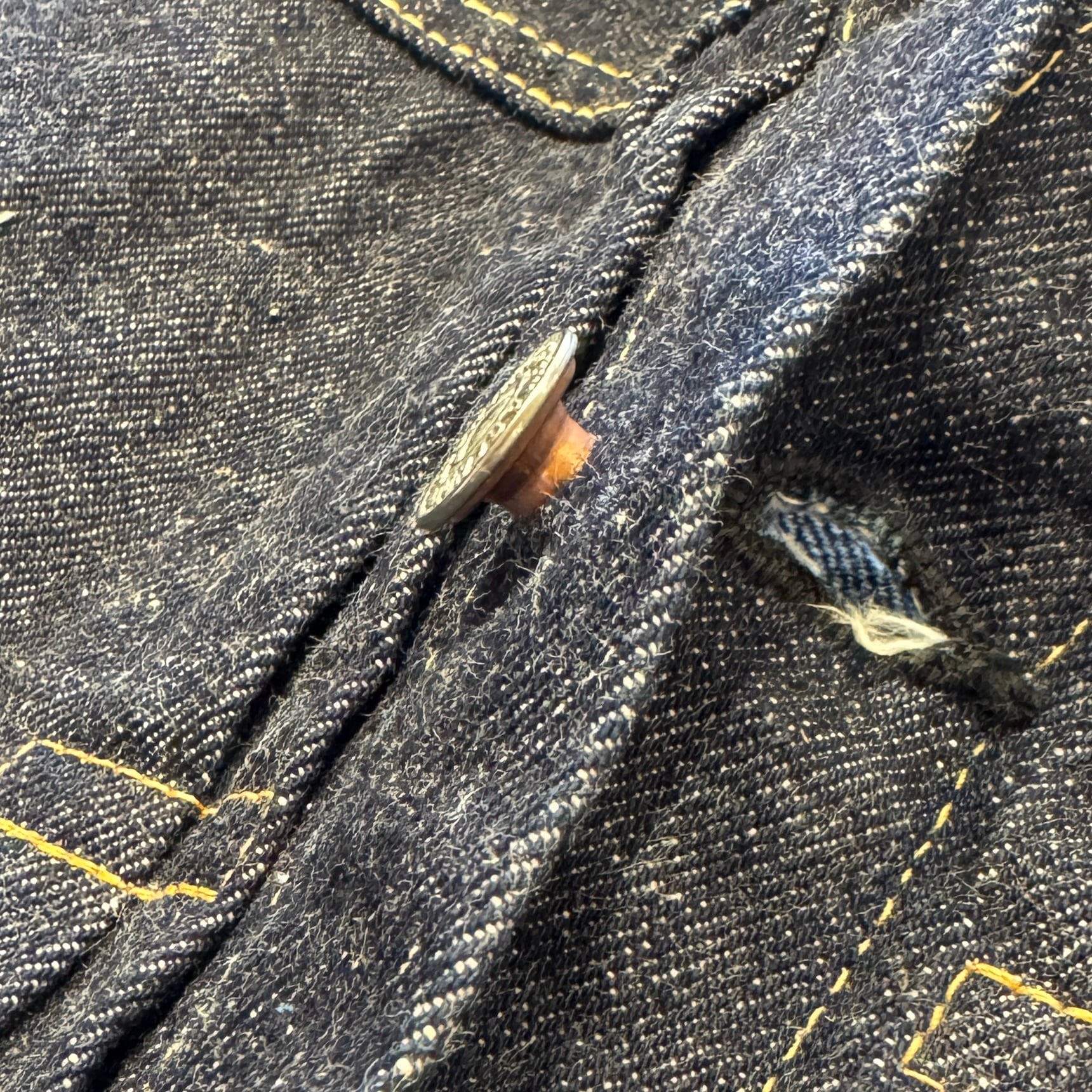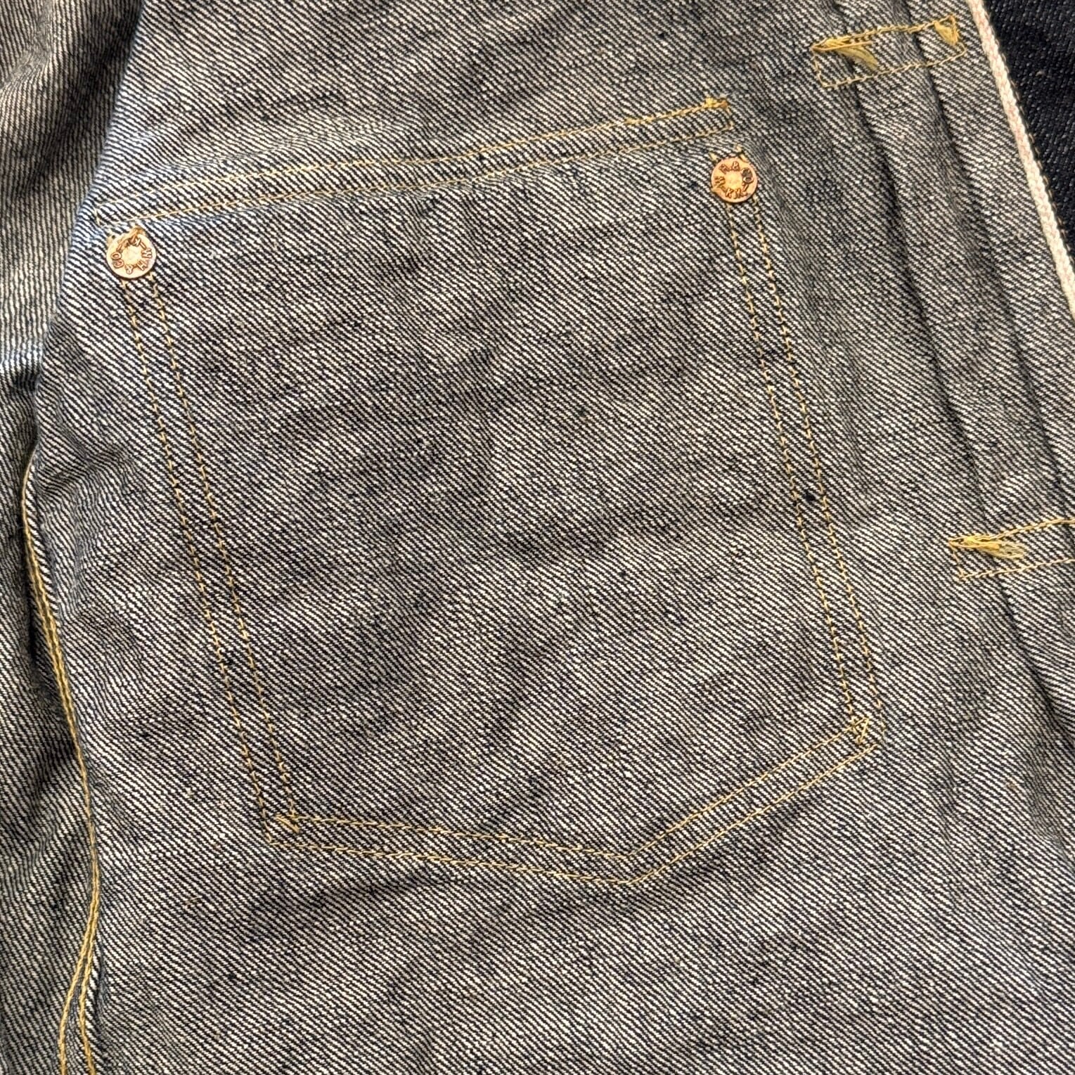 大戦デニム、黒バックルでありながらポケットにフラップが付き、フロントボタンは5個。