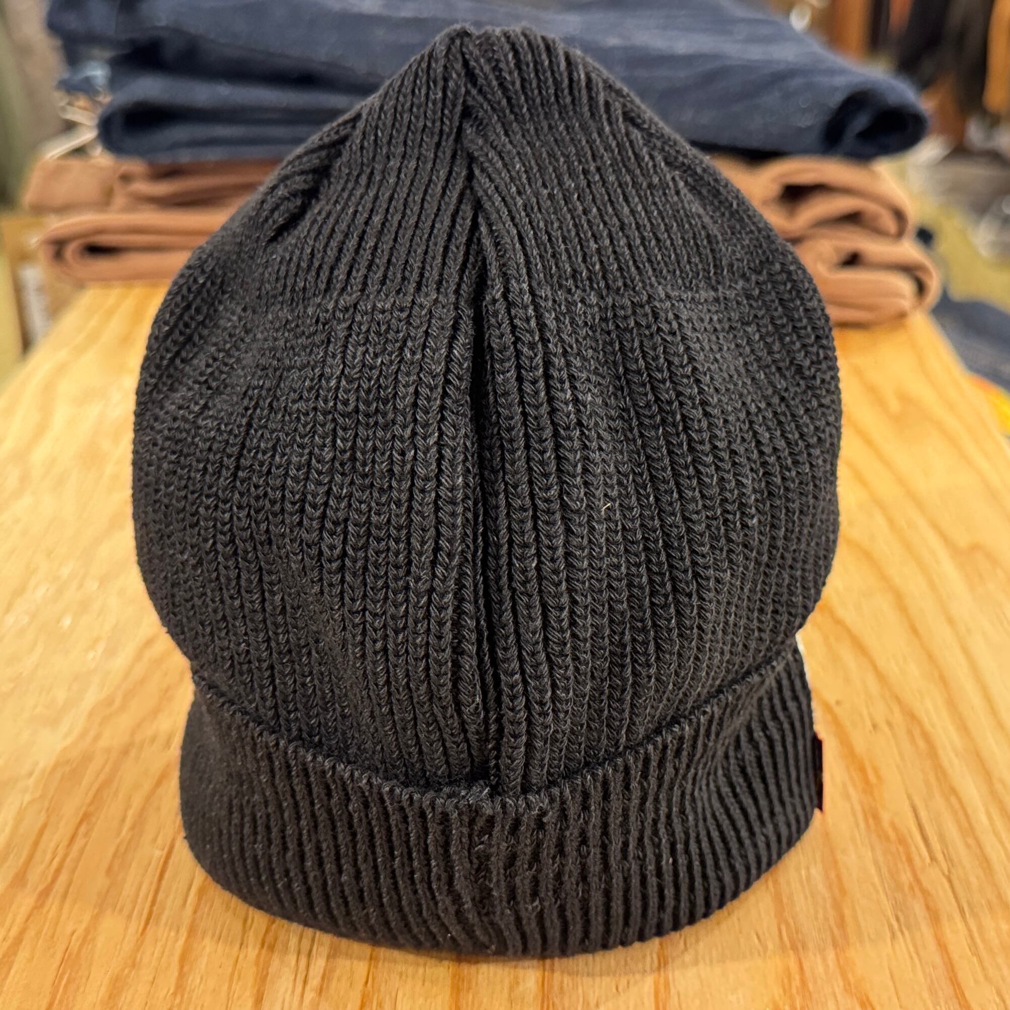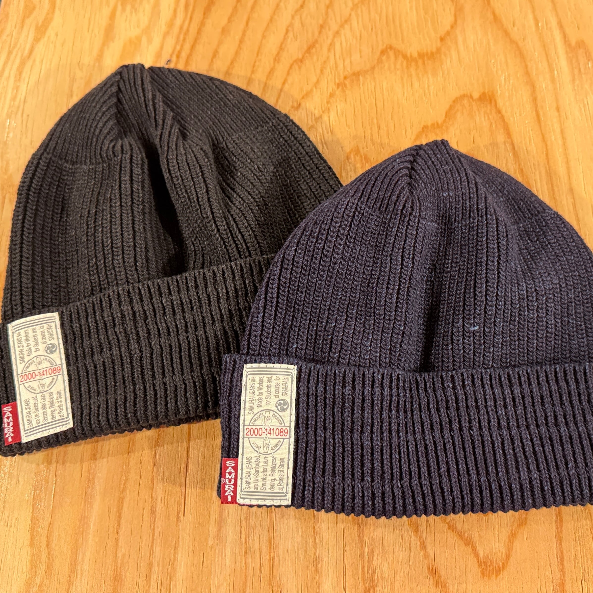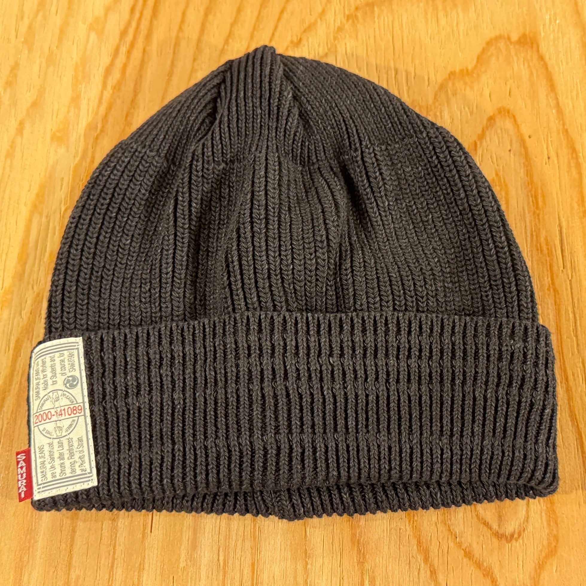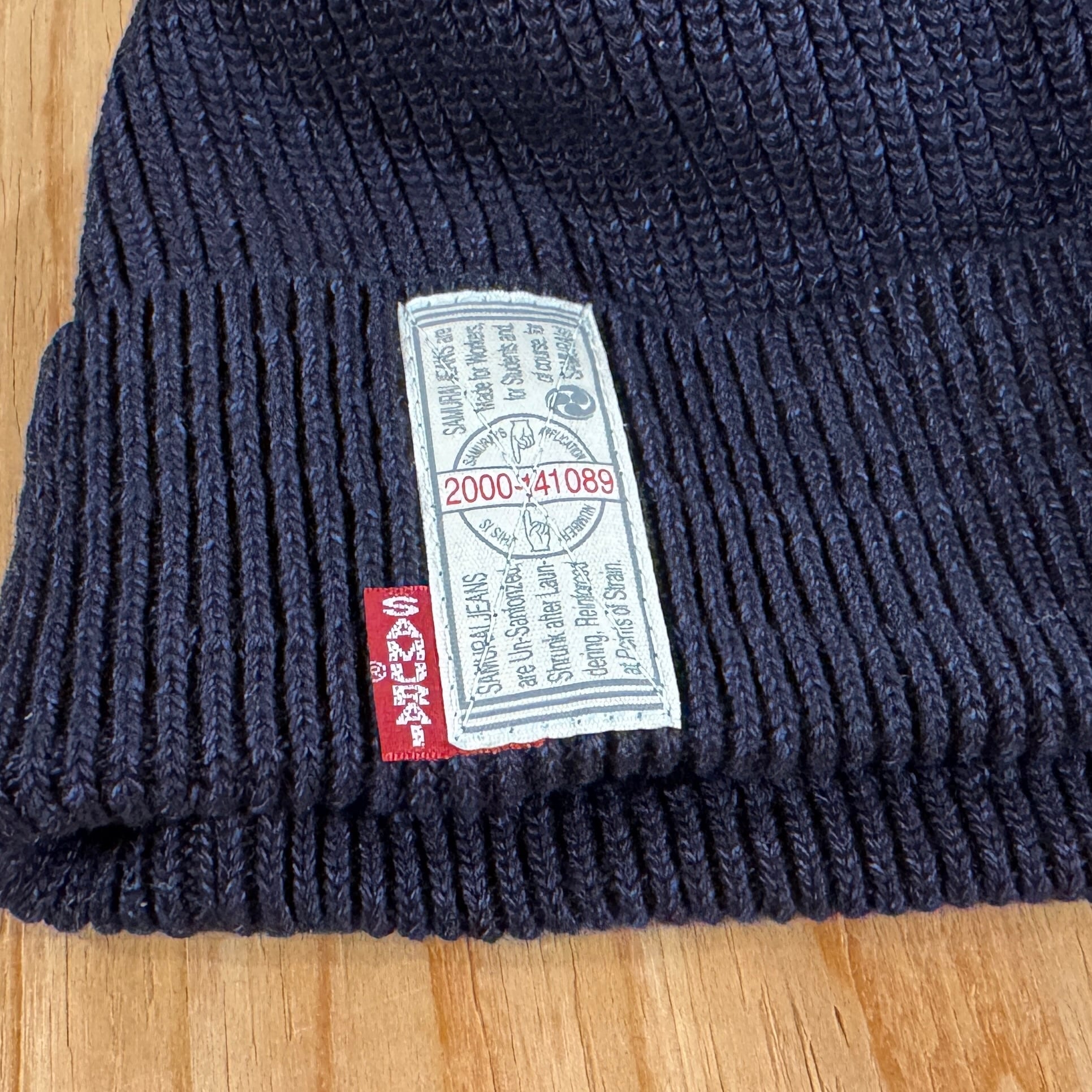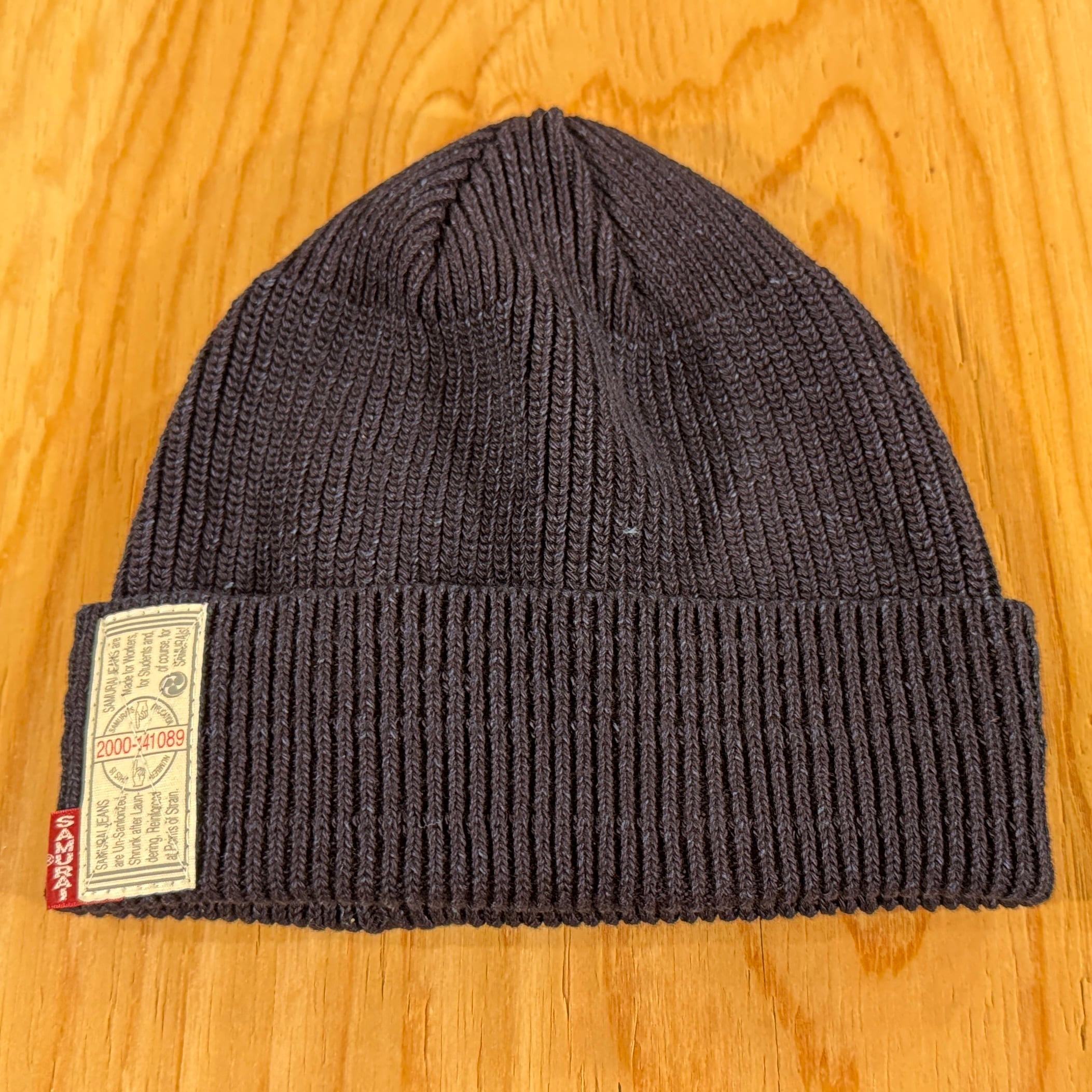 インディゴとブラックのロープ染色によるコットン100%ワッチキャップ。段リブを入れ、被って中央にサムライギャランティーチケットとサムライピスネームが付きます。折り返しを増やすとリブ幅の調整と、ギャランティーチケットとピスネームがアクセントになります。シルエットは男女兼用できるように浅すぎず深すぎない仕様でシーズン問わず1年中愛用できるワッチキャップです。