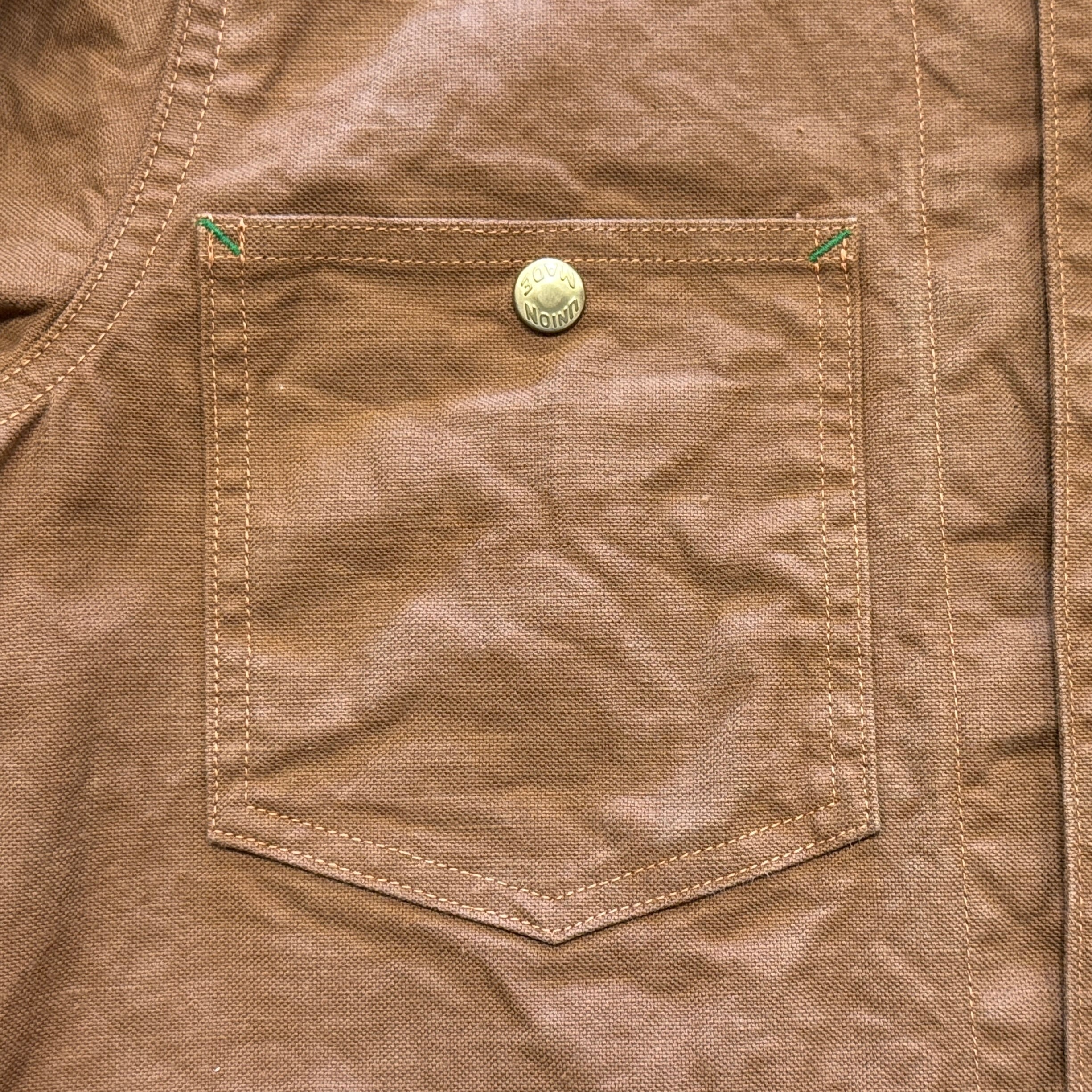 初期型の特徴でもあるムービングカラーの襟元や角型ポケット。紙ラベルや襟周りと裾周りがダブルステッチ縫製。そして初期型のみに備わる緑カンヌキ、フロント19mm、袖16.8mmのUNION MADEボタン。