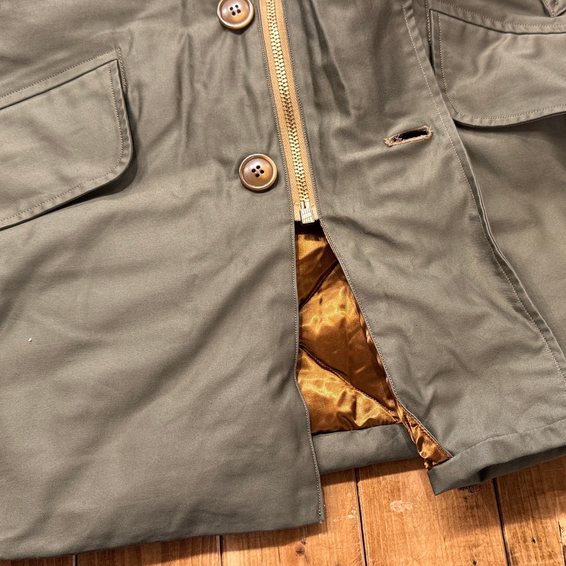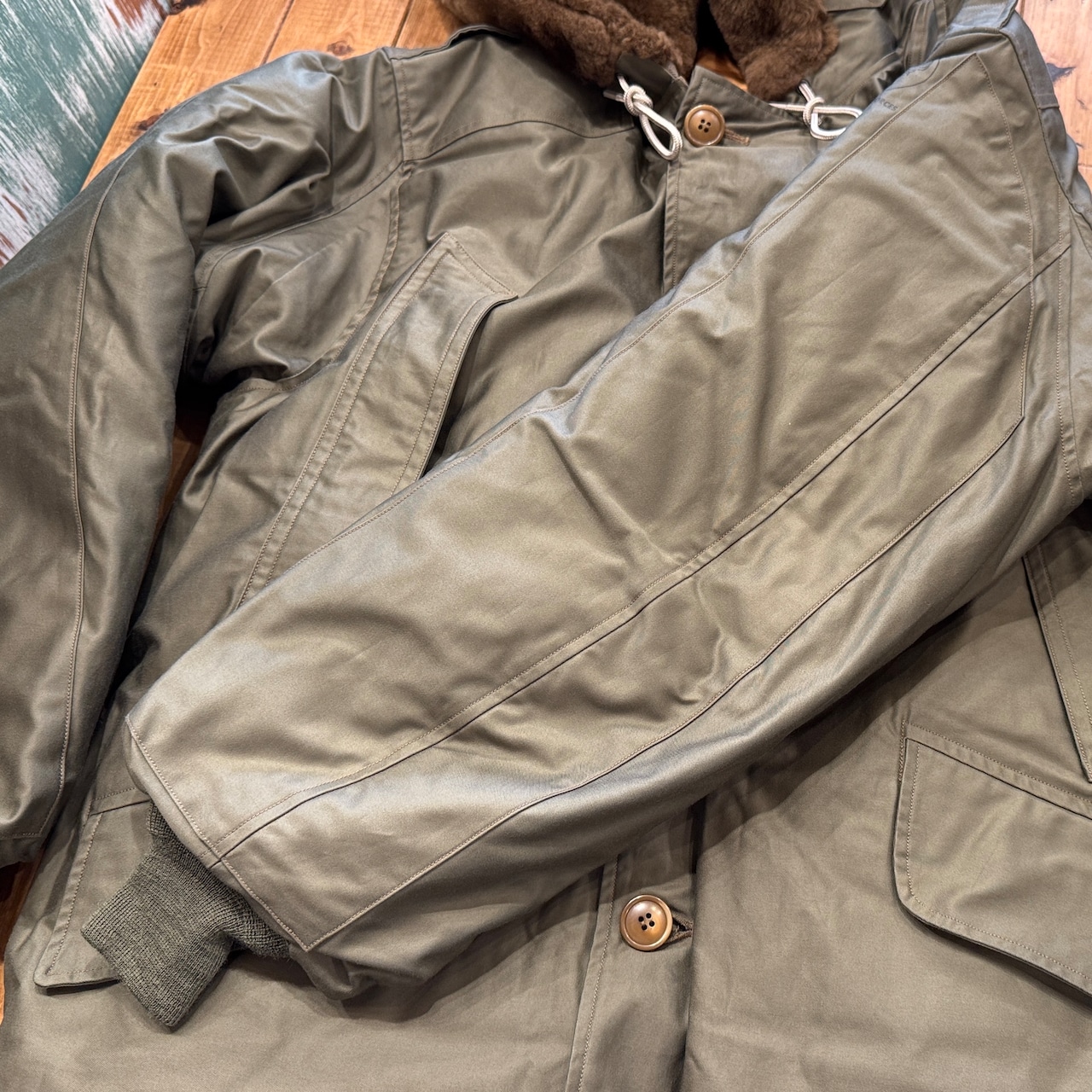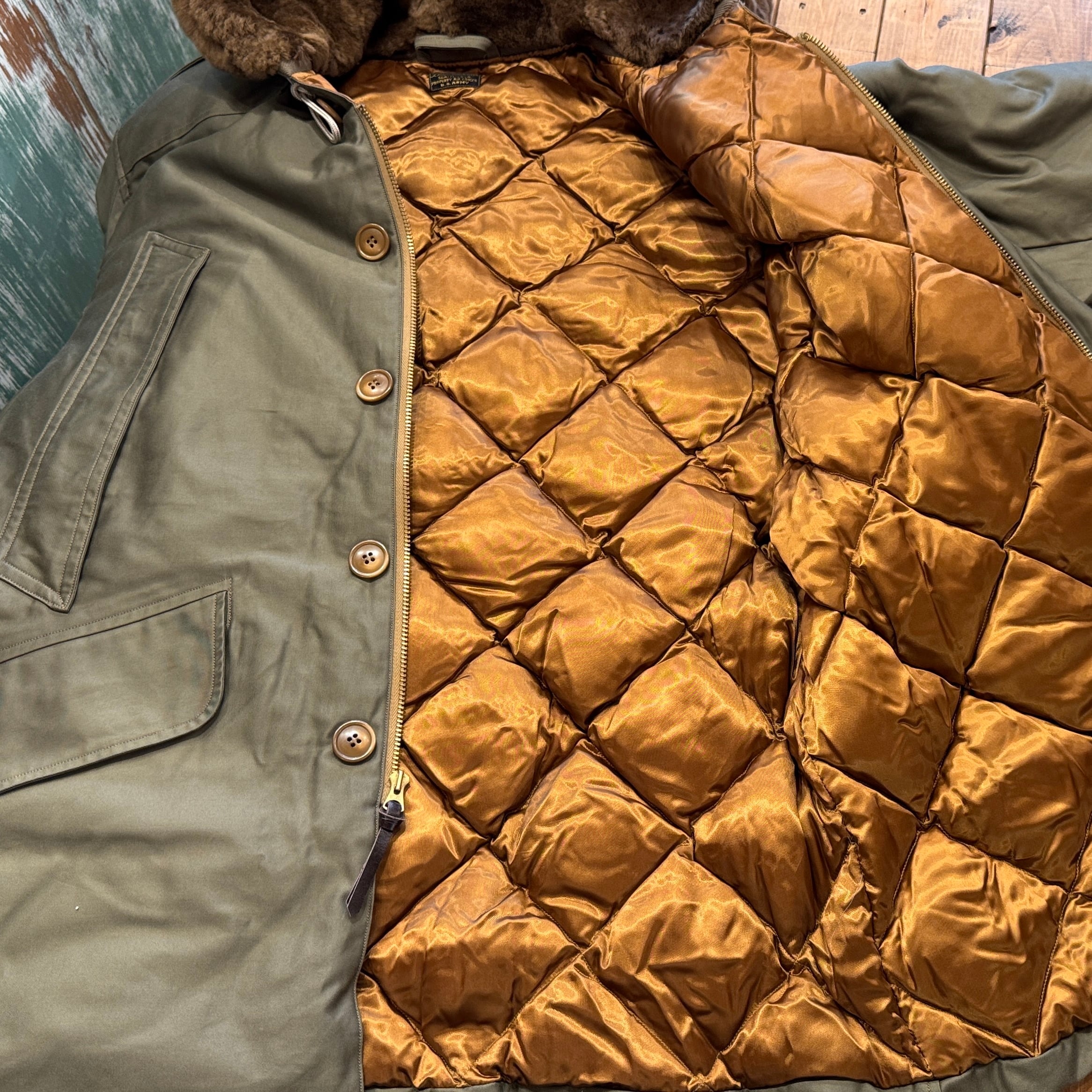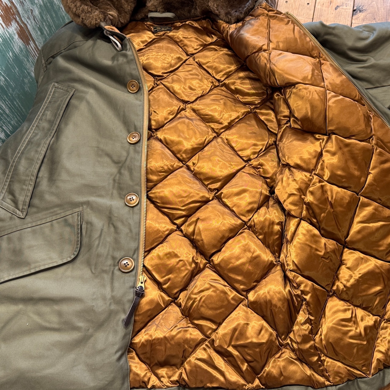 タイプB-9は1943年から1944年にかけて製造された冬季用のフライトジャケットである。タイプB-9の前身モデルはムートン製のタイプB-7だったが、第二次大戦が勃発すると兵士が増員され、生産性の高いジャケットの開発が急務となった。ムートンの確保が困難になったことや、コスト面や生産性、重量面が見直され、タイプB-9が開発されたのである。アウターシェルにはコットンツイルを使用し、キルティングされたライニングの保温材には軽量且つ保温性に優れたダウンが採用された。また裏地には滑りの良いレーヨン生地を用いることで運動性においても向上した。外観は基本的にB-7を踏襲しており、フロントはジッパーとボタンで開閉する仕様。背面にはラバーウエストバンドと袖先にはリブが装備され、外気から風の侵入を防ぐ仕様となっている。