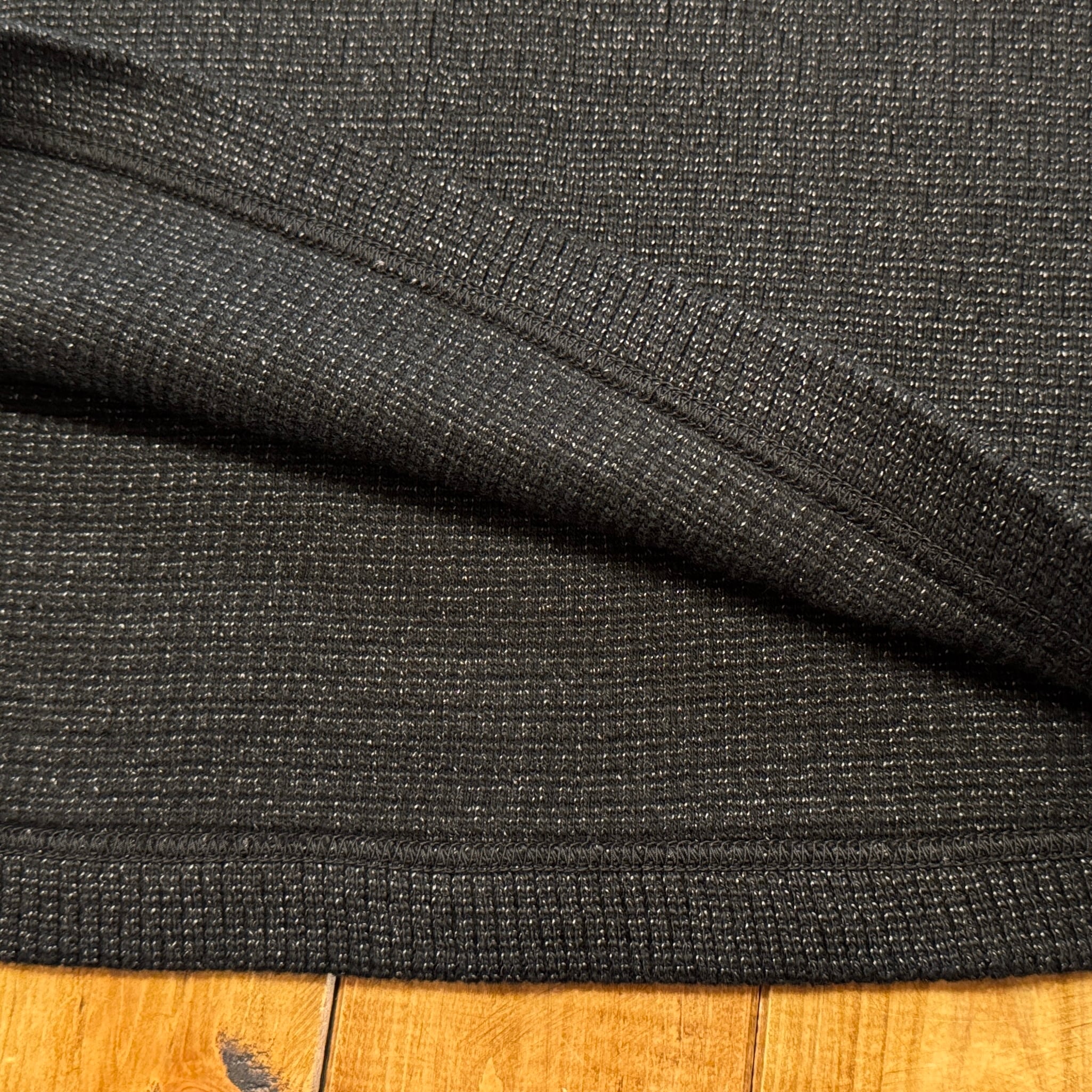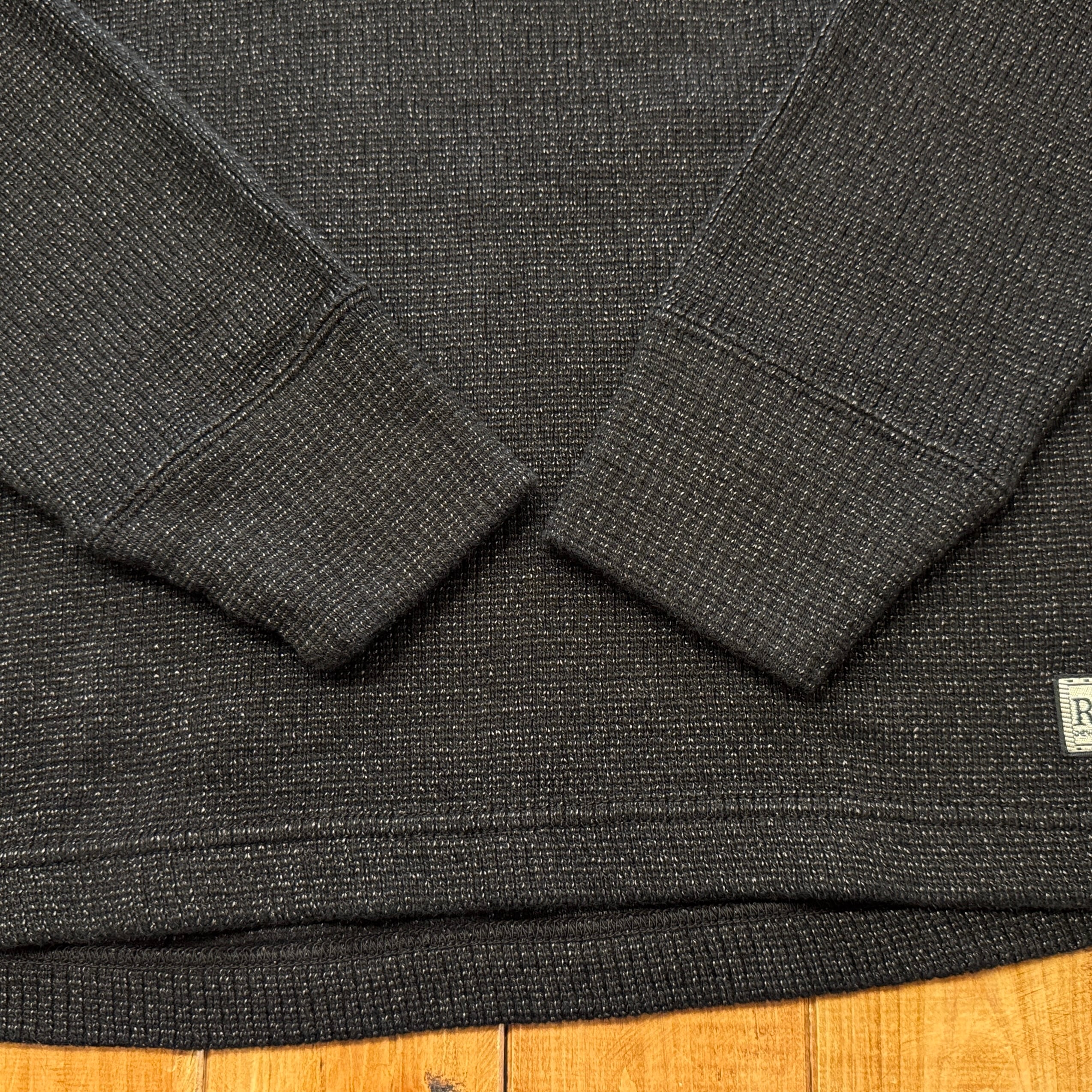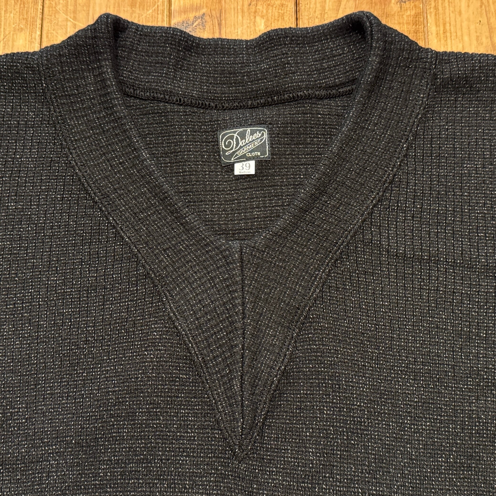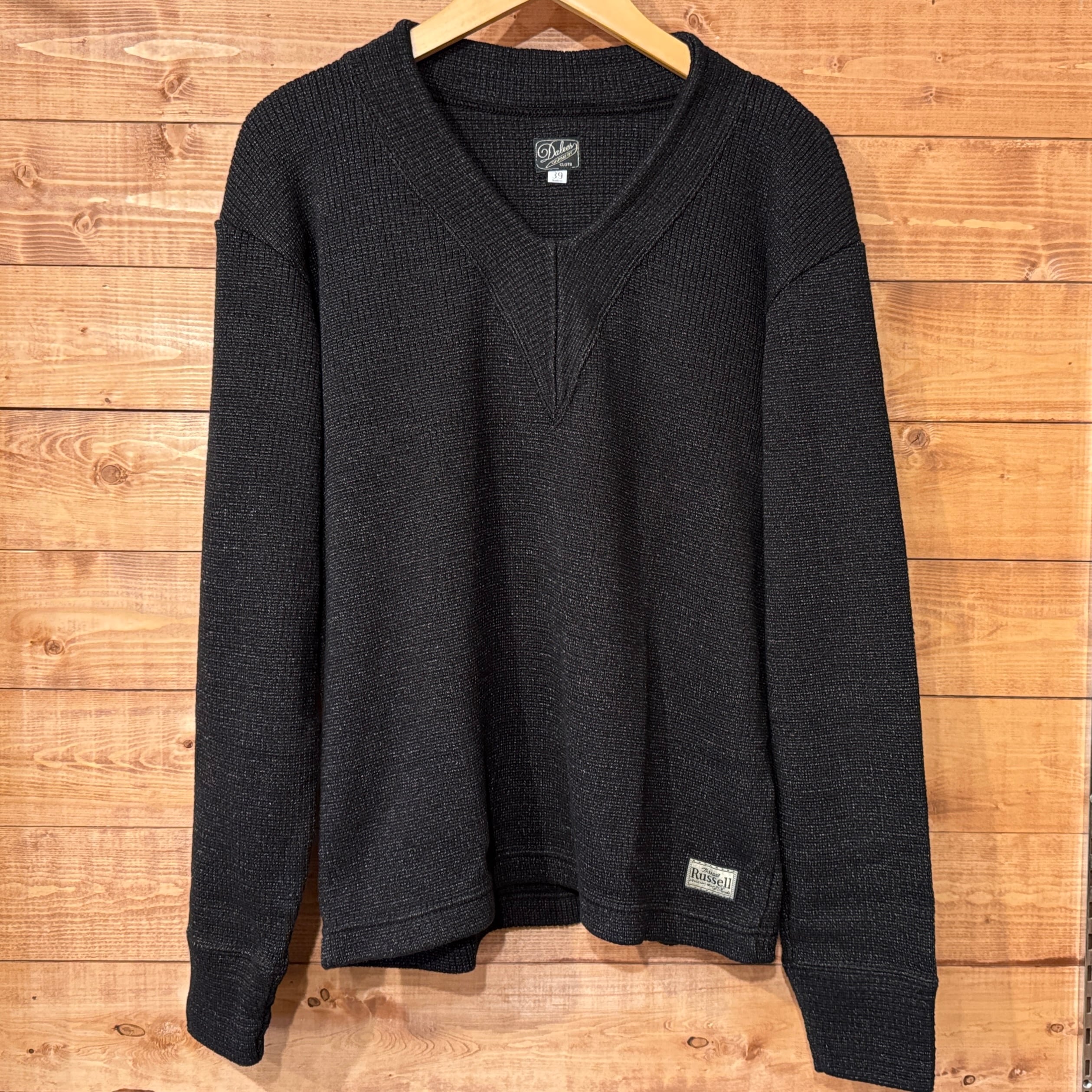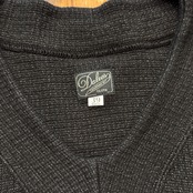 1910年フランス軍アーミーセーターの形状と特殊リブニットから創る「アンティークシンガー」。動き易さと着脱のし易さのエリ形状と、コットンに金糸の撚り杢により編込まれた一種独特のリブニットが特徴です。この唯一無二の素材を製造していた職人が引退したことで、今回の製造をもって廃番素材となります。今後生まれることのが無い品質を是非御覧下さい。