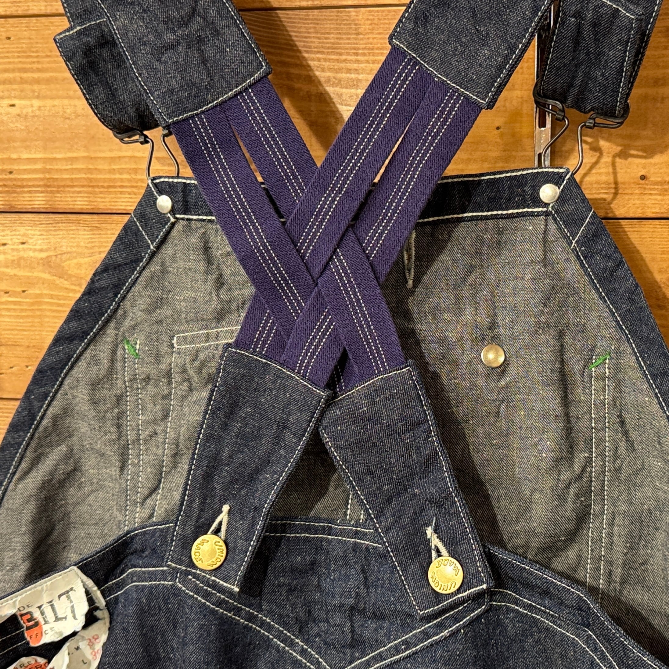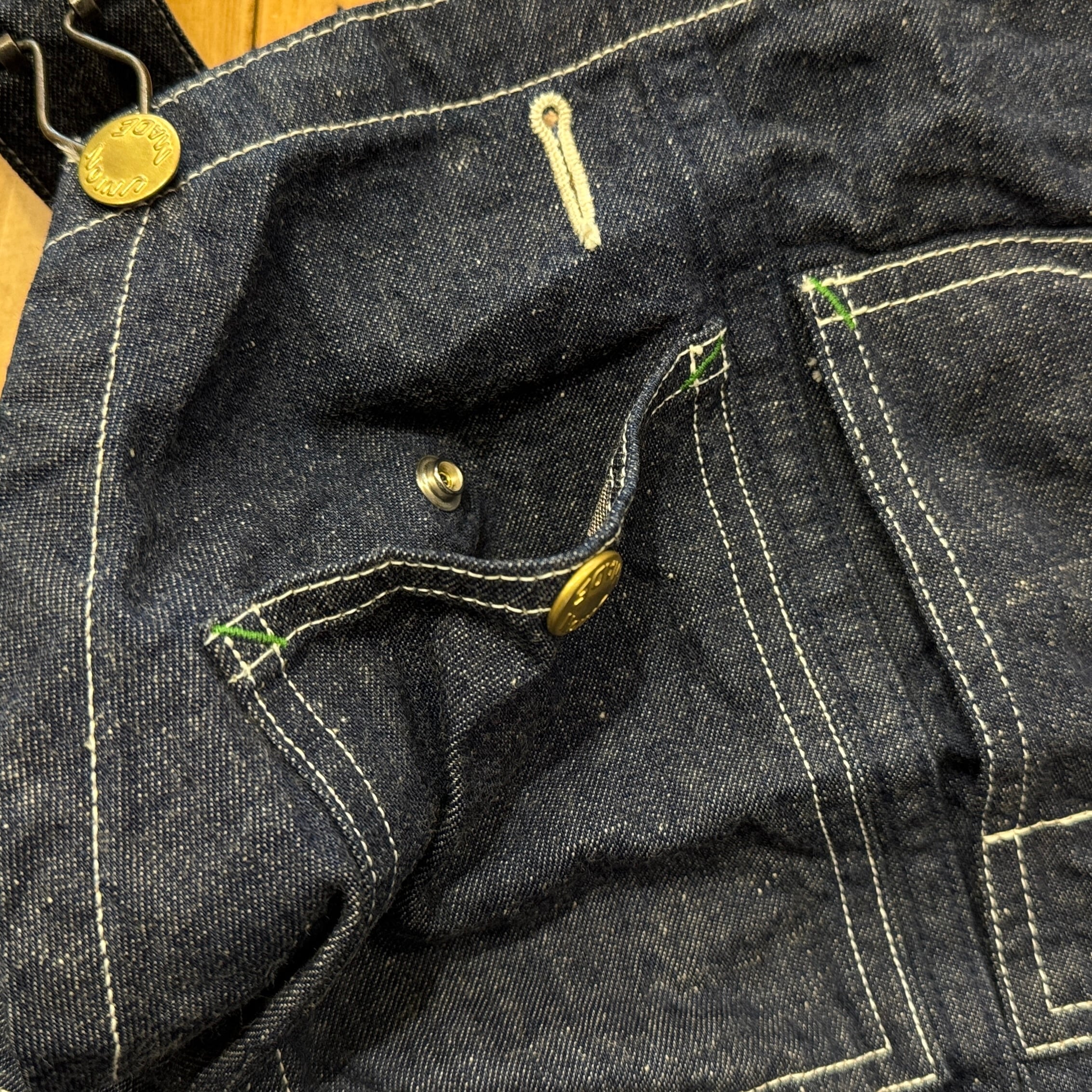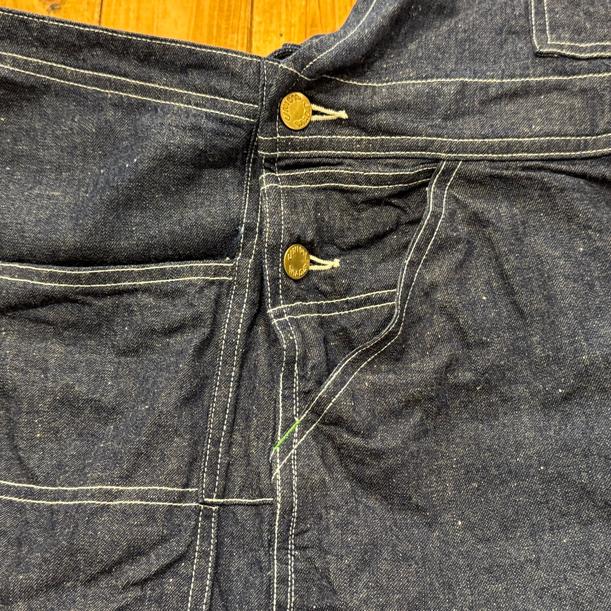 初期型の特徴でジャケットと統一感もあるセパレート角形ビブポケット。そして初期型のみに備わる緑カンヌキ、16.8mmのUNION MADEボタン。当時ものと同様の鉄製ツーブロンク、右胸スナップボタン仕様。