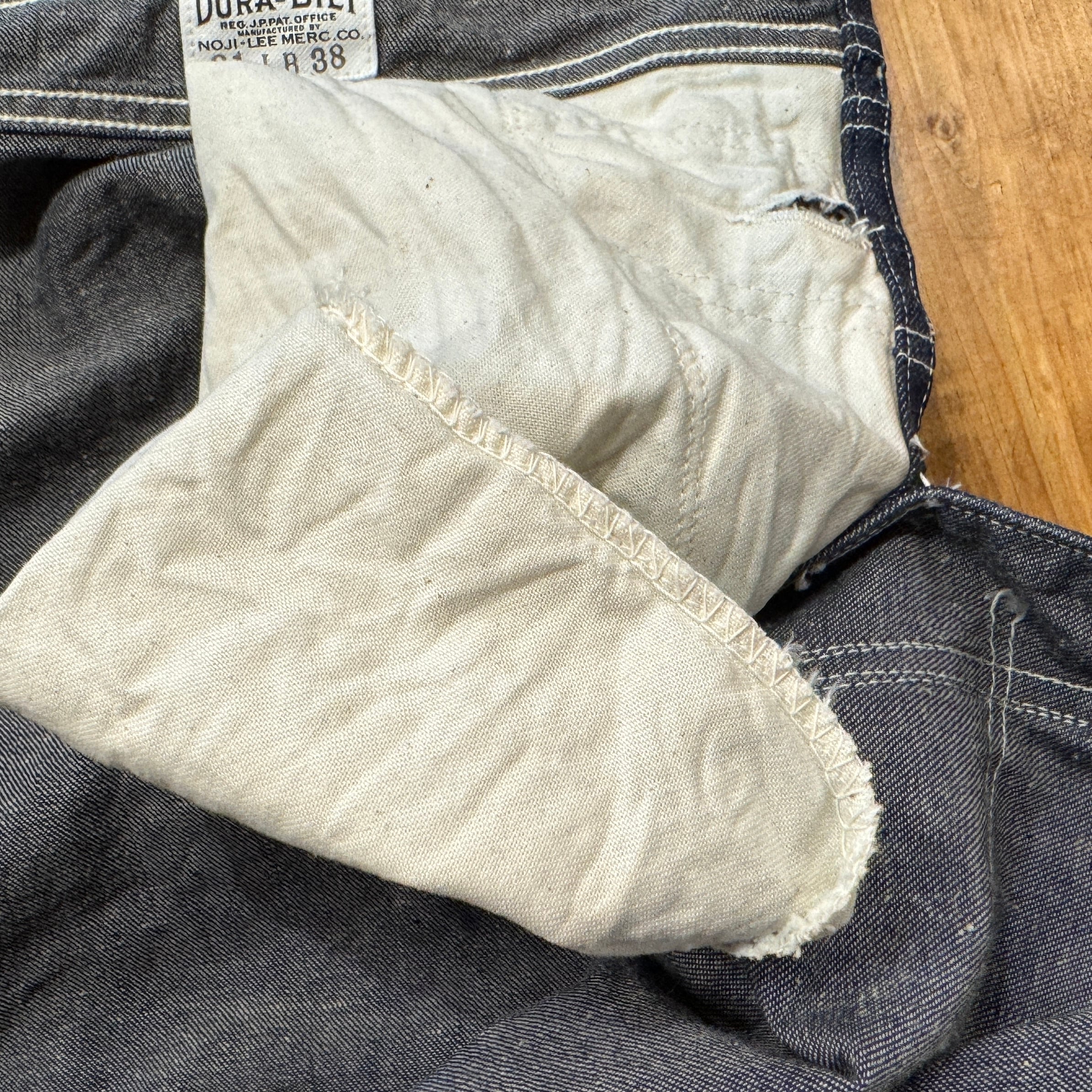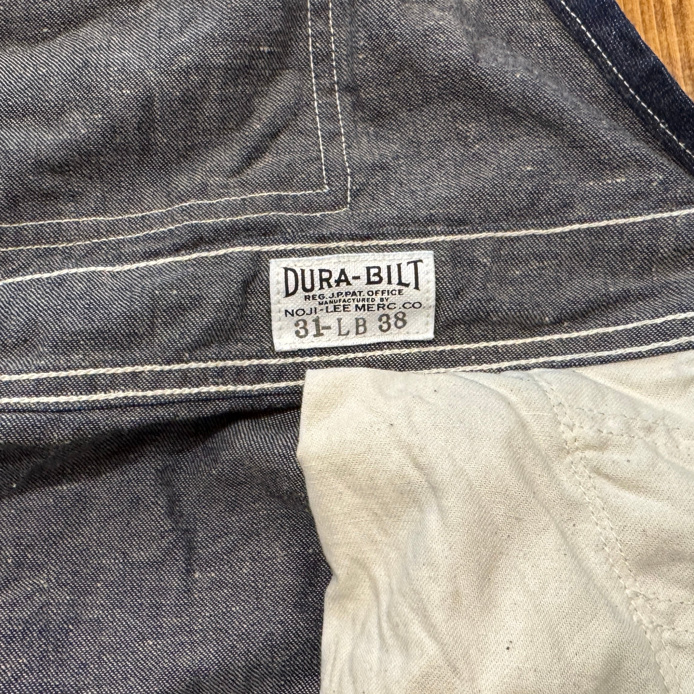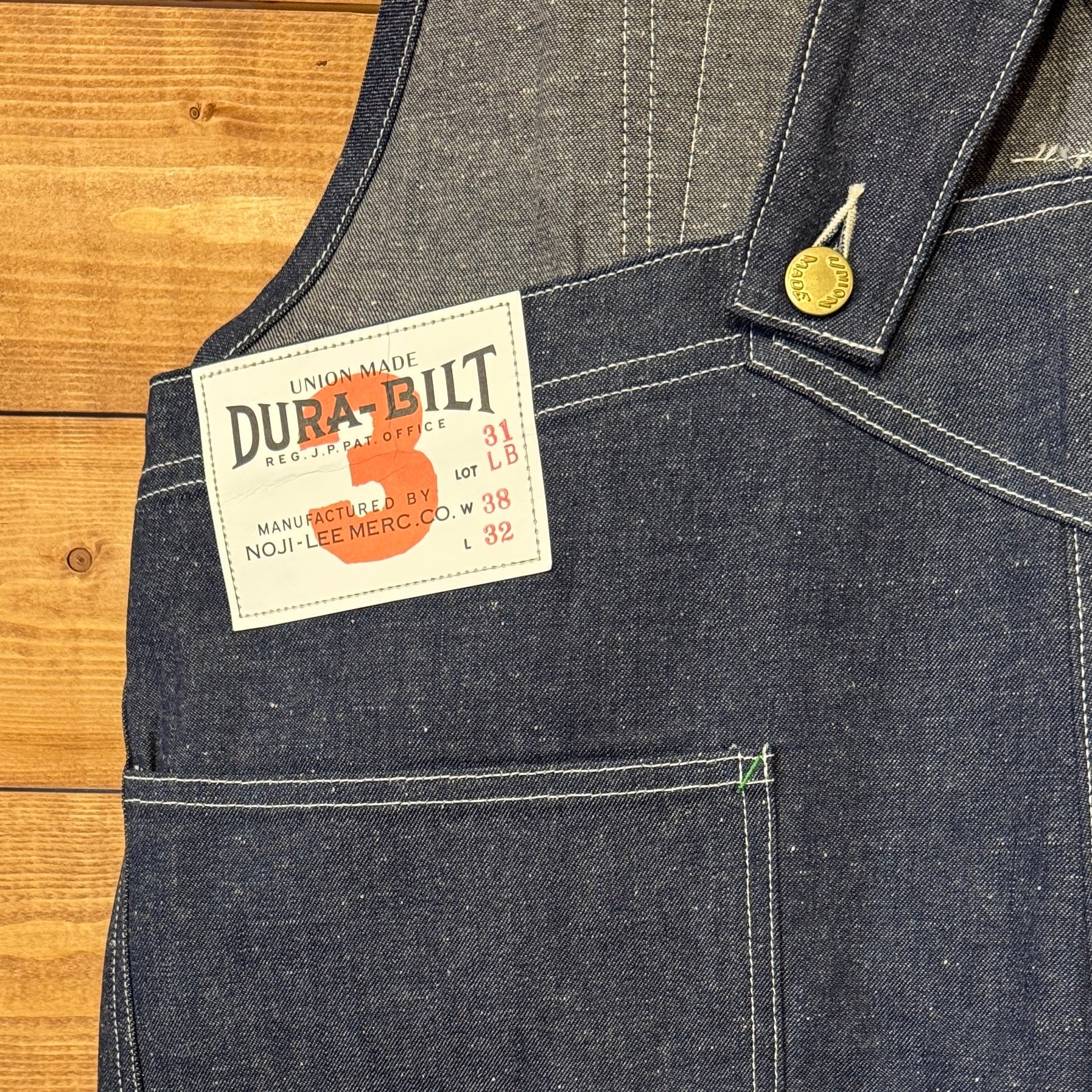 初期型の特徴でジャケットと統一感もあるセパレート角形ビブポケット。そして初期型のみに備わる緑カンヌキ、16.8mmのUNION MADEボタン。当時ものと同様の鉄製ツーブロンク、右胸スナップボタン仕様。