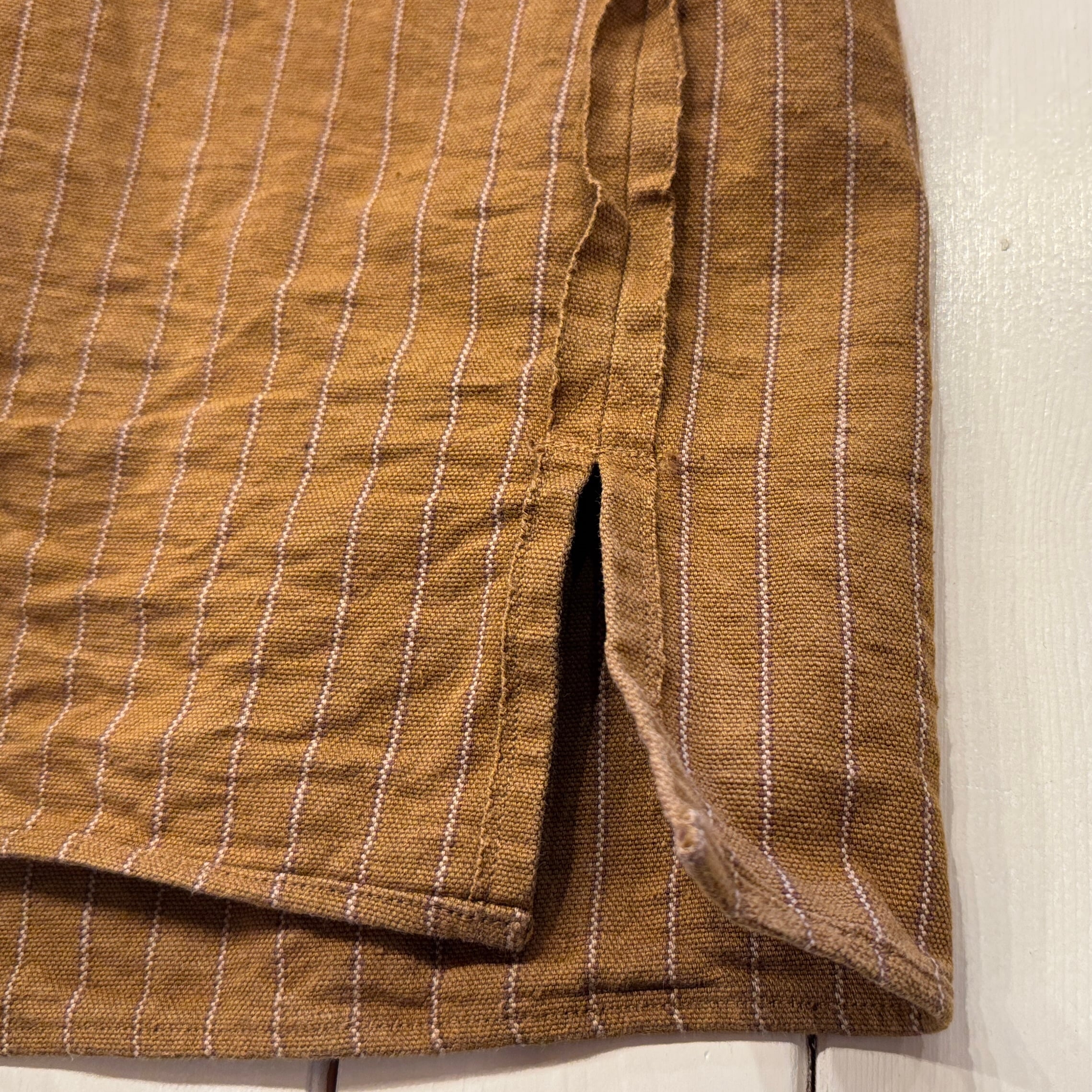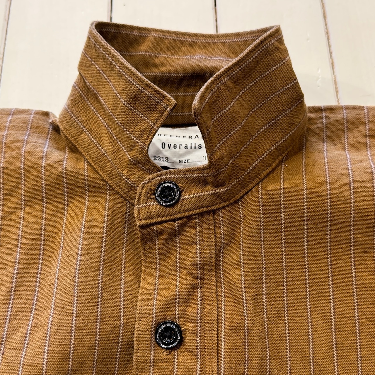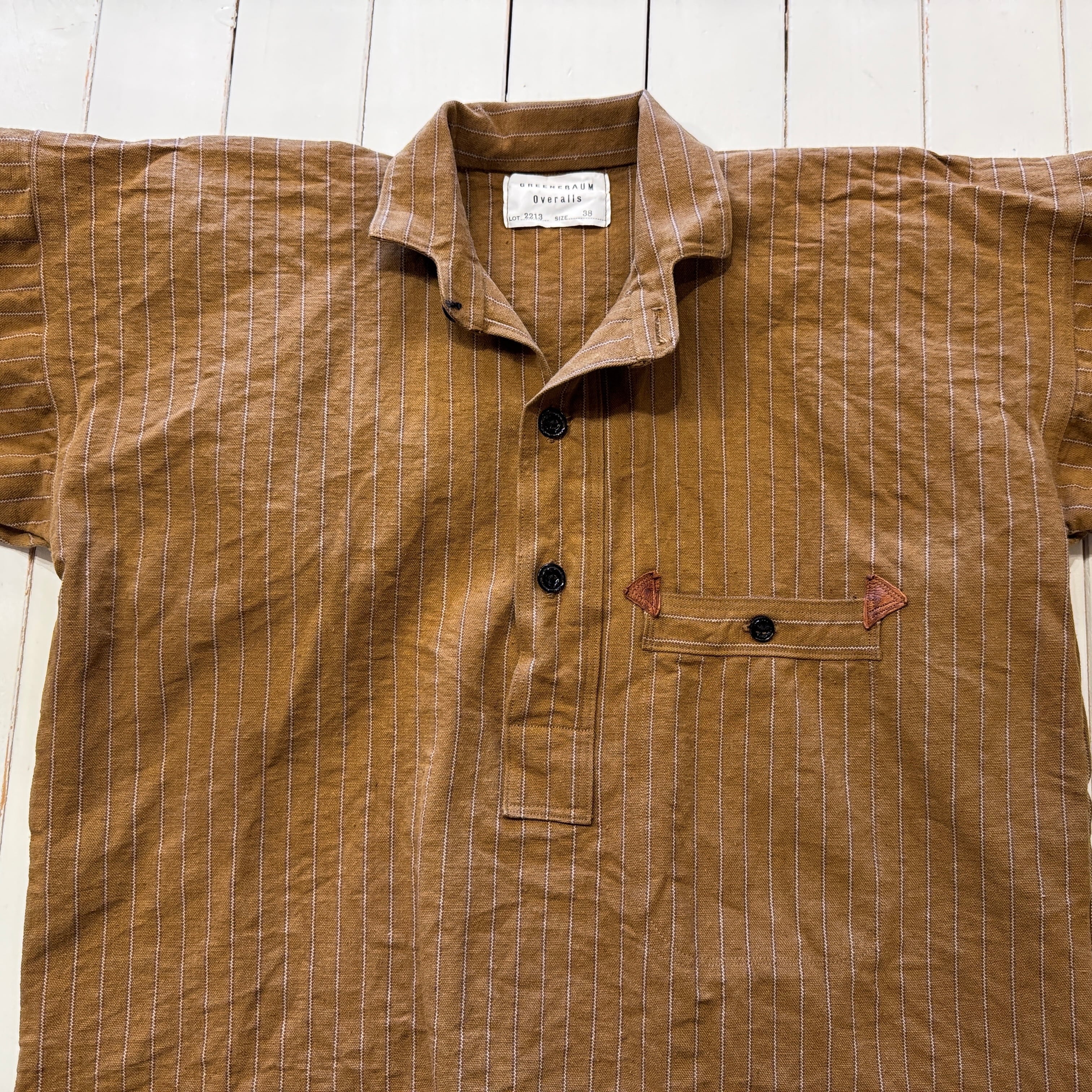 直線的なシルエットのプルオーバーシャツ。当時はワークウェアとしても主流であったプルオーバー型は、そのパターンも直線的なものであり、この グリーンバウム の生地も非常にマッチしていたと考えられます。オールシングル(本縫い)で仕上げられたディテール。脇マチとして補強に使用されたレザー。19世紀終わりごろに鉱山労働者の写真でよく見ることができるプルオーバータイプもジャンパーです。実在するダックストライプ生地の再現度も必見です。