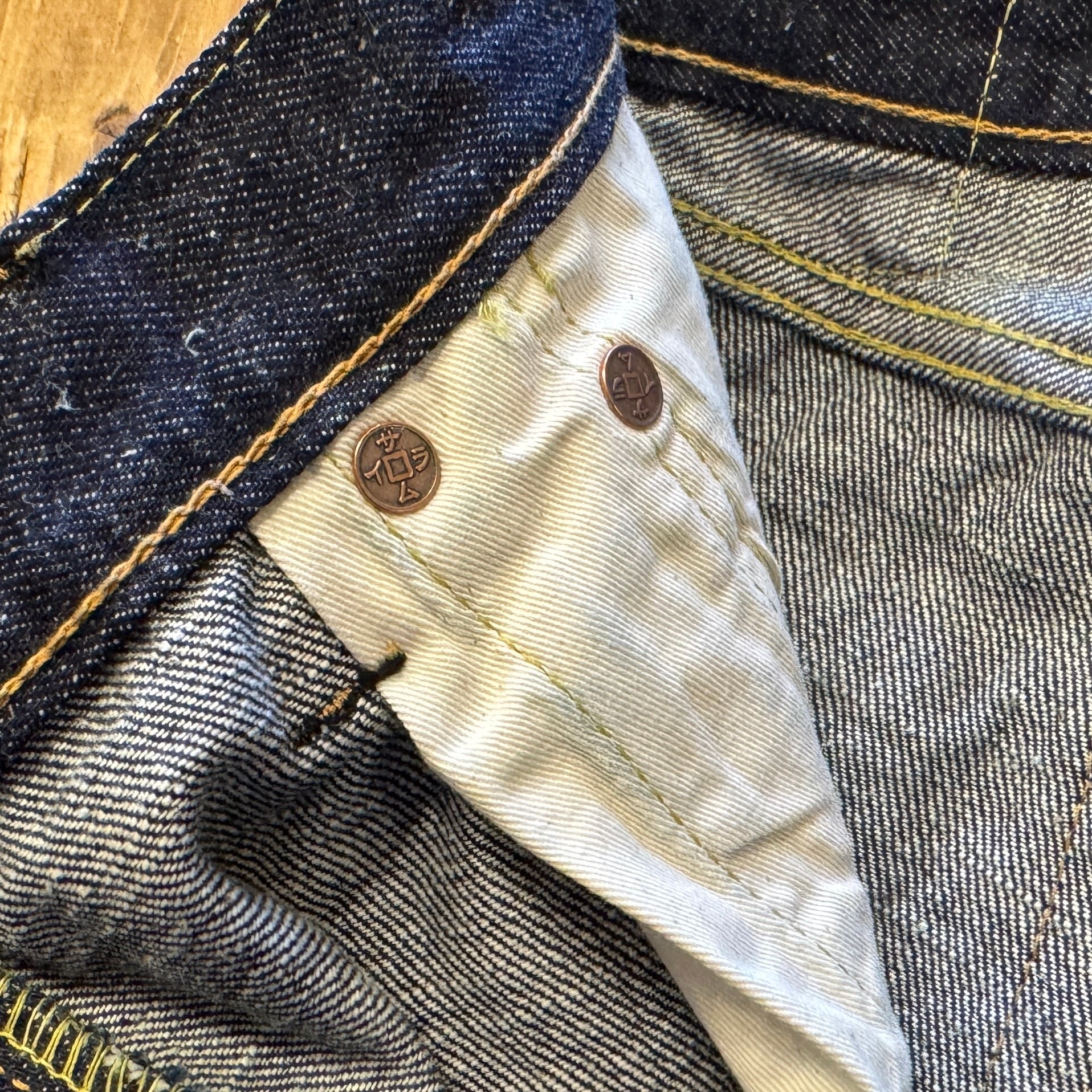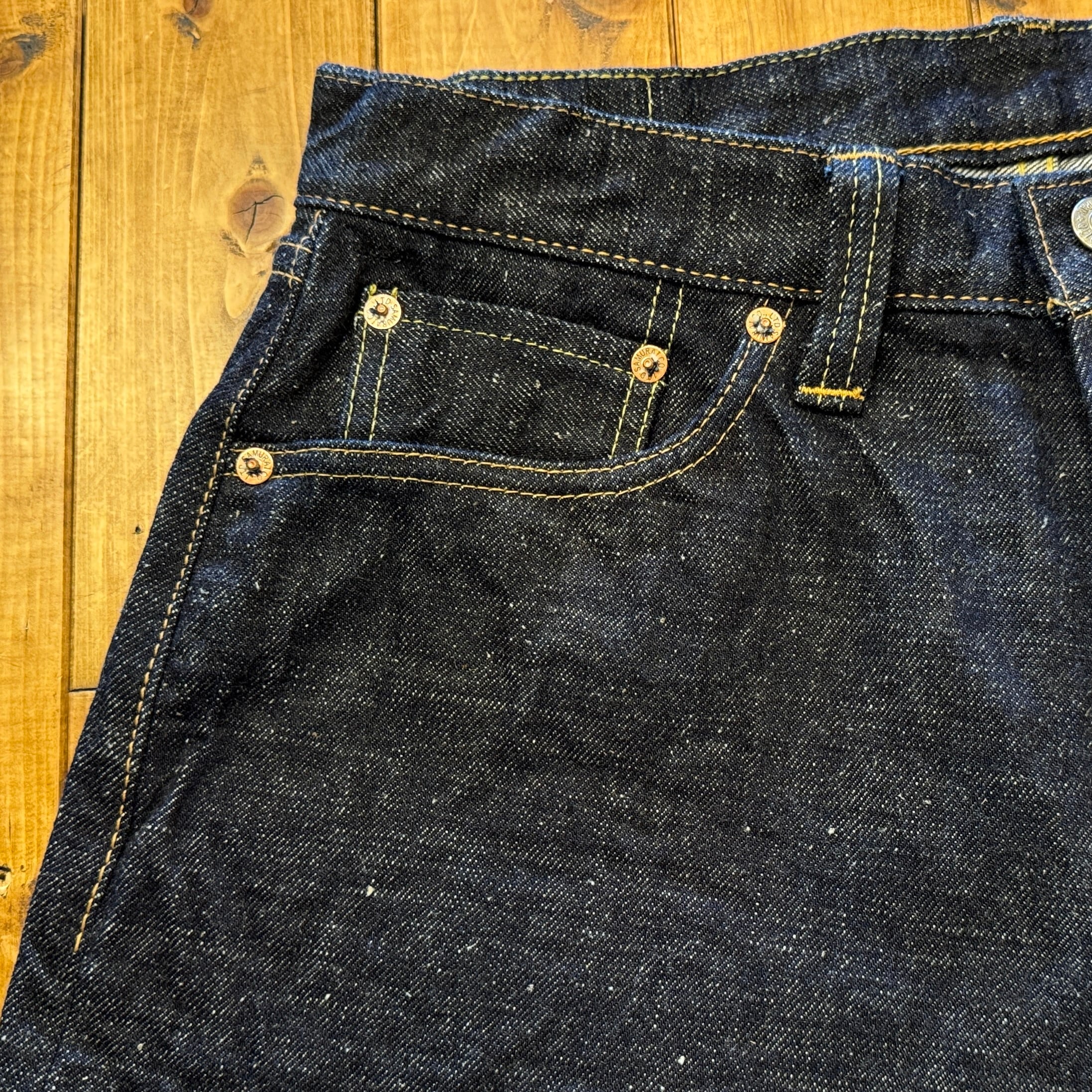 糸は経に6番糸、染めは当時のデニムのイメージでやや青みの強い深みのあるインディゴ色に染め上げています。緯には自家製「サムライコットン」をミックスさせた特別なオリジナルムラ5番糸を使用しています。