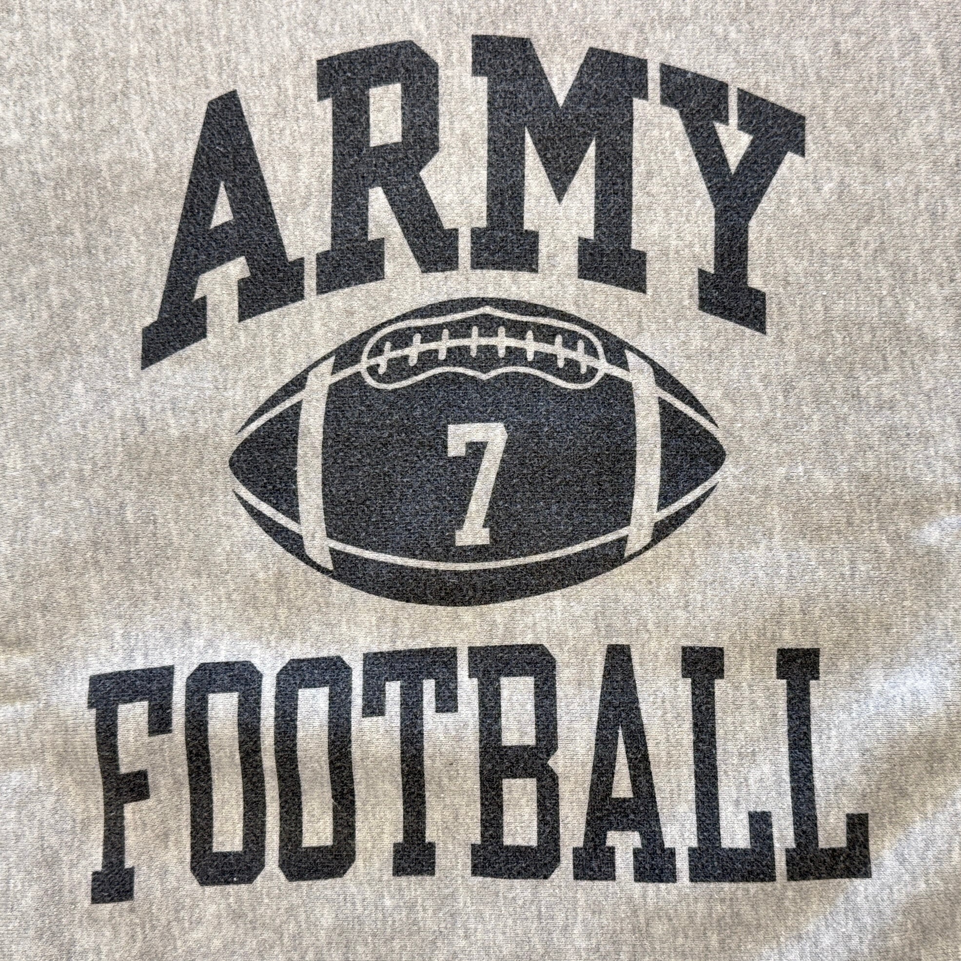 沿岸警備隊のトレーニング時に着用されたスウェットシャツ。仕様は身頃の生地を横使いし、サイドにリブ素材と切り替えたホリゾンタル・ニッティング。ホリゾンタルとは「横方向」という意味で、丈の縮みを防止すると共に縦横の伸縮性を意識している。このような仕様でミリタリーに関連した柄は稀少性が高く、ヴィンテージ市場において価格が高騰している。1802年に、ニューヨーク州のウエストポイントに設立された陸軍士官学校は米国で最も古い士官学校。陸軍士官学校と永遠のライバルでもある海軍士官学校のカレッジフットボールの試合は米国では伝統の試合となっている。シンプルなブロック体にフットボールが効いたスポーティーなプリントデザイン。