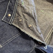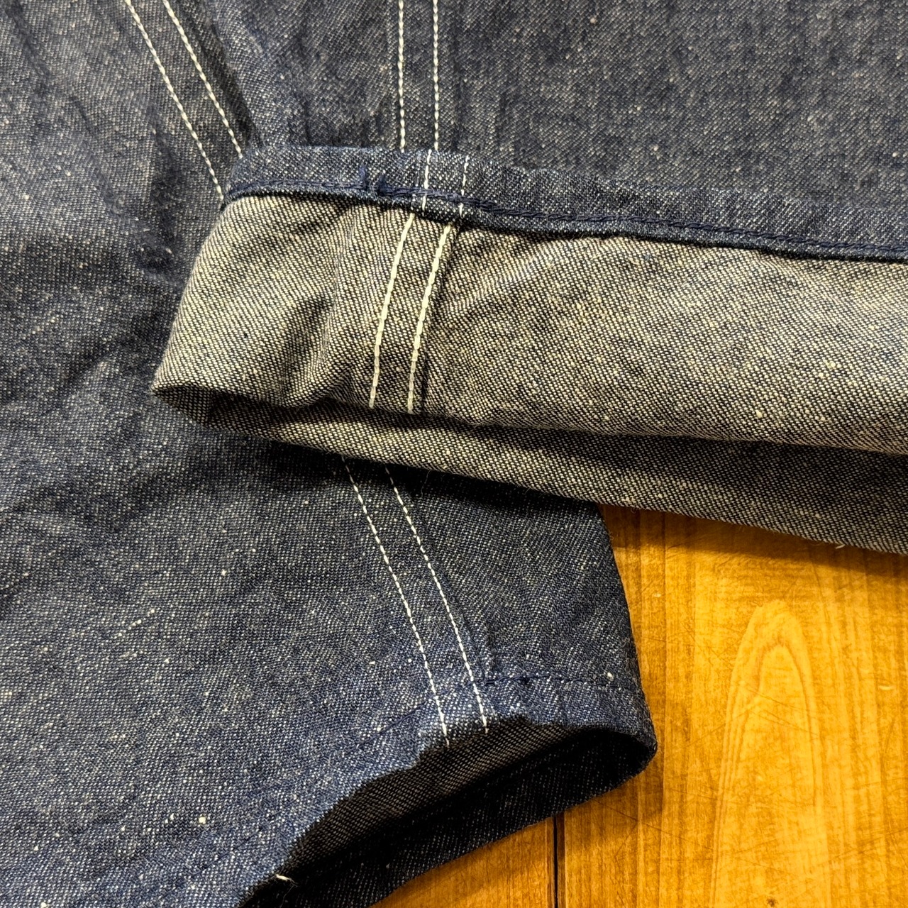 ライトオンスデニムはネップ感のある表情。ヨコ糸はキナリ感が強く非常に古い時代の雰囲気が出ております。