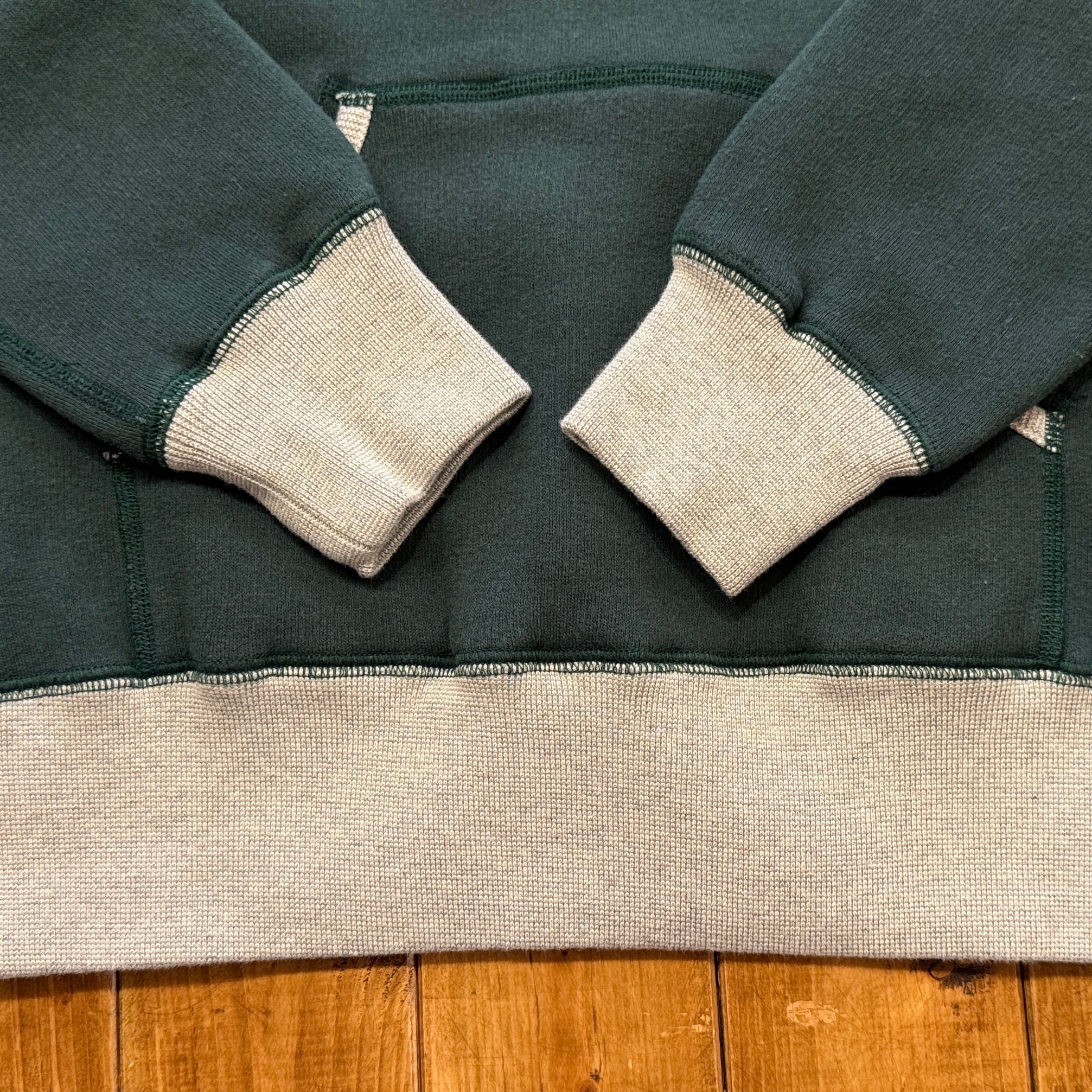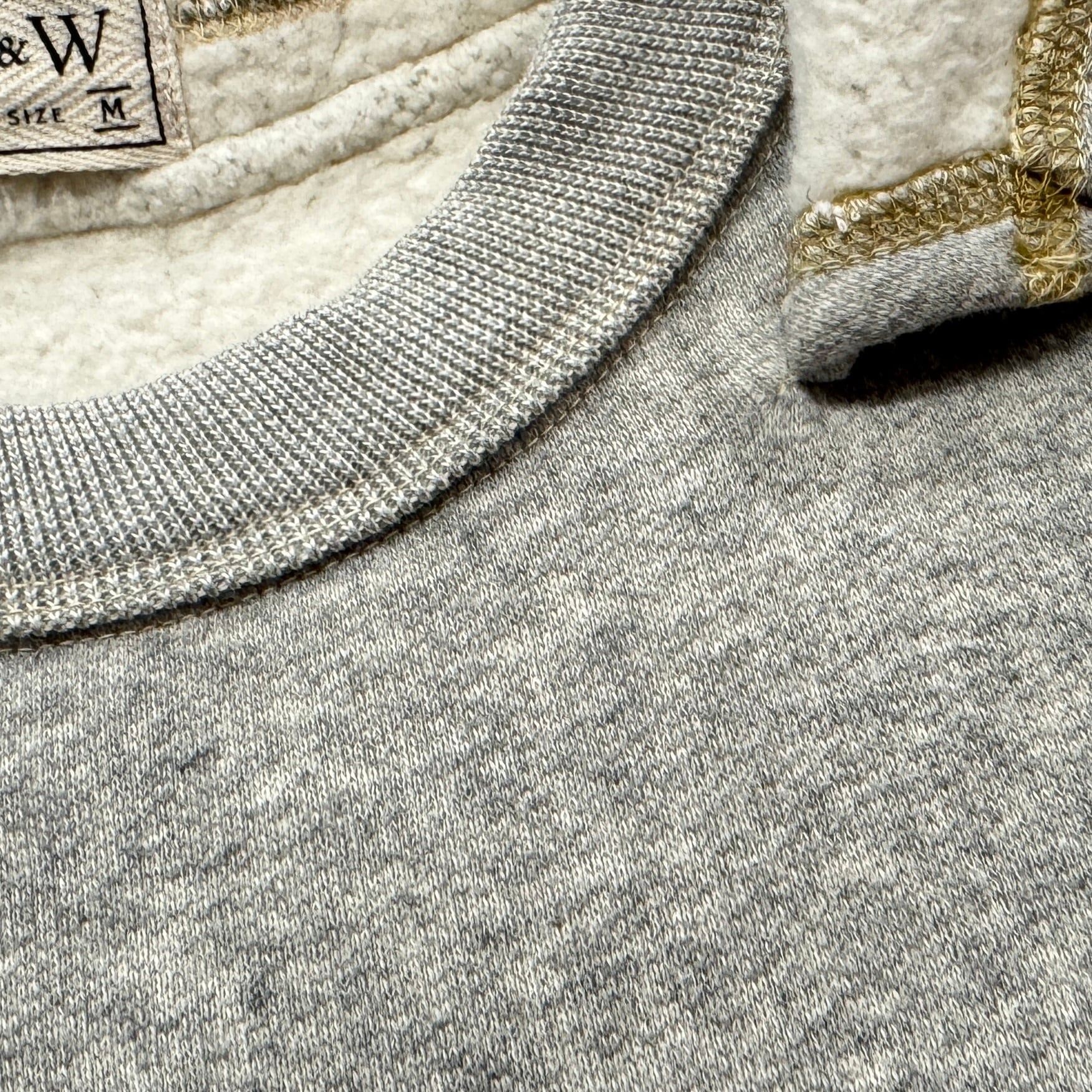 職人の引退により惜しまれつつ生産終了となったトンプキンズスウェットシリーズ。この希少な生地を復活させるべく、和歌山のメリヤス工場にて、シンカー編み機に着目し、70年代の日本製シンカー機を用いて、特殊なノウハウで作り上げた、LOOP & WEFTオールドシンカースウェットシリーズ。トンプキンスウェットの、ふっくらとした独特の素材感を受け継ぎながら、シンカー機特有の良さを活かした綺麗なループ目組織と、収縮後と着用後に型崩れしにくい生地の安定性を高め、古い旧式編み機のデメリットを克服し進化させたオリジナル起毛裏毛。ヴィンテージスウェットを彷彿とさせる風合いは、経年着用で表情を増して行き、袖や首を通した瞬間に独自のふっくらとした暖かく着心地の良い素材を体感できる特別な裏毛として作り上げています。
