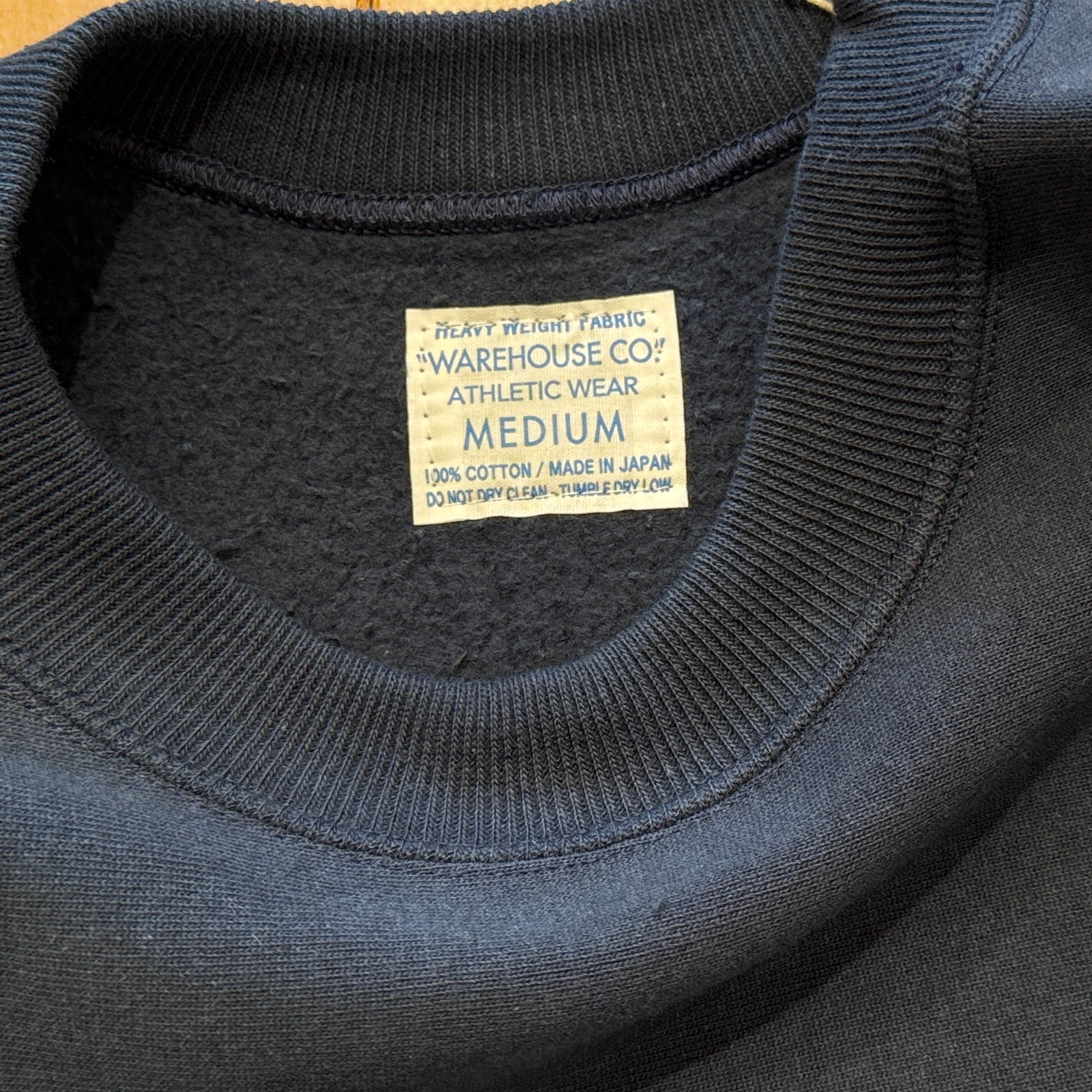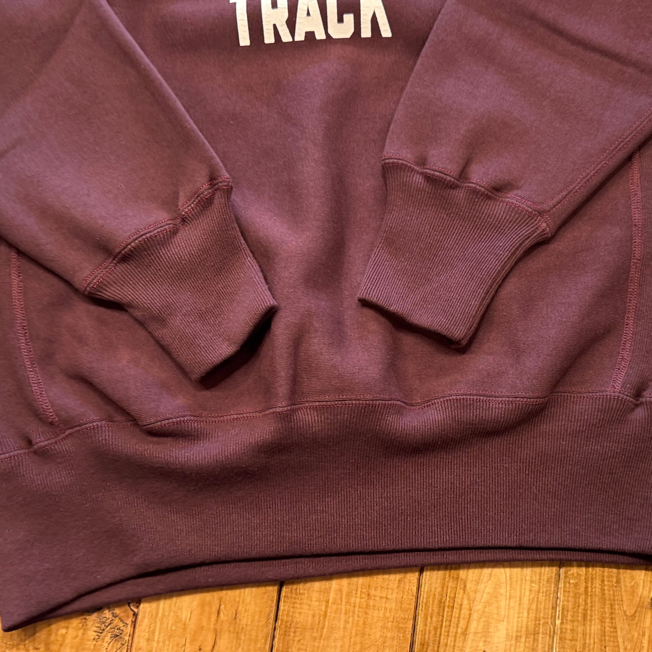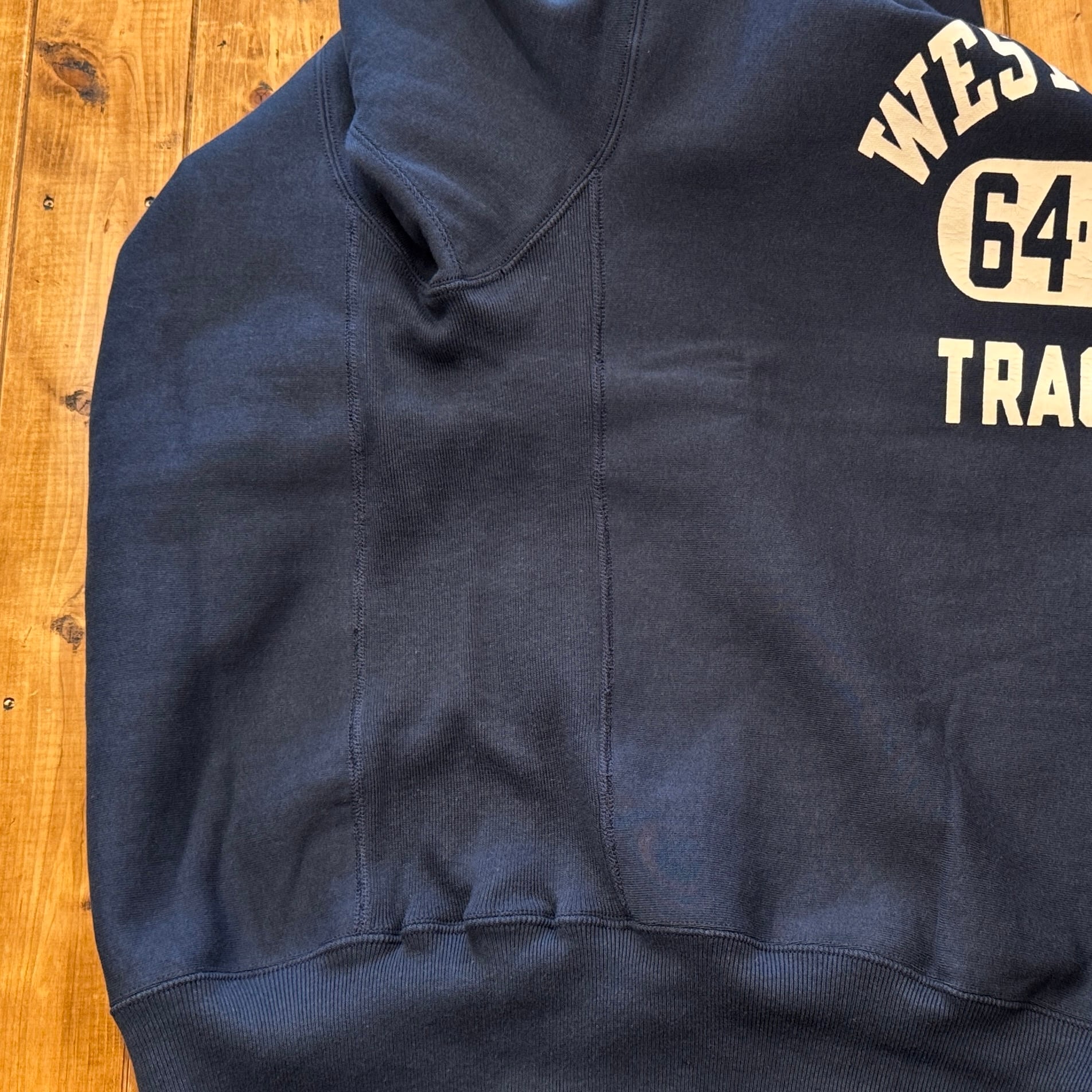 このスウェットシャツを手に取ってみると、まずは、その「重さ」に驚くことでしょう。1960年代のRWタイプを再現するために試行錯誤を繰り返した新開発のスウェットシャツ。縮みを軽減するために生地をヨコ使いした画期的なこのアスレチックスウェットは、サイドのパネル使いなどに目をとられがちであるが、その特性は「糸」にあります。徹底した度詰めで編まれたその生地は、硬いが弾性があり、重いがふわりとした柔らかさがあります。そしてウエアハウスがこだわるのは生地の「目」です。「生地の目が立つ」というのは、通常のスウェットでは、「タテ筋」だが、こちらRWモデルでは「ヨコ筋」です。目を立たせるために、糸の番手はもちろん、度の詰め方など、何度もその組み合わせを変えました。そしてたどり着いたのが、スウェットとしては珍しい「引きそろえ」である。通常はそれぞれ1本の糸を表、中、裏に組み合わせて編むスウェットであるが、引きそろえにすることで度を詰めやすくなりました。さらに吊り編み機の特性により、生地の弾性を保ったまま硬く、表面の目を立たせることができるようになったのです。歴史上、後発に採用されるシンカー編み機では、同じ糸の規格でもってしても、硬くなりすぎてしまい、編上がりの違いは歴然としているといいます。出来上がった生地の「重さ」は、染色の際、また縫製においても熟練の作業を要します。染色の際には通常よりも負荷がかかるし、縫製でも軽いニットウェアのようにはいきません。生地、染色、縫製、すべての工程においての協力による「バトンリレー」が、このRWタイプのスウェットの「重み」なのです。そして、このRWモデルのオリジナルについても後述しておきます。驚くべきことに、「タタキタグ」と通称される60年代のヴィンテージの、生地の破れた部分を解析すると、「引きそろえ」の糸が露出していたというのです。アスレチックウェアとして、牧歌的でありながらも妥協することなく開発を試みた先駆者の精神は、「限りなきディテールの追求」によってこそ発掘されるのです。