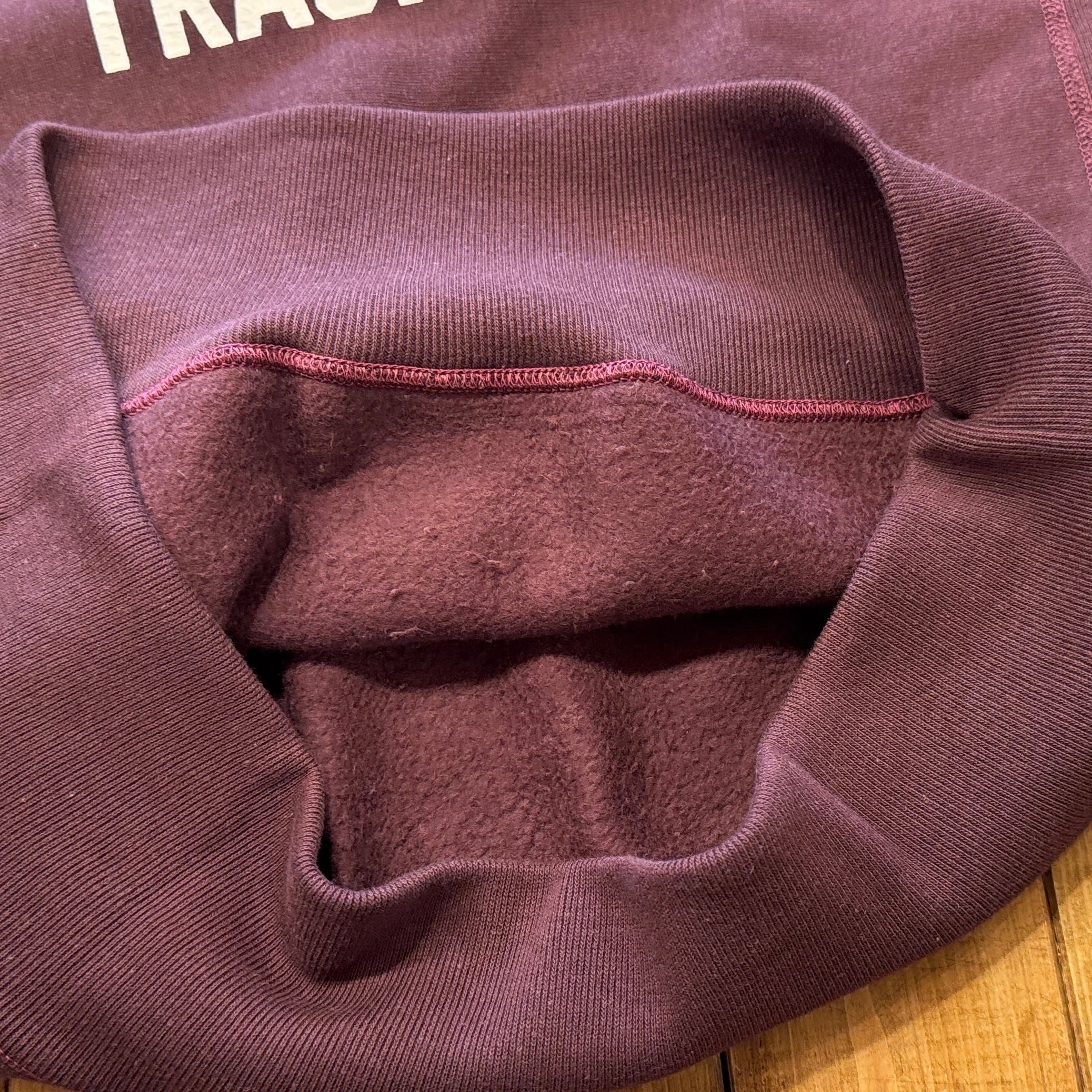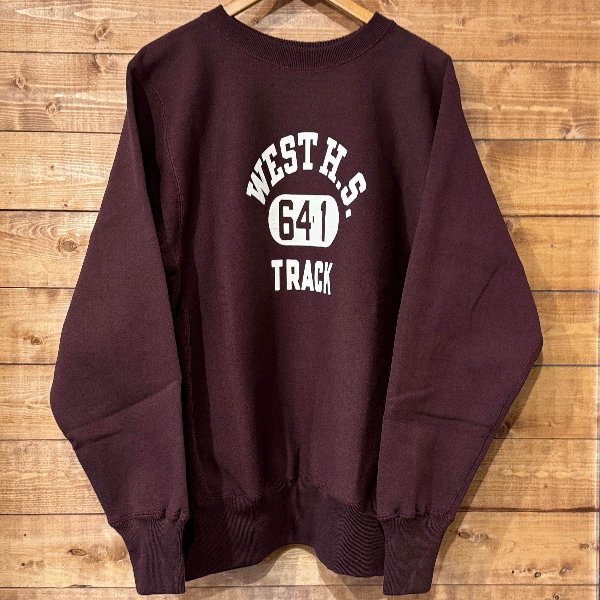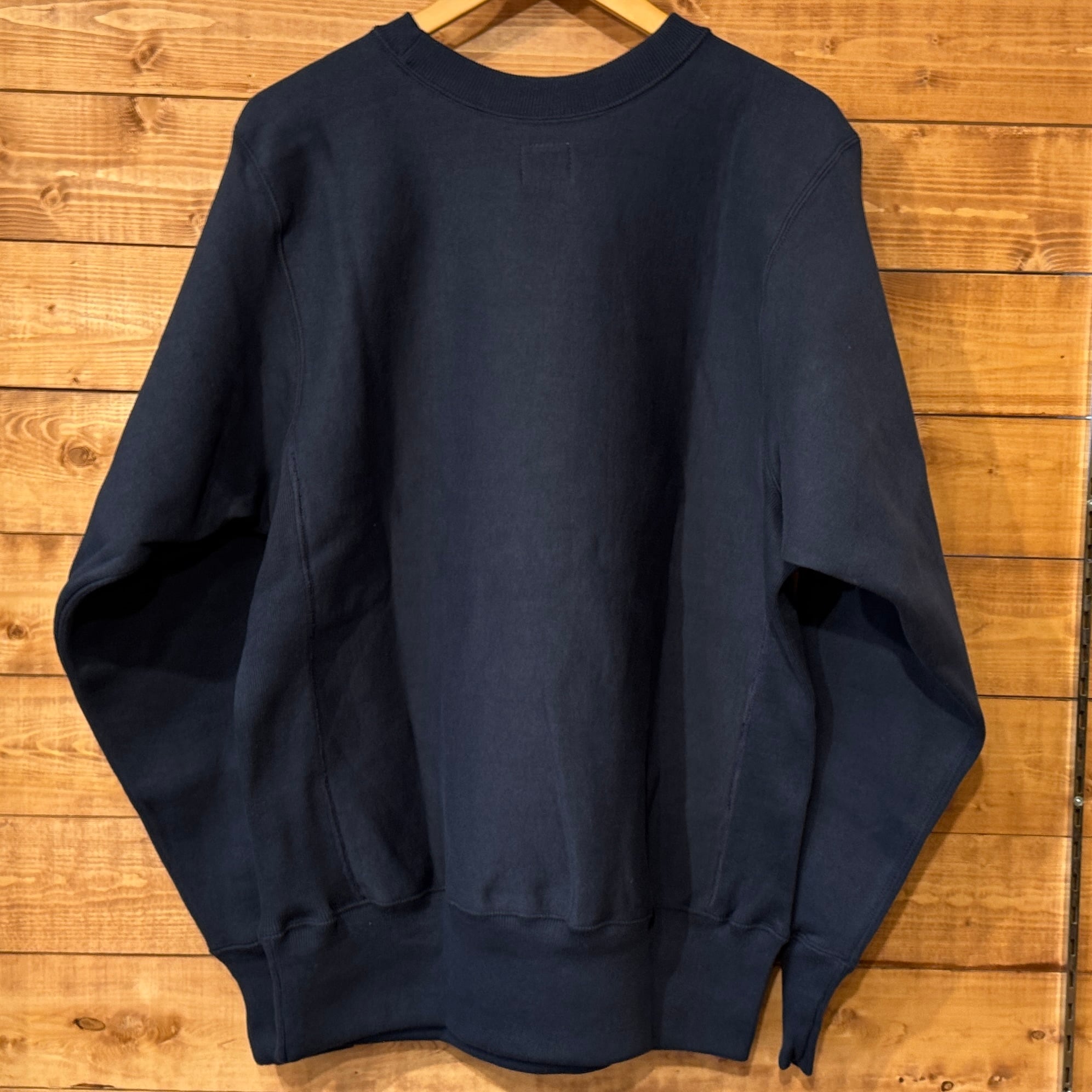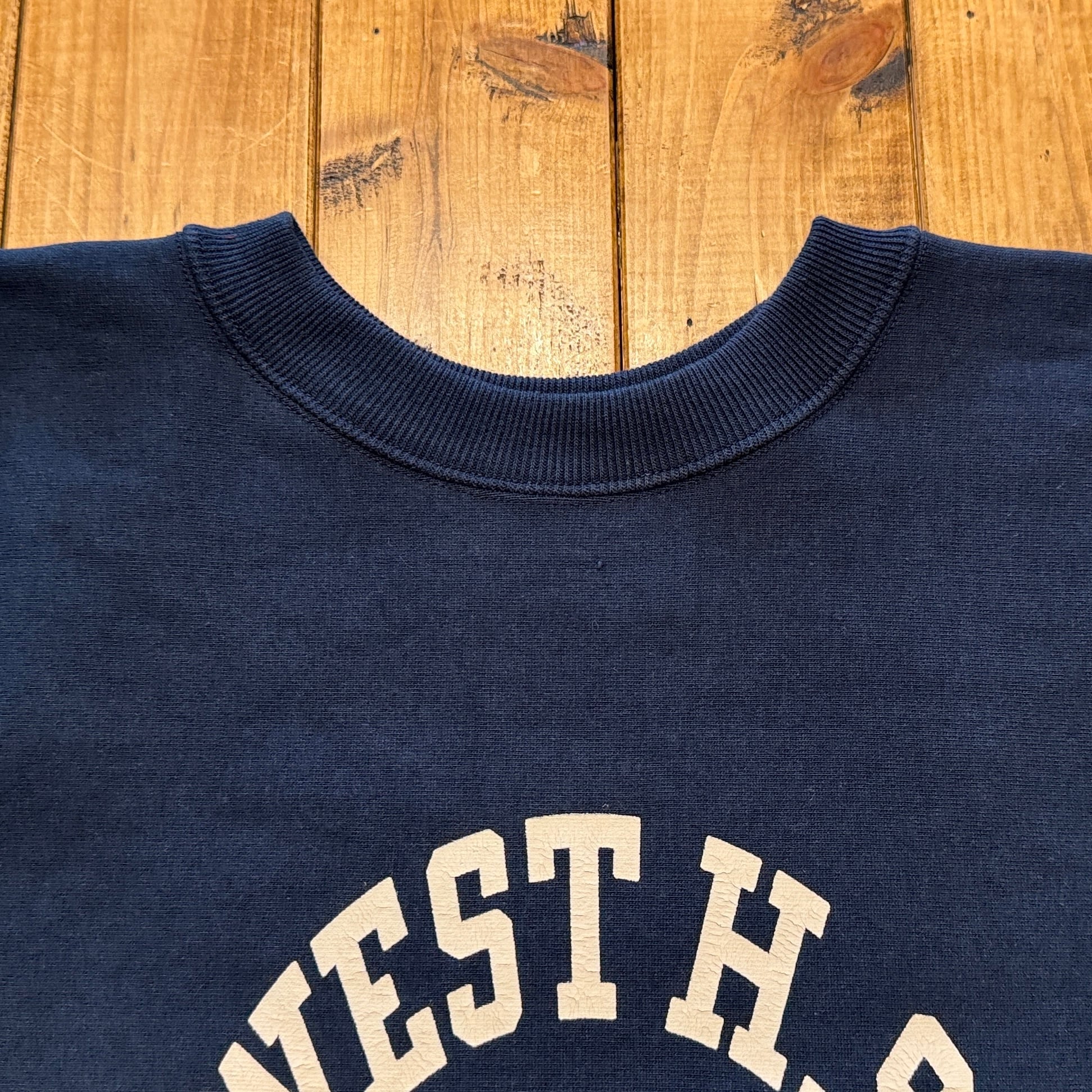 このスウェットシャツを手に取ってみると、まずは、その「重さ」に驚くことでしょう。1960年代のRWタイプを再現するために試行錯誤を繰り返した新開発のスウェットシャツ。縮みを軽減するために生地をヨコ使いした画期的なこのアスレチックスウェットは、サイドのパネル使いなどに目をとられがちであるが、その特性は「糸」にあります。徹底した度詰めで編まれたその生地は、硬いが弾性があり、重いがふわりとした柔らかさがあります。そしてウエアハウスがこだわるのは生地の「目」です。「生地の目が立つ」というのは、通常のスウェットでは、「タテ筋」だが、こちらRWモデルでは「ヨコ筋」です。目を立たせるために、糸の番手はもちろん、度の詰め方など、何度もその組み合わせを変えました。そしてたどり着いたのが、スウェットとしては珍しい「引きそろえ」である。通常はそれぞれ1本の糸を表、中、裏に組み合わせて編むスウェットであるが、引きそろえにすることで度を詰めやすくなりました。さらに吊り編み機の特性により、生地の弾性を保ったまま硬く、表面の目を立たせることができるようになったのです。歴史上、後発に採用されるシンカー編み機では、同じ糸の規格でもってしても、硬くなりすぎてしまい、編上がりの違いは歴然としているといいます。出来上がった生地の「重さ」は、染色の際、また縫製においても熟練の作業を要します。染色の際には通常よりも負荷がかかるし、縫製でも軽いニットウェアのようにはいきません。生地、染色、縫製、すべての工程においての協力による「バトンリレー」が、このRWタイプのスウェットの「重み」なのです。そして、このRWモデルのオリジナルについても後述しておきます。驚くべきことに、「タタキタグ」と通称される60年代のヴィンテージの、生地の破れた部分を解析すると、「引きそろえ」の糸が露出していたというのです。アスレチックウェアとして、牧歌的でありながらも妥協することなく開発を試みた先駆者の精神は、「限りなきディテールの追求」によってこそ発掘されるのです。