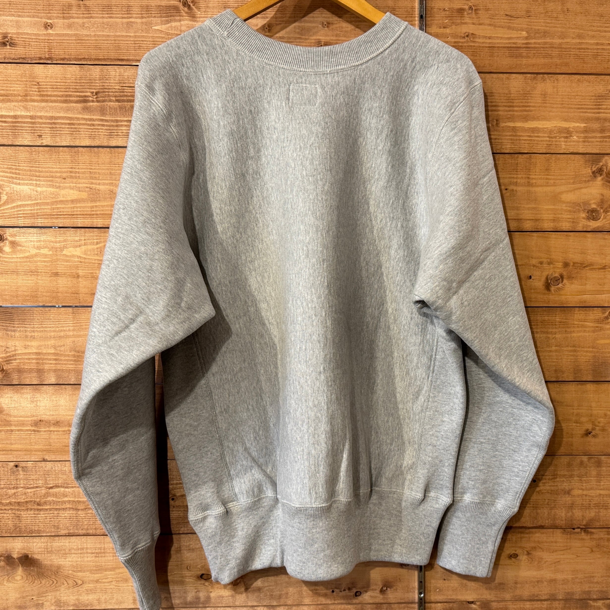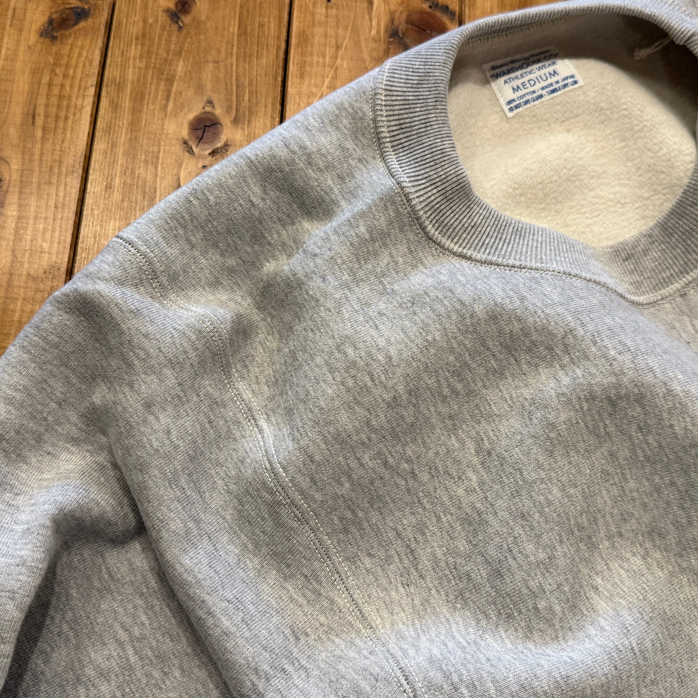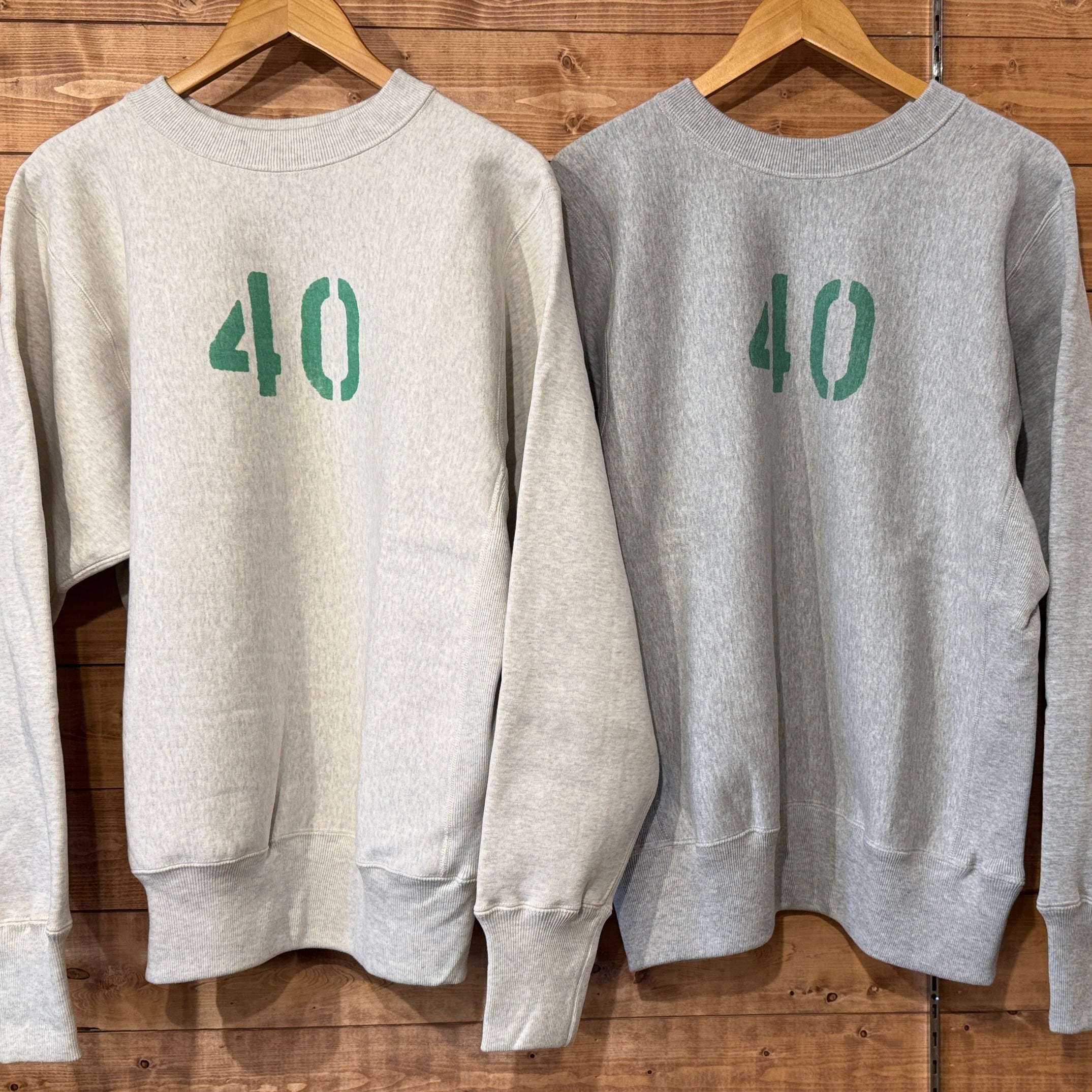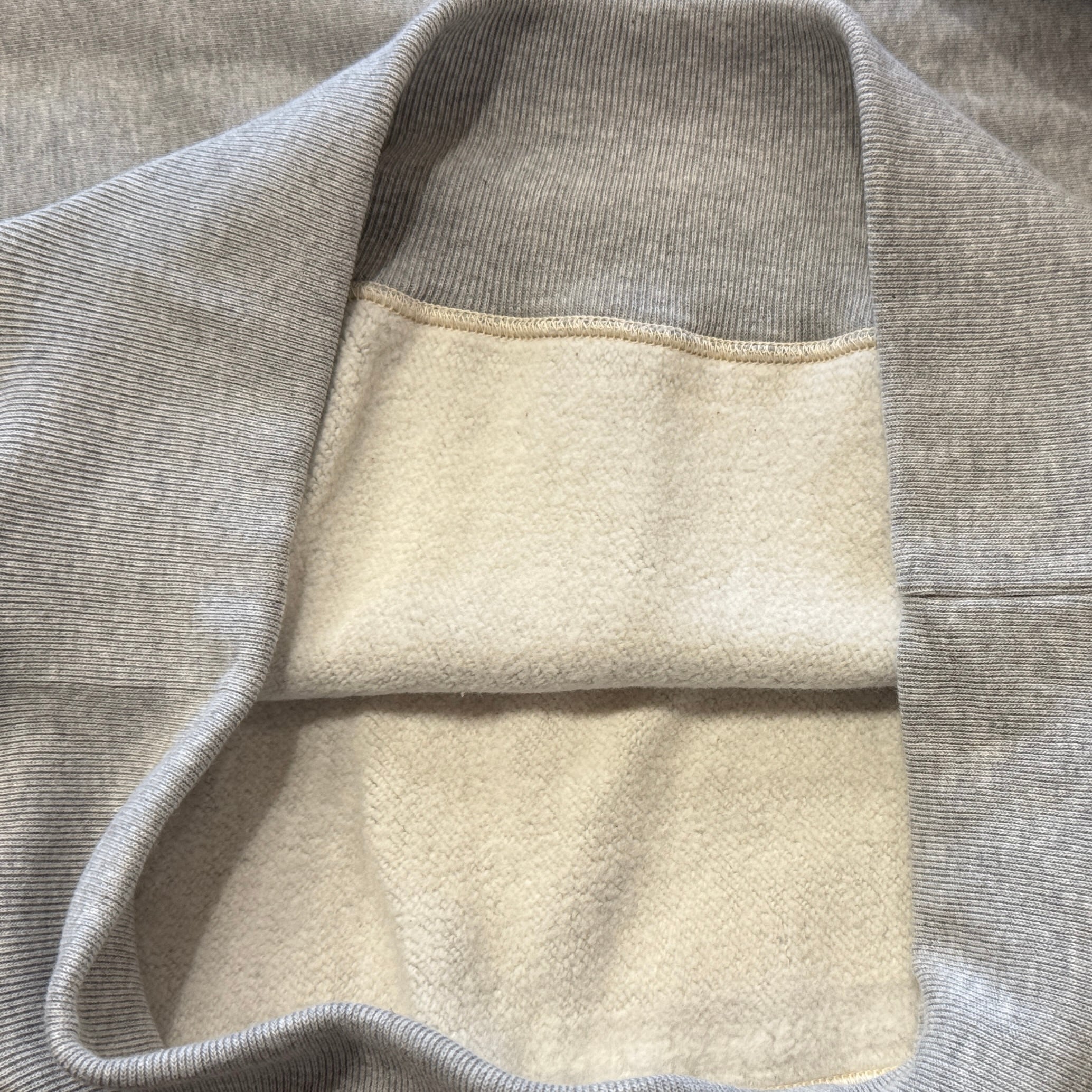 このスウェットシャツを手に取ってみると、まずは、その「重さ」に驚くことでしょう。1960年代のRWタイプを再現するために試行錯誤を繰り返した新開発のスウェットシャツ。縮みを軽減するために生地をヨコ使いした画期的なこのアスレチックスウェットは、サイドのパネル使いなどに目をとられがちであるが、その特性は「糸」にあります。徹底した度詰めで編まれたその生地は、硬いが弾性があり、重いがふわりとした柔らかさがあります。そしてウエアハウスがこだわるのは生地の「目」です。「生地の目が立つ」というのは、通常のスウェットでは、「タテ筋」だが、こちらRWモデルでは「ヨコ筋」です。目を立たせるために、糸の番手はもちろん、度の詰め方など、何度もその組み合わせを変えました。そしてたどり着いたのが、スウェットとしては珍しい「引きそろえ」である。通常はそれぞれ1本の糸を表、中、裏に組み合わせて編むスウェットであるが、引きそろえにすることで度を詰めやすくなりました。さらに吊り編み機の特性により、生地の弾性を保ったまま硬く、表面の目を立たせることができるようになったのです。歴史上、後発に採用されるシンカー編み機では、同じ糸の規格でもってしても、硬くなりすぎてしまい、編上がりの違いは歴然としているといいます。出来上がった生地の「重さ」は、染色の際、また縫製においても熟練の作業を要します。染色の際には通常よりも負荷がかかるし、縫製でも軽いニットウェアのようにはいきません。生地、染色、縫製、すべての工程においての協力による「バトンリレー」が、このRWタイプのスウェットの「重み」なのです。そして、このRWモデルのオリジナルについても後述しておきます。驚くべきことに、「タタキタグ」と通称される60年代のヴィンテージの、生地の破れた部分を解析すると、「引きそろえ」の糸が露出していたというのです。アスレチックウェアとして、牧歌的でありながらも妥協することなく開発を試みた先駆者の精神は、「限りなきディテールの追求」によってこそ発掘されるのです。