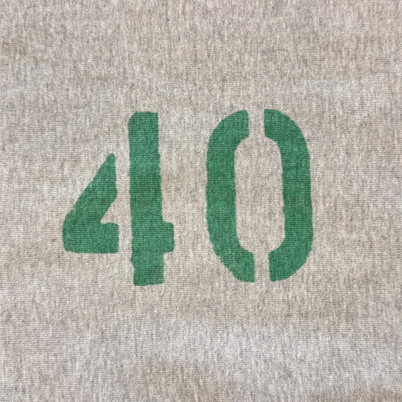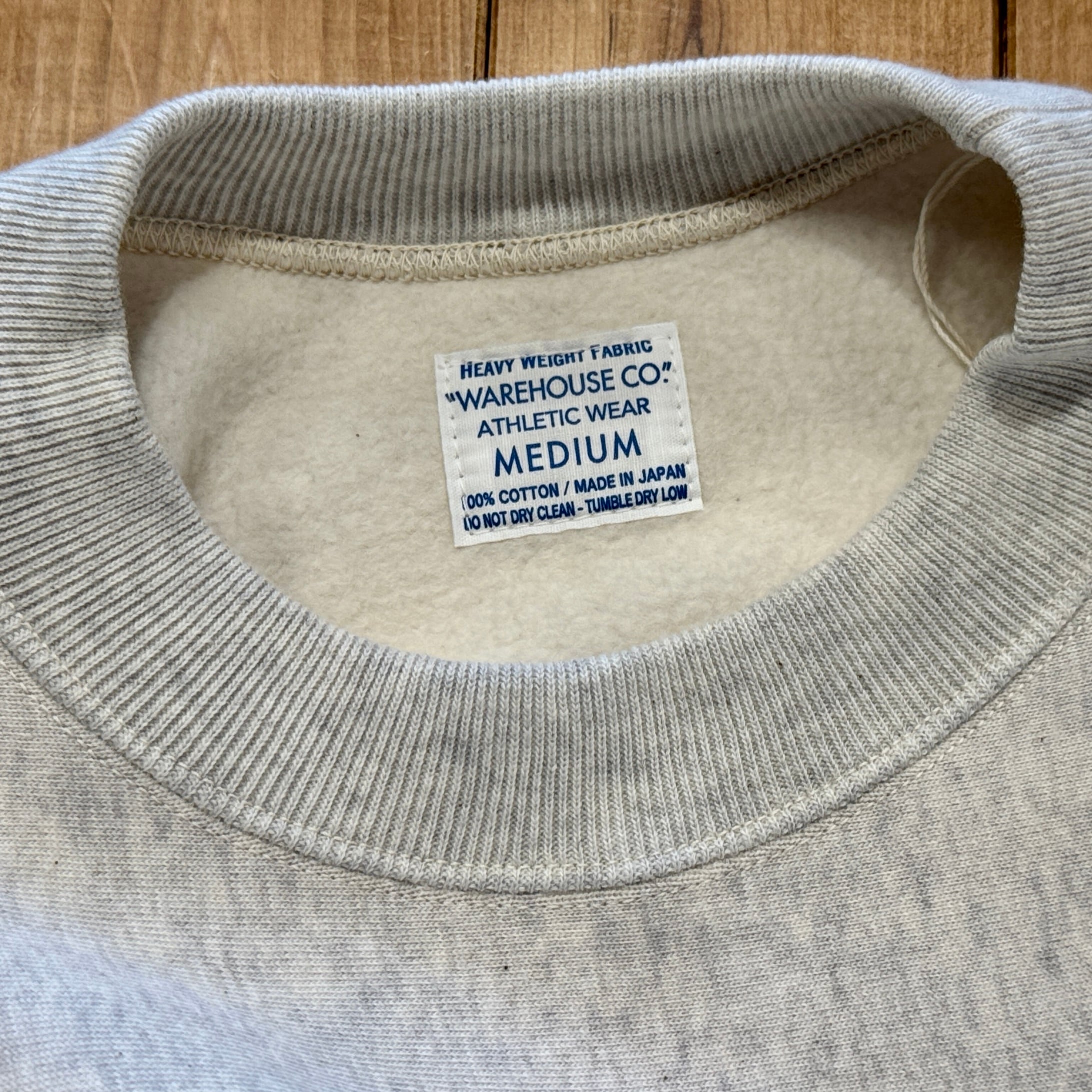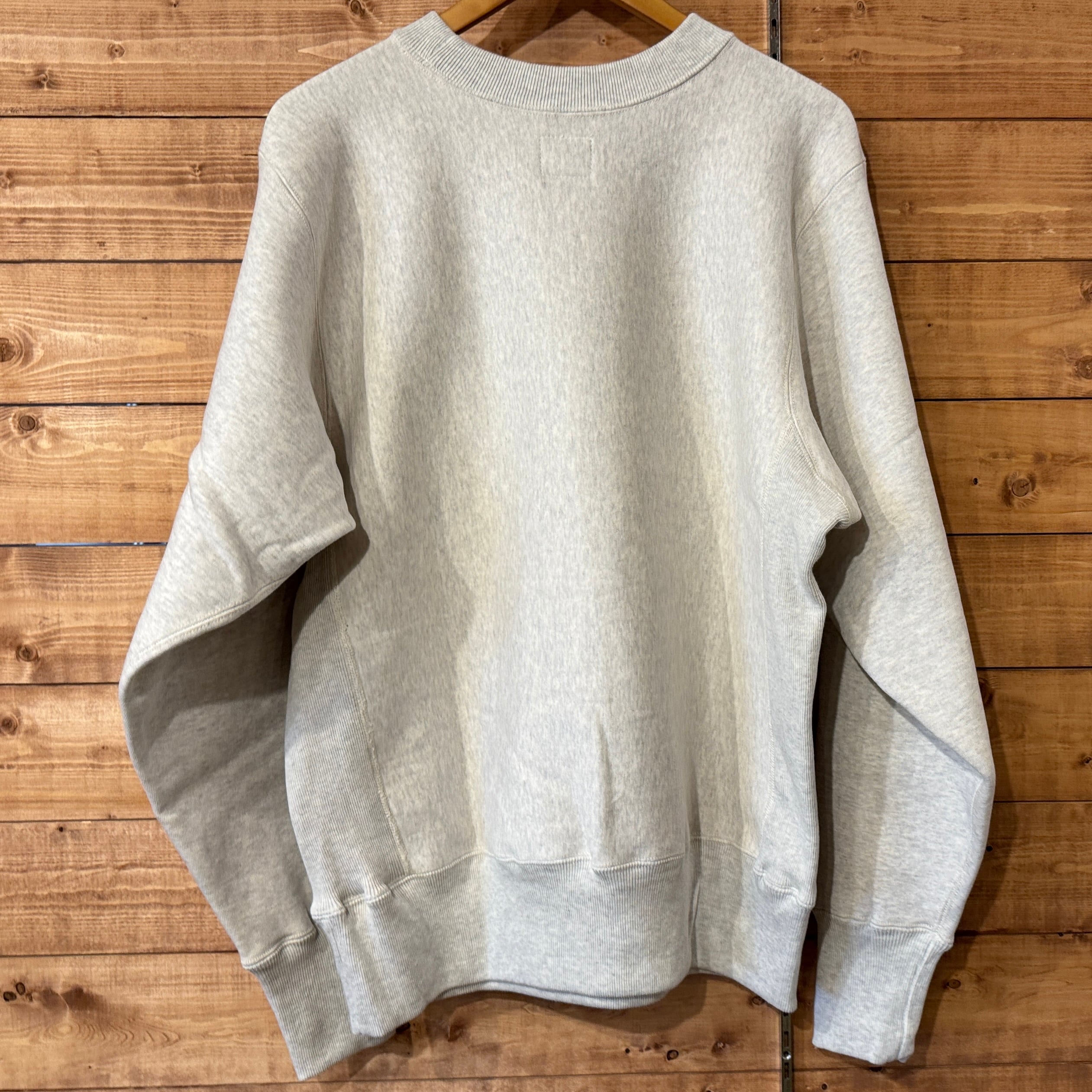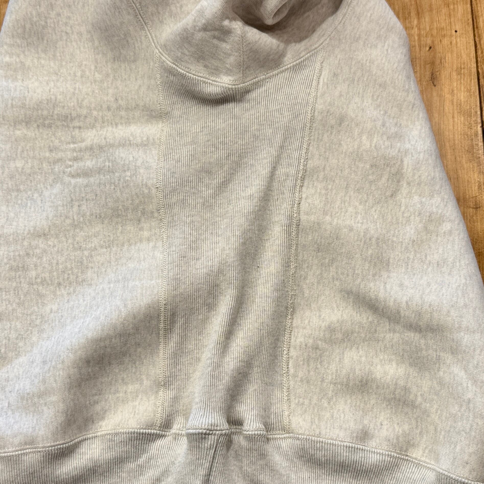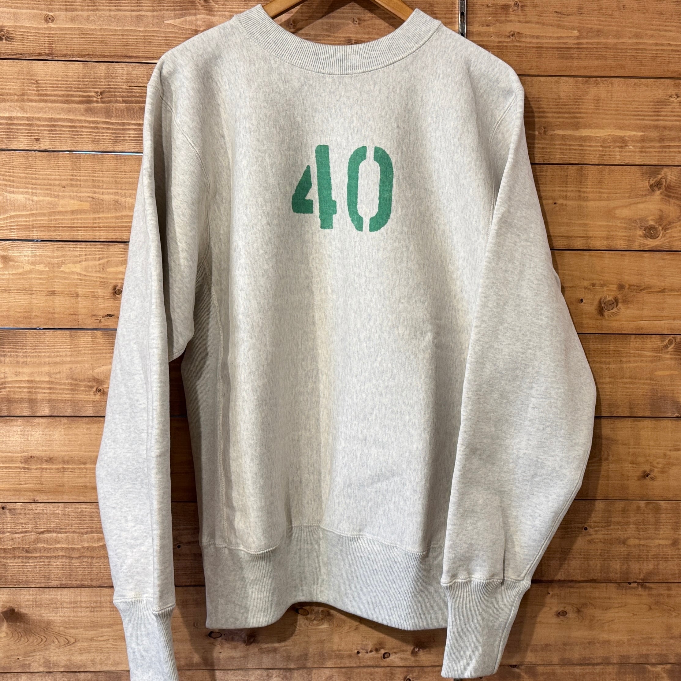 このスウェットシャツを手に取ってみると、まずは、その「重さ」に驚くことでしょう。1960年代のRWタイプを再現するために試行錯誤を繰り返した新開発のスウェットシャツ。縮みを軽減するために生地をヨコ使いした画期的なこのアスレチックスウェットは、サイドのパネル使いなどに目をとられがちであるが、その特性は「糸」にあります。徹底した度詰めで編まれたその生地は、硬いが弾性があり、重いがふわりとした柔らかさがあります。そしてウエアハウスがこだわるのは生地の「目」です。「生地の目が立つ」というのは、通常のスウェットでは、「タテ筋」だが、こちらRWモデルでは「ヨコ筋」です。目を立たせるために、糸の番手はもちろん、度の詰め方など、何度もその組み合わせを変えました。そしてたどり着いたのが、スウェットとしては珍しい「引きそろえ」である。通常はそれぞれ1本の糸を表、中、裏に組み合わせて編むスウェットであるが、引きそろえにすることで度を詰めやすくなりました。さらに吊り編み機の特性により、生地の弾性を保ったまま硬く、表面の目を立たせることができるようになったのです。歴史上、後発に採用されるシンカー編み機では、同じ糸の規格でもってしても、硬くなりすぎてしまい、編上がりの違いは歴然としているといいます。出来上がった生地の「重さ」は、染色の際、また縫製においても熟練の作業を要します。染色の際には通常よりも負荷がかかるし、縫製でも軽いニットウェアのようにはいきません。生地、染色、縫製、すべての工程においての協力による「バトンリレー」が、このRWタイプのスウェットの「重み」なのです。そして、このRWモデルのオリジナルについても後述しておきます。驚くべきことに、「タタキタグ」と通称される60年代のヴィンテージの、生地の破れた部分を解析すると、「引きそろえ」の糸が露出していたというのです。アスレチックウェアとして、牧歌的でありながらも妥協することなく開発を試みた先駆者の精神は、「限りなきディテールの追求」によってこそ発掘されるのです。
