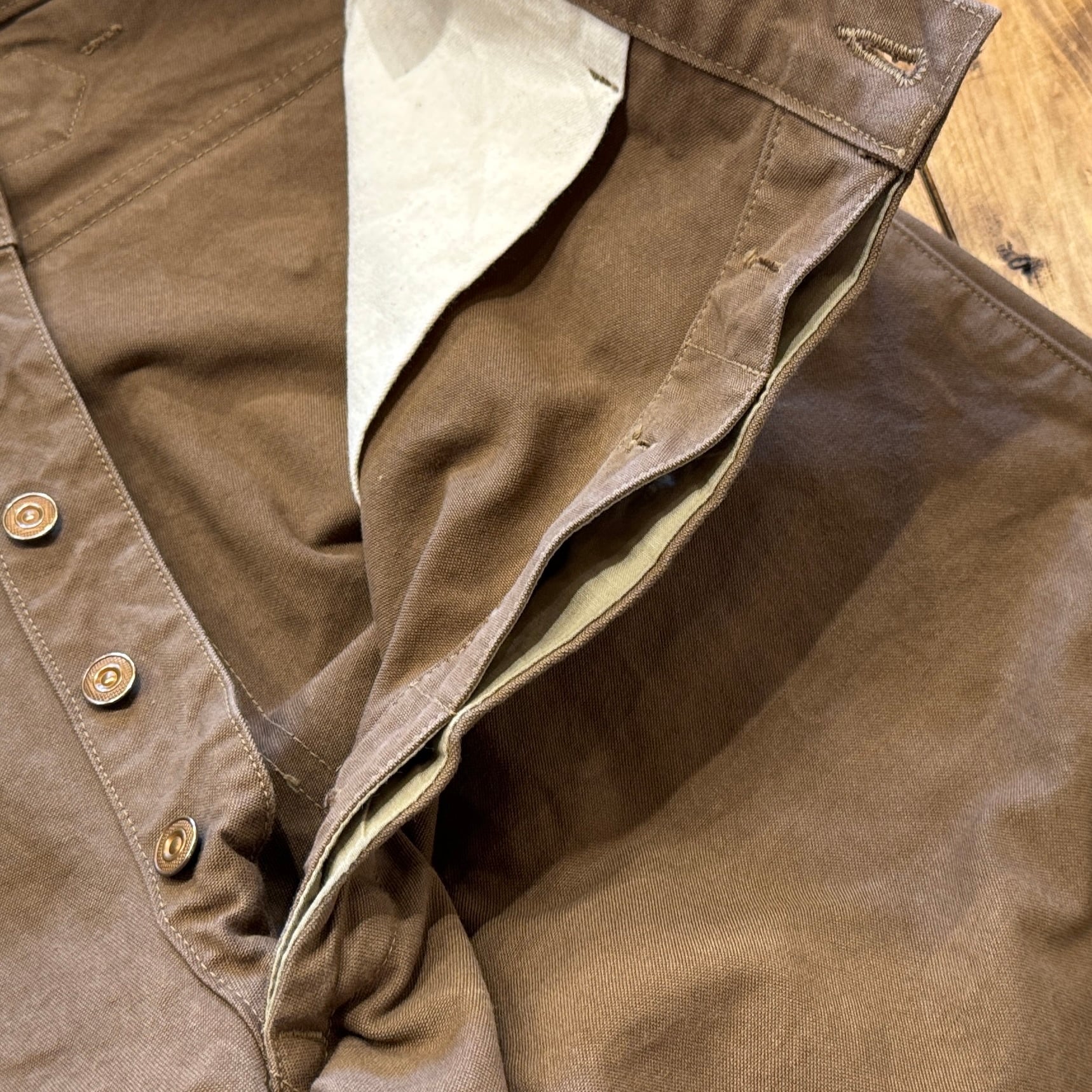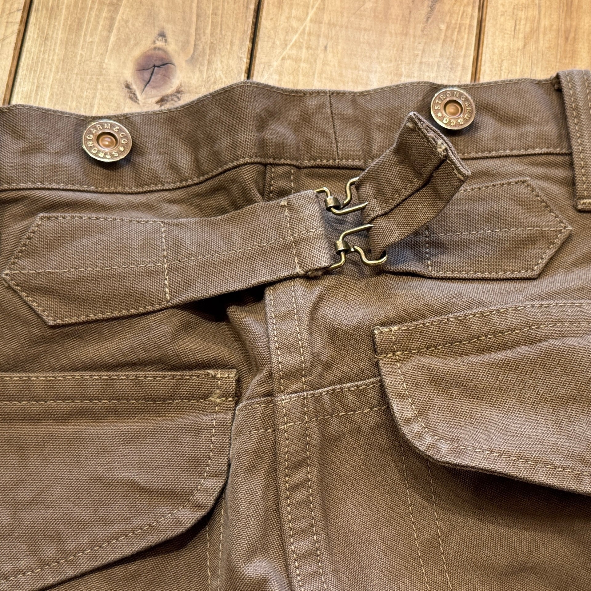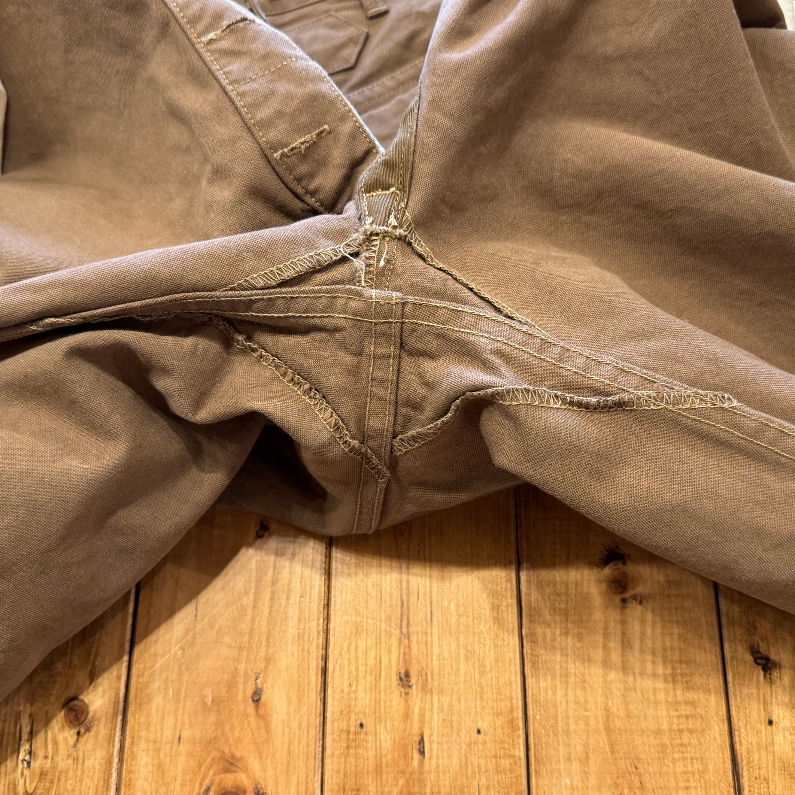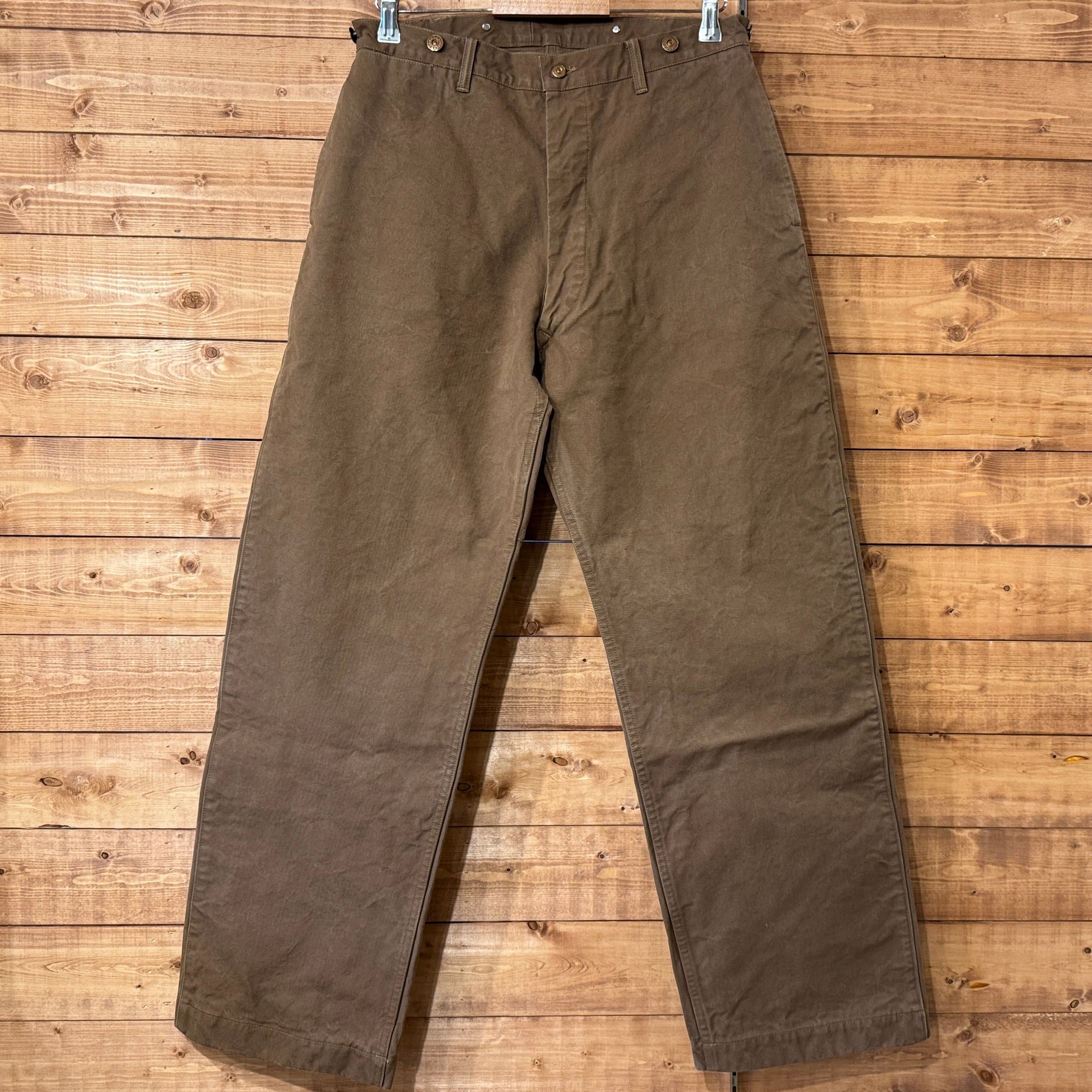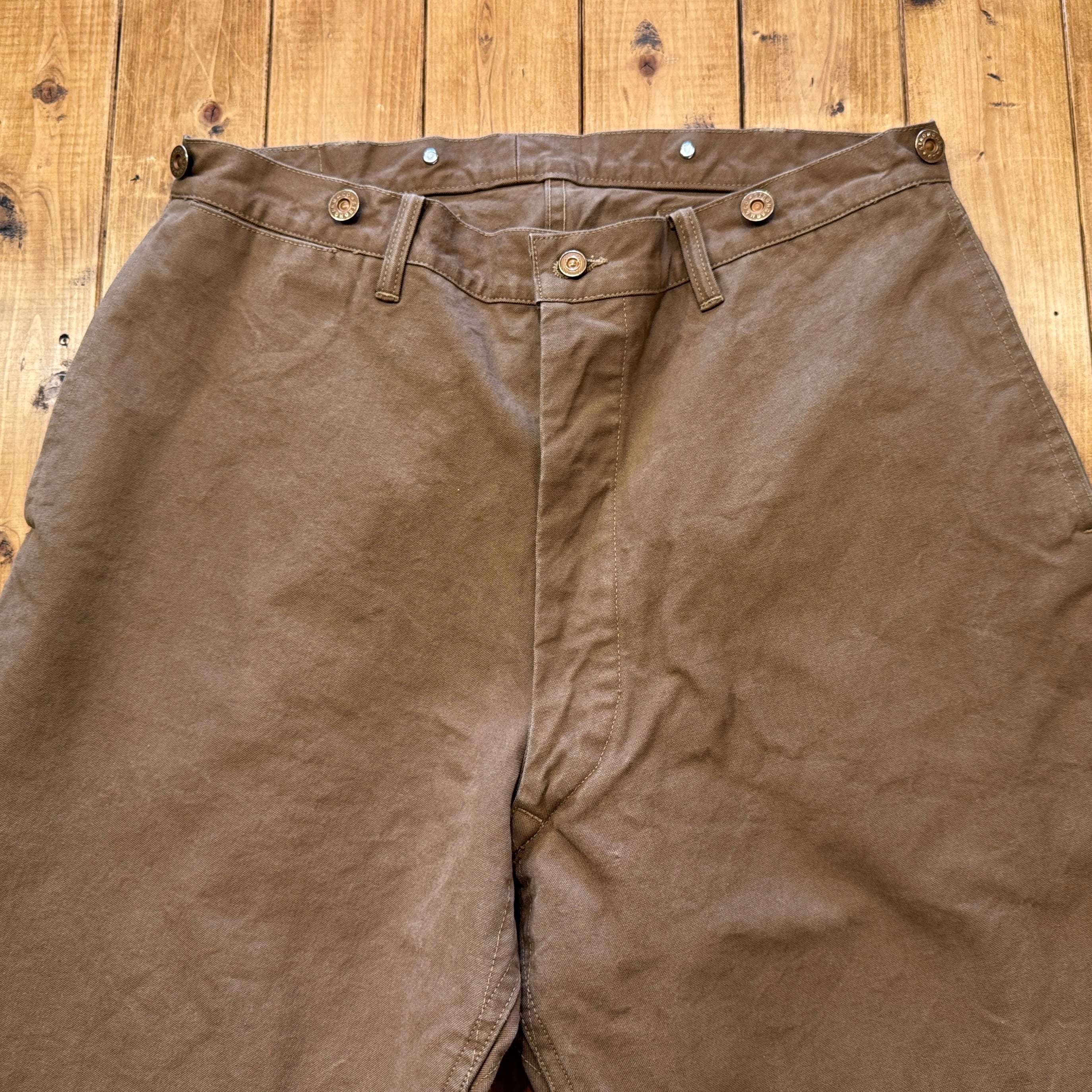 深みのある色のブラウンダックはかなり重量感あります。フロントは上から下まで生地が2重、ヒップも2重。サスペンダーボタン含めて全て鉄製タックボタン。ディティール含めてかなりヘヴィーデューティーさが伺える仕様です。作るのも一苦労な1本でしょう。