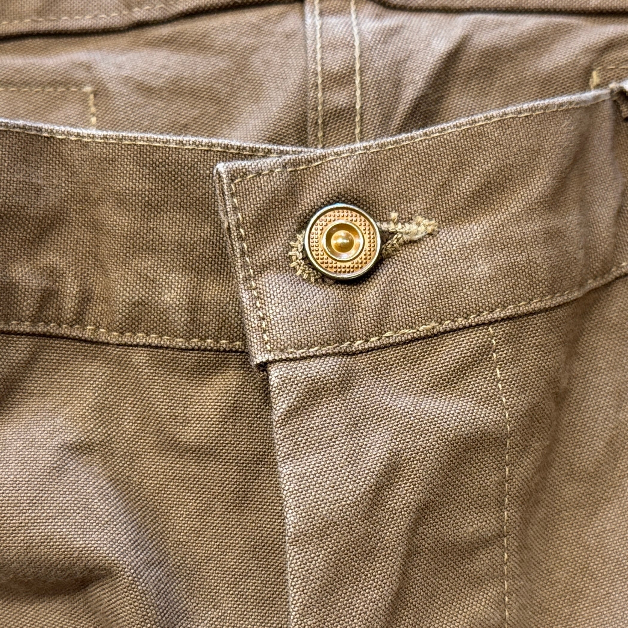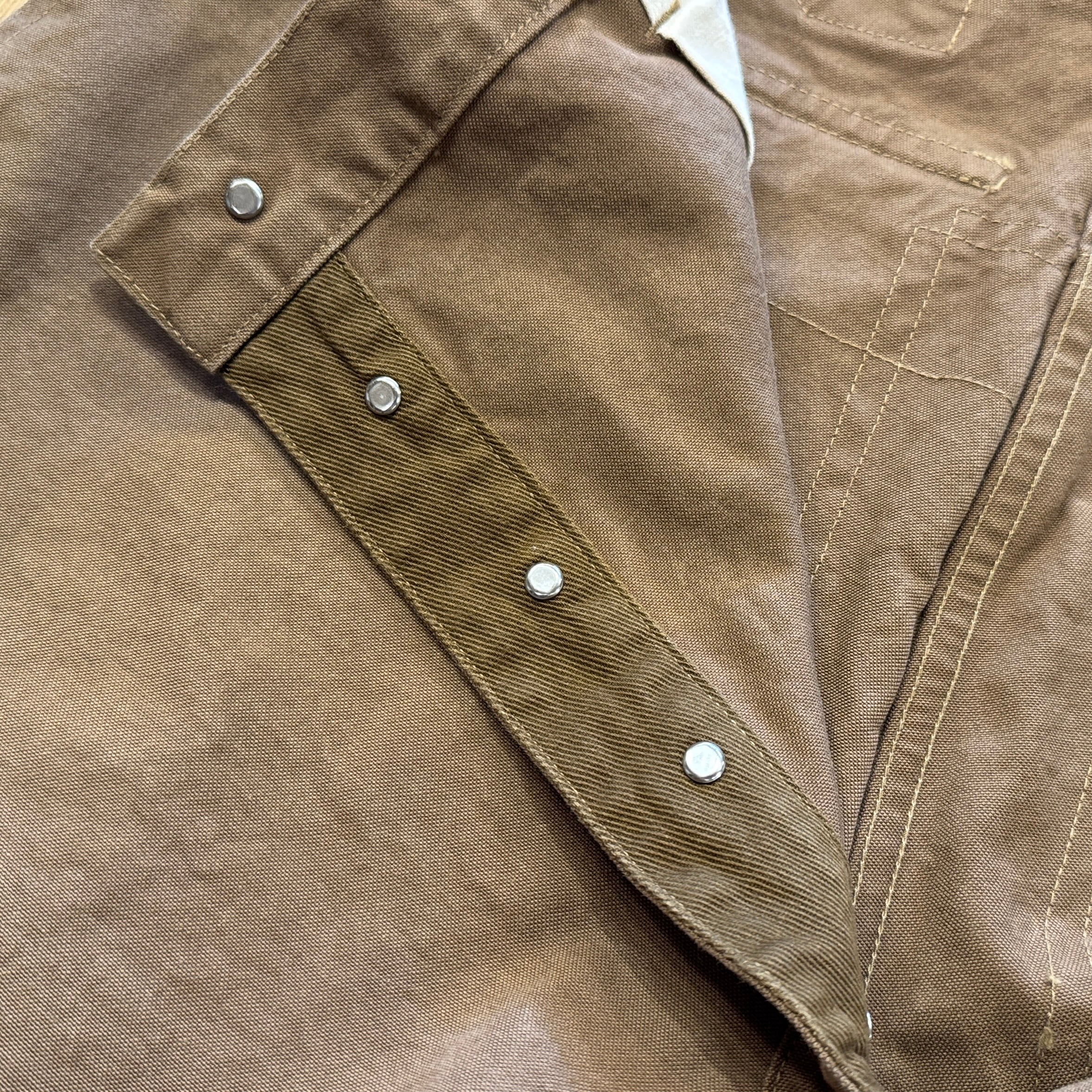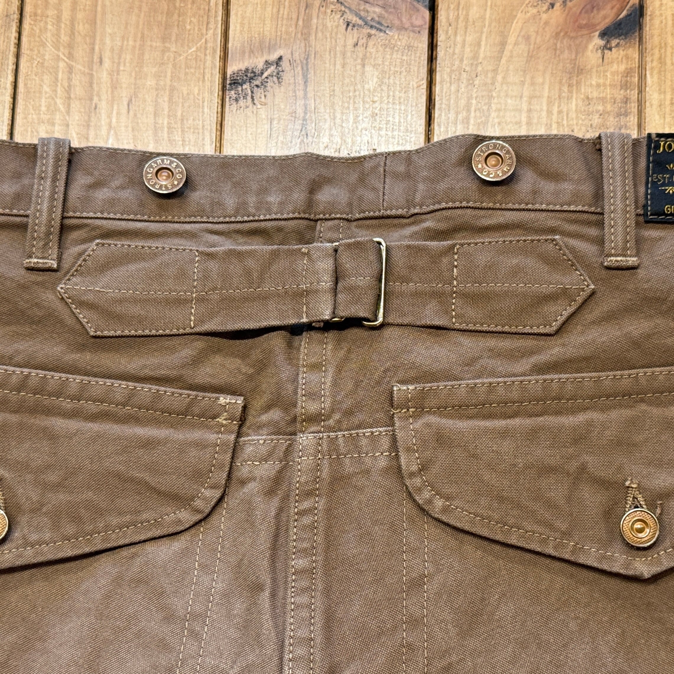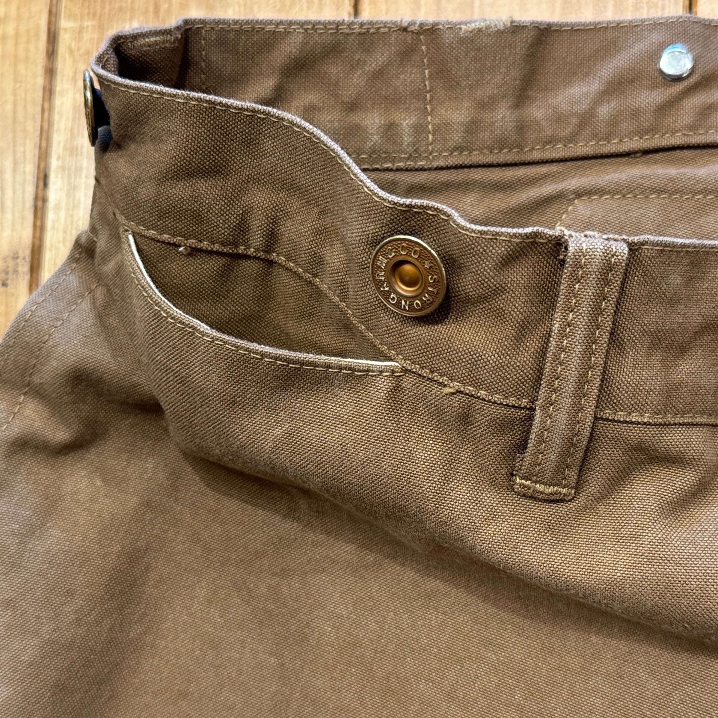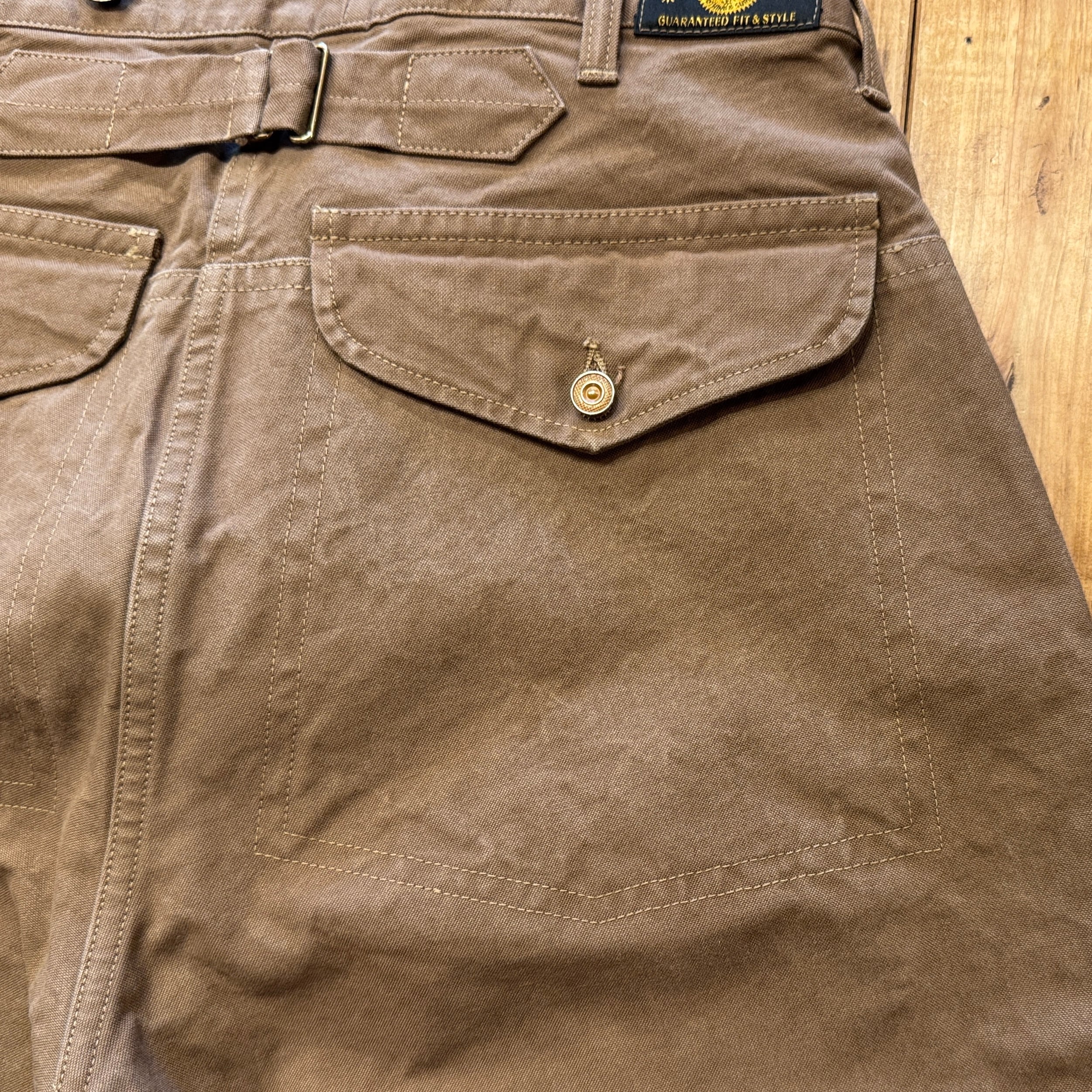 深みのある色のブラウンダックはかなり重量感あります。フロントは上から下まで生地が2重、ヒップも2重。サスペンダーボタン含めて全て鉄製タックボタン。ディティール含めてかなりヘヴィーデューティーさが伺える仕様です。作るのも一苦労な1本でしょう。