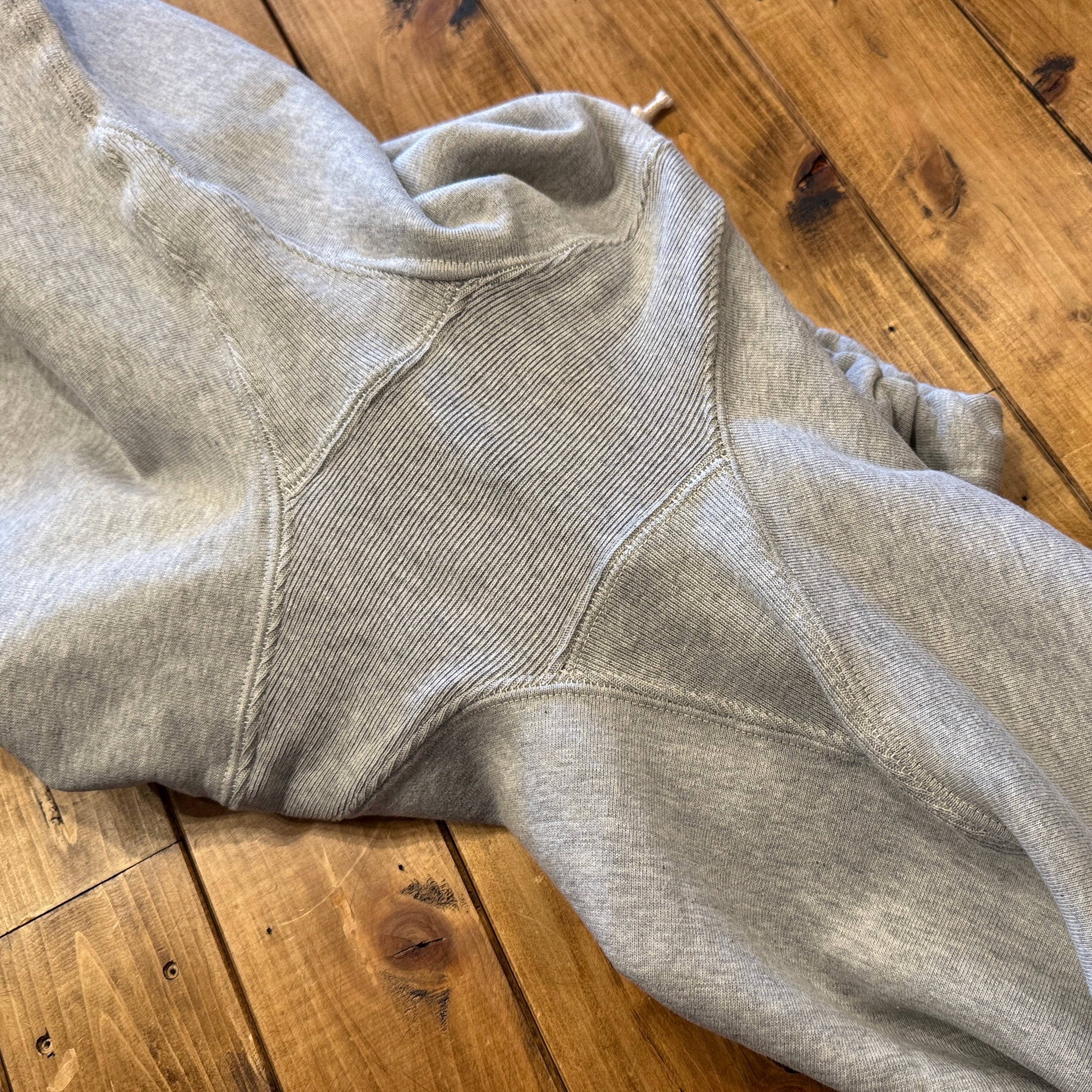 このスウェットを手に取ってみると、まずは、その「重さ」に驚くことでしょう。1960年代のRWタイプを再現するために試行錯誤を繰り返した新開発のスウェットシャツ。縮みを軽減するために生地をヨコ使いした画期的なこのアスレチックスウェットは、サイドのパネル使いなどに目をとられがちであるが、その特性は「糸」にあります。徹底した度詰めで編まれたその生地は、硬いが弾性があり、重いがふわりとした柔らかさがあります。そしてウエアハウスがこだわるのは生地の「目」です。「生地の目が立つ」というのは、通常のスウェットでは、「タテ筋」だが、こちらRWモデルでは「ヨコ筋」です。目を立たせるために、糸の番手はもちろん、度の詰め方など、何度もその組み合わせを変えました。そしてたどり着いたのが、スウェットとしては珍しい「引きそろえ」である。通常はそれぞれ1本の糸を表、中、裏に組み合わせて編むスウェットであるが、引きそろえにすることで度を詰めやすくなりました。さらに吊り編み機の特性により、生地の弾性を保ったまま硬く、表面の目を立たせることができるようになったのです。歴史上、後発に採用されるシンカー編み機では、同じ糸の規格でもってしても、硬くなりすぎてしまい、編上がりの違いは歴然としているといいます。出来上がった生地の「重さ」は、染色の際、また縫製においても熟練の作業を要します。染色の際には通常よりも負荷がかかるし、縫製でも軽いニットウェアのようにはいきません。生地、染色、縫製、すべての工程においての協力による「バトンリレー」が、このRWタイプのスウェットの「重み」なのです。そして、このRWモデルのオリジナルについても後述しておきます。驚くべきことに、「タタキタグ」と通称される60年代のヴィンテージの、生地の破れた部分を解析すると、「引きそろえ」の糸が露出していたというのです。アスレチックウェアとして、牧歌的でありながらも妥協することなく開発を試みた先駆者の精神は、「限りなきディテールの追求」によってこそ発掘されるのです。