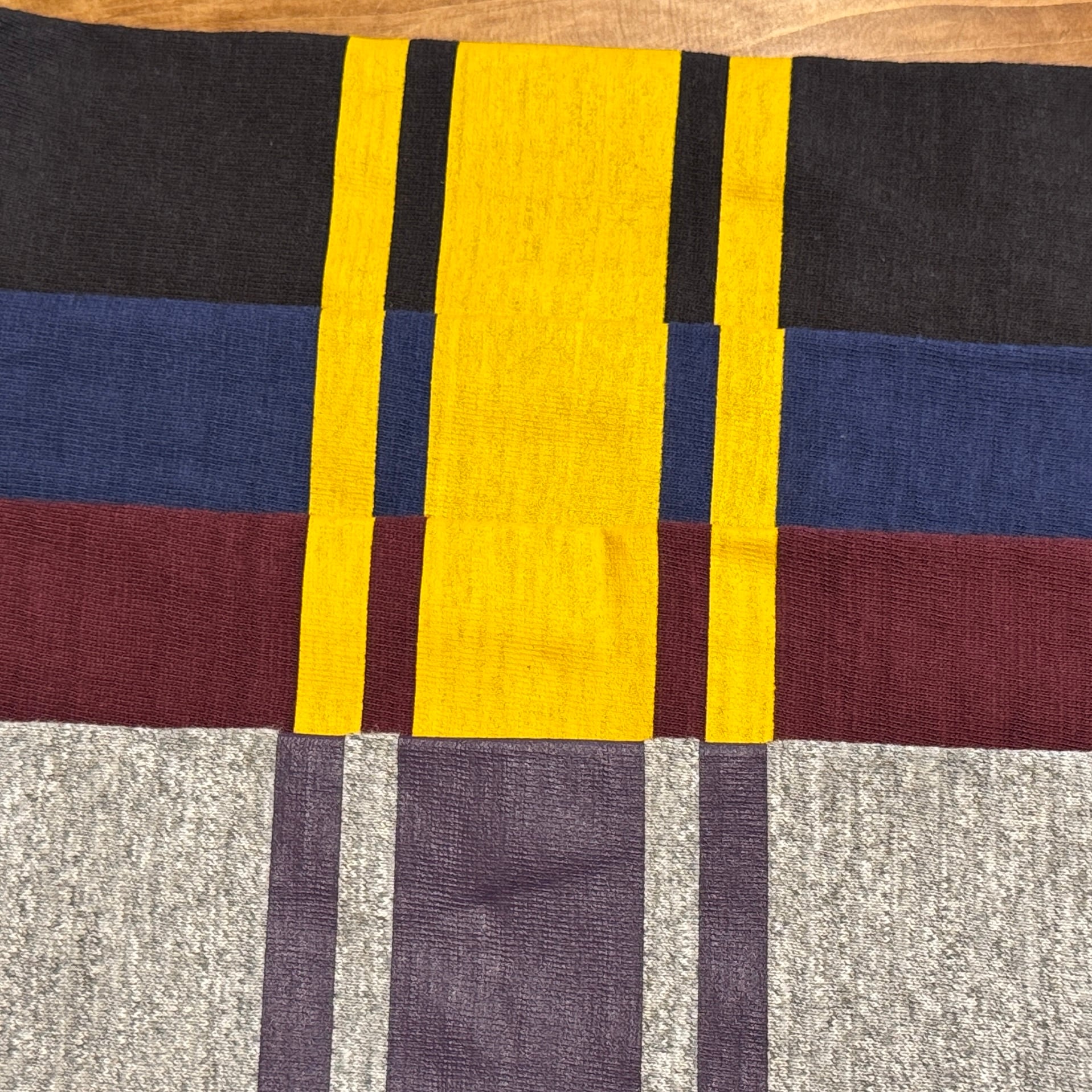 12番のムラ糸で独特の陰影が出るように編まれたこの生地はシャドウボーダーと呼ばれており、無地でありながらうっすらと横段のようなムラが浮かびます。