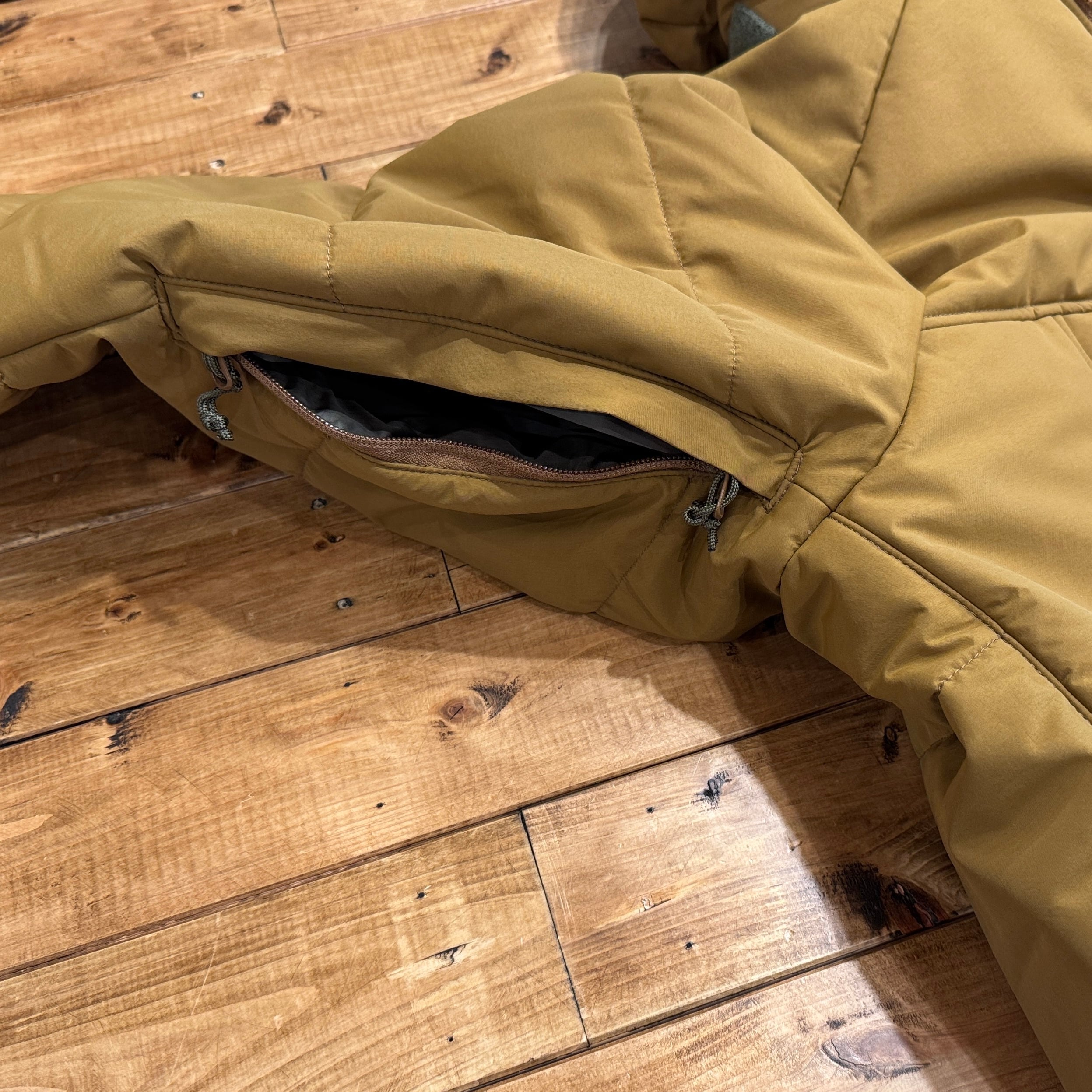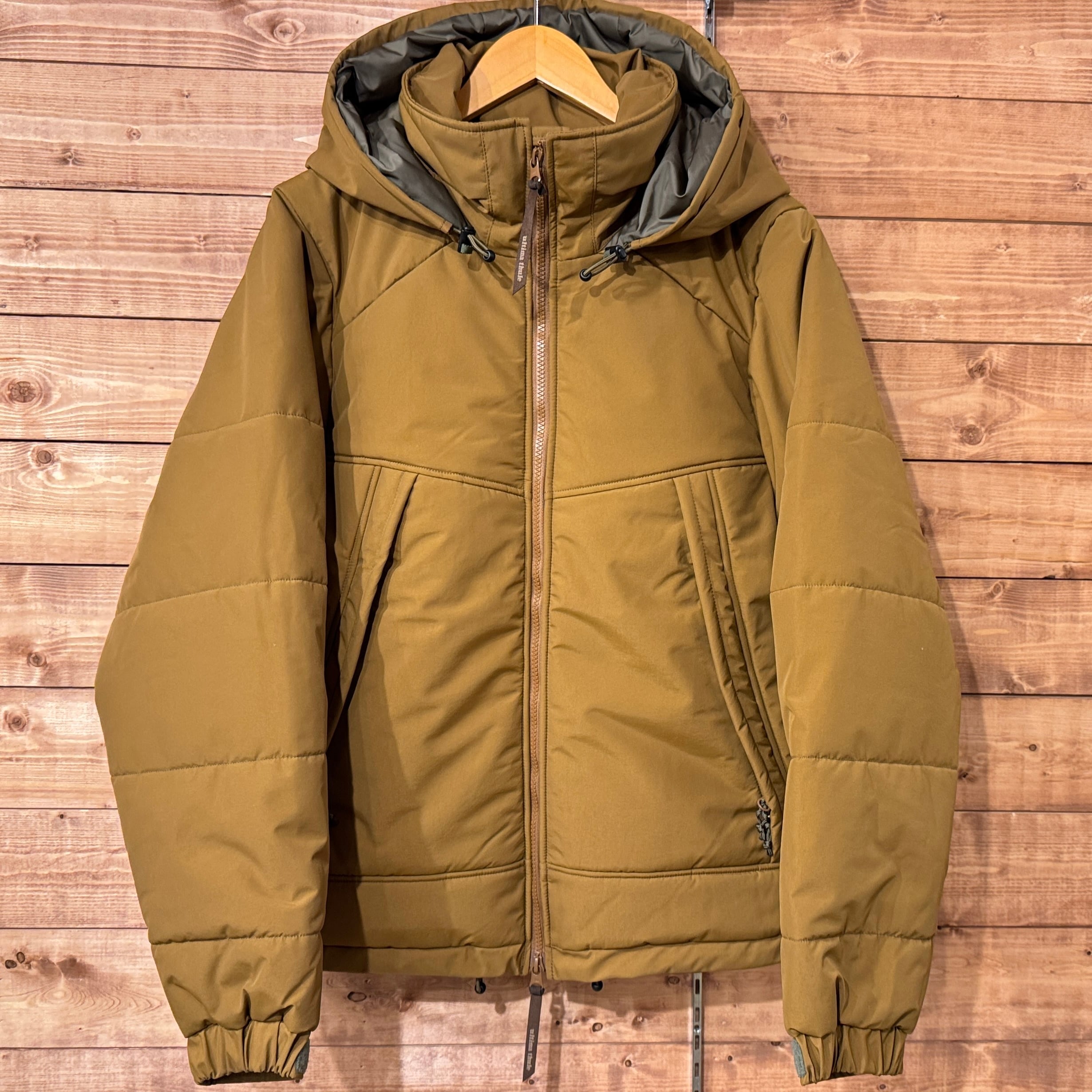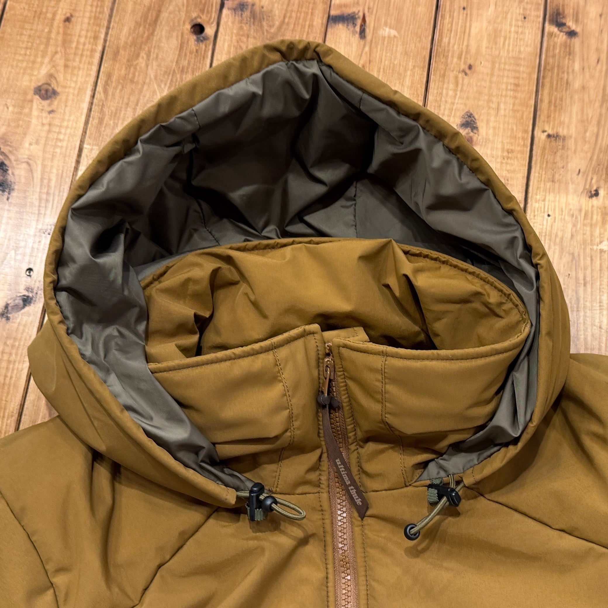 中綿はプリマロフトGOLD、フードは襟に収納可能、Wジップ仕様、腹部の大型ポケットの内側は肌触りの良い温かいフリース素材を内側に。袖口はベルクロ調節、脇下はジッパー式で蒸れ防止対応。裏ポケットが腰の位置に両サイドつきます。ドローコード内蔵で風の侵入を防ぎます。