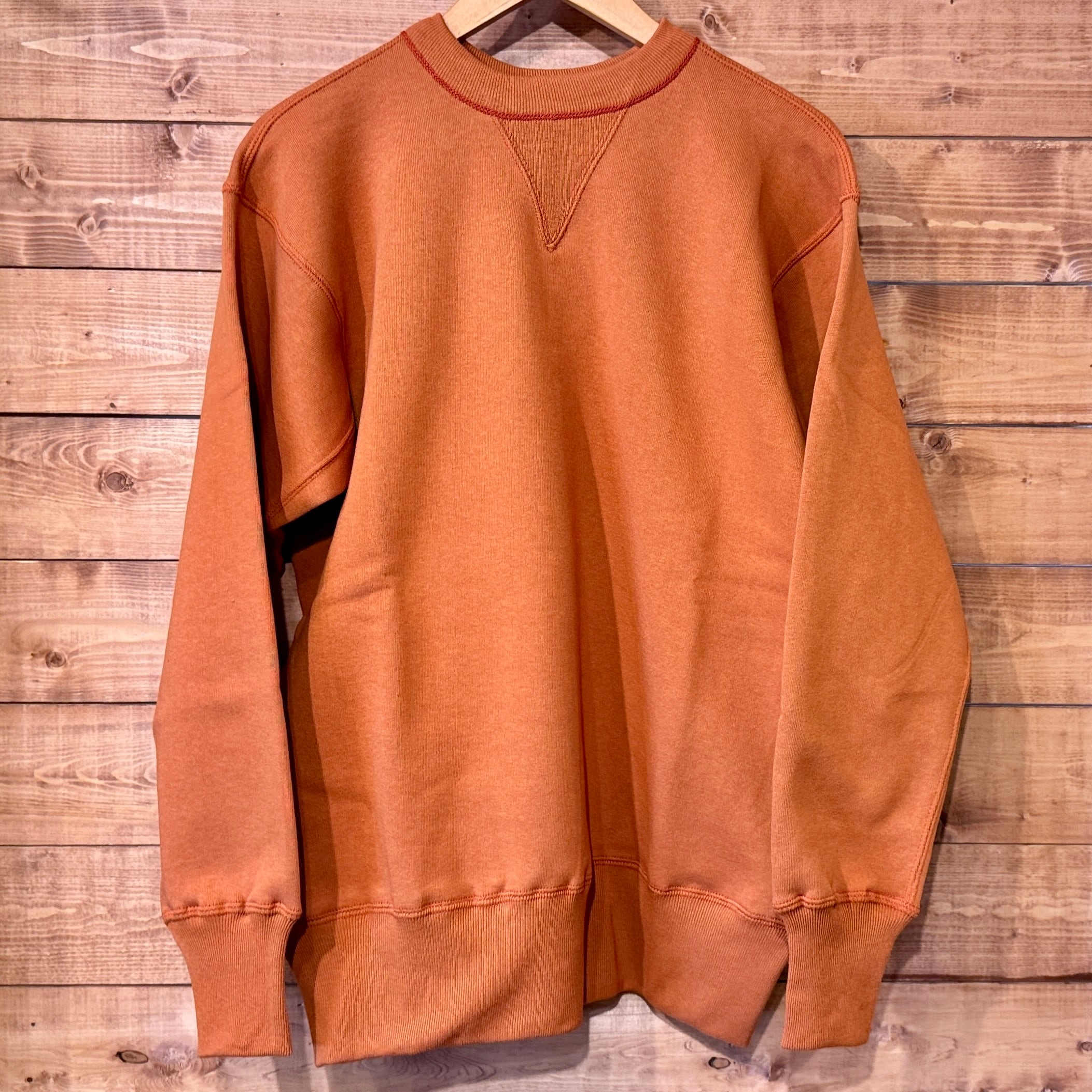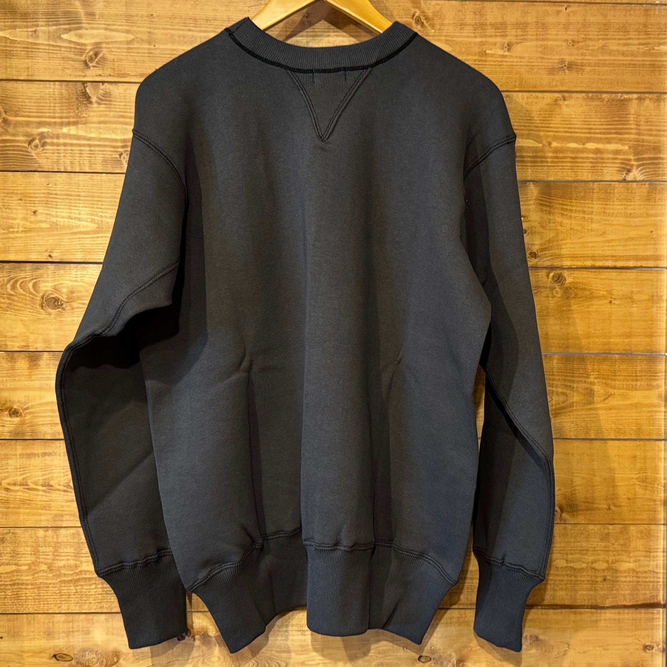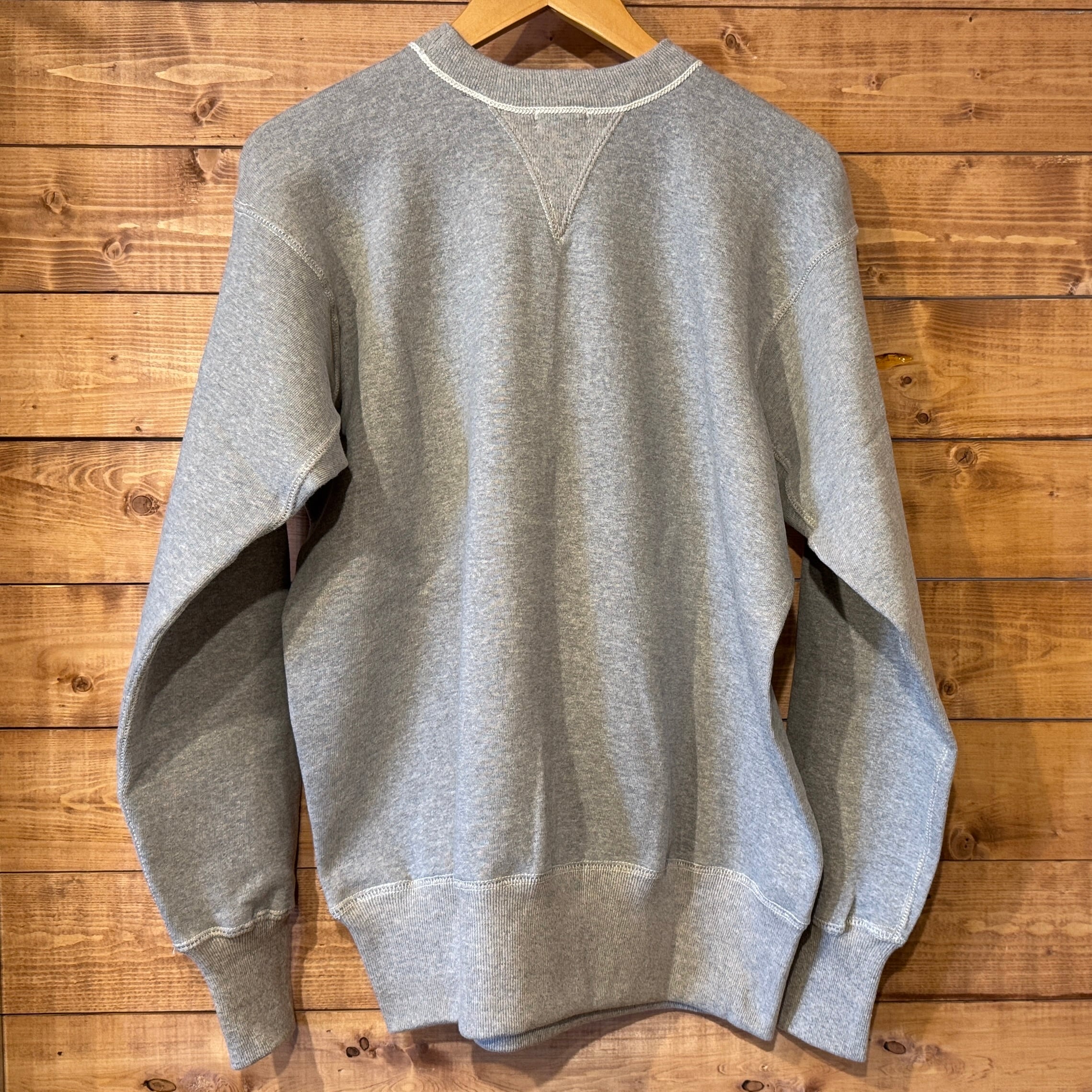 20年以上仕様を変更していない定番の吊り編みスウェットです。二本ステッチの間から粗めのロック糸が見える仕様はヴィンテージでしか見られないディテールですが、ミシンを改良することで実現させました。かつてコットンフリースラインドと呼ばれた裏起毛も、筒状のまま起毛をかけて再現しています。