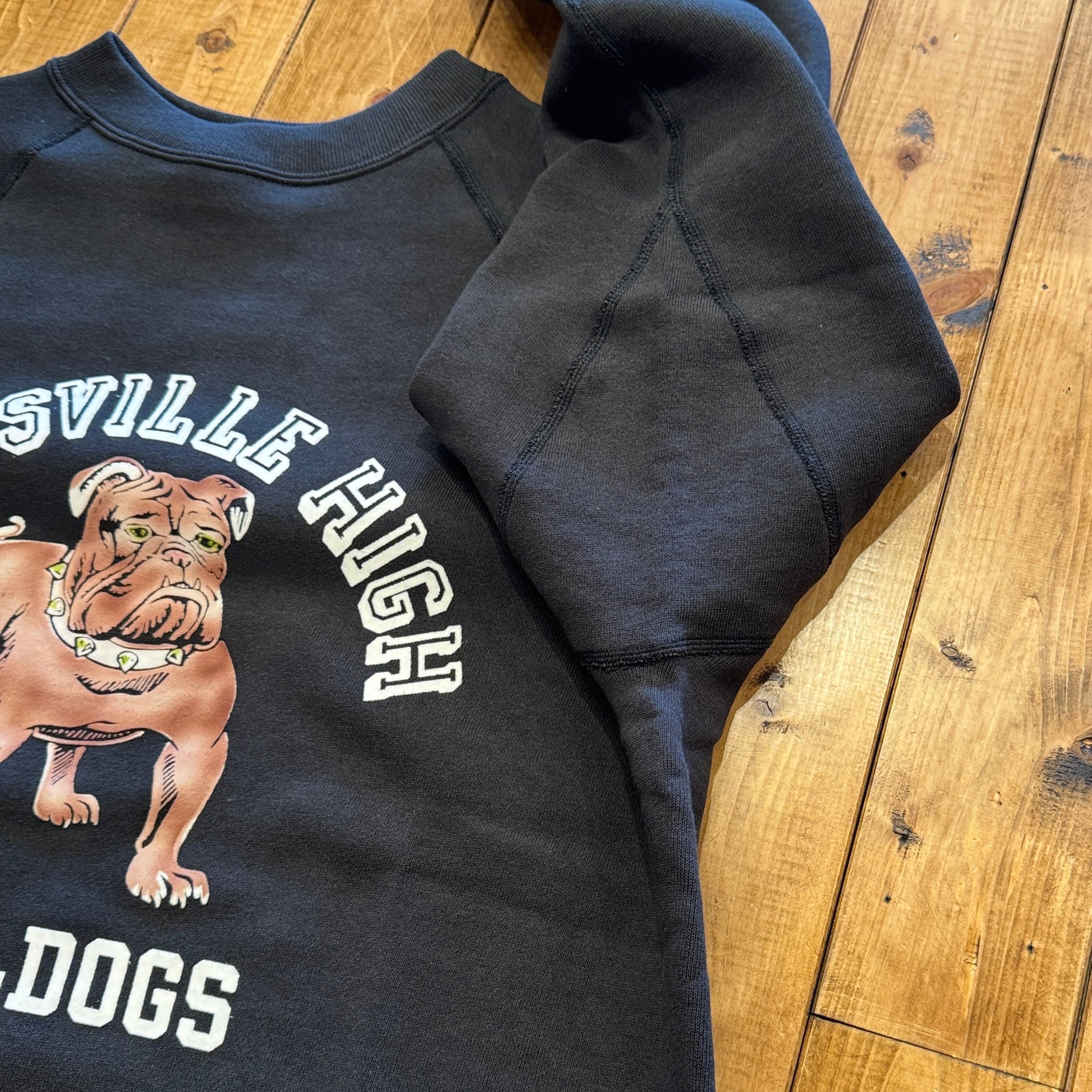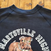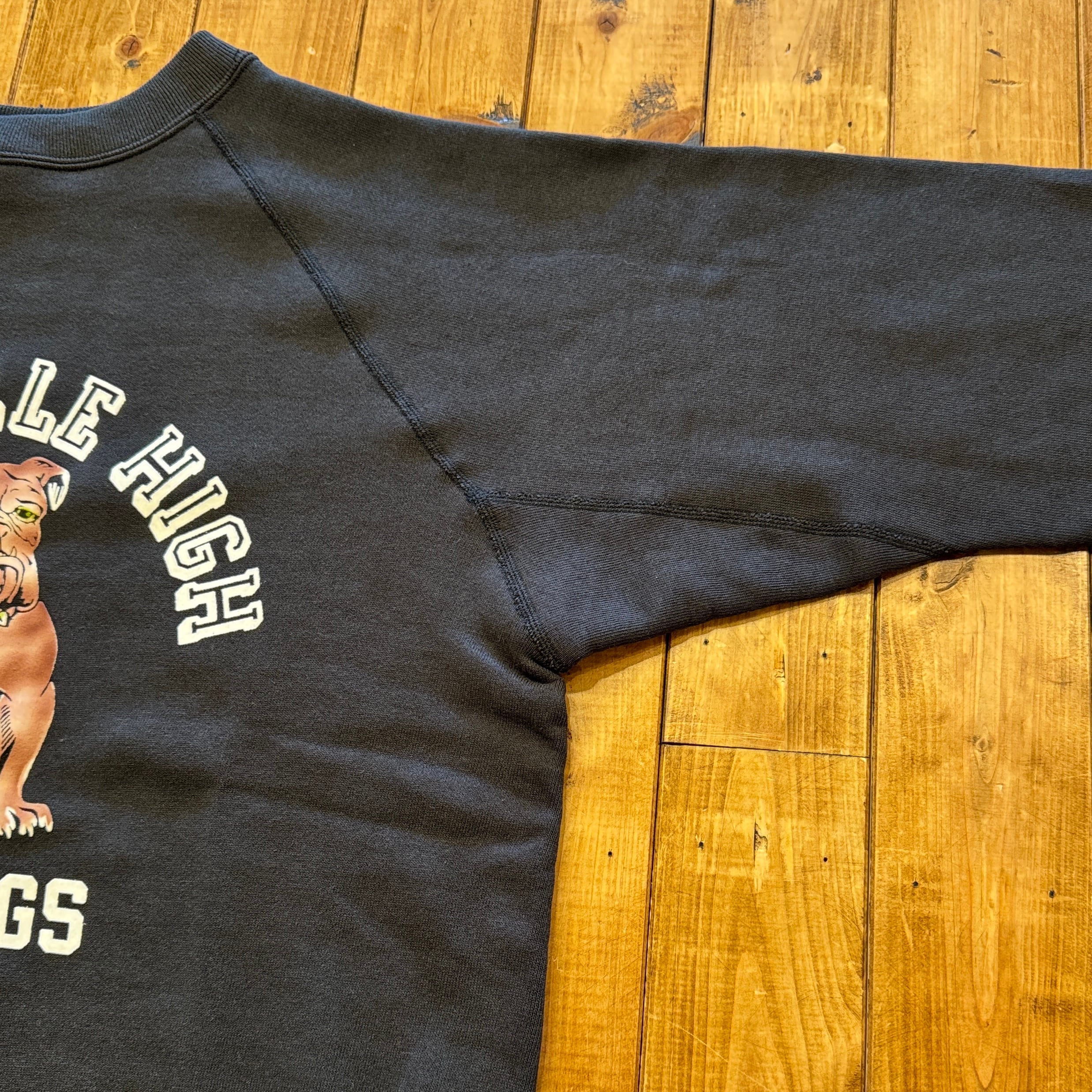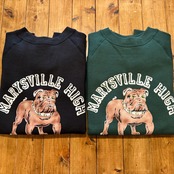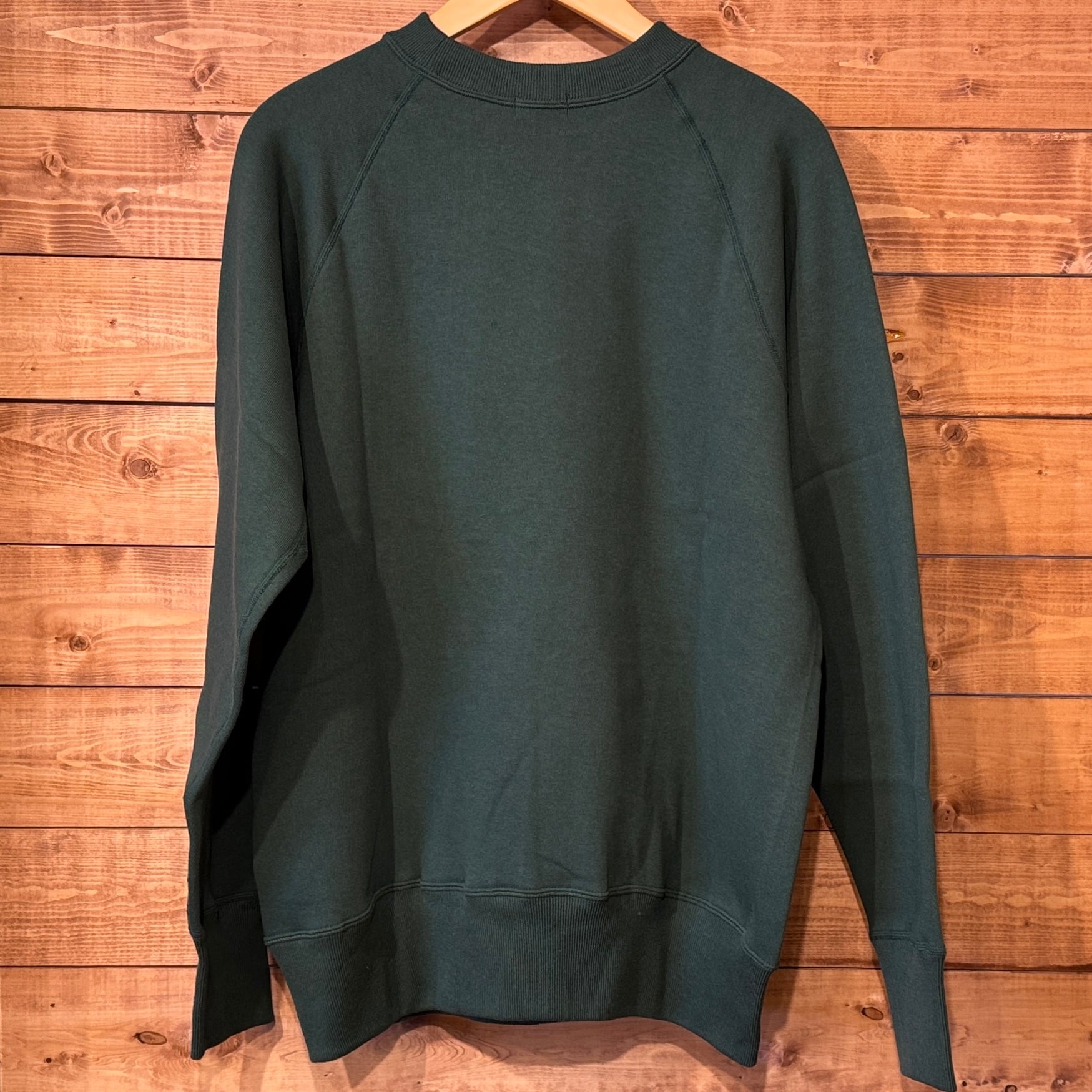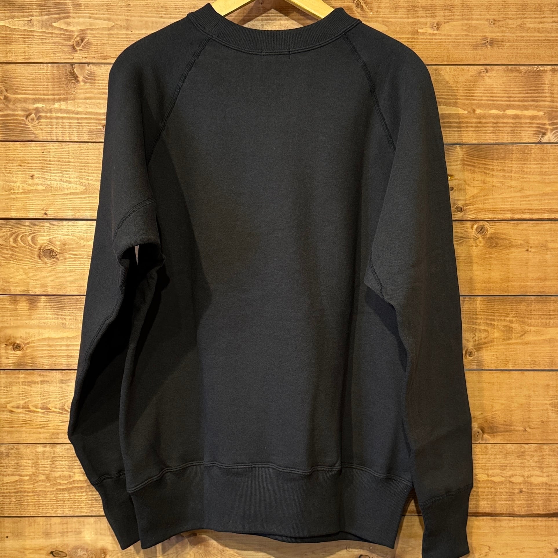 950年代にはスポーツウェアとしてのスウエットシャツがラグランスリーブになり、ガゼットの補強がなくなったシンプルモデルが誕生しました。そして1960年代には様々な技法でこのスウエットにレタリングが描かれます。ラグランスリーブのステッチが効いたオーセンティックなスウエットです。