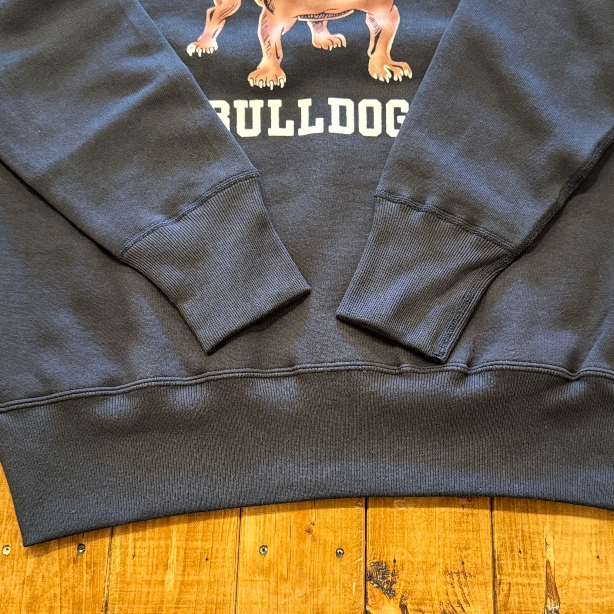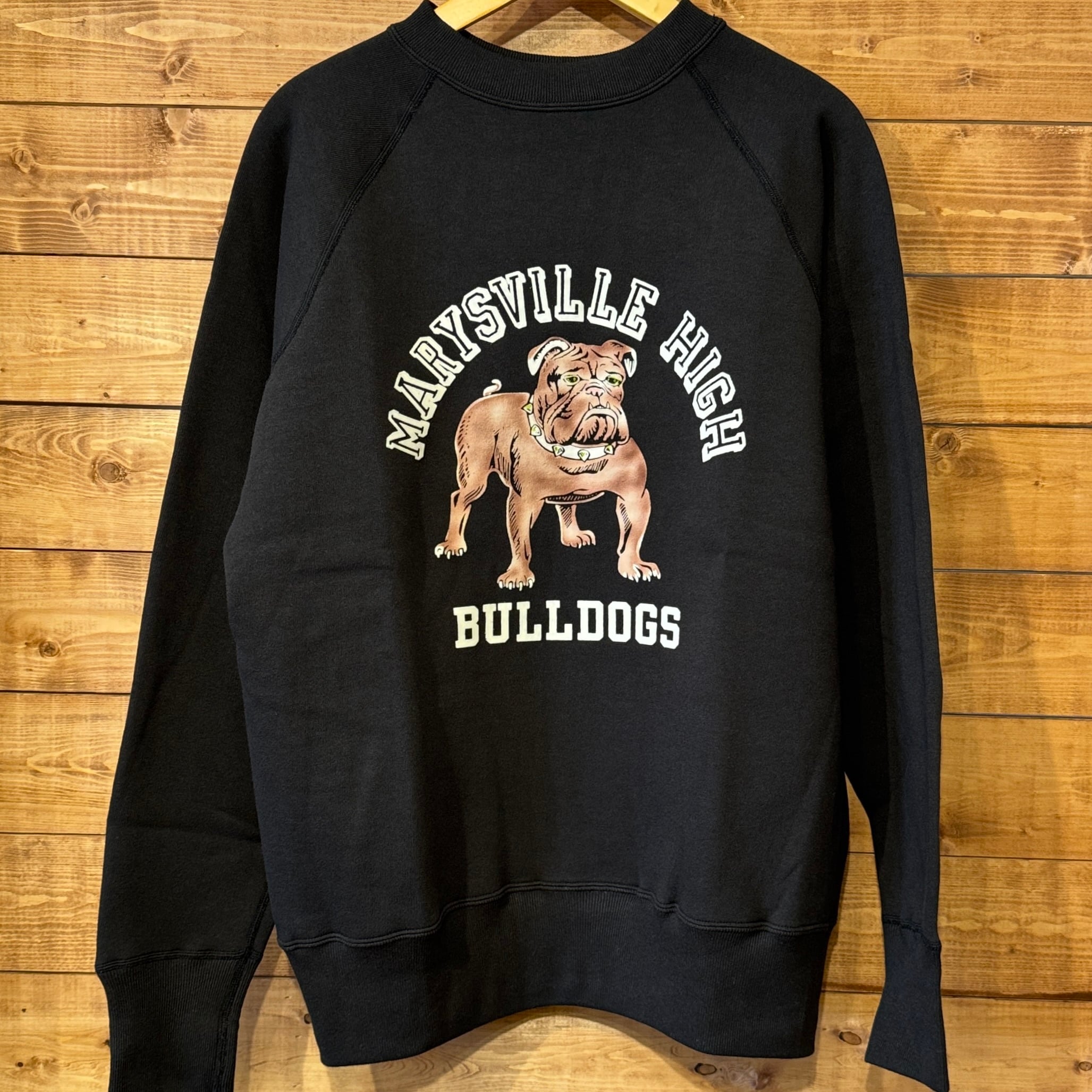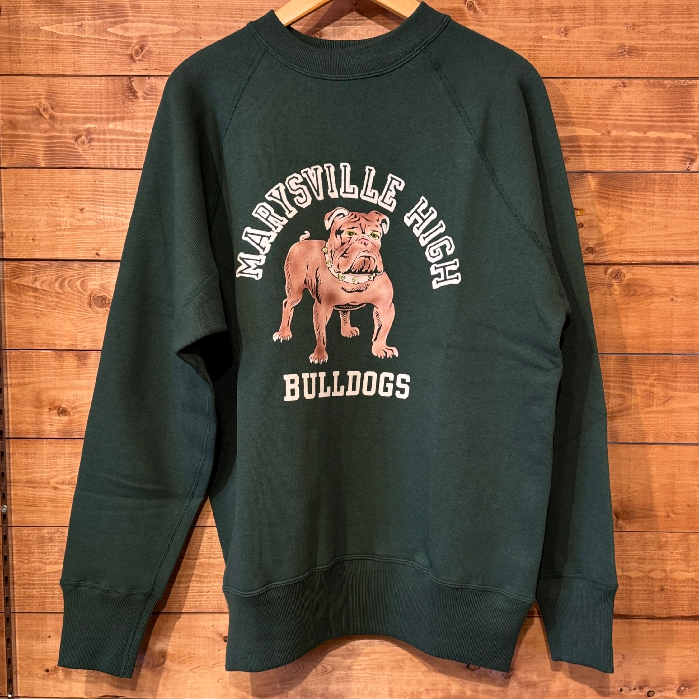 950年代にはスポーツウェアとしてのスウエットシャツがラグランスリーブになり、ガゼットの補強がなくなったシンプルモデルが誕生しました。そして1960年代には様々な技法でこのスウエットにレタリングが描かれます。ラグランスリーブのステッチが効いたオーセンティックなスウエットです。