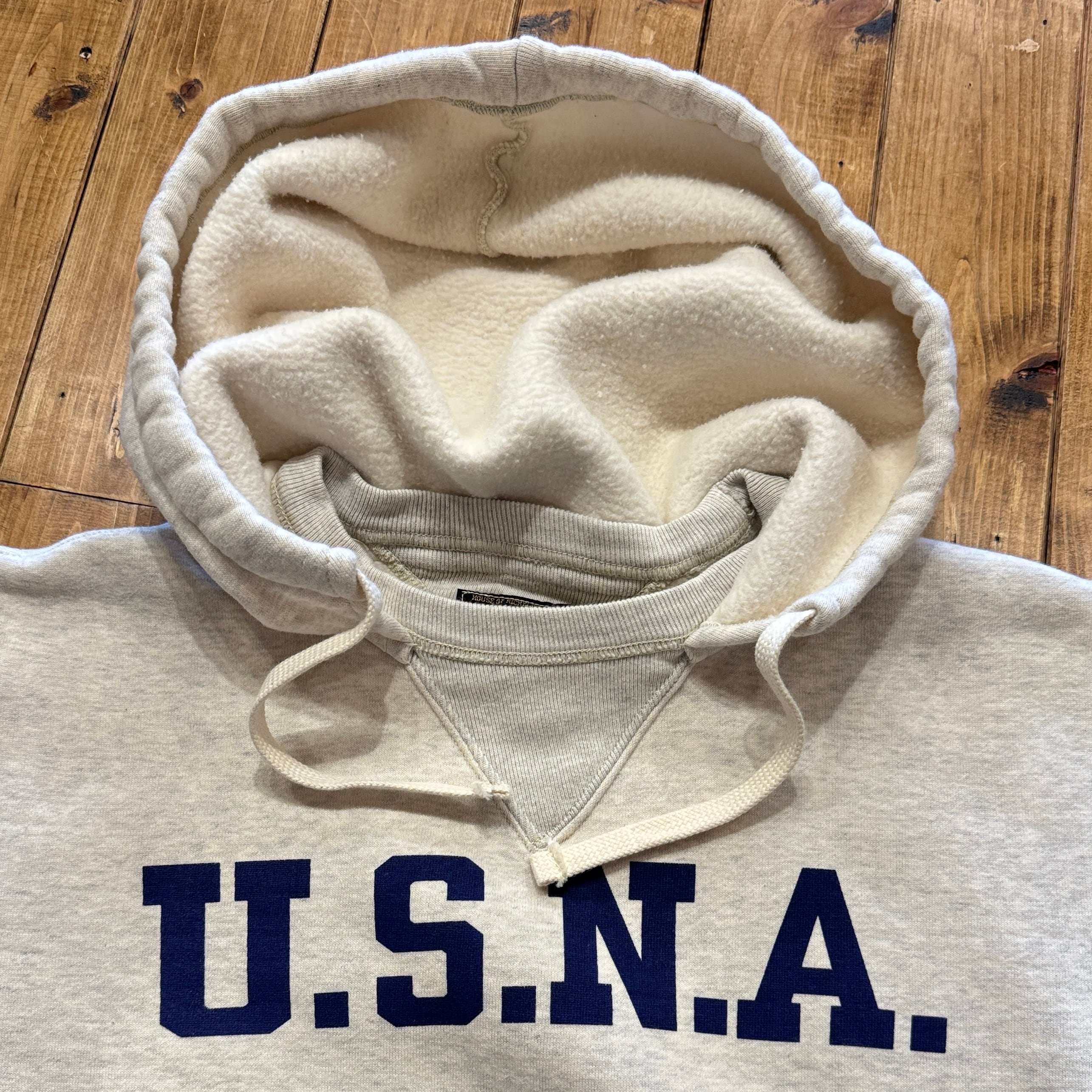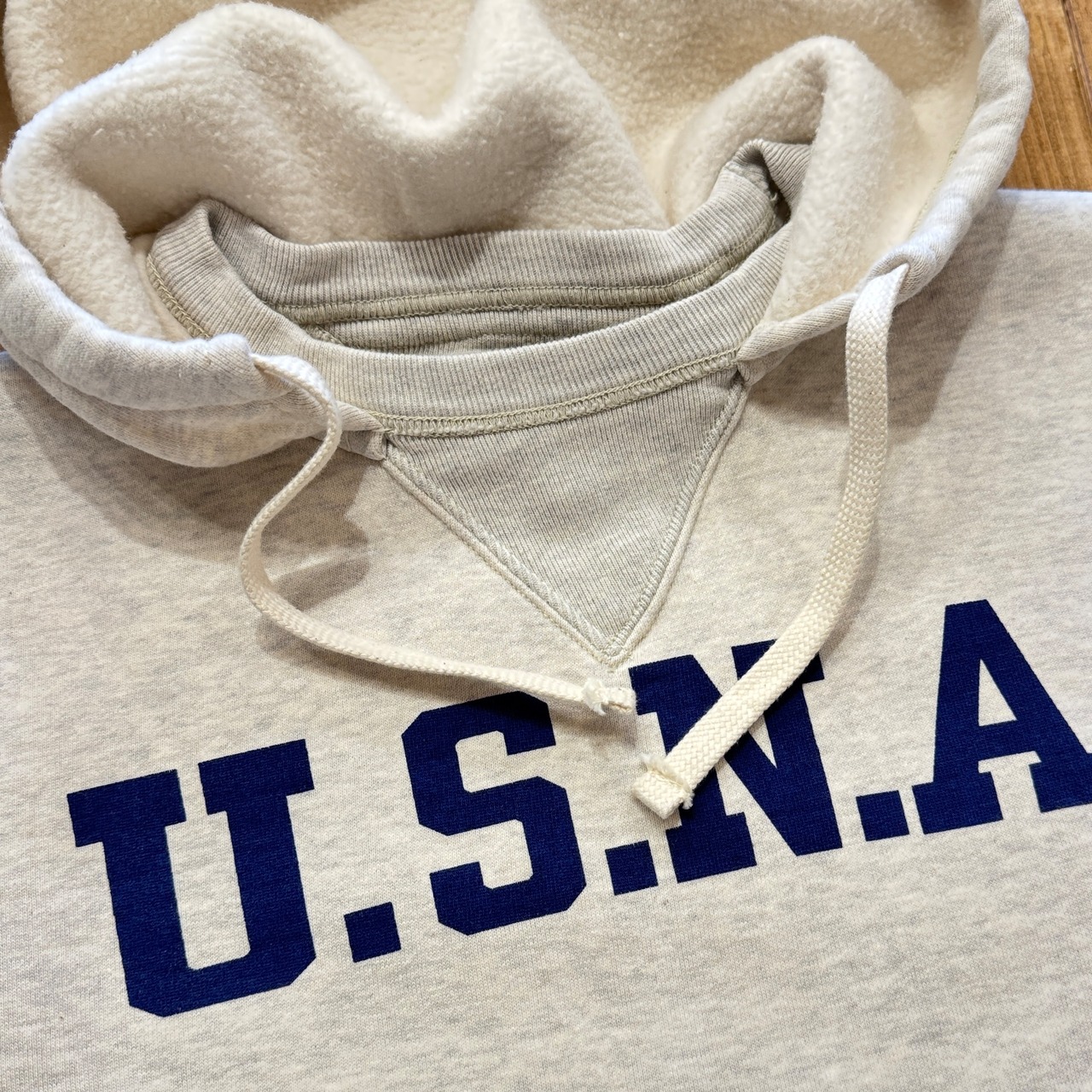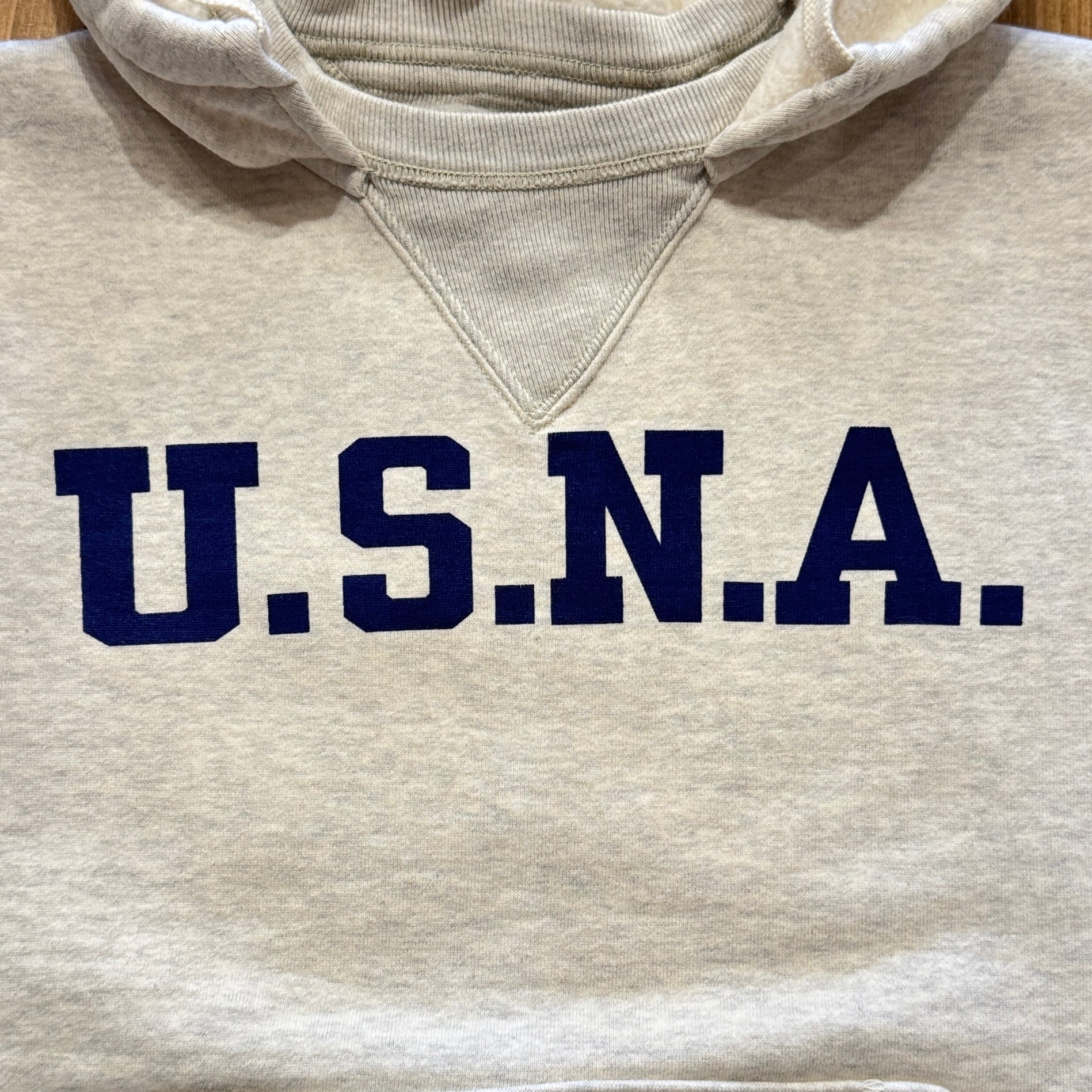 U.S. Naval Academyのトレーニングウェアをイメージし、"USNA"プリントを施したスウェットパーカ。無骨なアスレチックディティールとシンプルながら存在感のあるプリントが、当時の士官学校らしい雰囲気を醸し出しています。