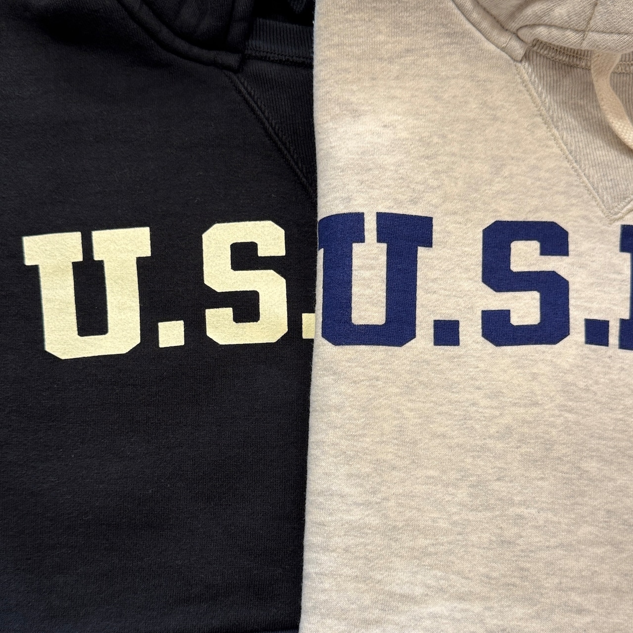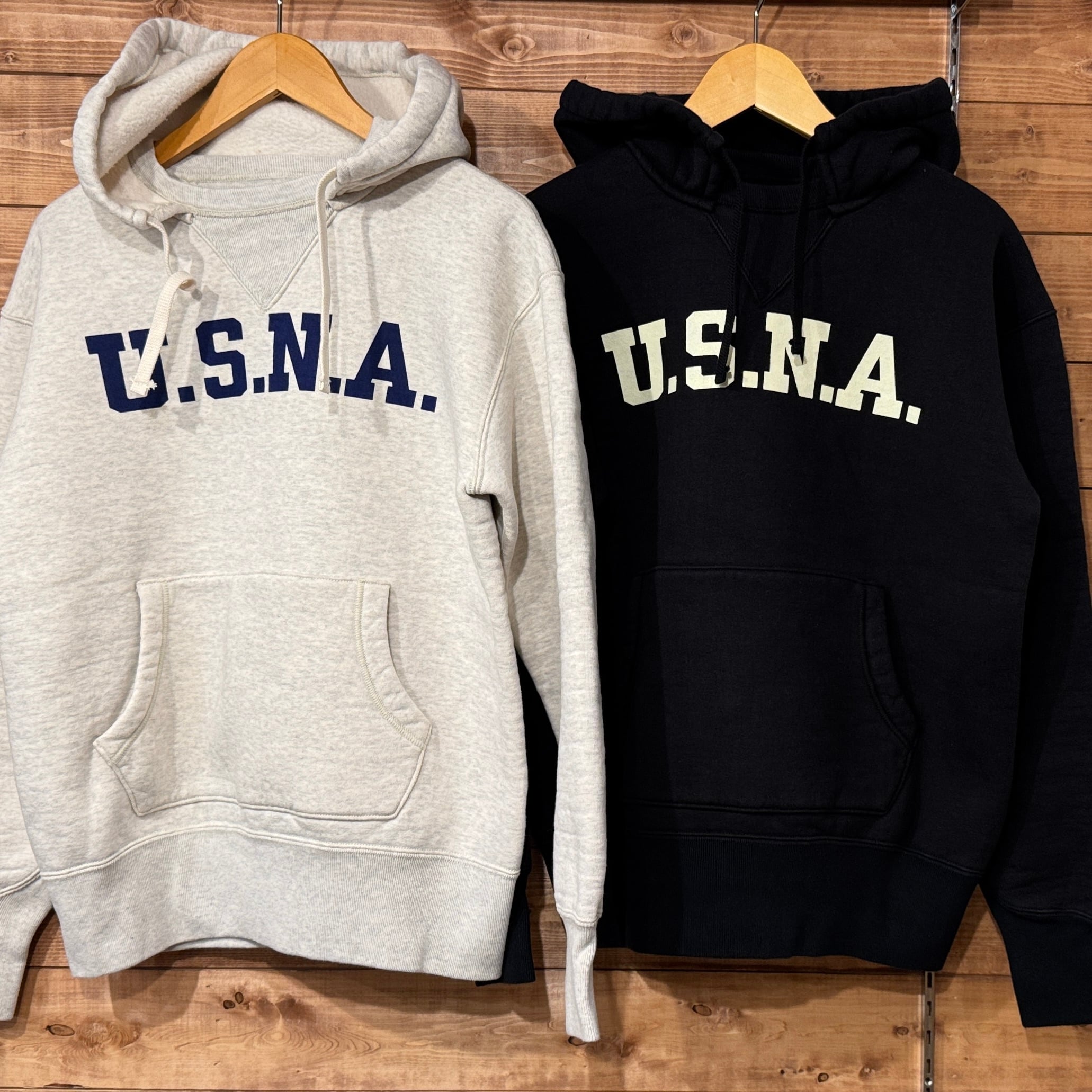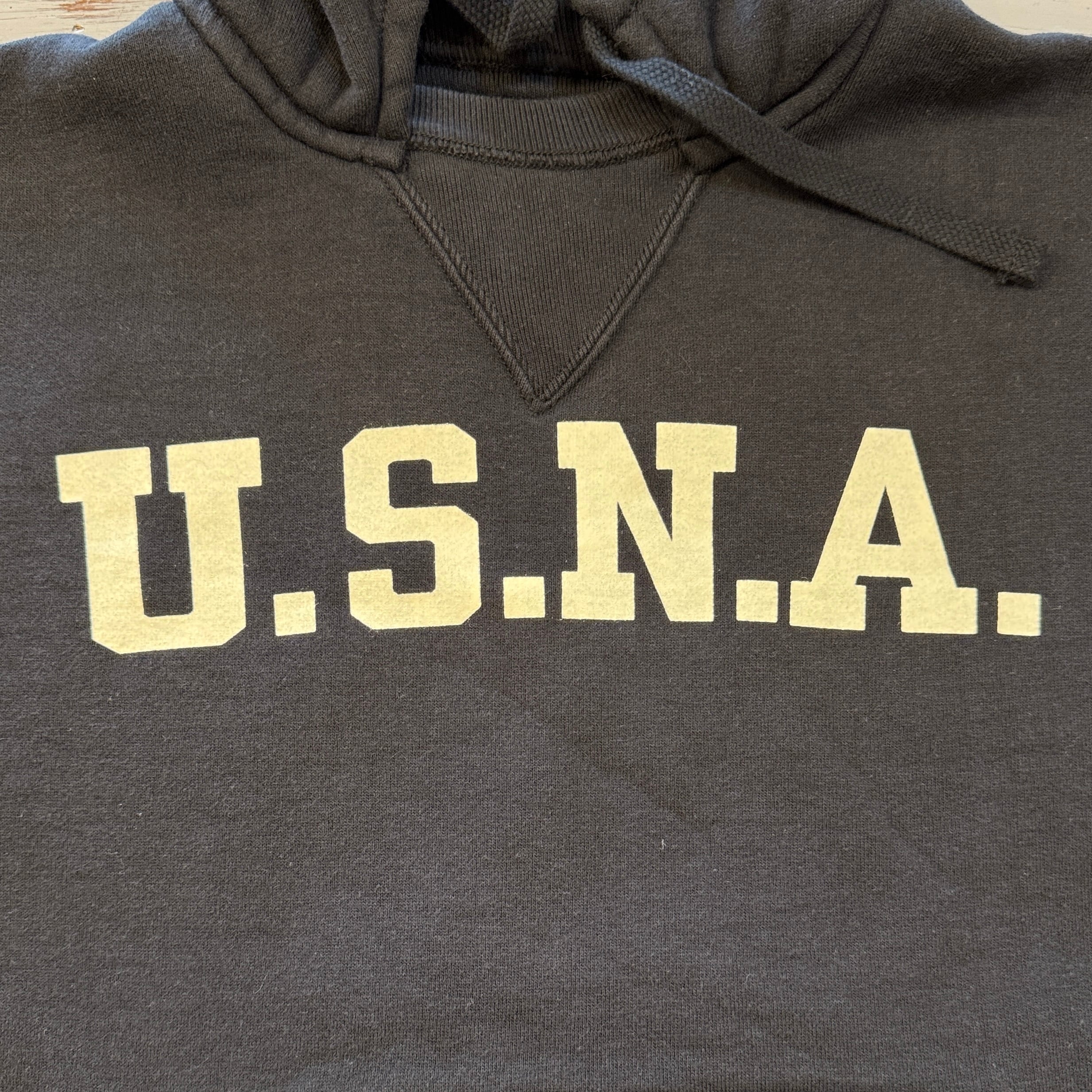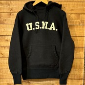 U.S. Naval Academyのトレーニングウェアをイメージし、"USNA"プリントを施したスウェットパーカ。無骨なアスレチックディティールとシンプルながら存在感のあるプリントが、当時の士官学校らしい雰囲気を醸し出しています。