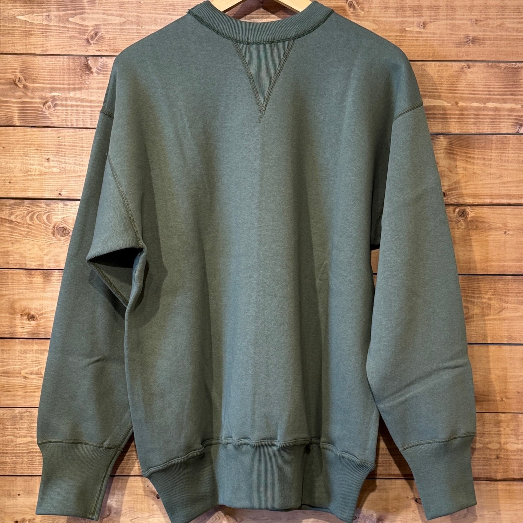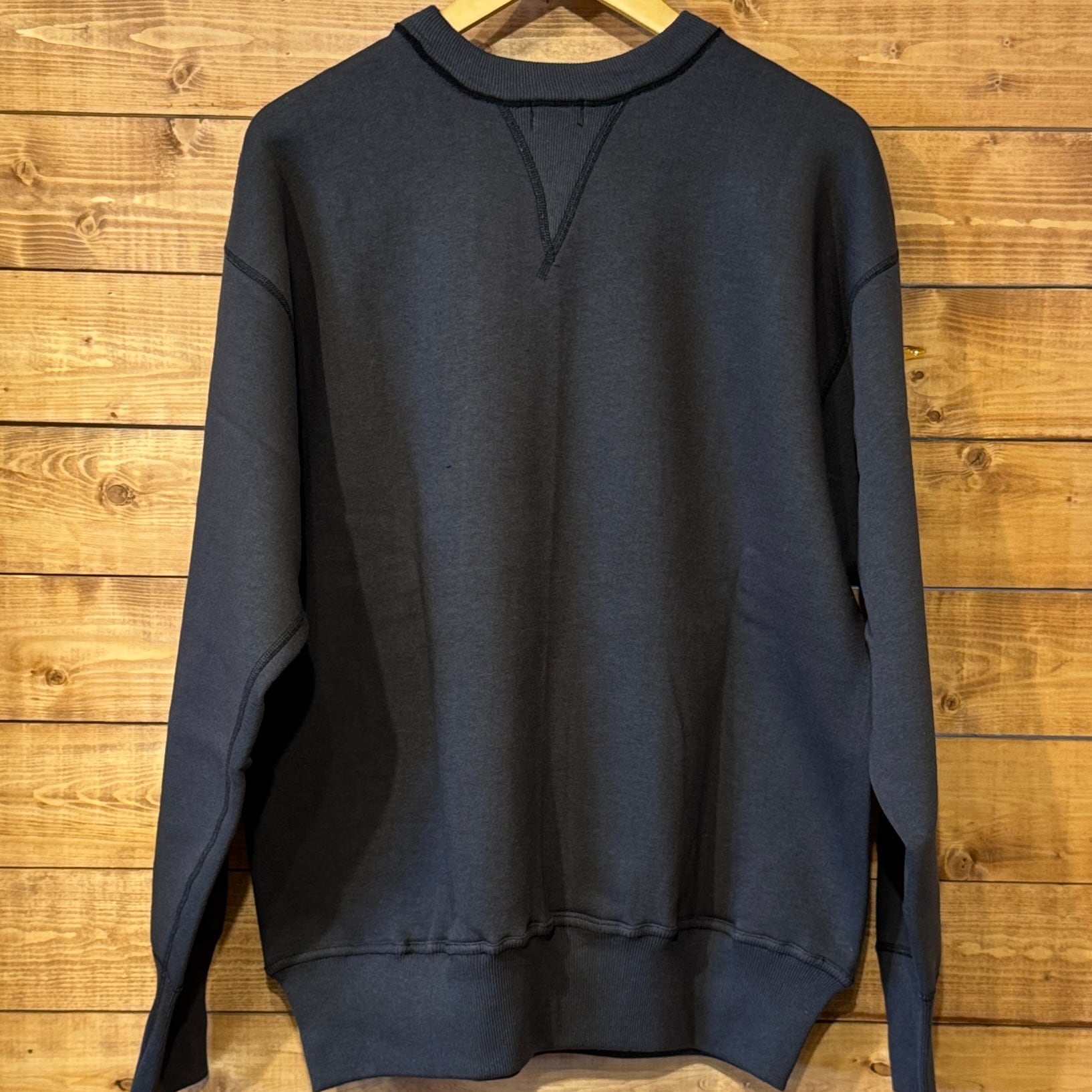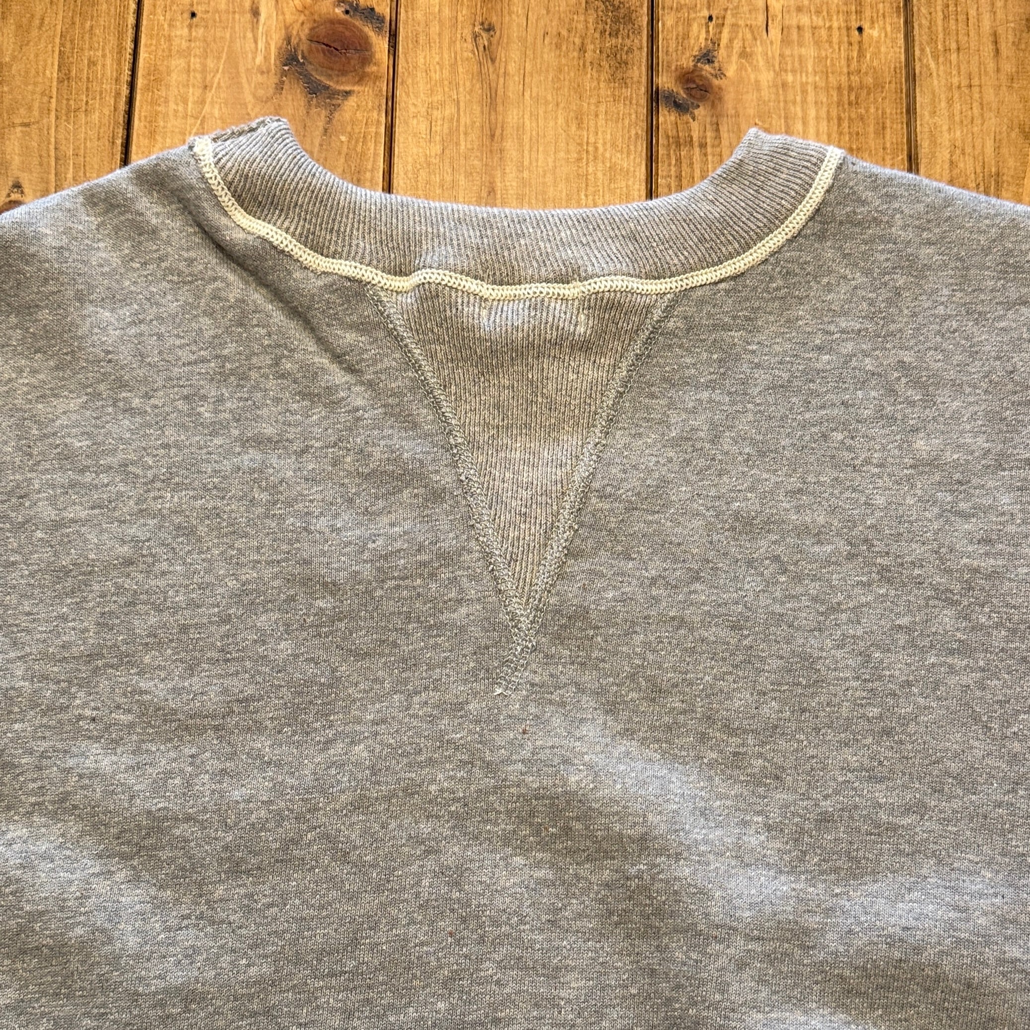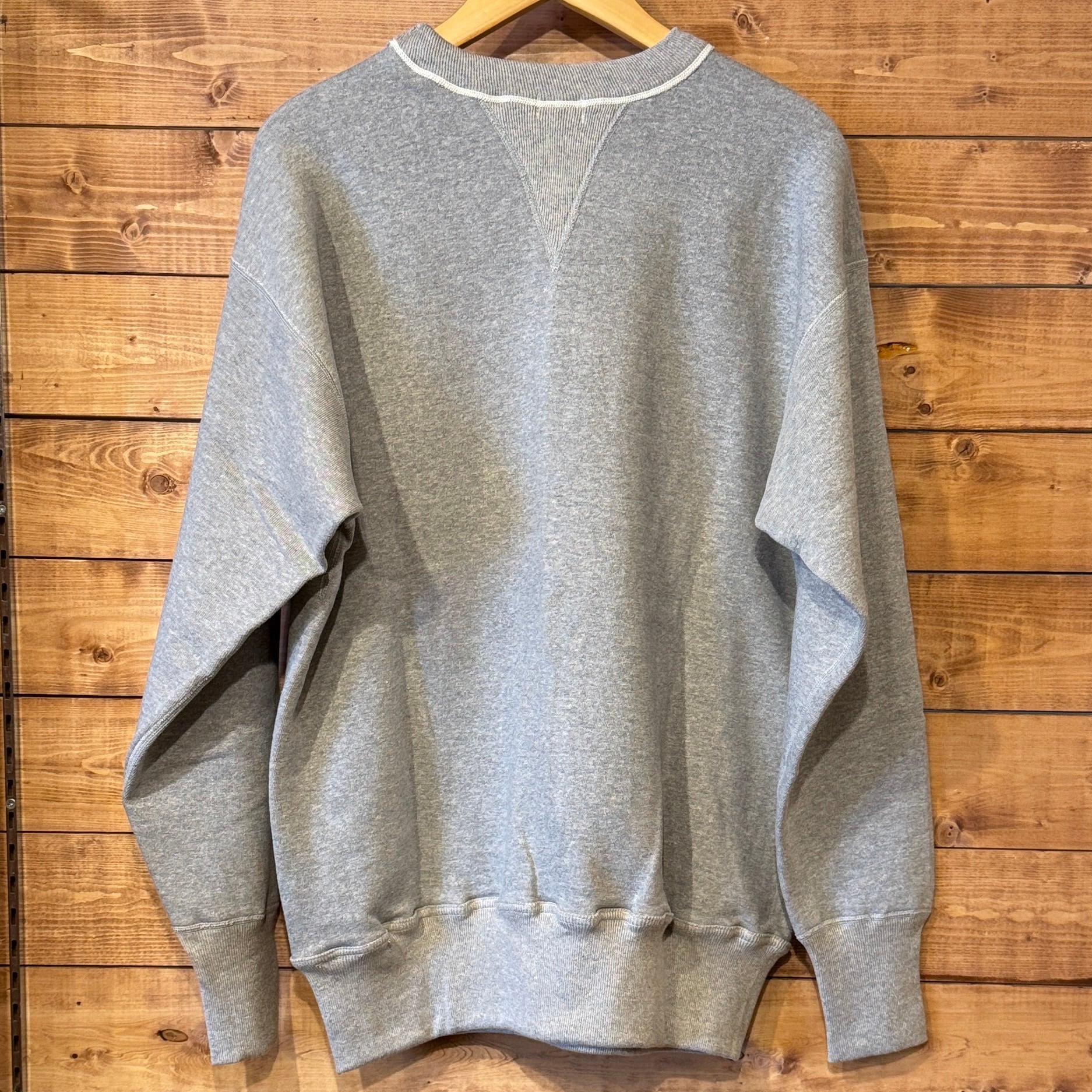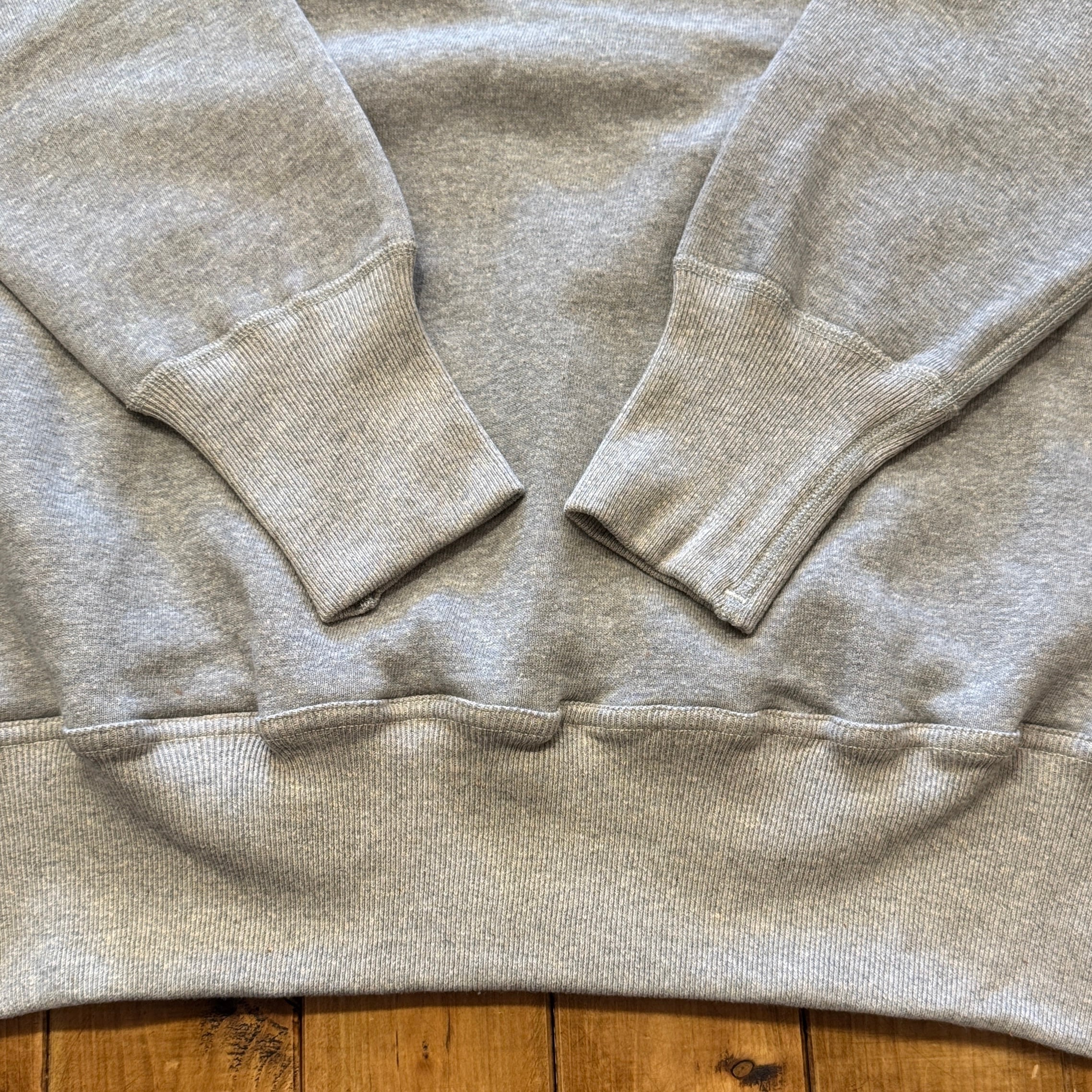 カットソーがウールからコットンに変わった1930年代からある挟み込み仕様の腰リブ。首まわりには伸縮に富むV字のフライスを前後に配した四本針仕様のスウェットです。肩口から垂直に落ちる袖口のセットインスリーブはややソリッドな印象を受けるシンプルなデザインですが、腰帯のバインダー仕様は着込むほどにアタリが生まれます。