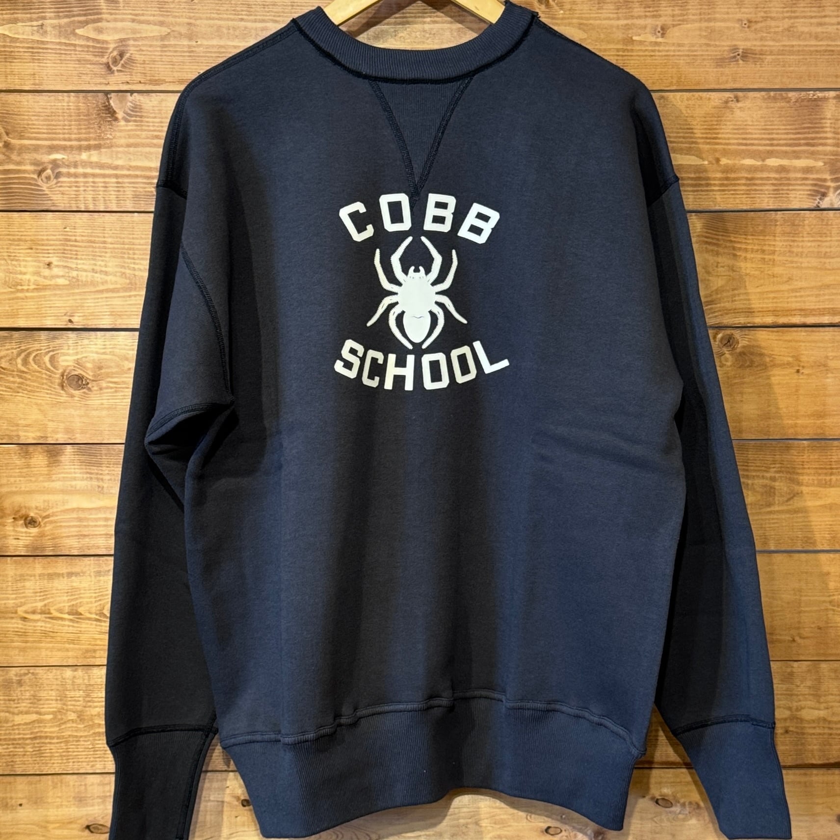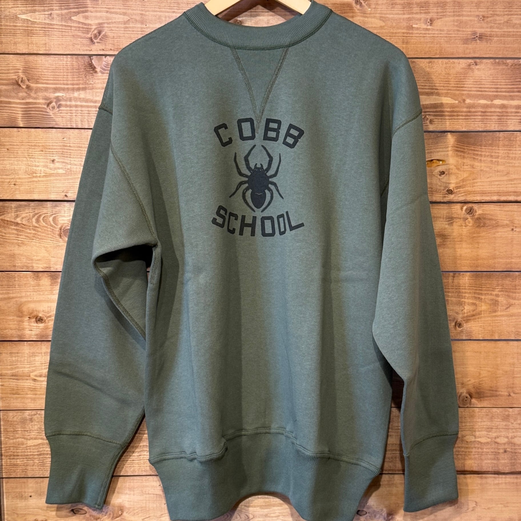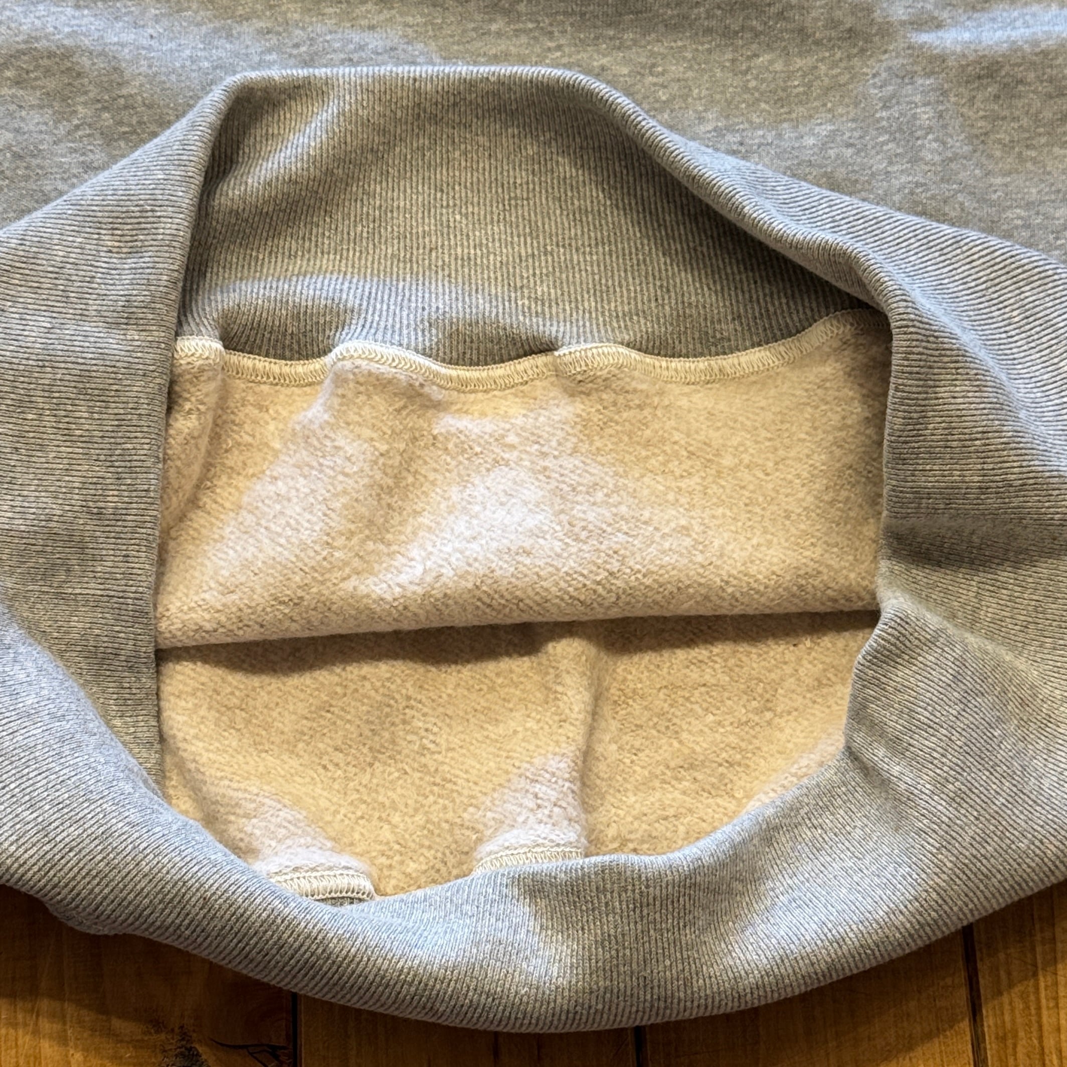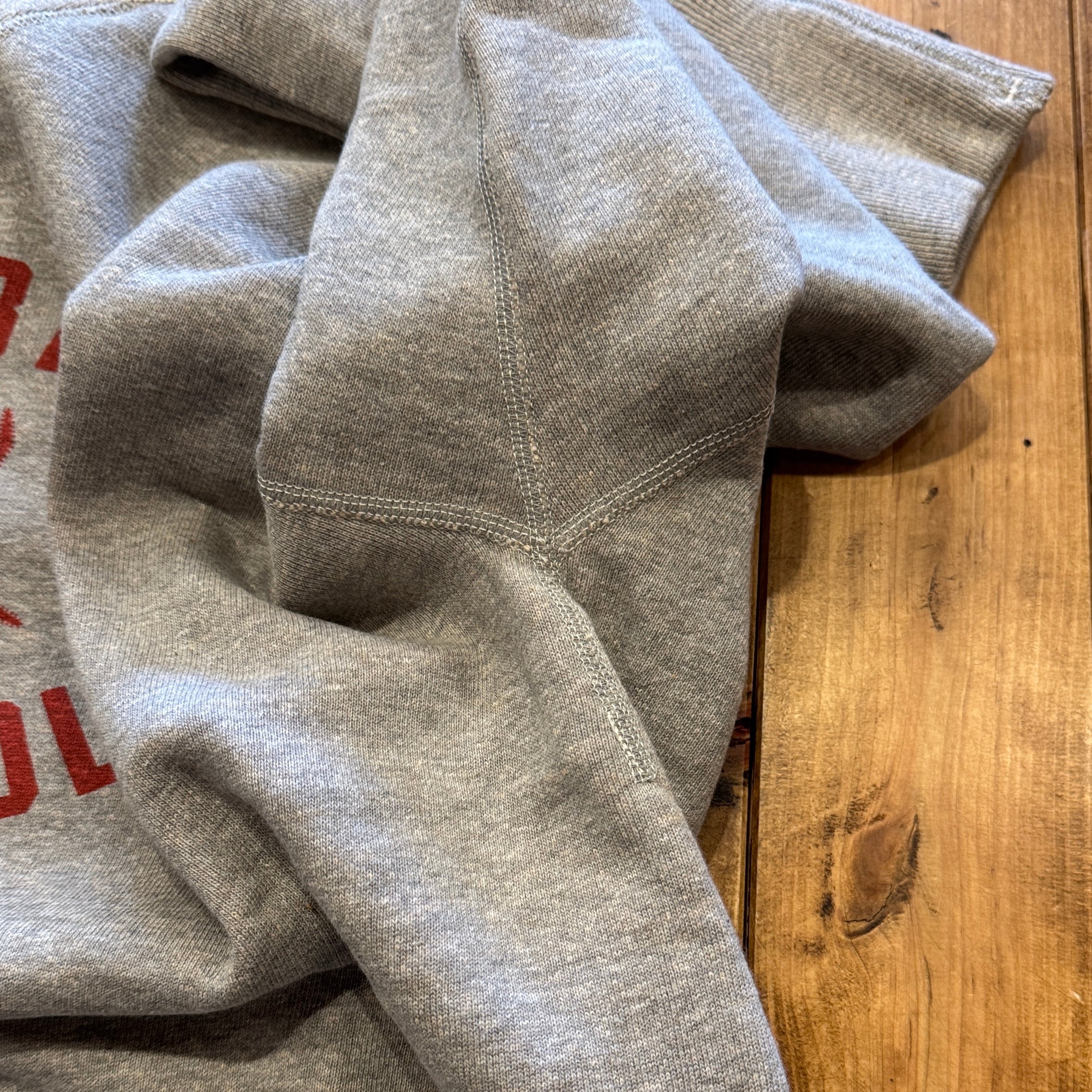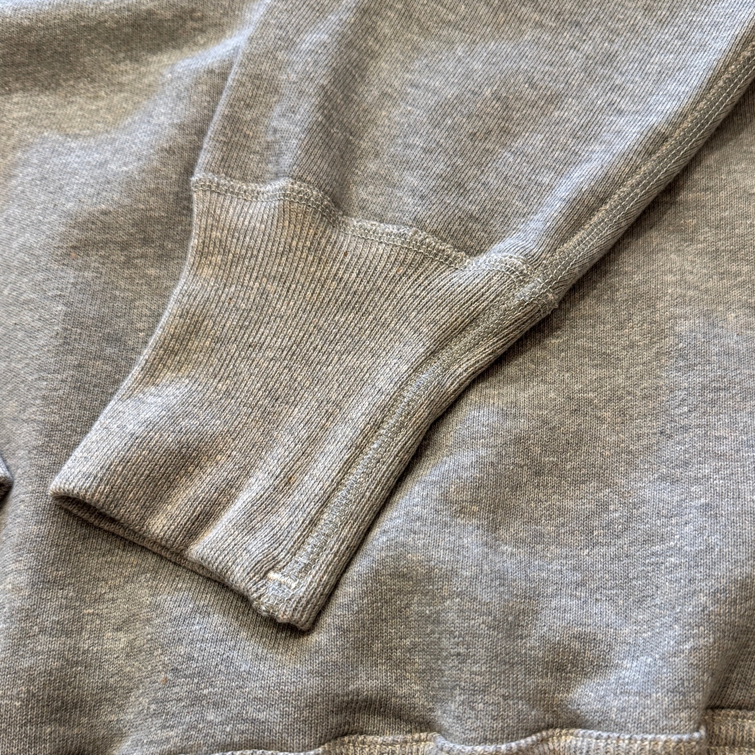 カットソーがウールからコットンに変わった1930年代からある挟み込み仕様の腰リブ。首まわりには伸縮に富むV字のフライスを前後に配した四本針仕様のスウェットです。肩口から垂直に落ちる袖口のセットインスリーブはややソリッドな印象を受けるシンプルなデザインですが、腰帯のバインダー仕様は着込むほどにアタリが生まれます。