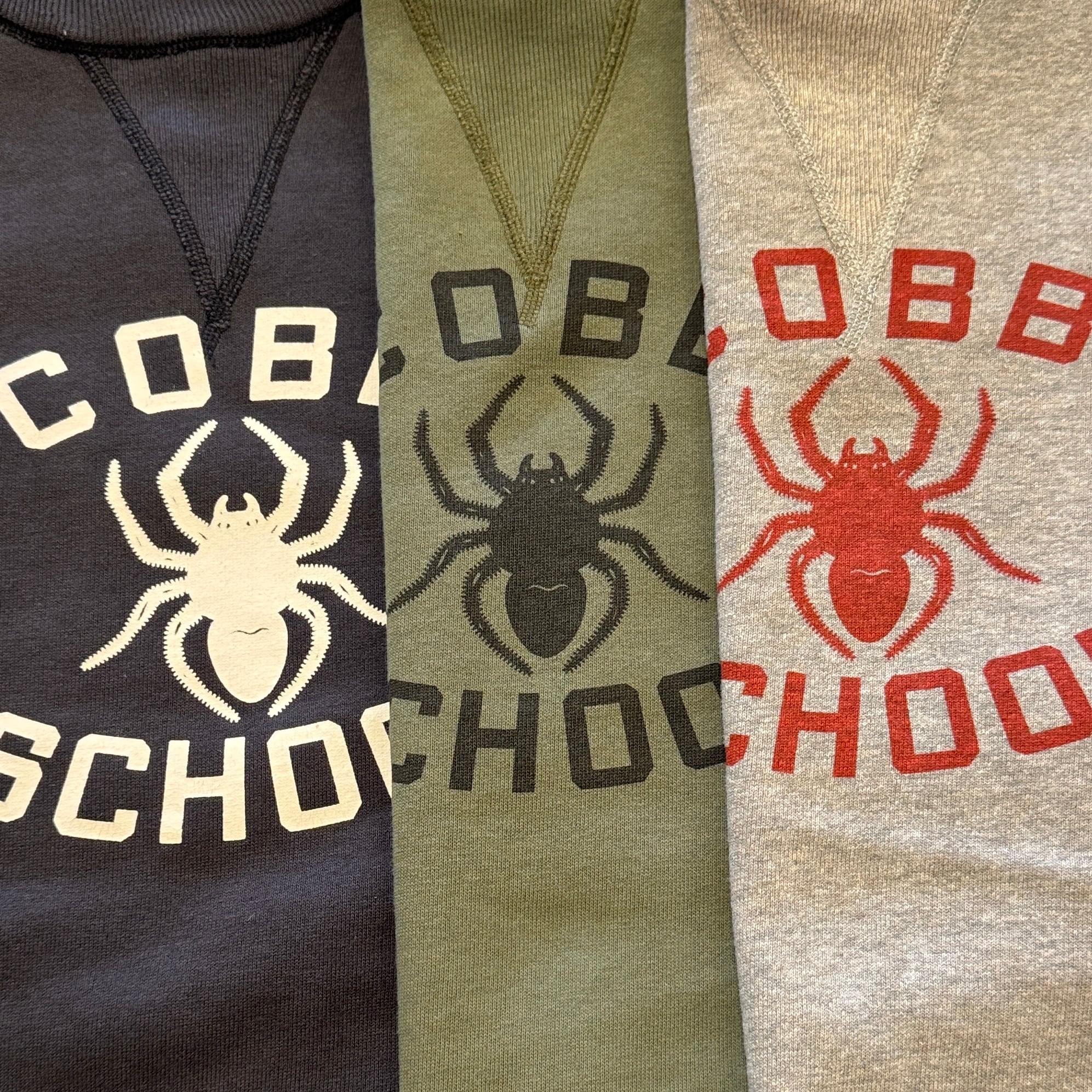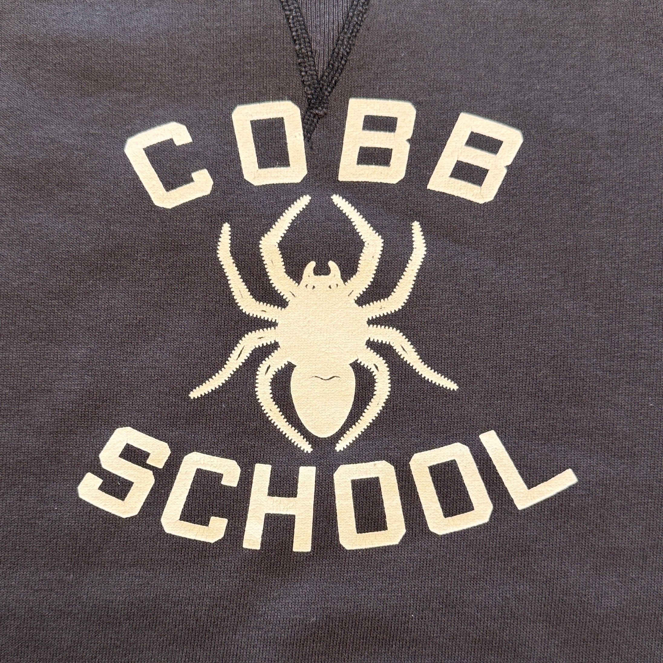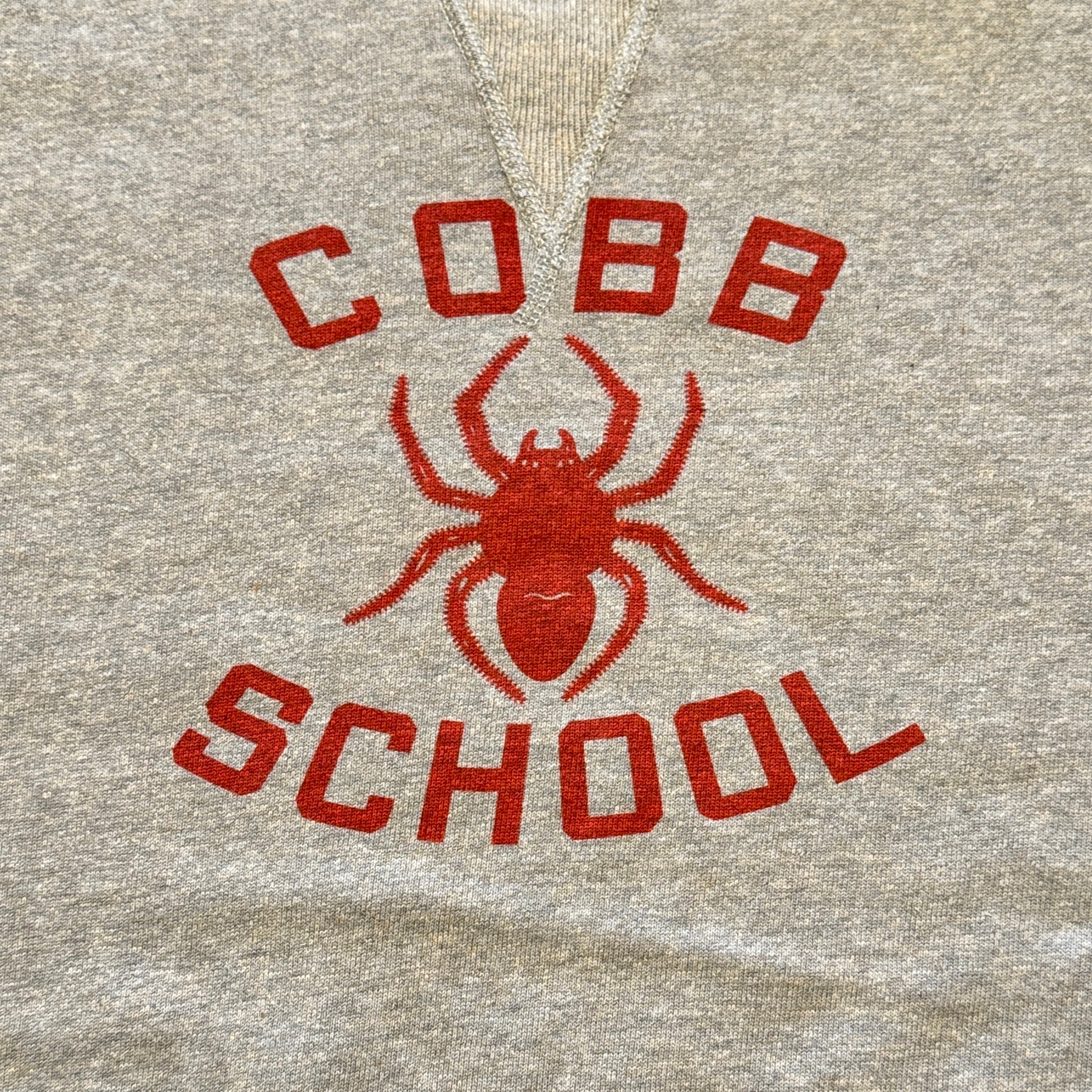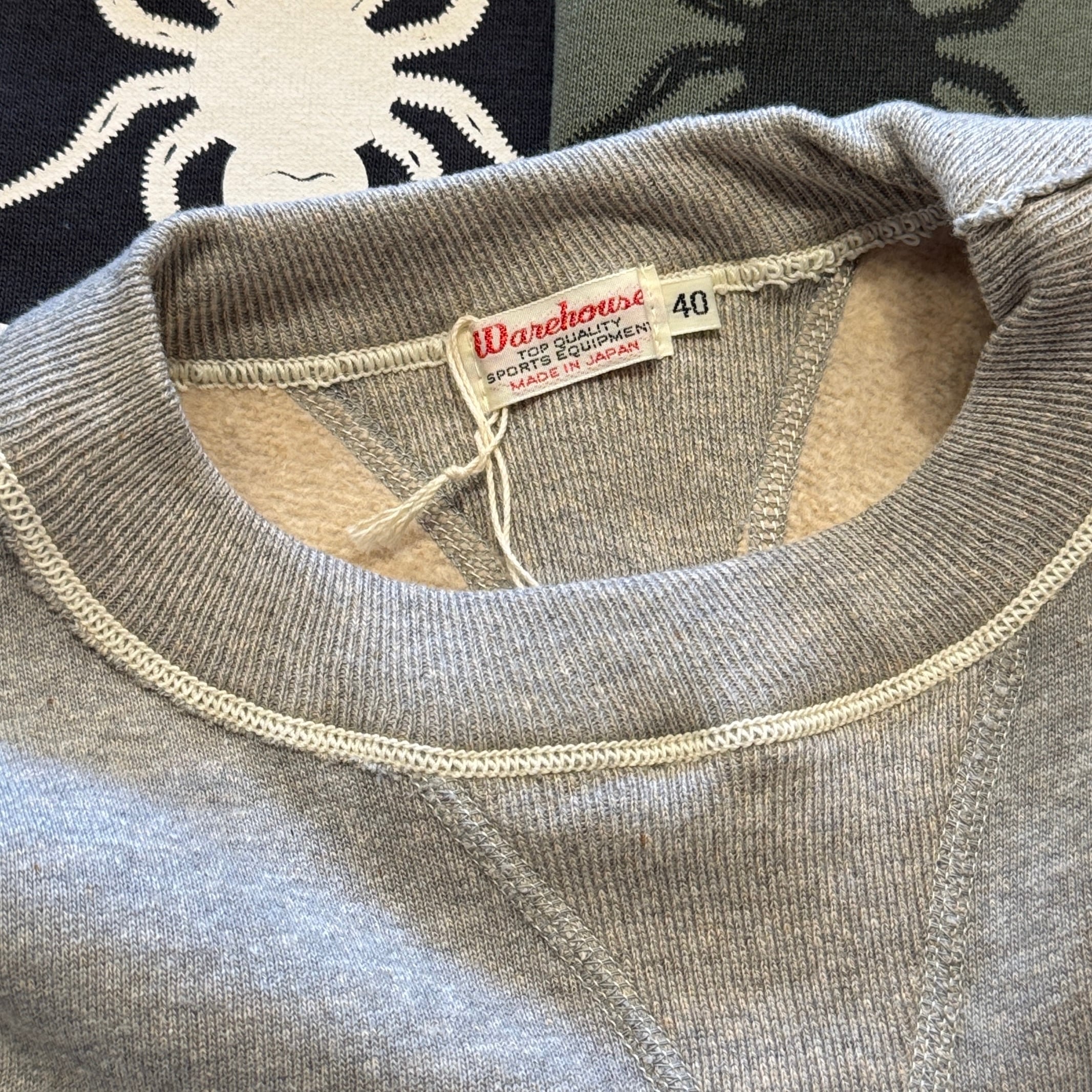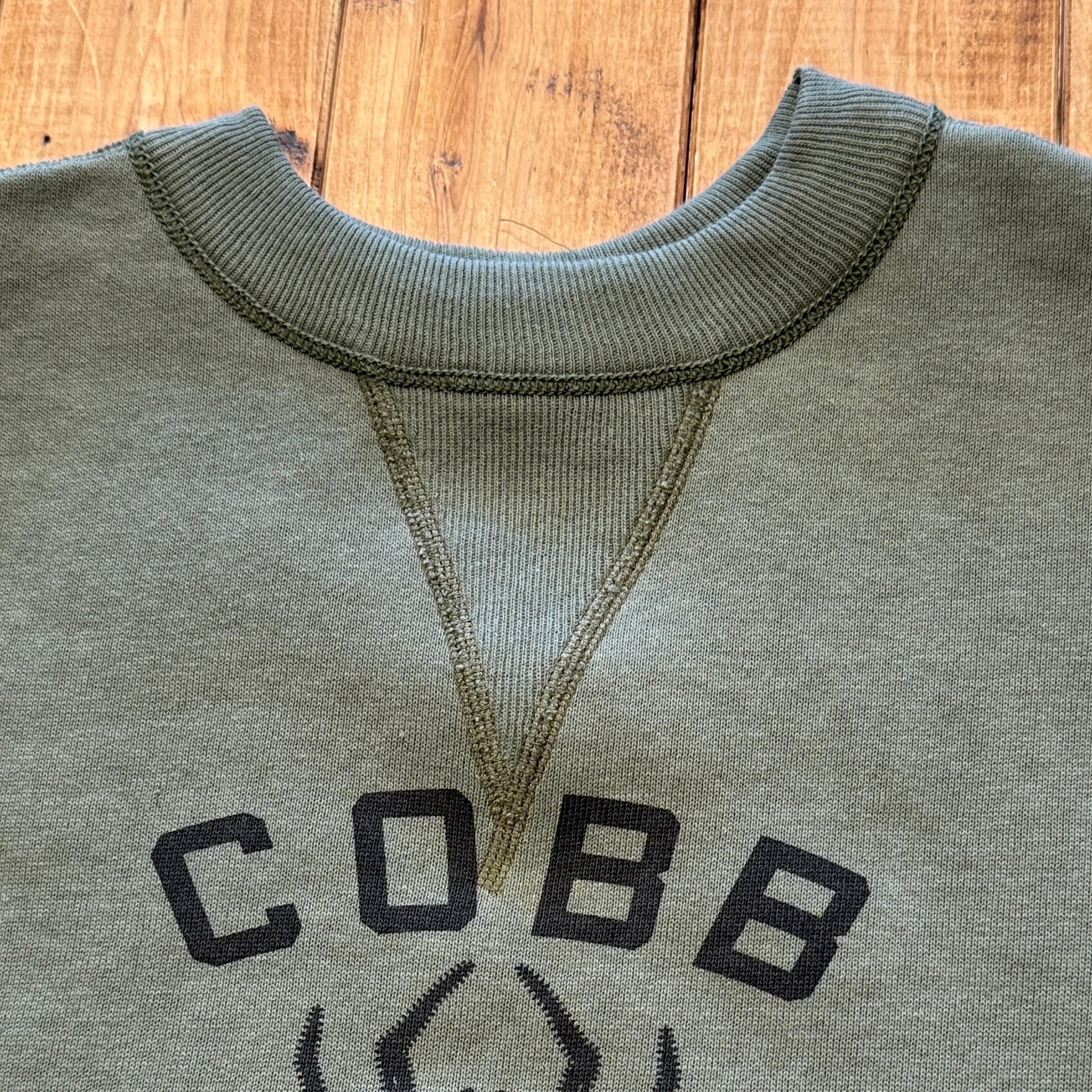 カットソーがウールからコットンに変わった1930年代からある挟み込み仕様の腰リブ。首まわりには伸縮に富むV字のフライスを前後に配した四本針仕様のスウェットです。肩口から垂直に落ちる袖口のセットインスリーブはややソリッドな印象を受けるシンプルなデザインですが、腰帯のバインダー仕様は着込むほどにアタリが生まれます。