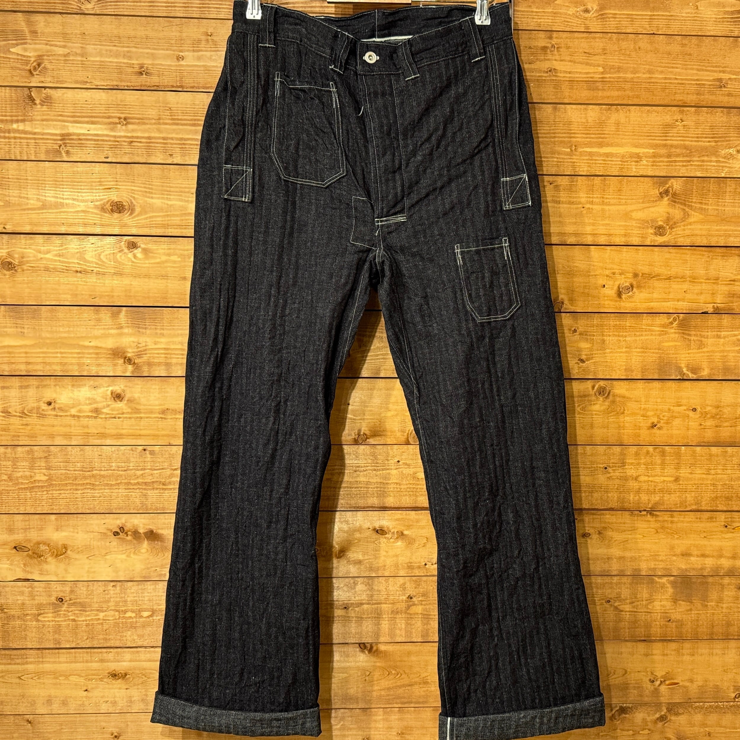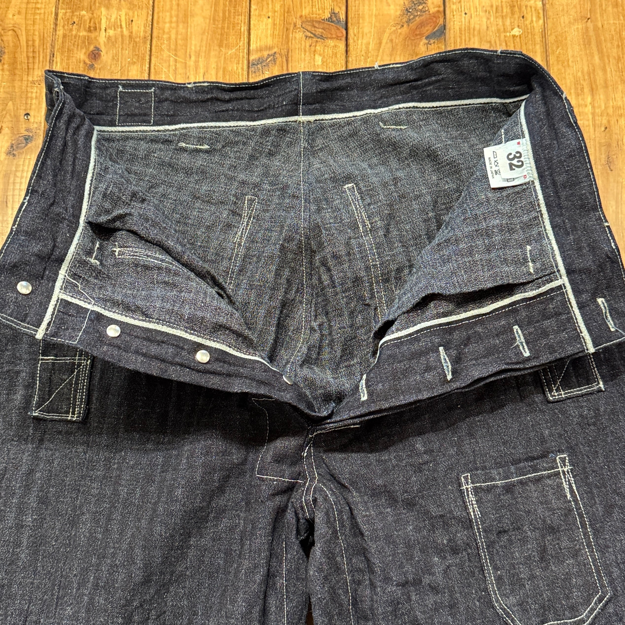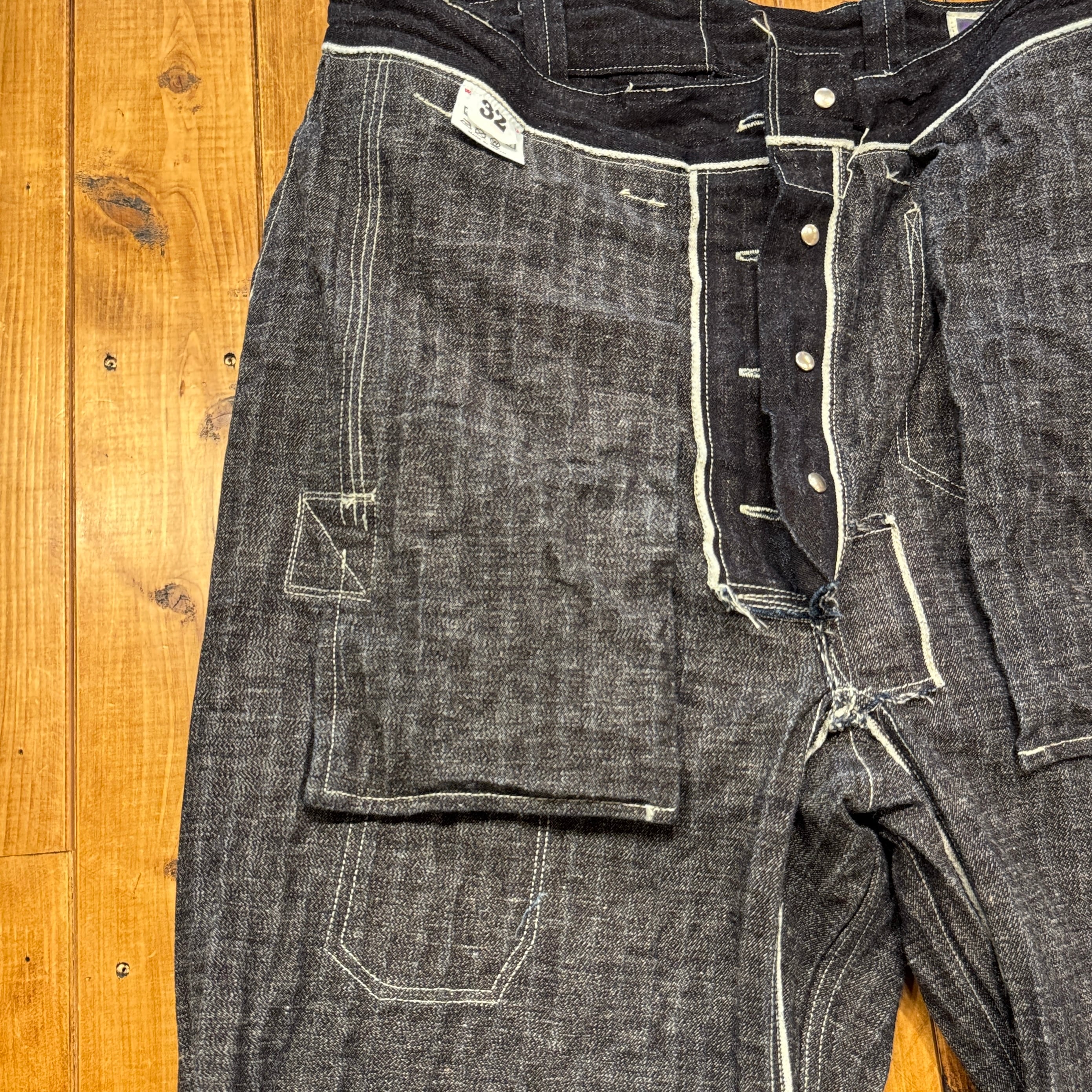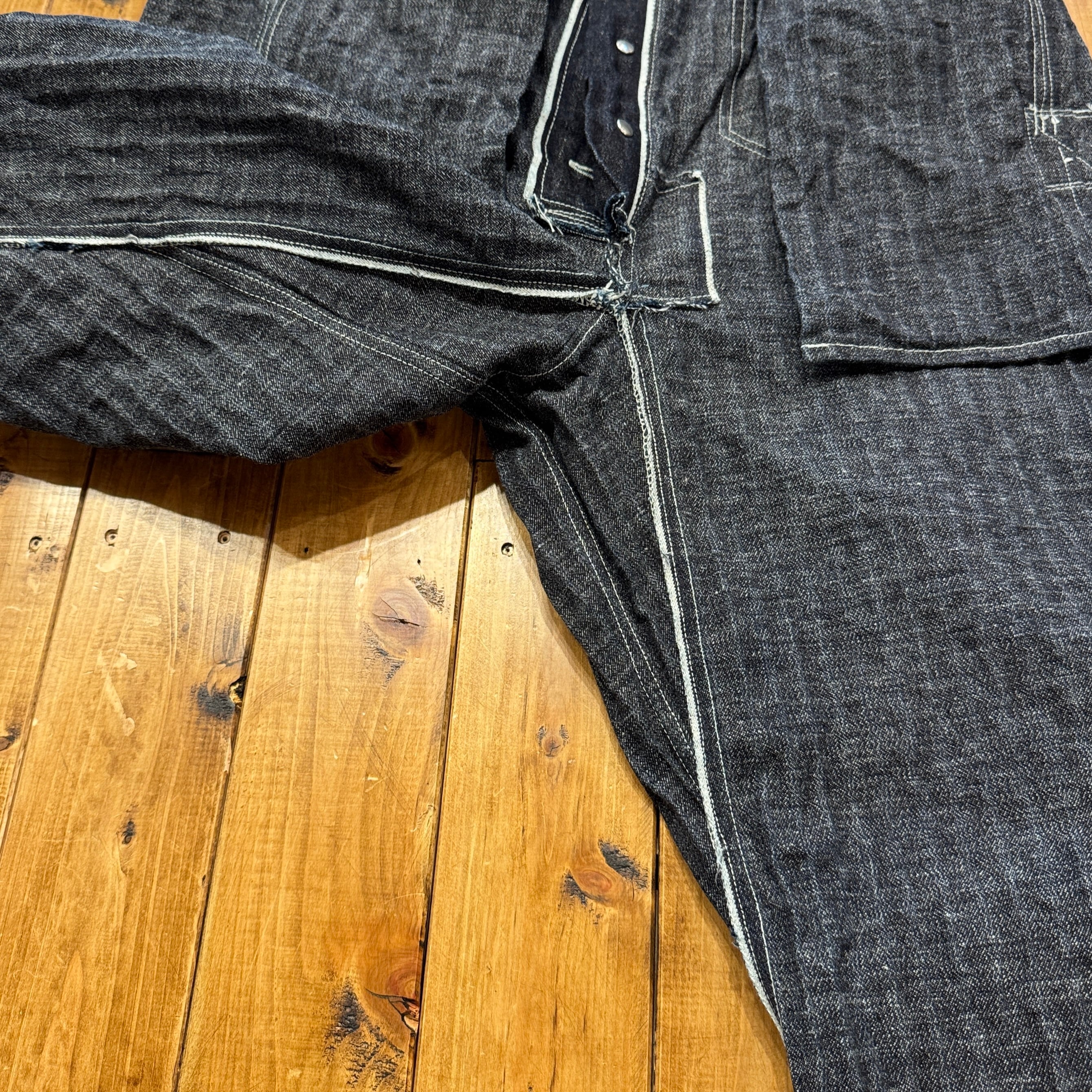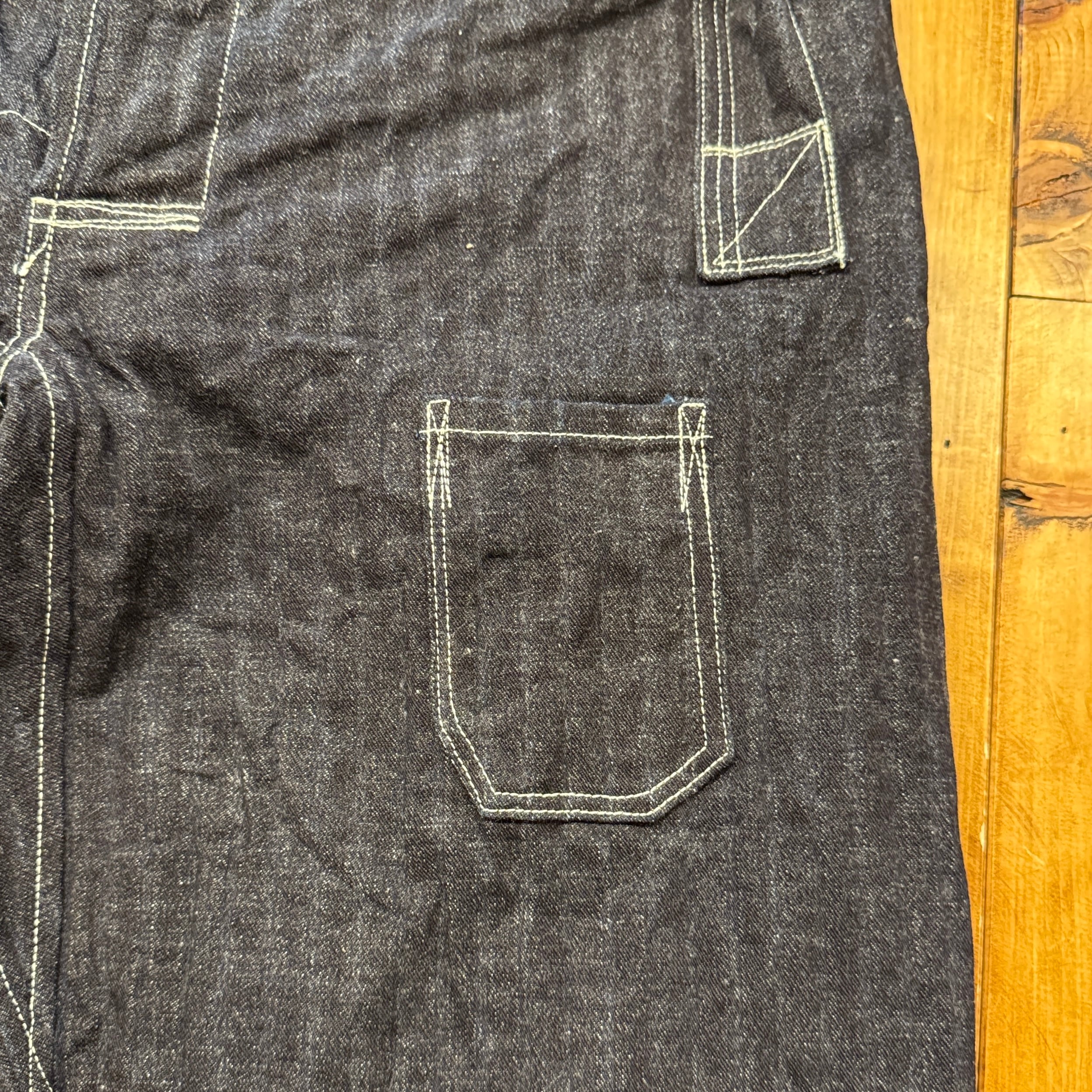 ユニークなデニムのワークパンツ。このメーカーの衣服のデザイン、構造に対する考え方は非常にユニークです。おそらくテントやギアなど、衣服以外のものを本業として作っていたのだと思います。ヒップとフロントのユニークなポケット、オーバーサイズのバックポケット、巻きデニムの脚がとても気に入っています。