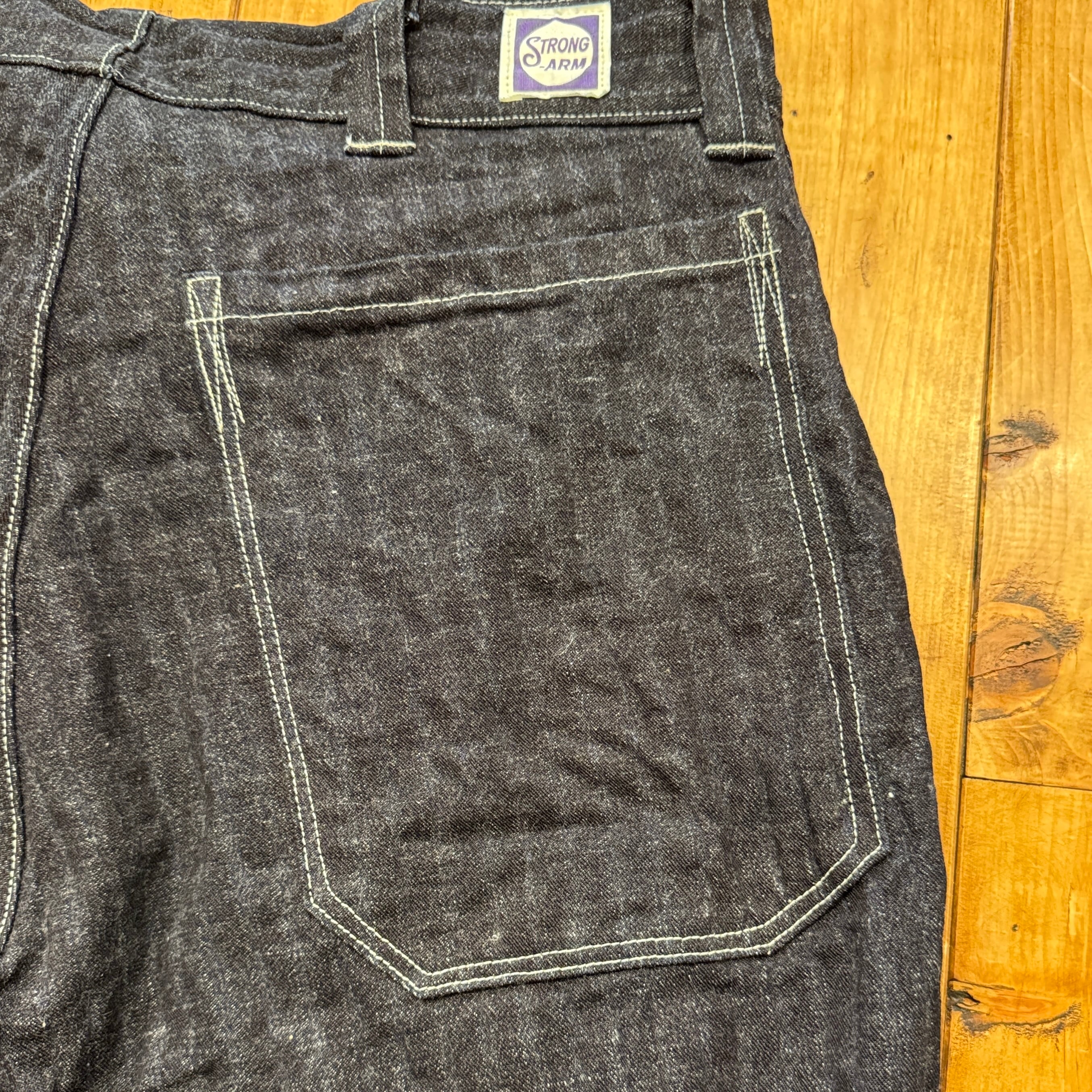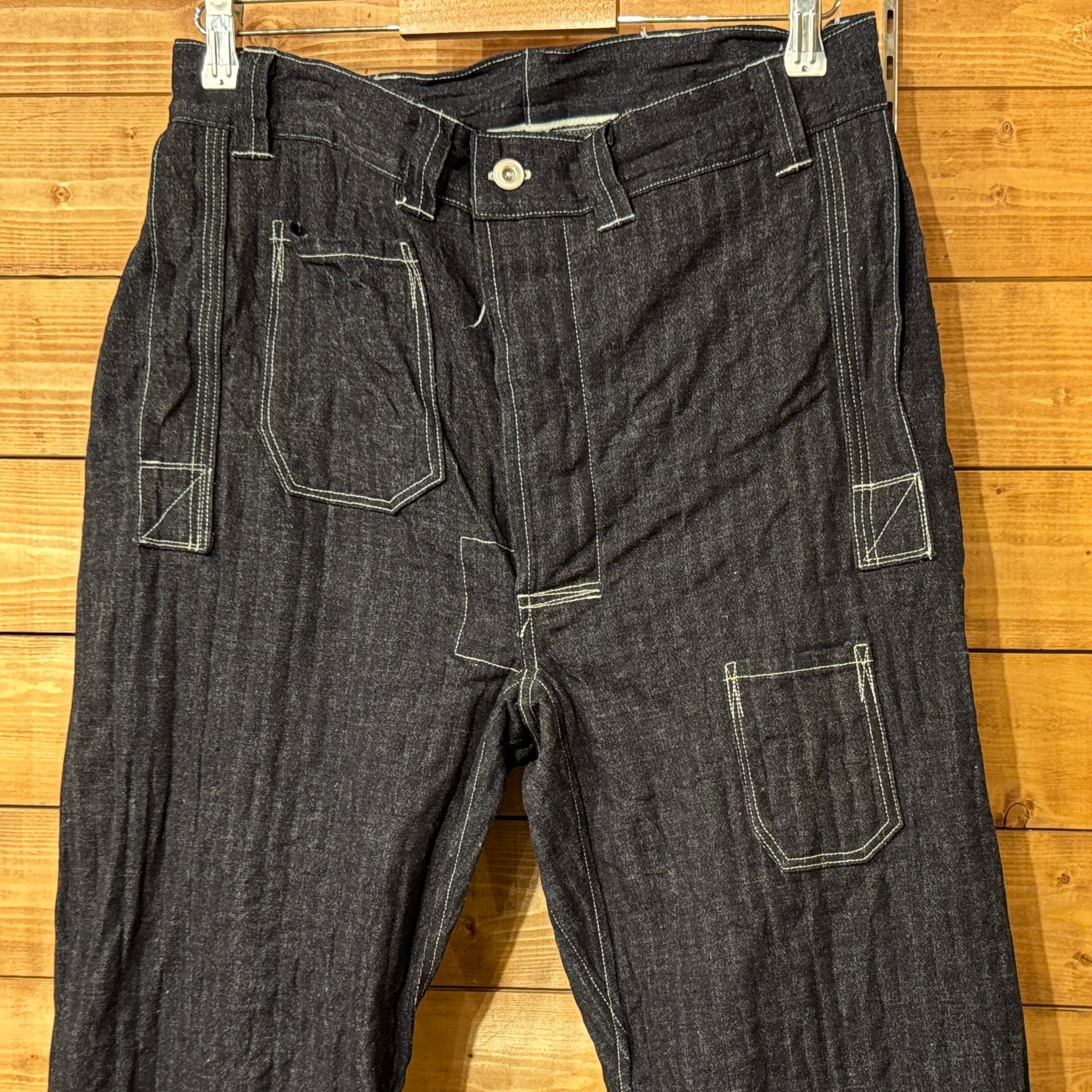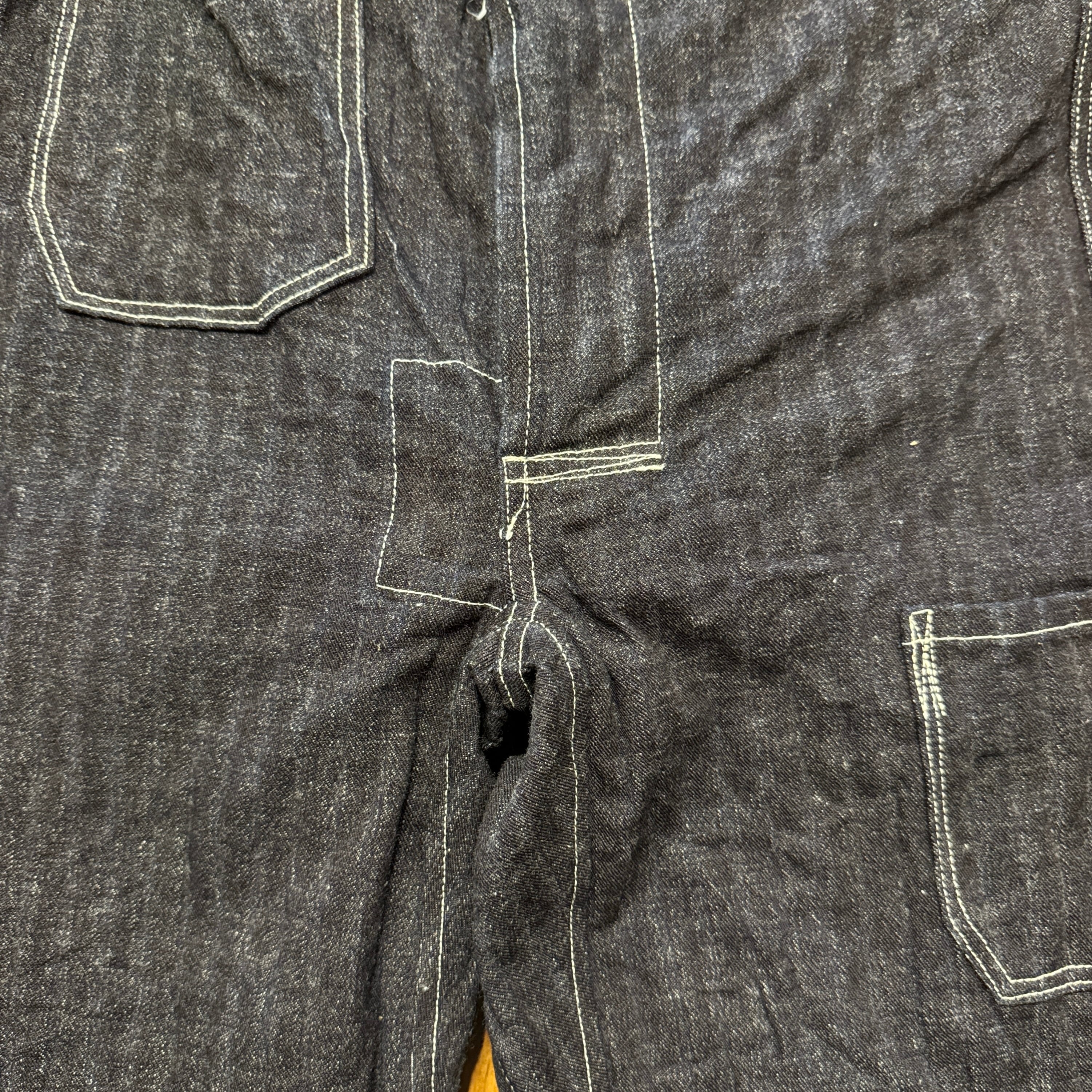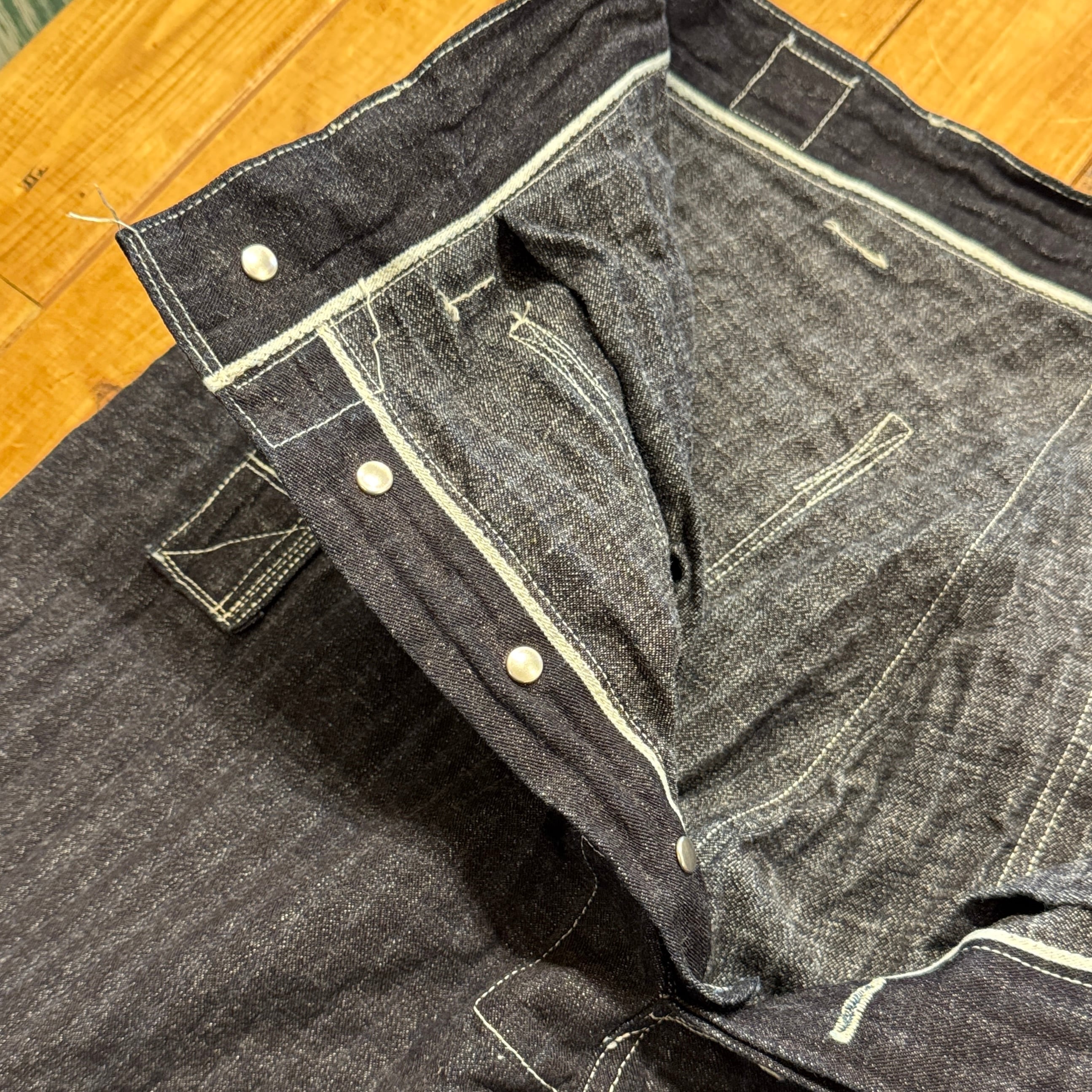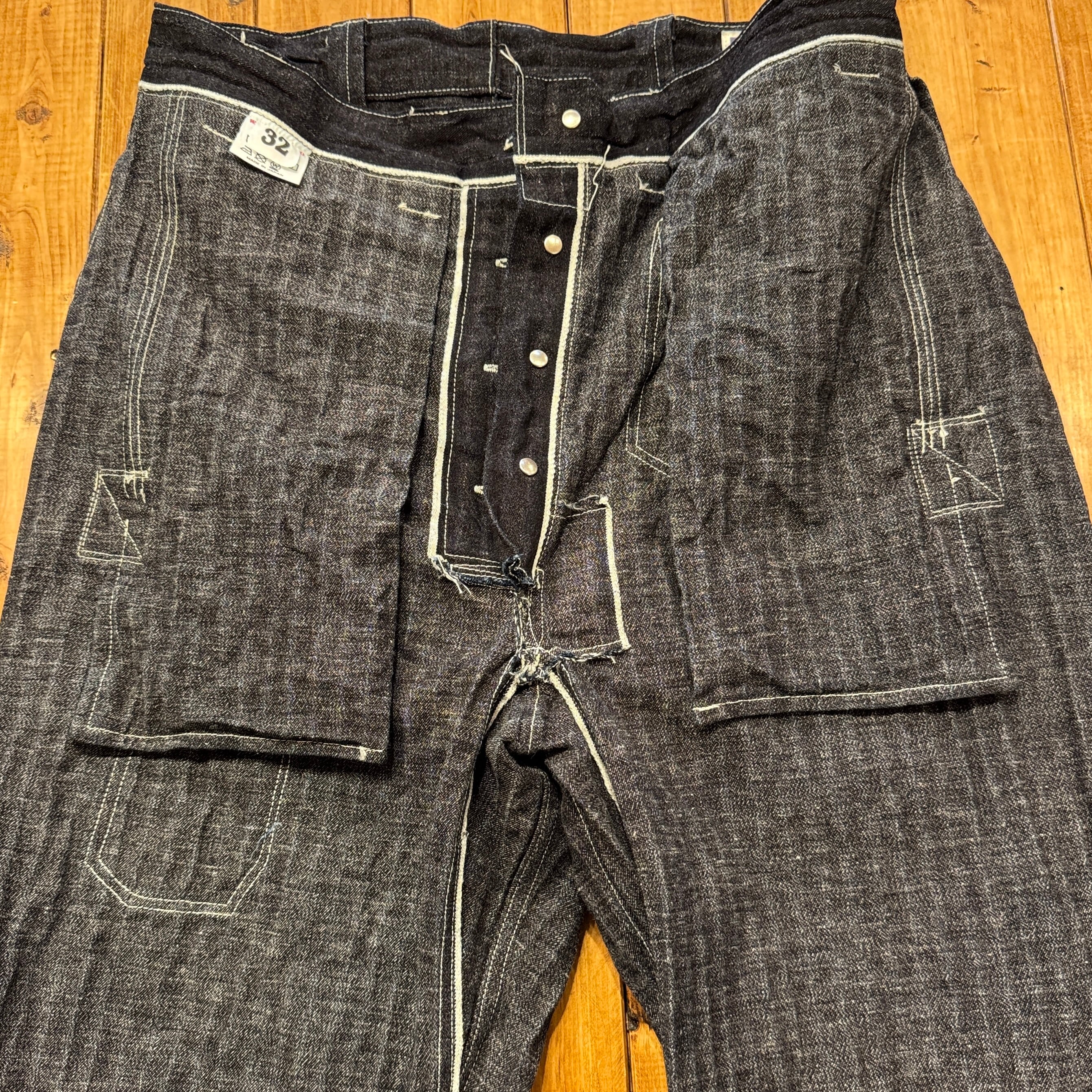 ユニークなデニムのワークパンツ。このメーカーの衣服のデザイン、構造に対する考え方は非常にユニークです。おそらくテントやギアなど、衣服以外のものを本業として作っていたのだと思います。ヒップとフロントのユニークなポケット、オーバーサイズのバックポケット、巻きデニムの脚がとても気に入っています。