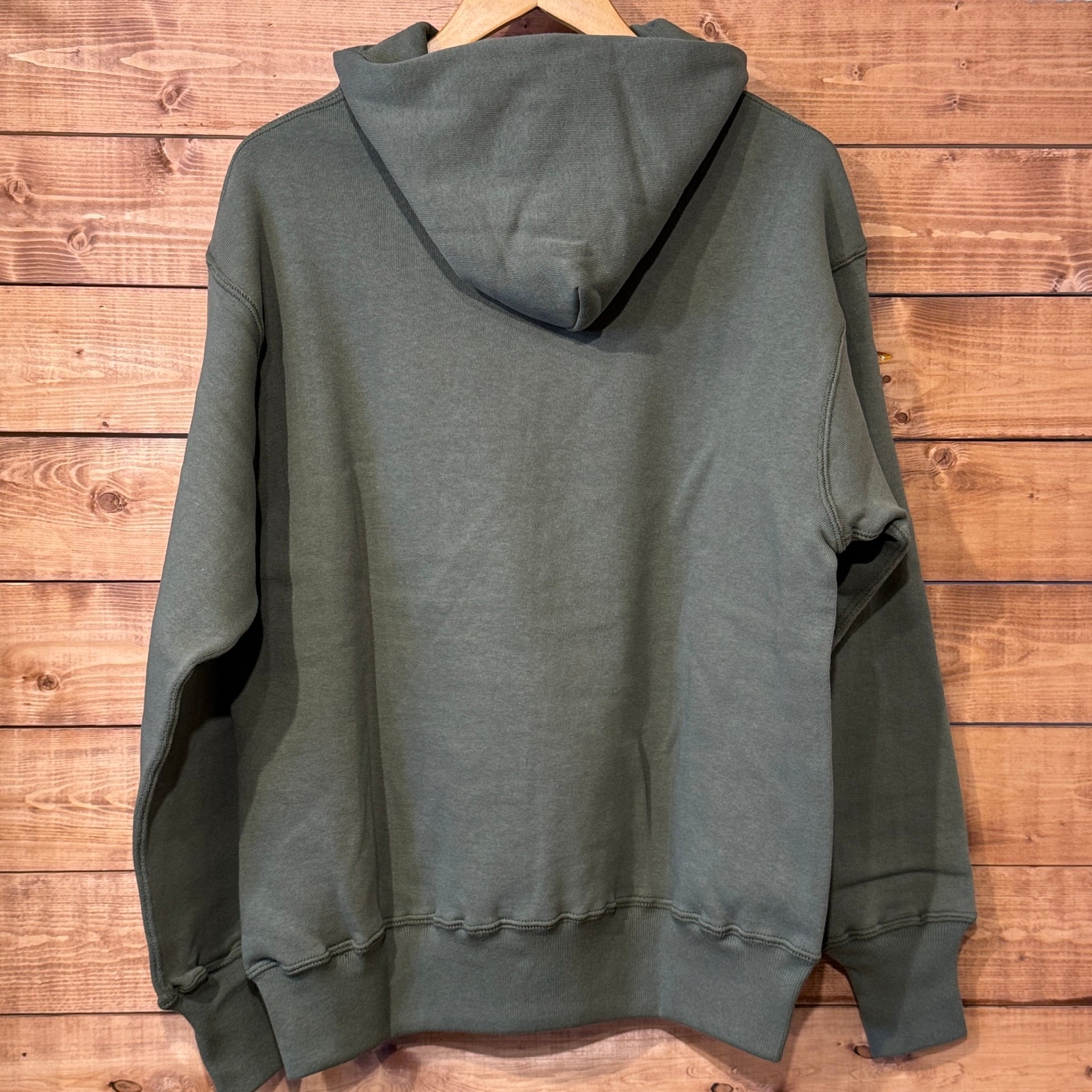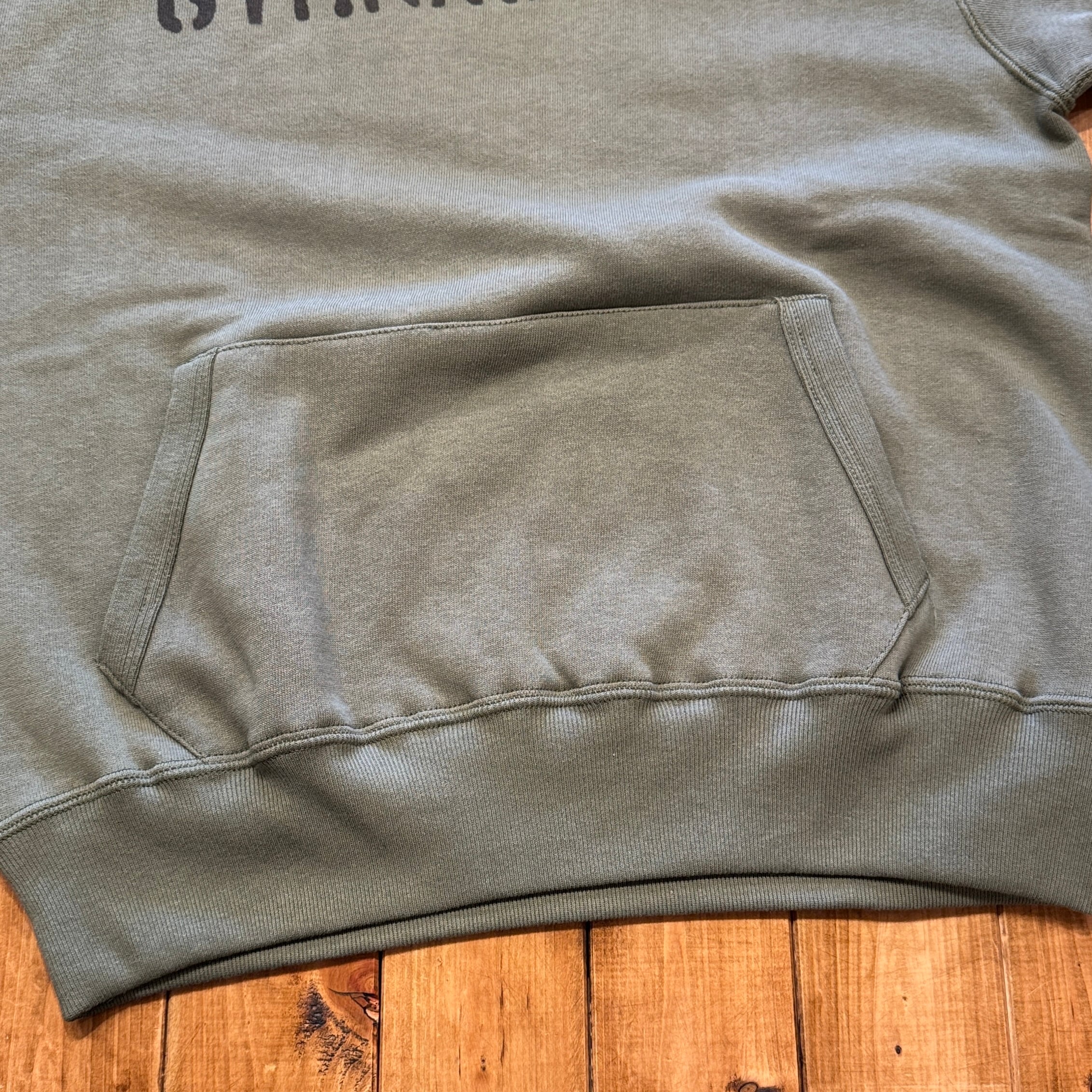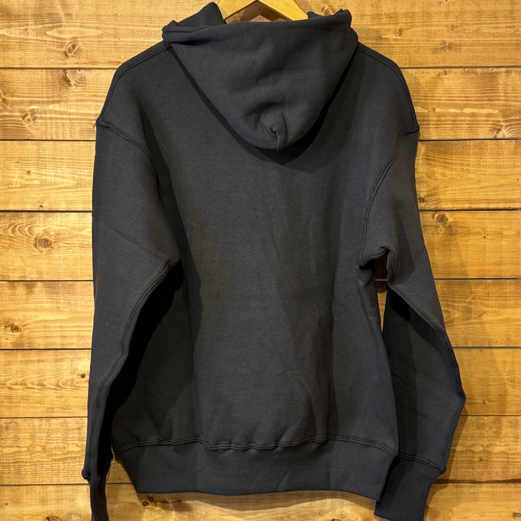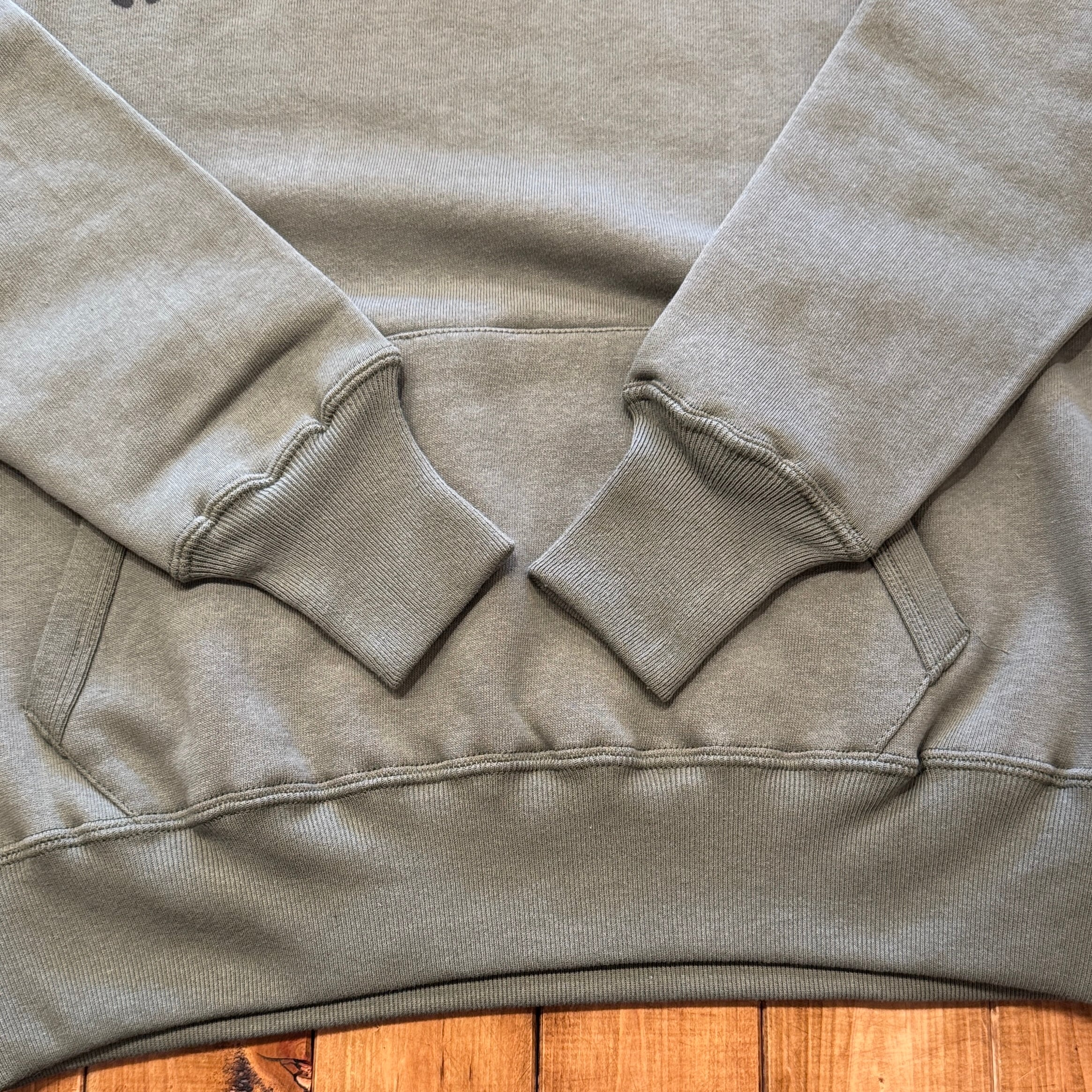 セットインスリーブの二本針タイプのフード付きモデルです。不変的な定番デザインながら、フード裏、ポケット口には特徴的なフライスリブを使用しているため、フードはさらにフィット感を高め、フロントポケットはアクセントだけでなく、補強の役割も果たしています。
