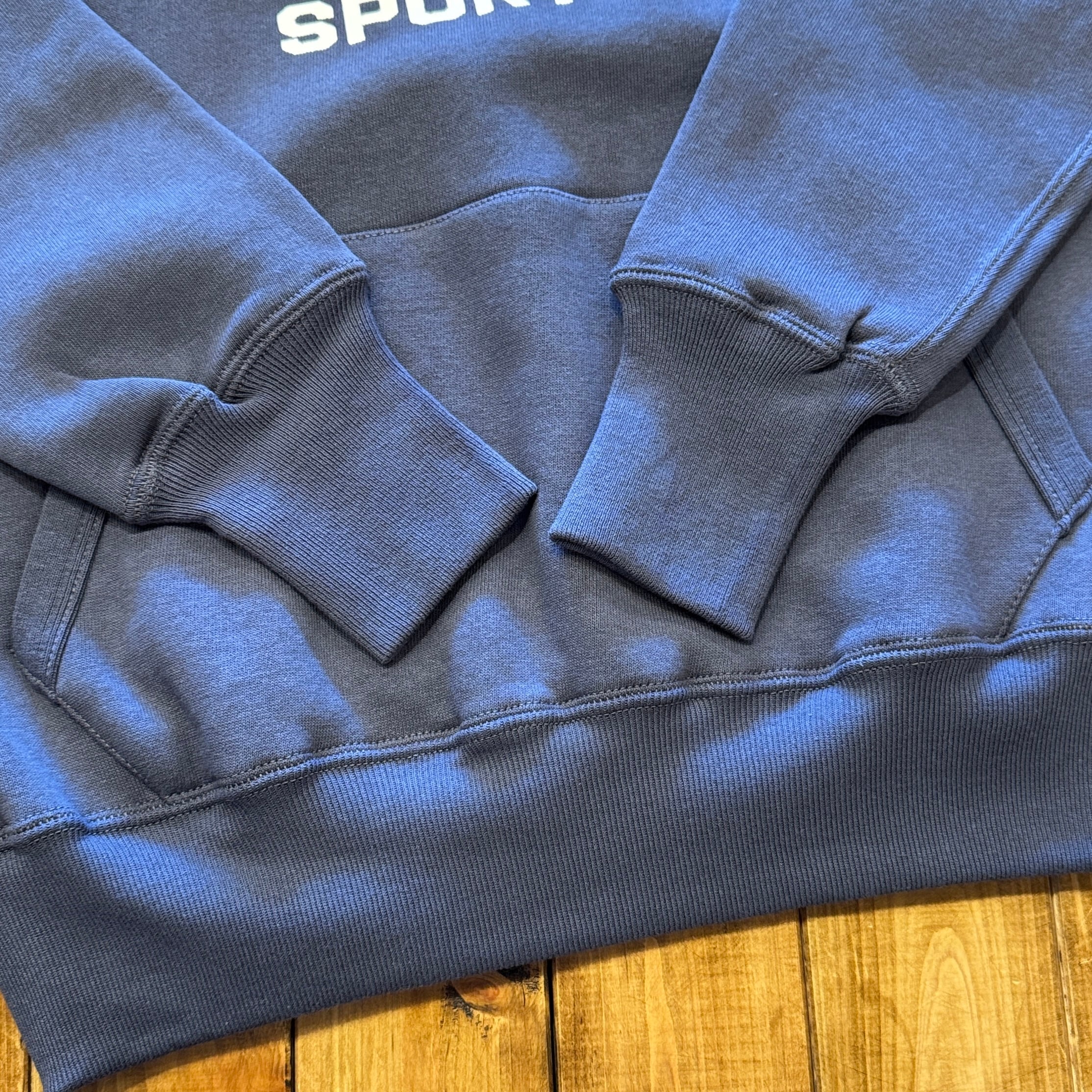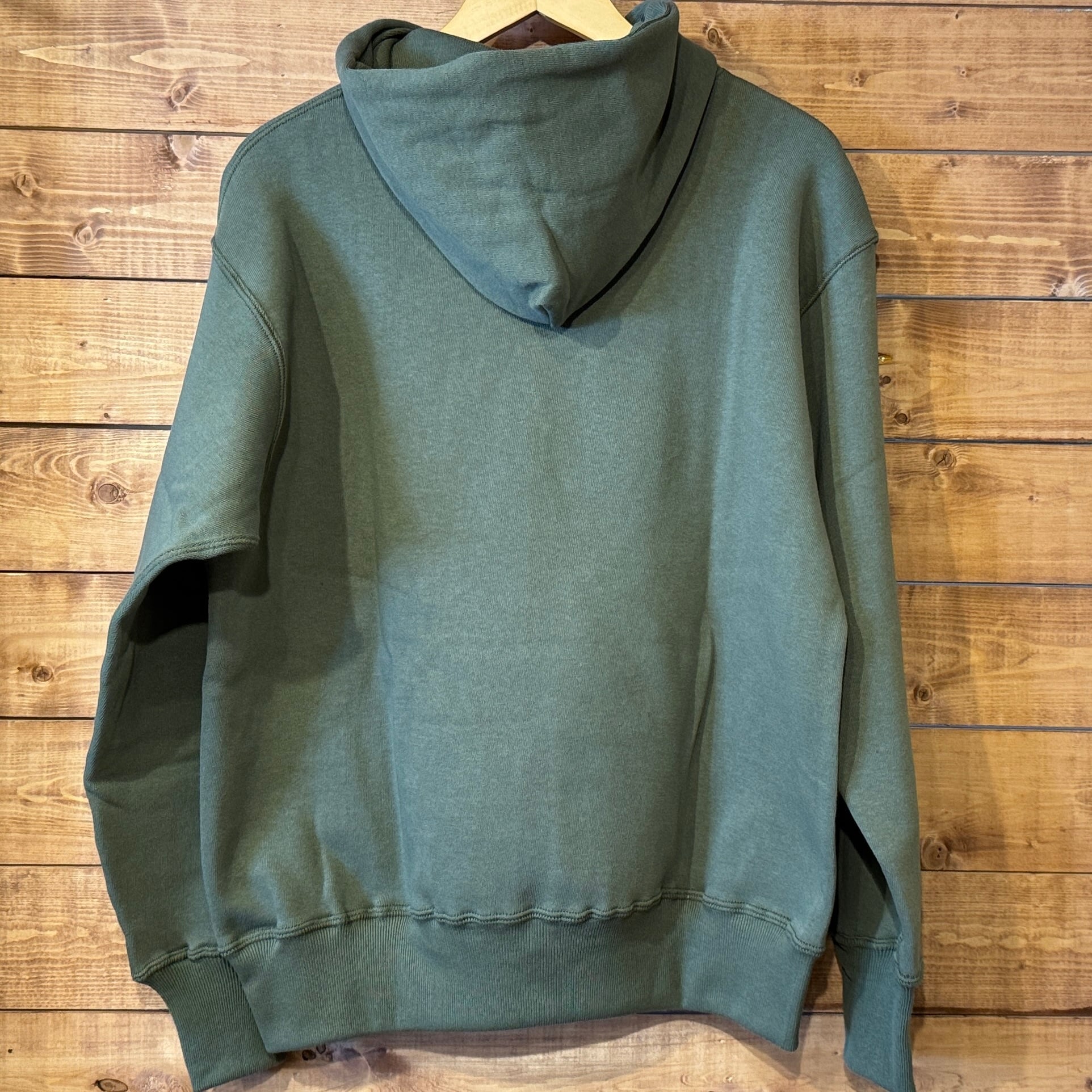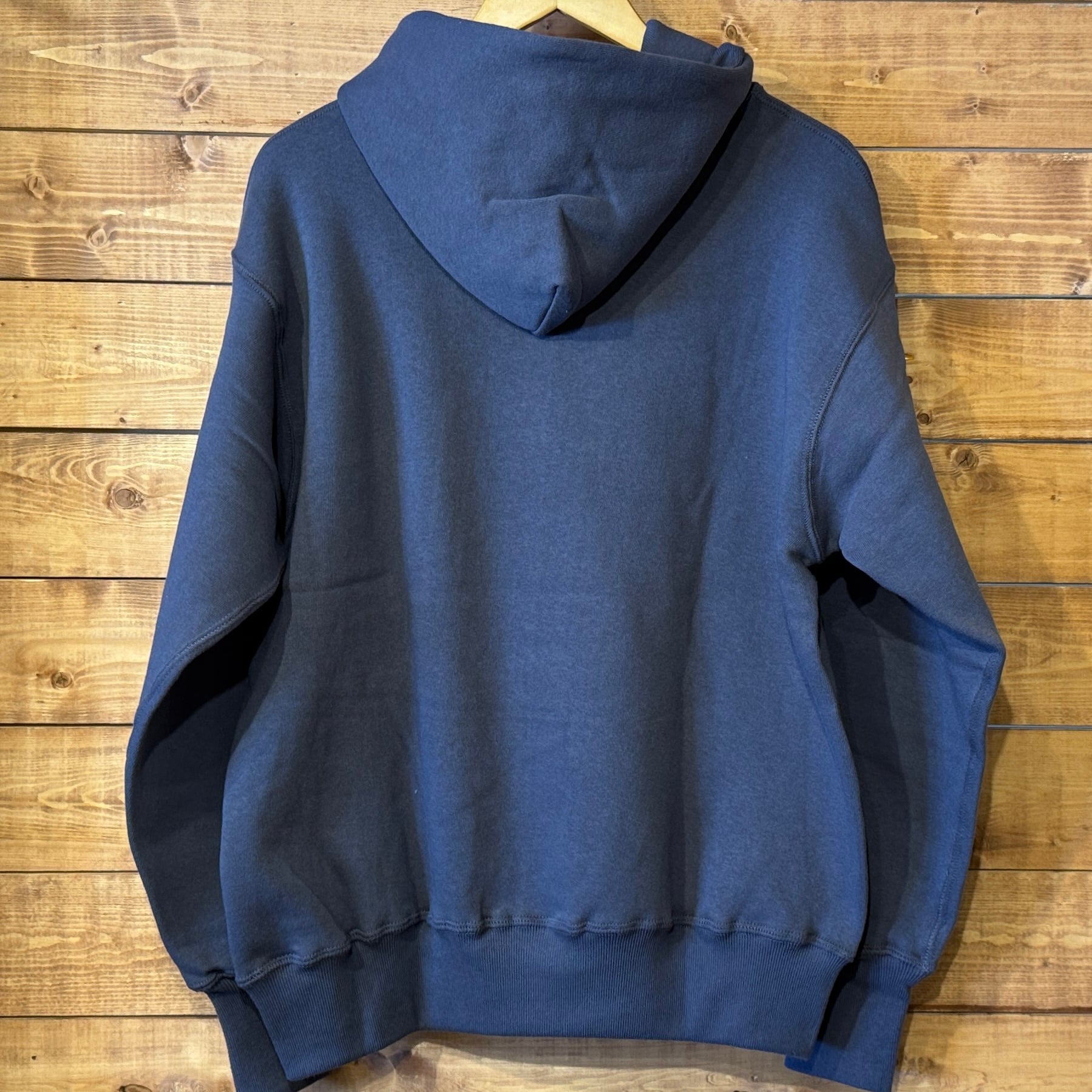 セットインスリーブの二本針タイプのフード付きモデルです。不変的な定番デザインながら、フード裏、ポケット口には特徴的なフライスリブを使用しているため、フードはさらにフィット感を高め、フロントポケットはアクセントだけでなく、補強の役割も果たしています。