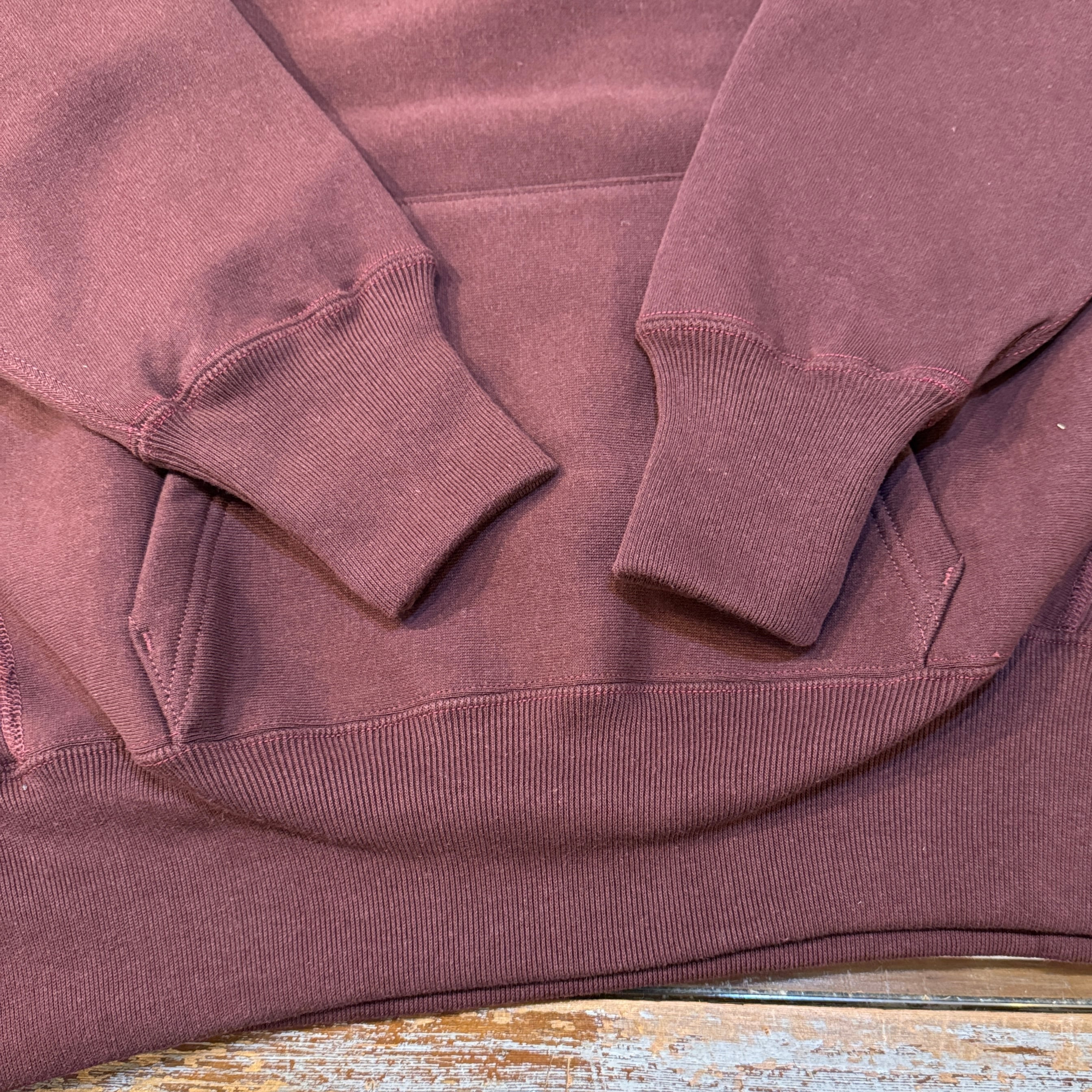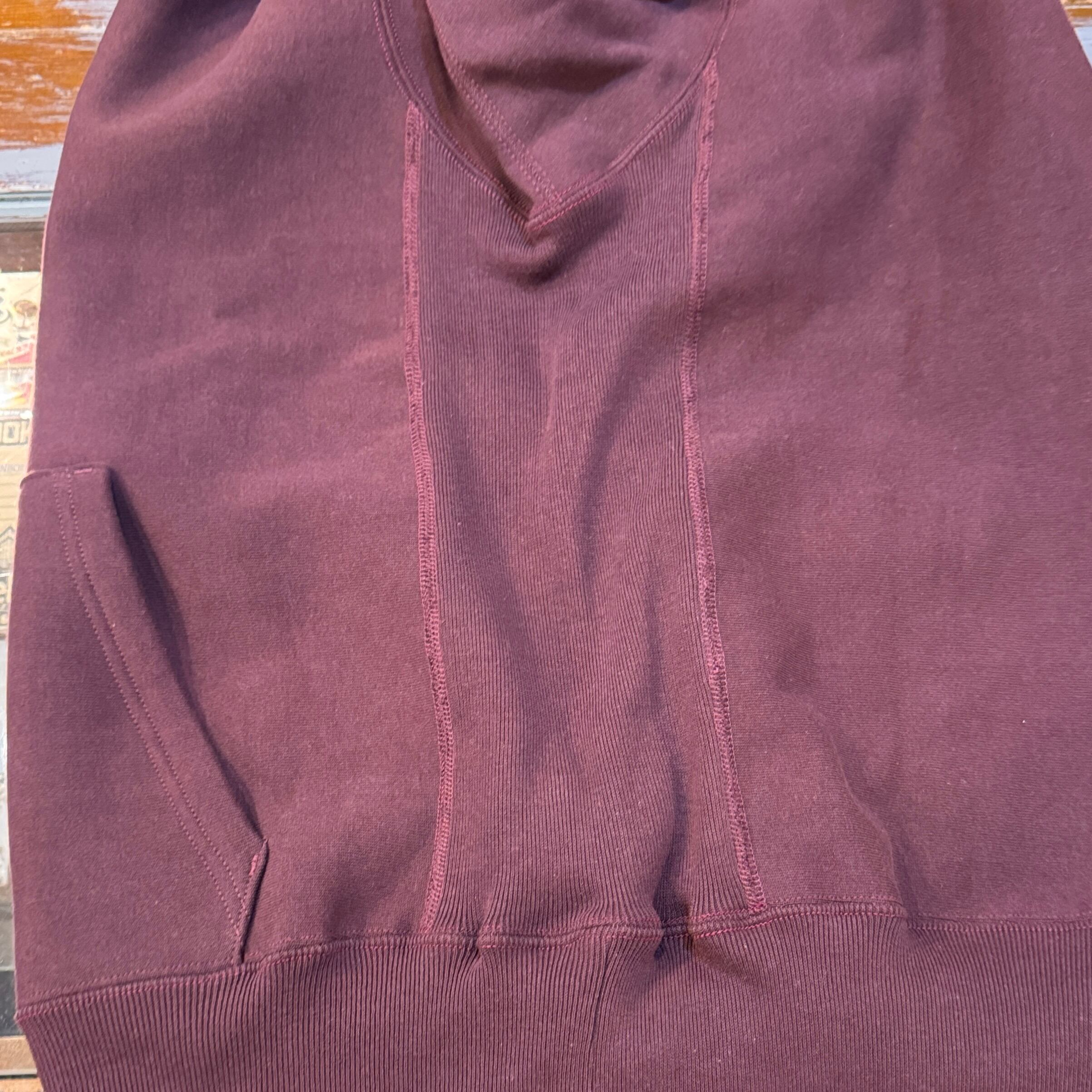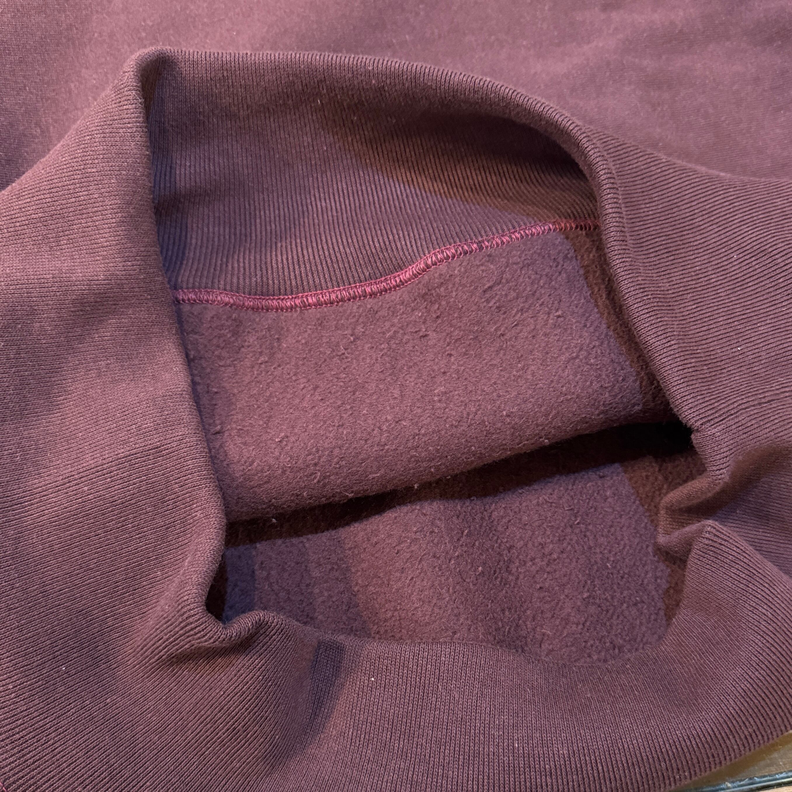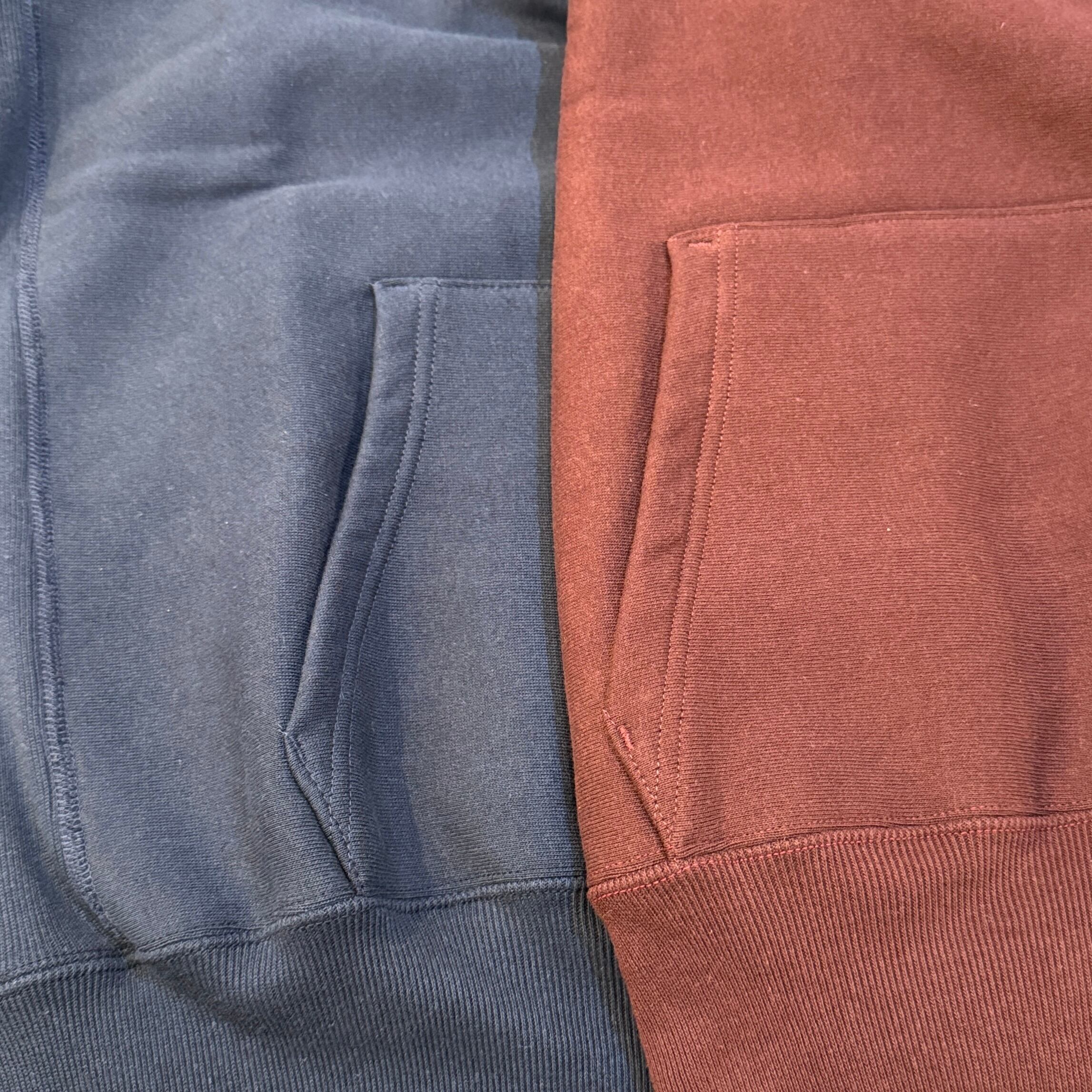 このスウェットシャツを手に取ってみると、まずは、その「重さ」に驚くことでしょう。1960年代のRWタイプを再現するために試行錯誤を繰り返した新開発のスウェットシャツ。縮みを軽減するために生地をヨコ使いした画期的なこのアスレチックスウェットは、サイドのパネル使いなどに目をとられがちであるが、その特性は「糸」にあります。徹底した度詰めで編まれたその生地は、硬いが弾性があり、重いがふわりとした柔らかさがあります。そしてウエアハウスがこだわるのは生地の「目」です。「生地の目が立つ」というのは、通常のスウェットでは、「タテ筋」だが、こちらRWモデルでは「ヨコ筋」です。目を立たせるために、糸の番手はもちろん、度の詰め方など、何度もその組み合わせを変えました。そしてたどり着いたのが、スウェットとしては珍しい「引きそろえ」である。通常はそれぞれ1本の糸を表、中、裏に組み合わせて編むスウェットであるが、引きそろえにすることで度を詰めやすくなりました。さらに吊り編み機の特性により、生地の弾性を保ったまま硬く、表面の目を立たせることができるようになったのです。歴史上、後発に採用されるシンカー編み機では、同じ糸の規格でもってしても、硬くなりすぎてしまい、編上がりの違いは歴然としているといいます。出来上がった生地の「重さ」は、染色の際、また縫製においても熟練の作業を要します。染色の際には通常よりも負荷がかかるし、縫製でも軽いニットウェアのようにはいきません。生地、染色、縫製、すべての工程においての協力による「バトンリレー」が、このRWタイプのスウェットの「重み」なのです。そして、このRWモデルのオリジナルについても後述しておきます。驚くべきことに、「タタキタグ」と通称される60年代のヴィンテージの、生地の破れた部分を解析すると、「引きそろえ」の糸が露出していたというのです。アスレチックウェアとして、牧歌的でありながらも妥協することなく開発を試みた先駆者の精神は、「限りなきディテールの追求」によってこそ発掘されるのです。
