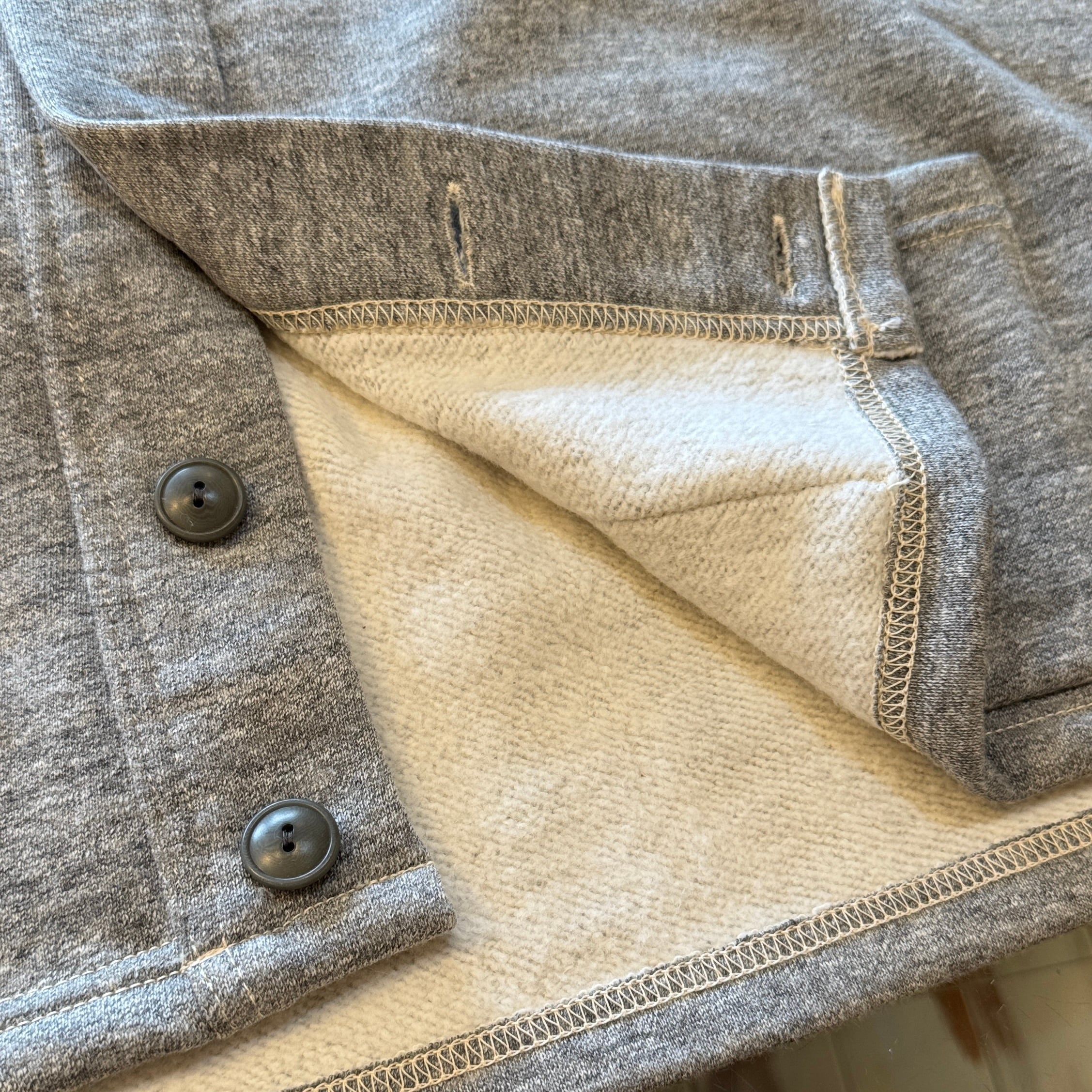 オリジナルナットボタンを使用したスウェットカーディガン。裾のほうにはパッチポケット。