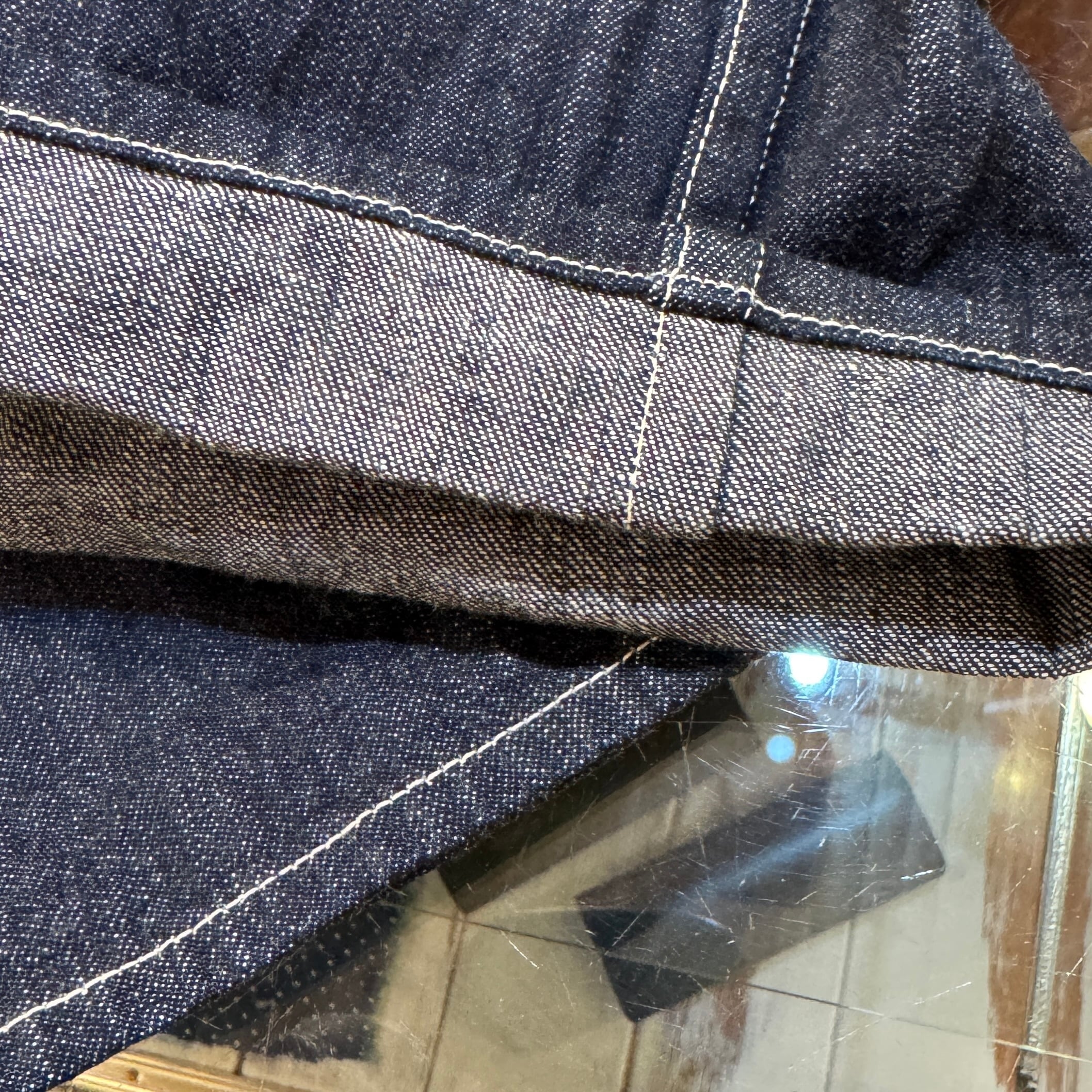 縦落ちが期待できる生地表情、緯糸は生成り感が強く長い年月を経た風合いに仕上がっております。