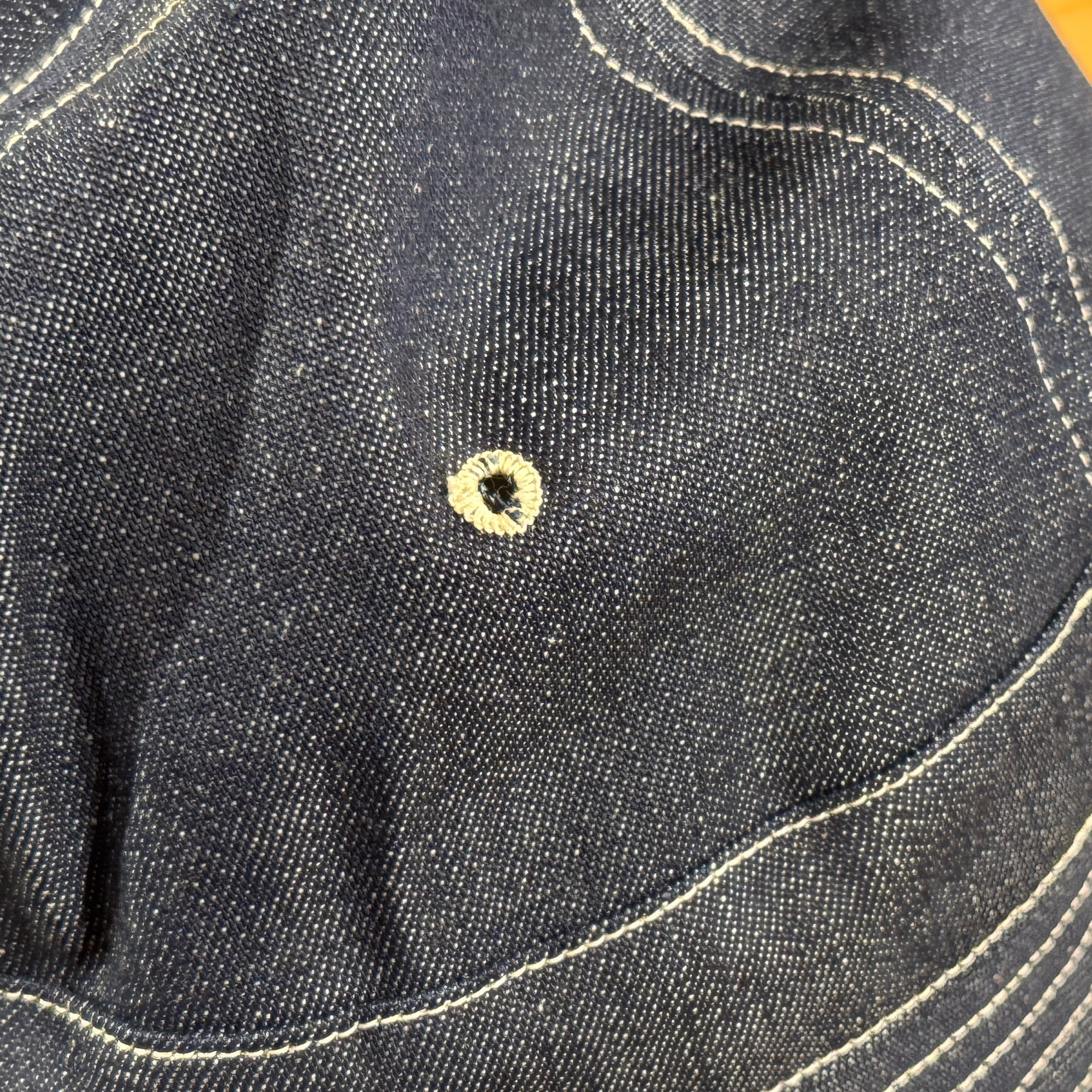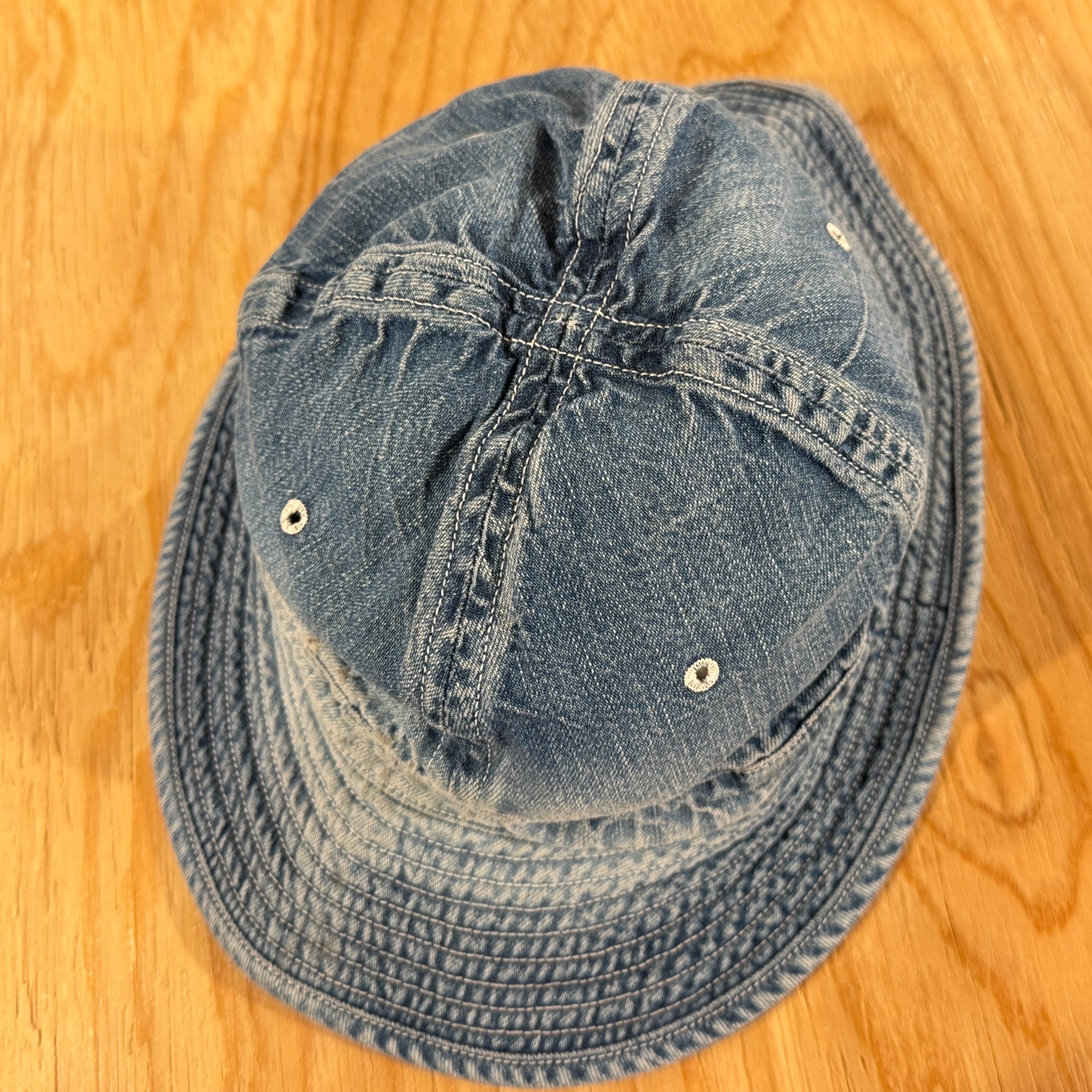 デイジーハット、フルブリムハットなどとも呼ばれるアーミータイプのハットです。特徴的な4枚のパネルには通気をよくするための菊孔をあしらいました。またブリムに無数に走るステッチは、洗いこむことで独特のアタリを生みだします。帽子専門の工場でなく、あえてワークウェアを縫う工場で生産することで、当時に作られたクラフト感を再現しています。