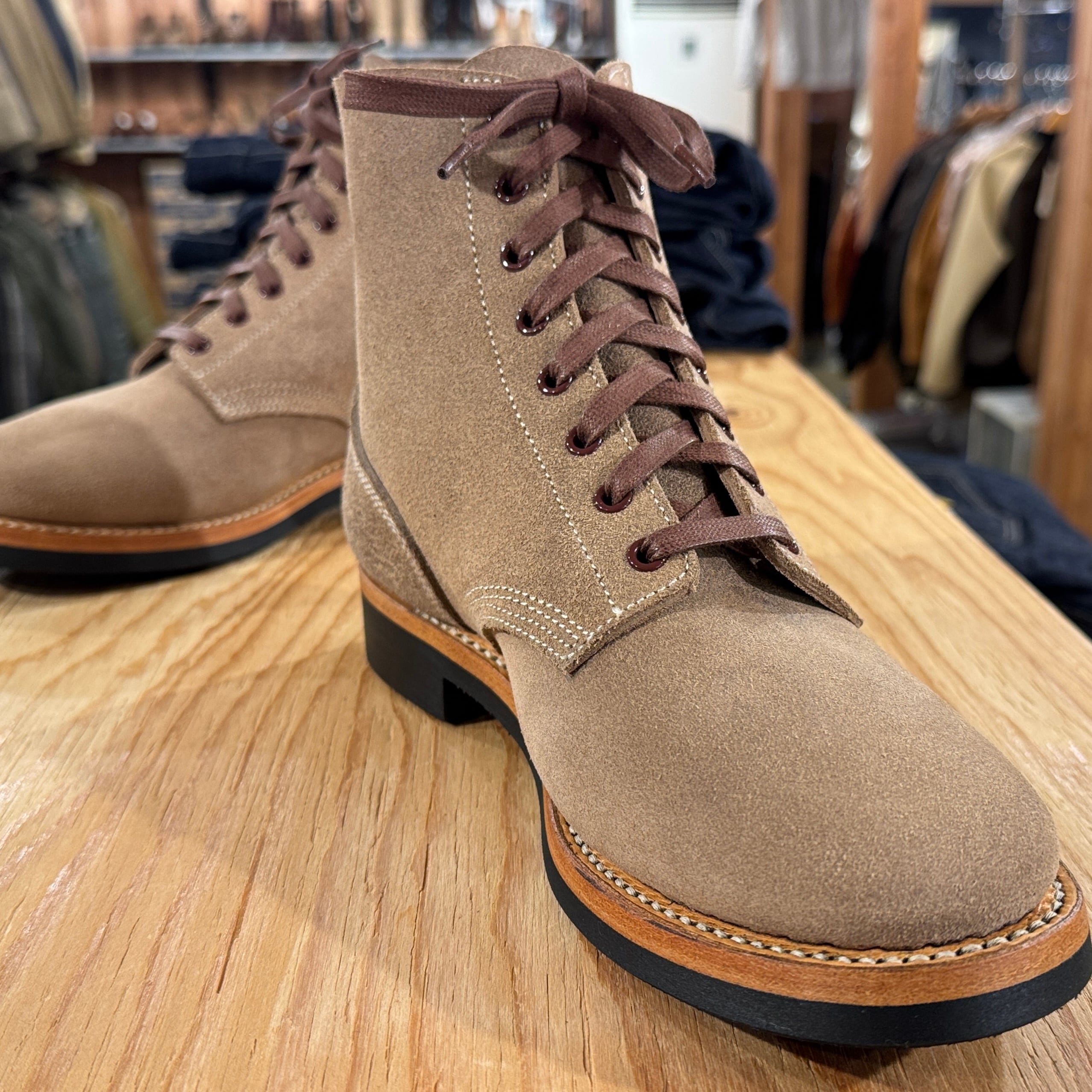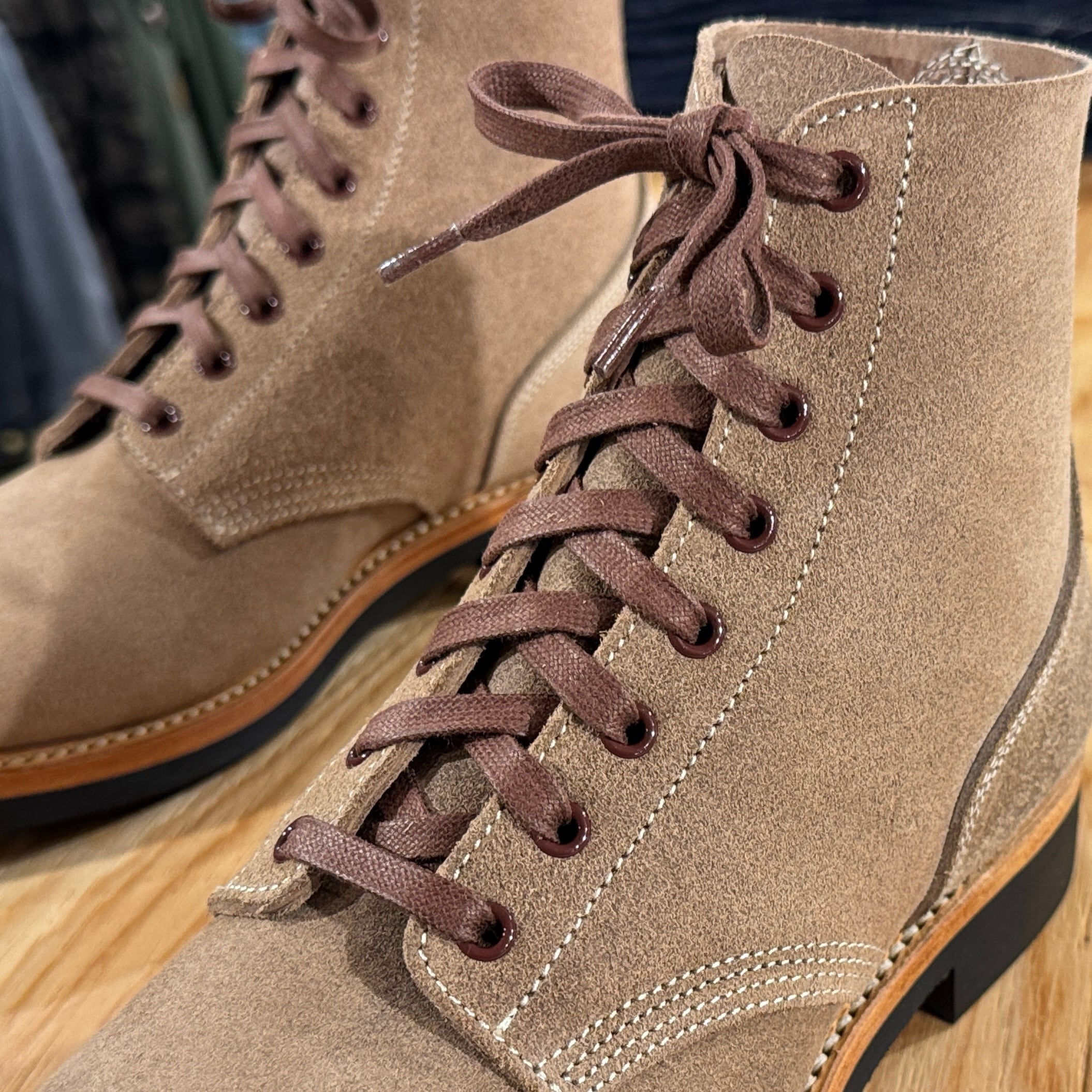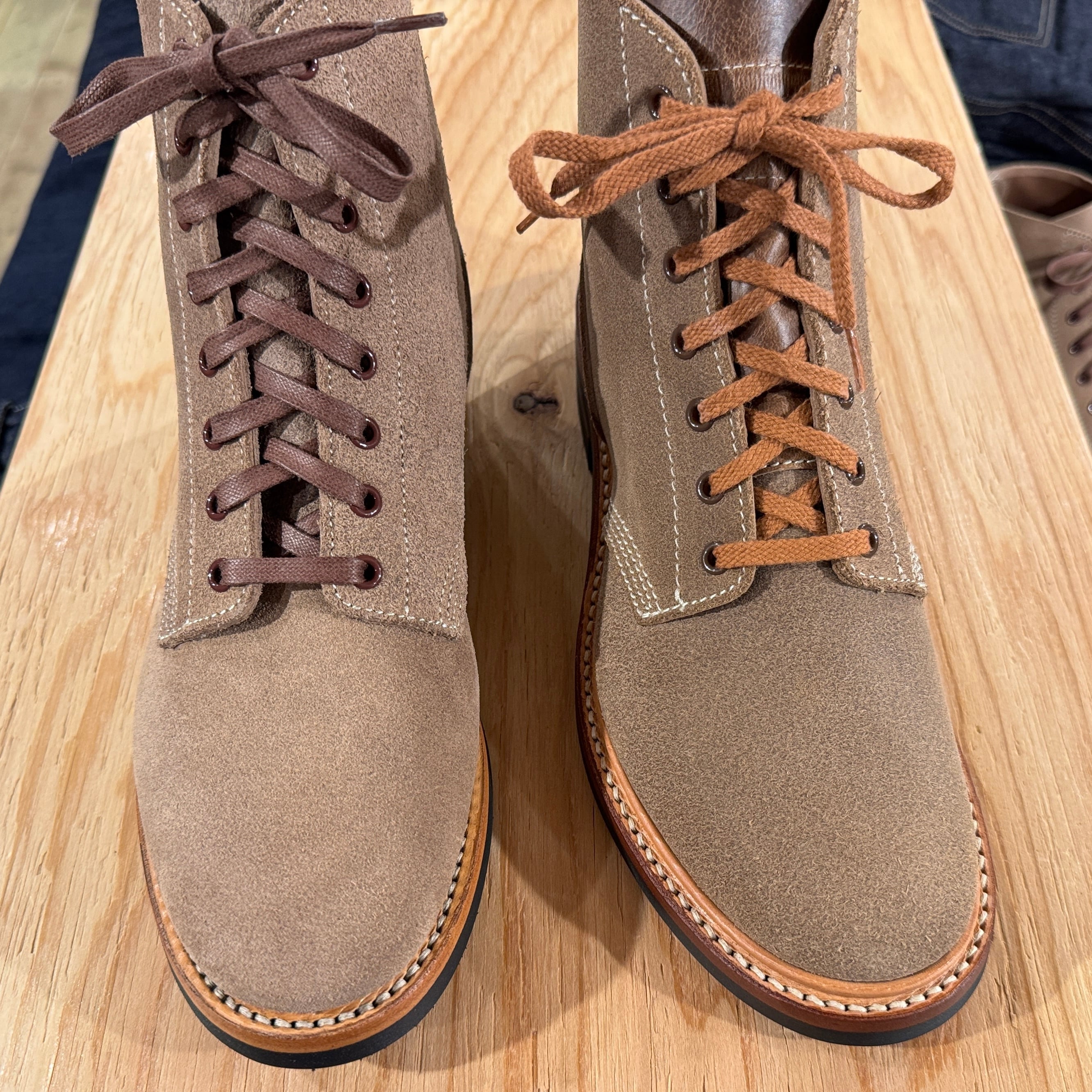 ヴィンテージ同様にアメリカホーウィン社のクロムエクセルナチュラルラフアウトレザーを採用、ワックスコットンレース仕様、赤みのあるアイレットも再現。