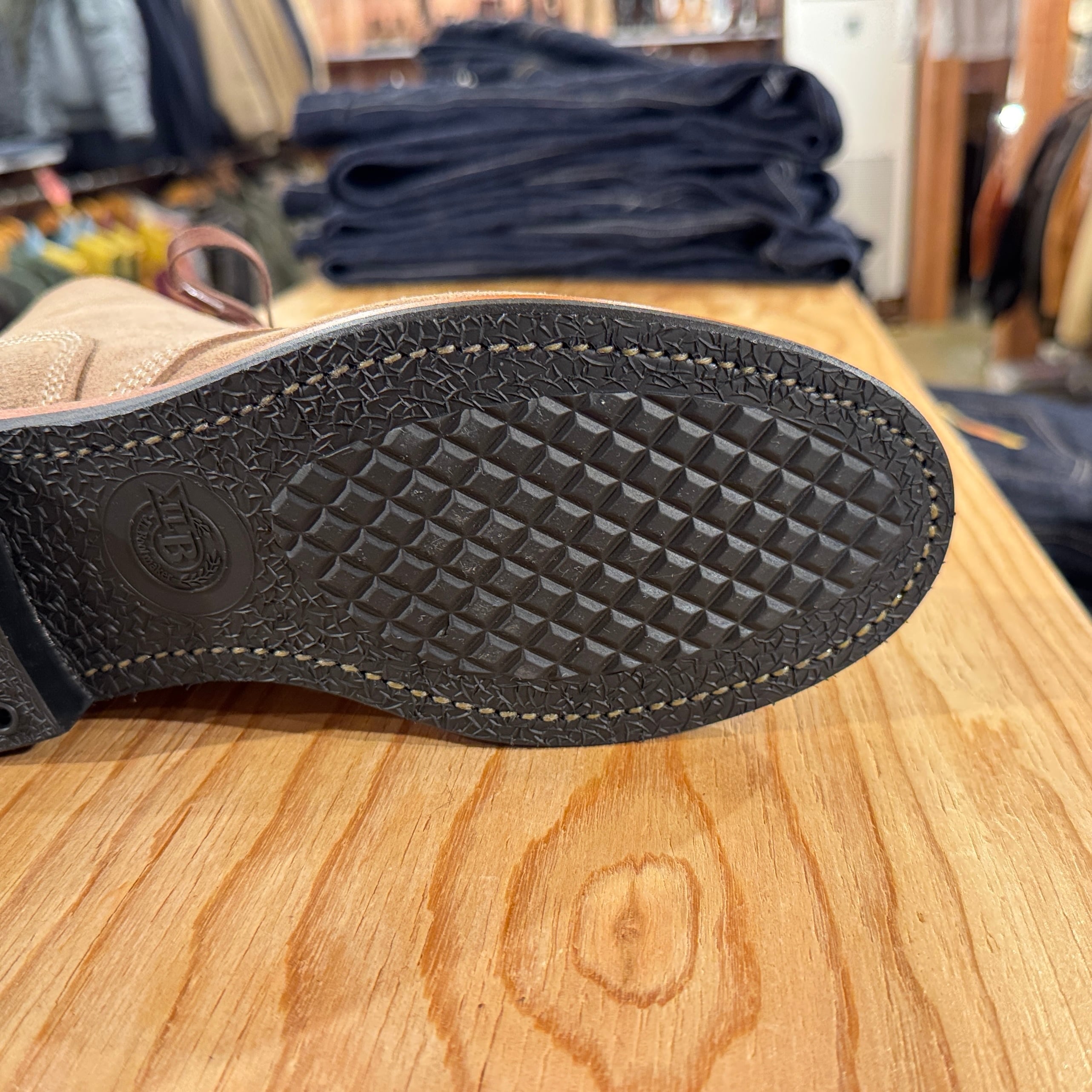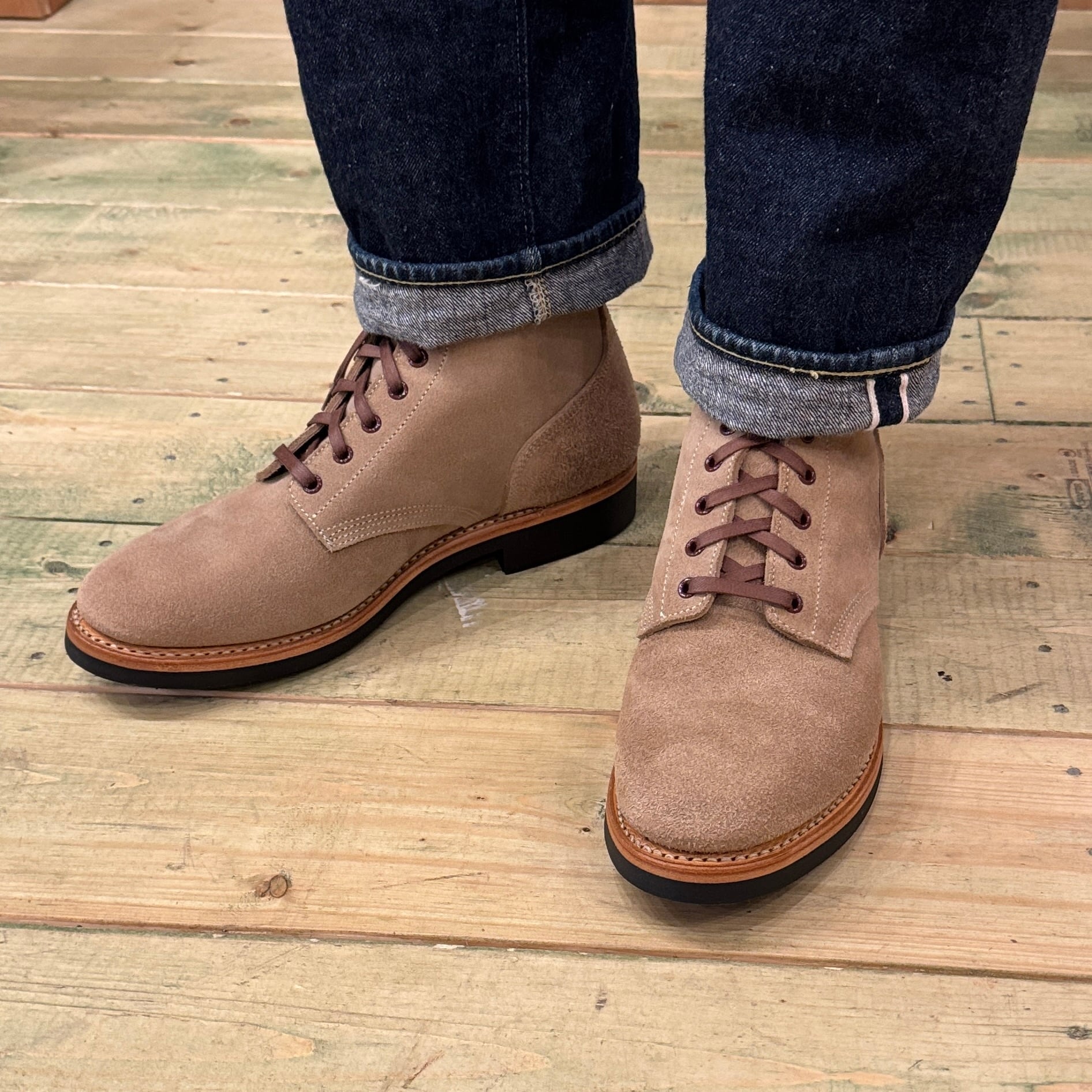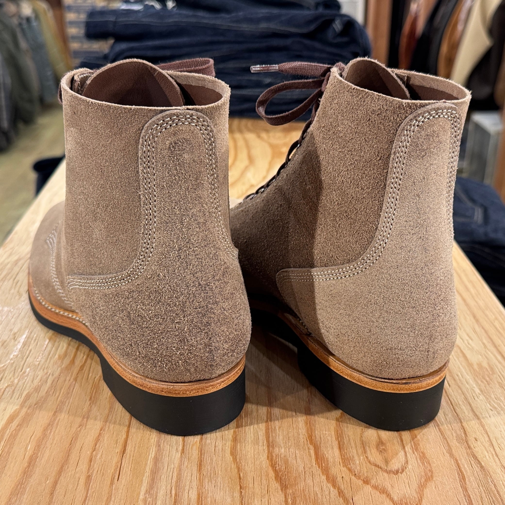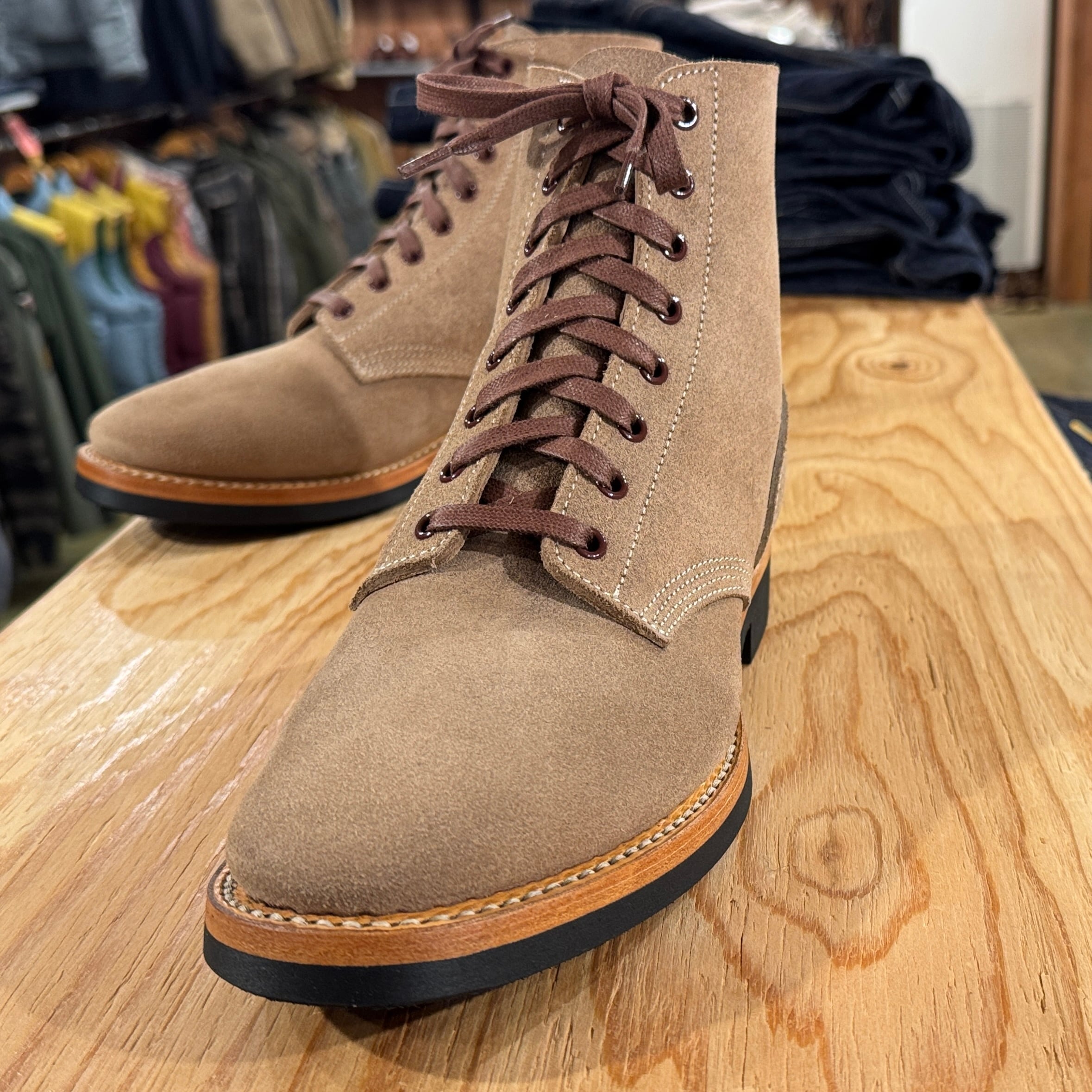 ヴィンテージ同様にアメリカホーウィン社のクロムエクセルナチュラルラフアウトレザーを採用、ワックスコットンレース仕様、赤みのあるアイレットも再現。