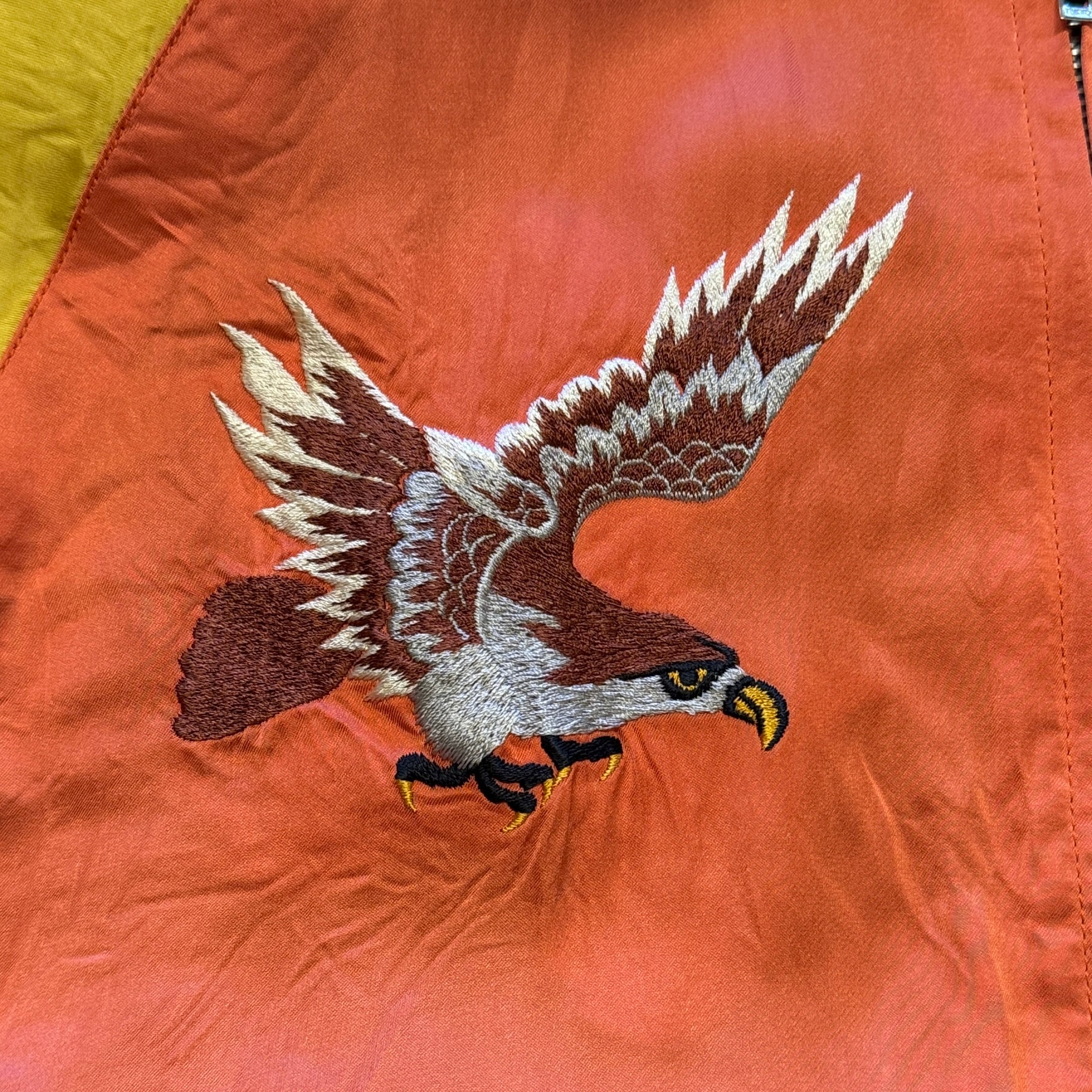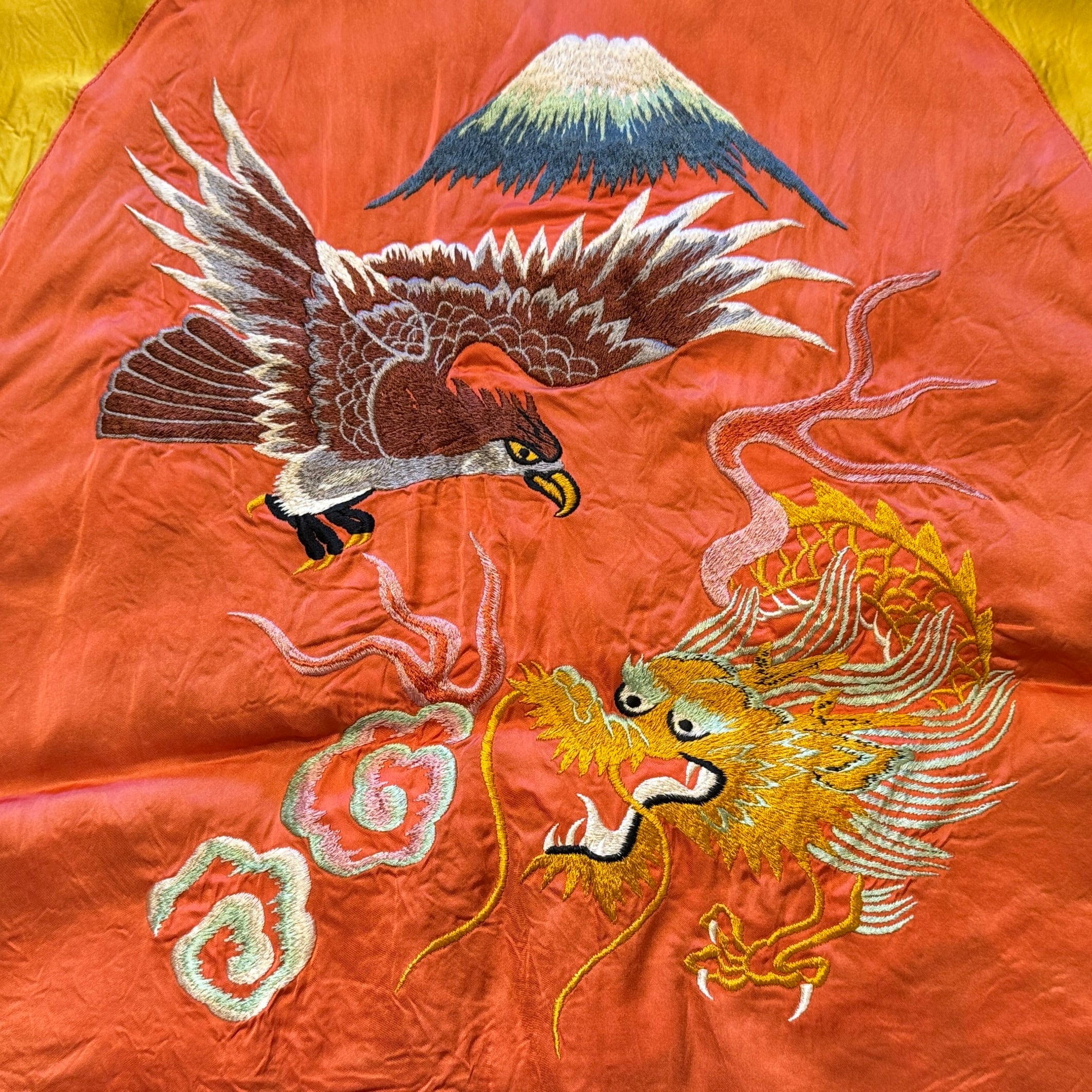 ヴィンテージの完全復刻モデルで、表面は富士山を背景に鷲と龍が睨み合う絵柄。背中の上部に「Japan」の文字が無いためそれぞれのモチーフが通常よりも大きく描かれており、針足の方向を細かく変えて大きく広げた鷲の翼の立体感や迫り来る龍の体躯の遠近感まで緻密に描写している。また鷲のクチバシや爪、龍の口など部分的に黒い色糸を差すことで絵柄の迫力を強調。非常に珍しいオレンジ×イエローのボディに刺繍が映える。
