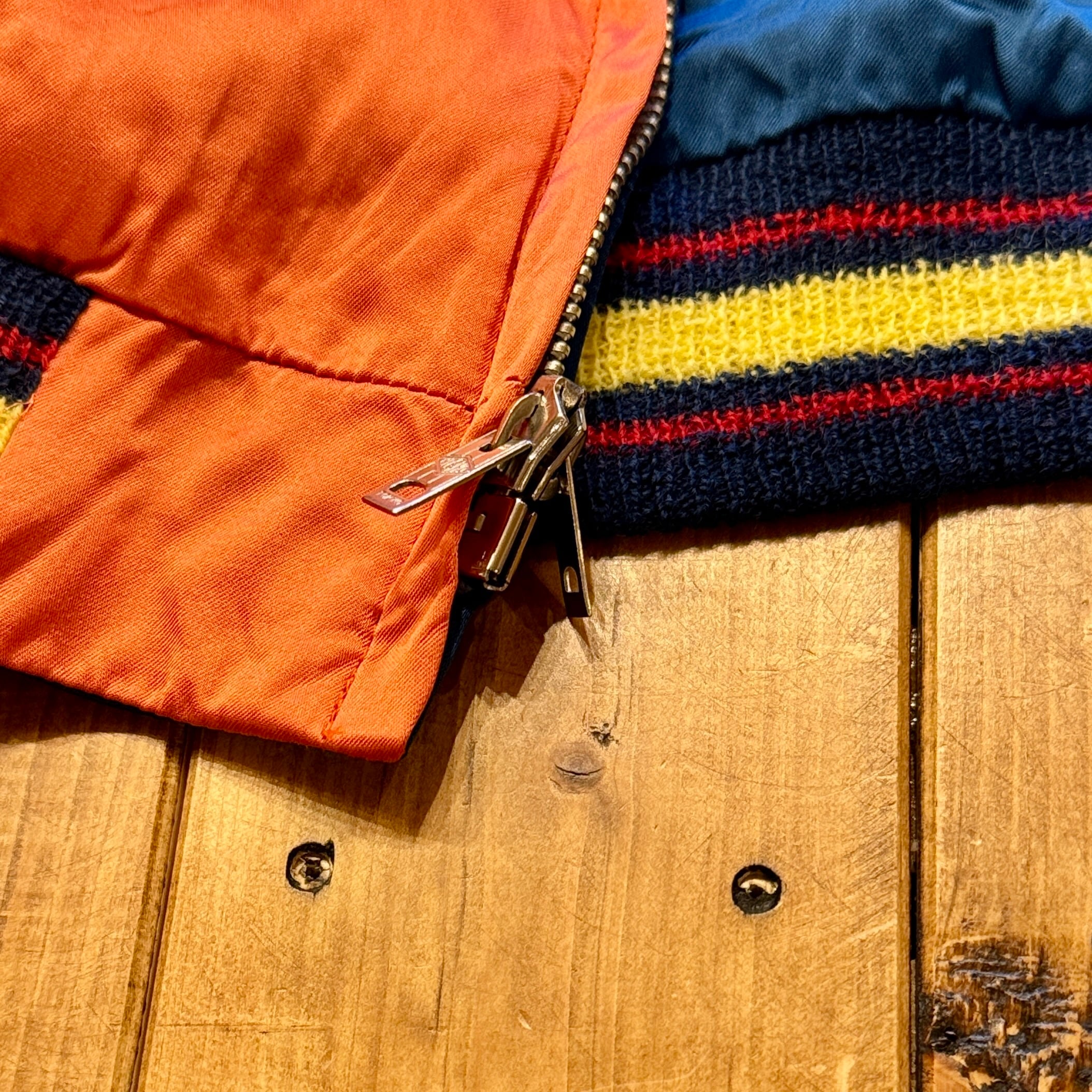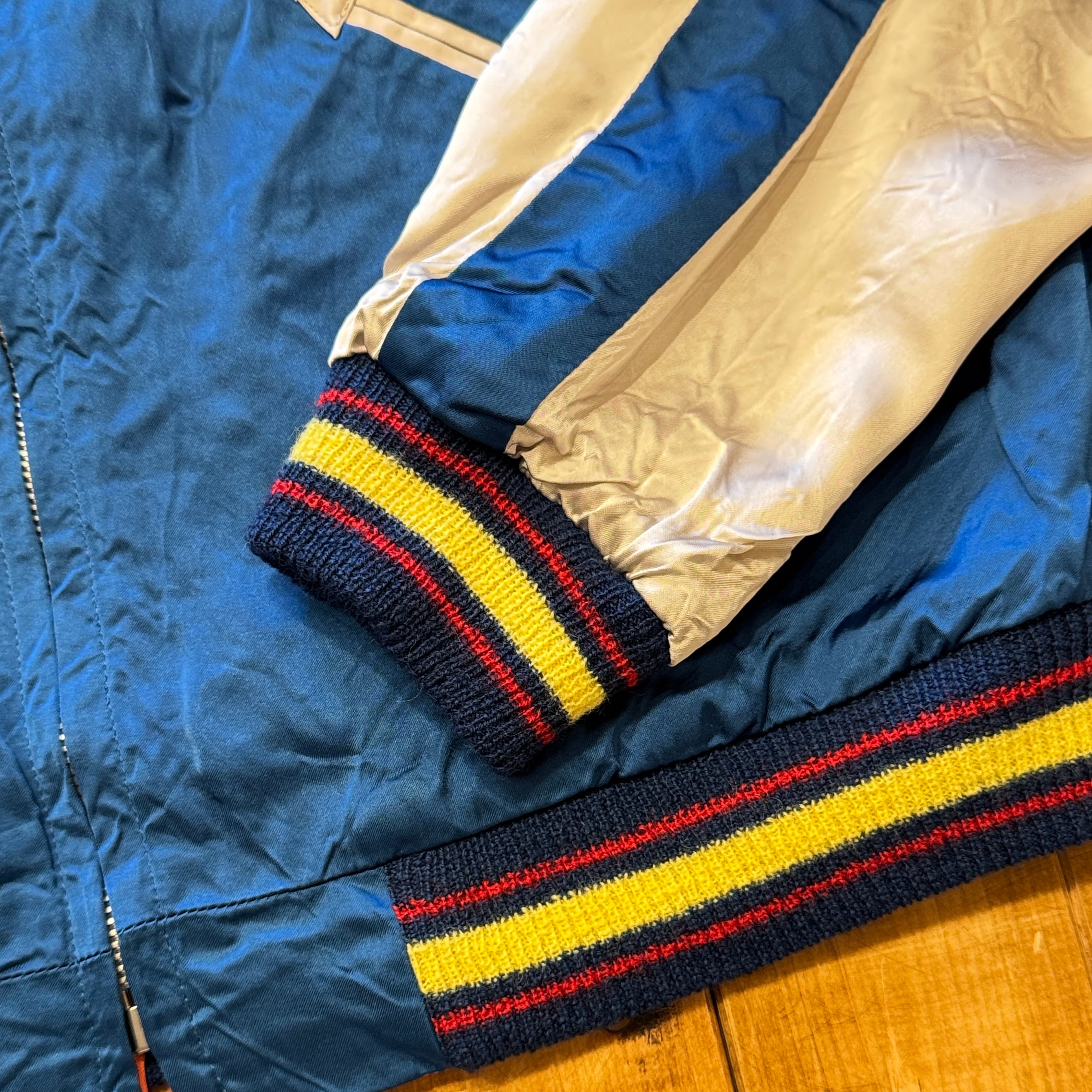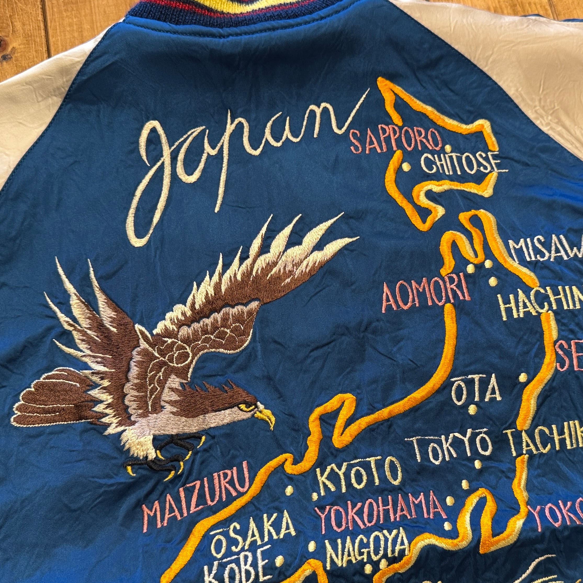 対してリバーシブル面はジャパンマップ柄。海を想わせる鮮やかなブルーのサテン生地に、日本地図を挟んで鷲と龍が睨み合う構図となっている。本作は数あるヴィンテージスカジャンの絵柄の中でも特にジャパンマップが大きく、上部のスペースが限られるため「Japan」の位置も中央ではなく北海道の横に。さらに地名の数も非常に多く、主要都市や米軍にまつわる地名を所狭しと描いている。このように贅沢な刺繍のジャパンマップ柄は他に類を見ず、港商スペシャルエディションの名にふさわしい一着と言えるだろう。