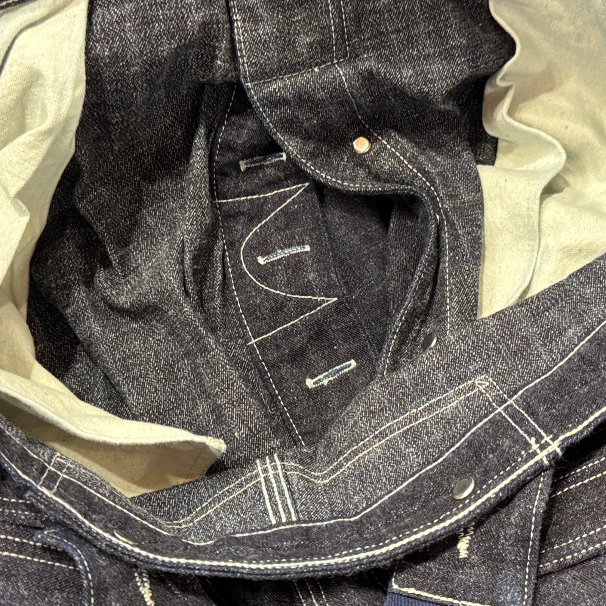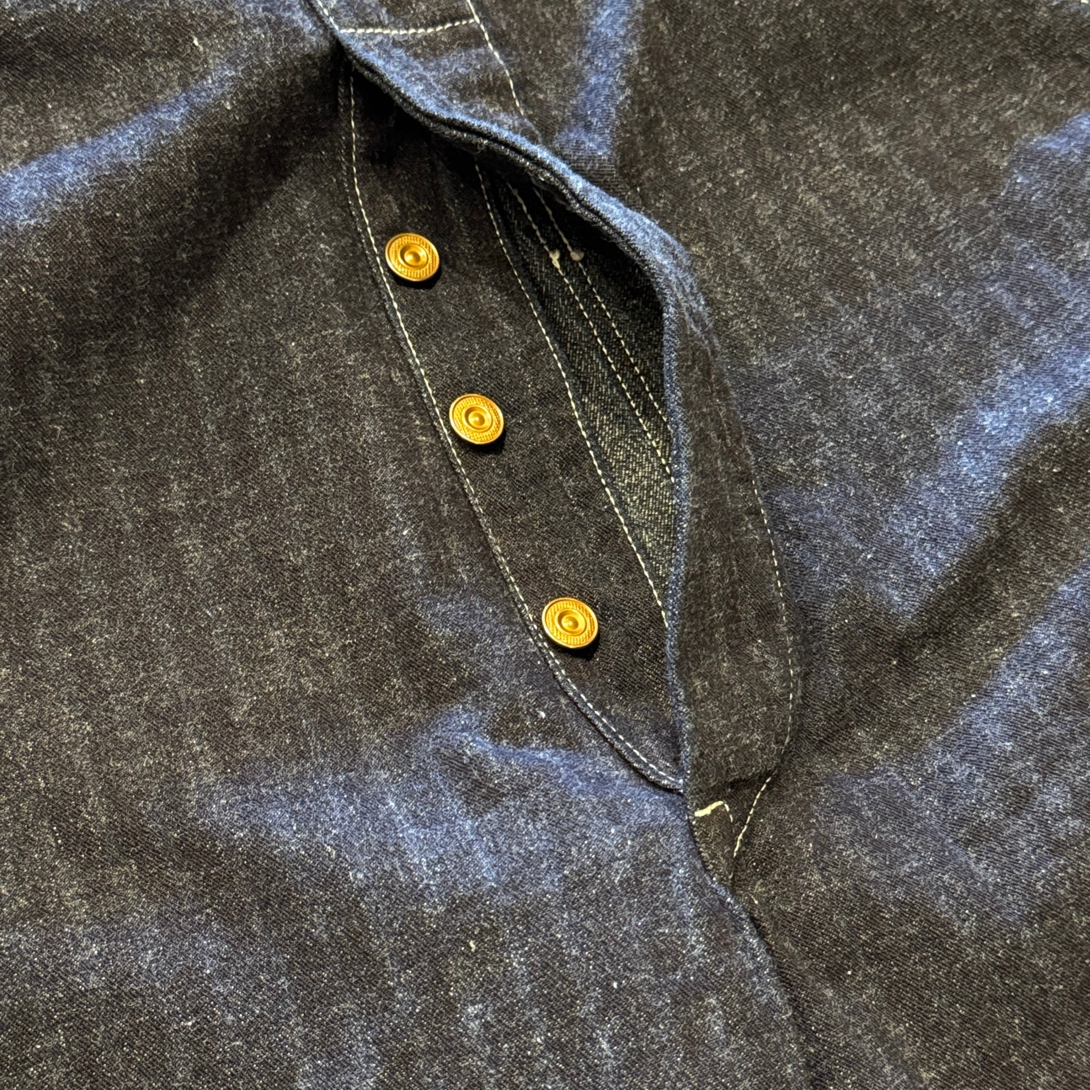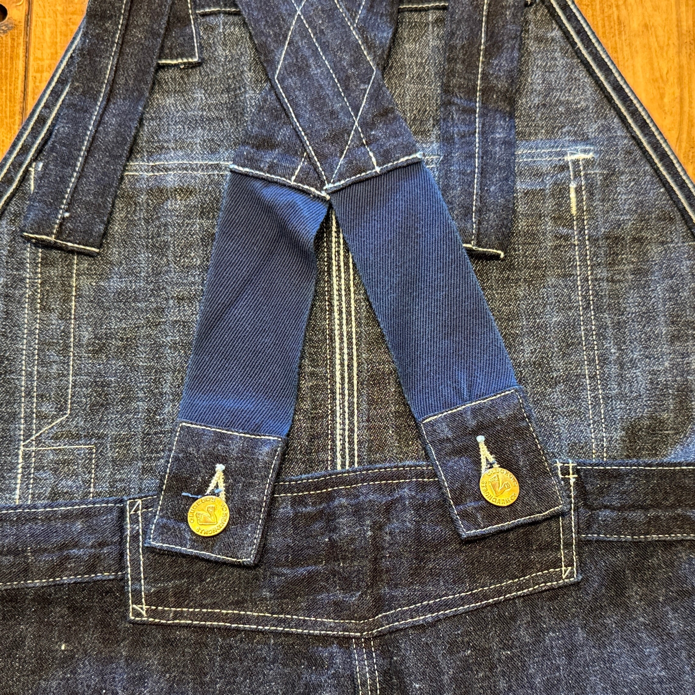 この衣料をウエアハウスチームに渡した時、彼らは完全に釘付けになりました。なぜならこのヴィンテージの服は珍しい織り方をしていました。私は彼らのスキルが試されると思いました。その衣料は色褪せしたストライプのデニムで、ポケットや縫い目の内側を探さなければ、かつての生地のベースだったインディゴの痕跡を見つけることができなかったのです。また、オーバーオールのリアポケットにはジャケットでは何度か見たことがあるが、パンツやオーバーオールでは見たことのない補強が施されています。こうして出来上がったのが「シャドーストライプ」のインディゴ・デニムを使ったストロングアーム・レインフォースド・オーバーオールなのです。(ジョングラッコー氏コメントより)