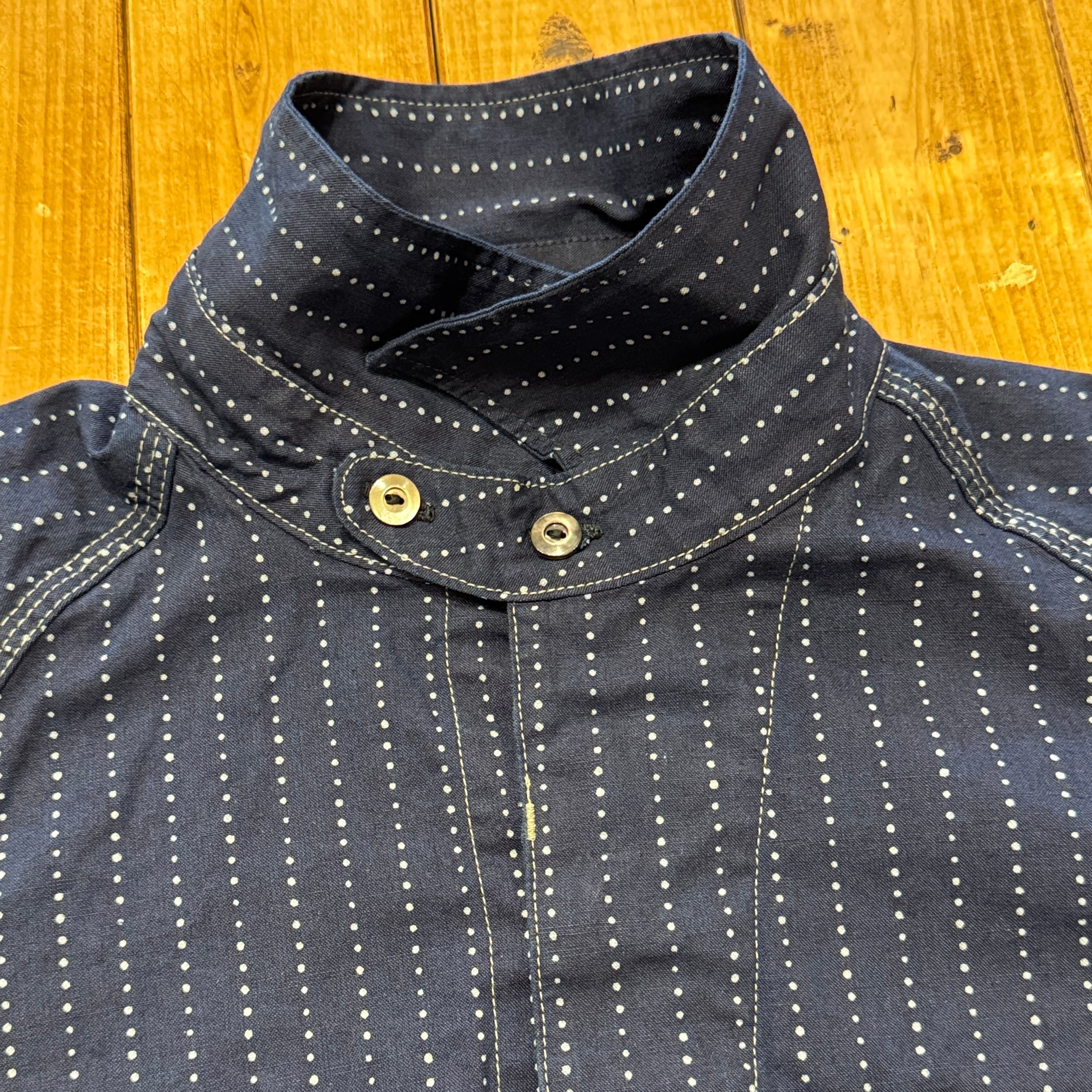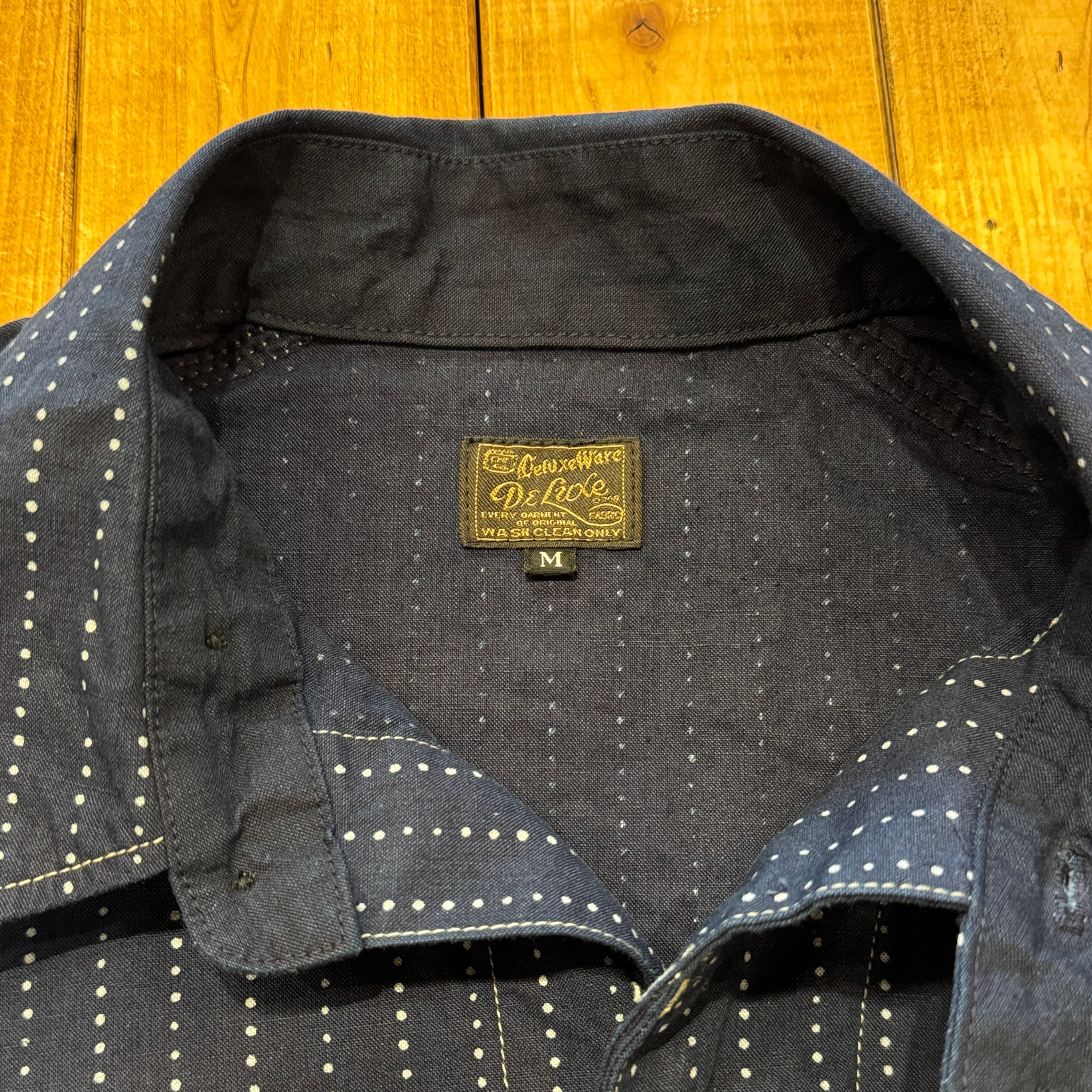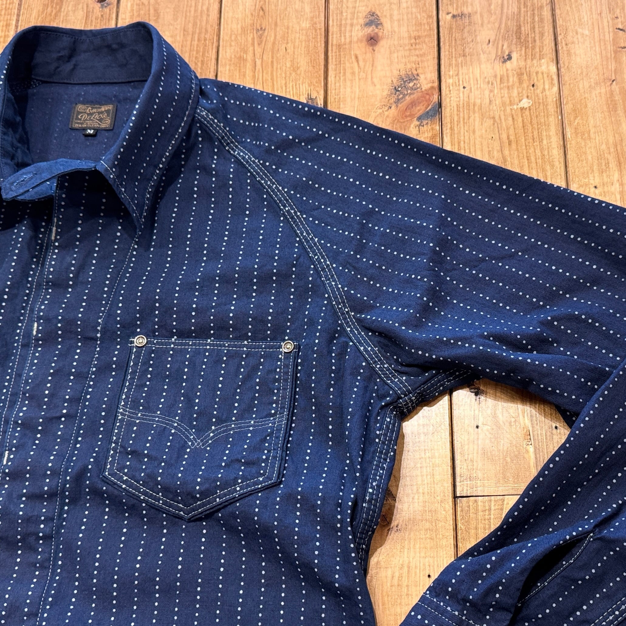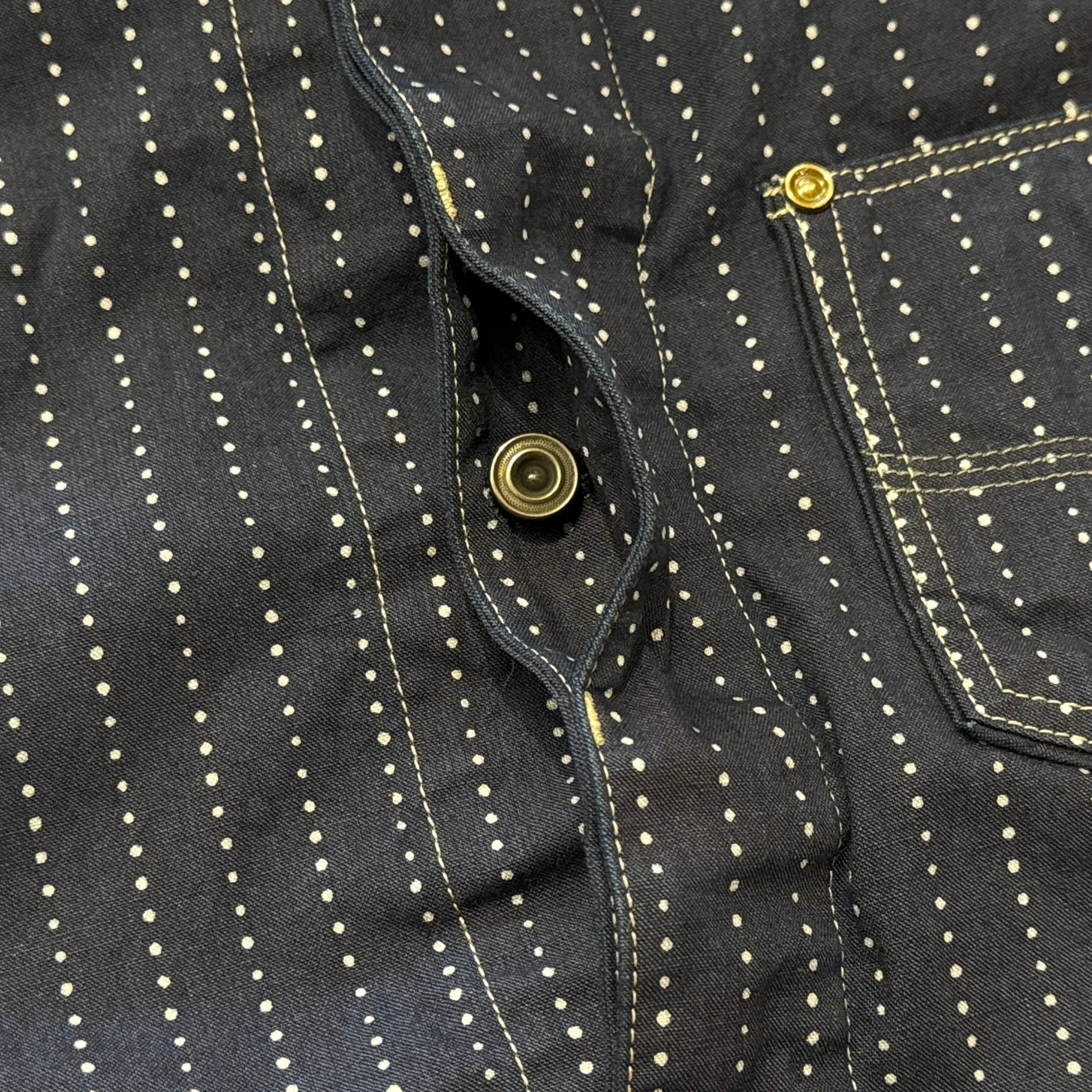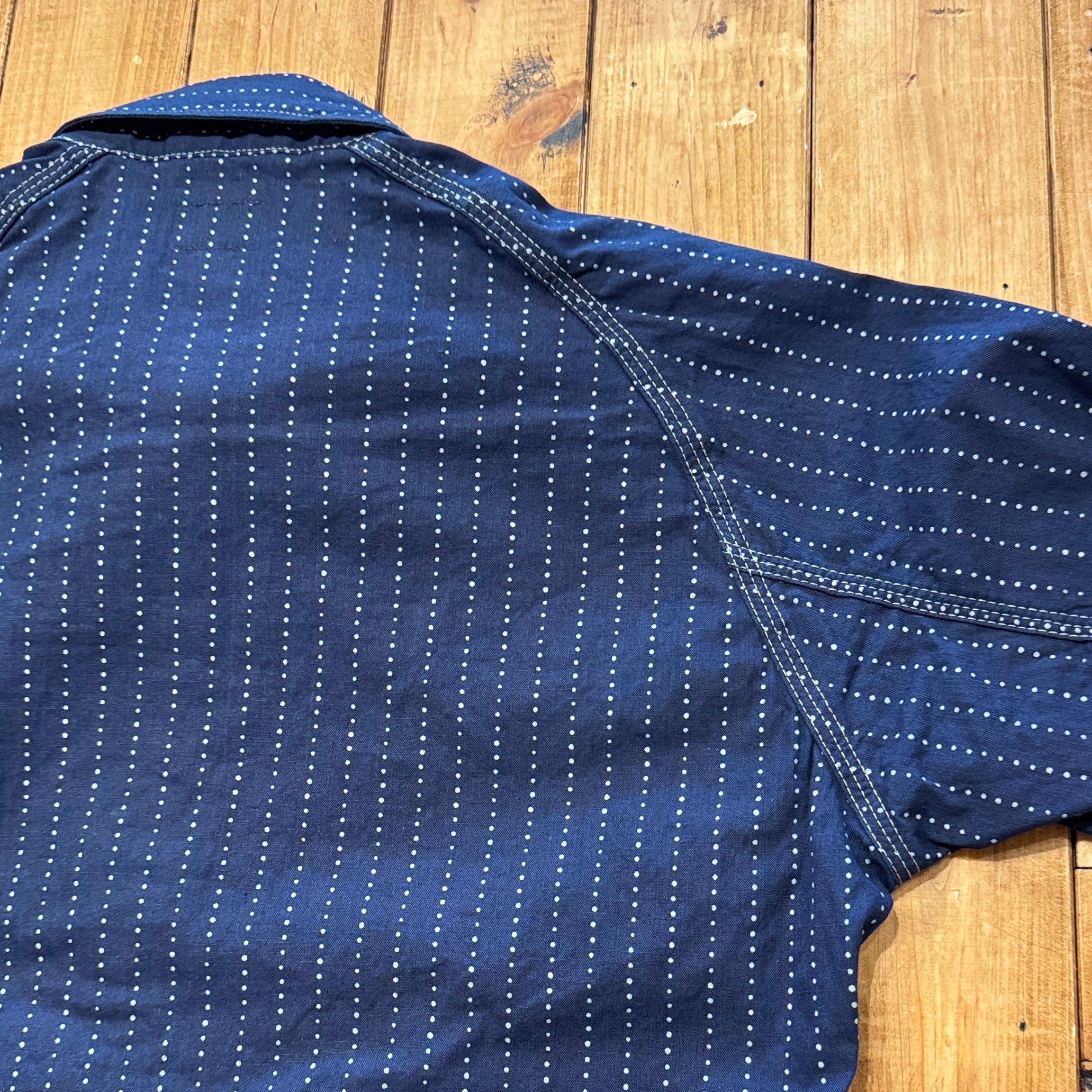 岡山県井原市で製造し広島県福山市でプリントを行ったインディゴウォバッシュ生地。経緯糸共にロープ染色のインディゴ織り糸を使用した素材に、手書き六角形ランダムドットにより着抜プリントを施しております。