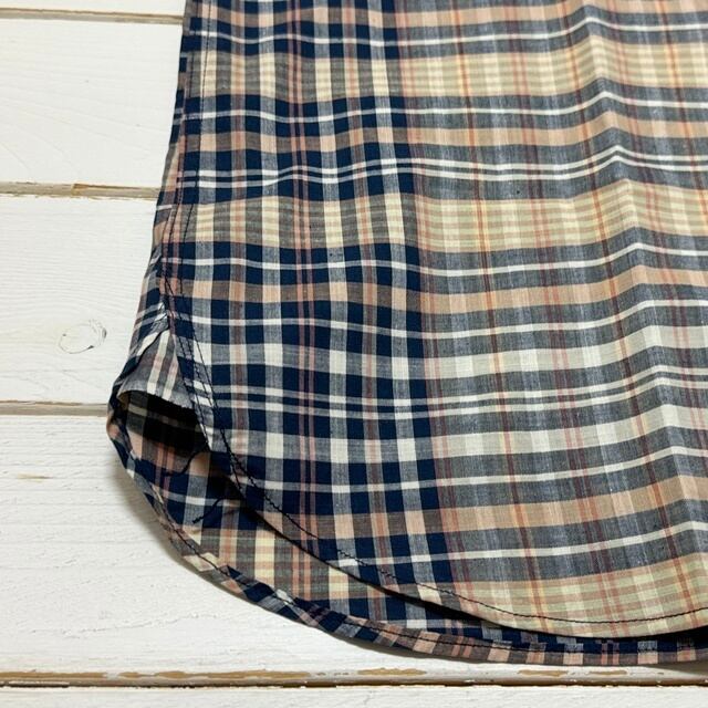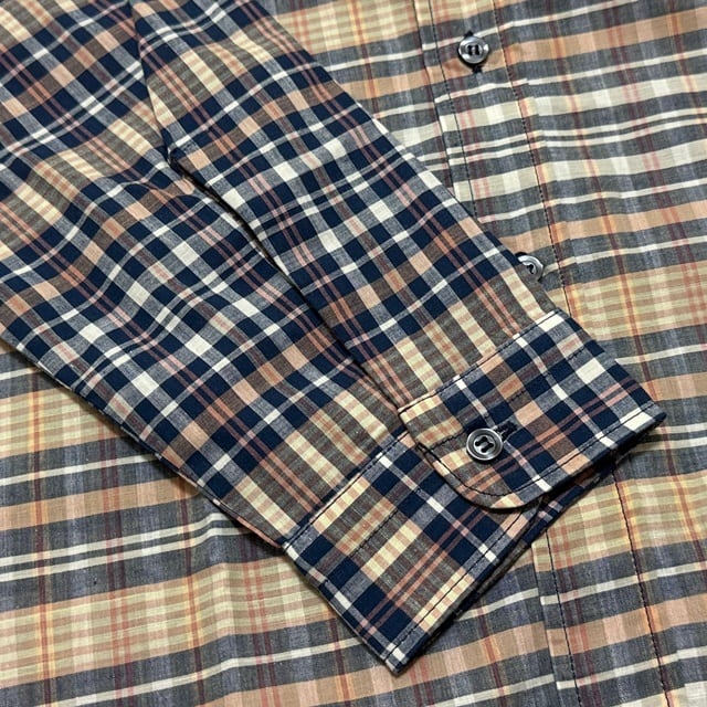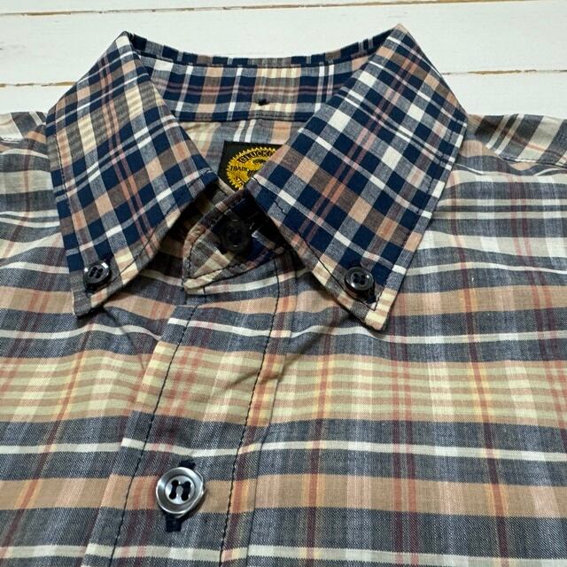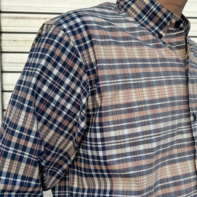 このマドラスシャツ生地は、非常にユニークな織り方でつくられているため、一見すると1枚のシャツに2種類の生地が使われているように見えるかもしれません。しかし、よく見ると、織機を半分に分割し、1つの織機幅の中で2つの格子柄を作り出したことが分かります。ブルー、ブラウン、タンの組み合わせは、私が今まで見た中で最も美しいシャツの一つです。(ジョングラッコー氏コメントより)