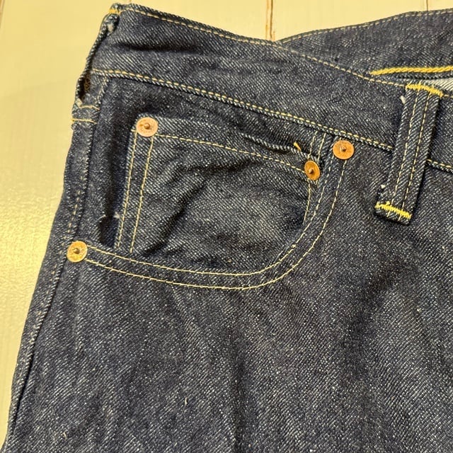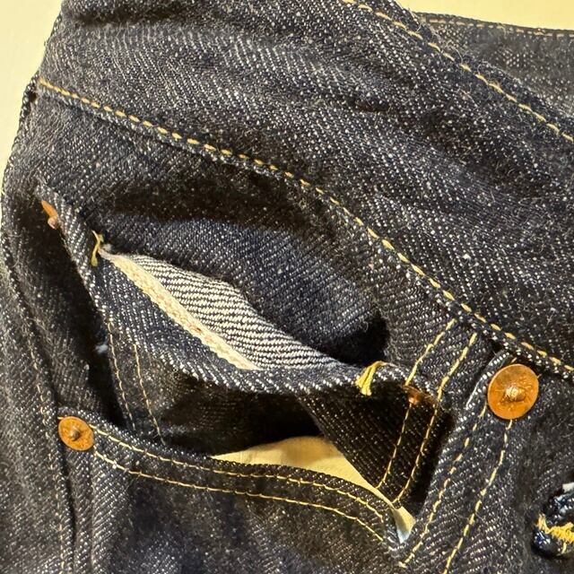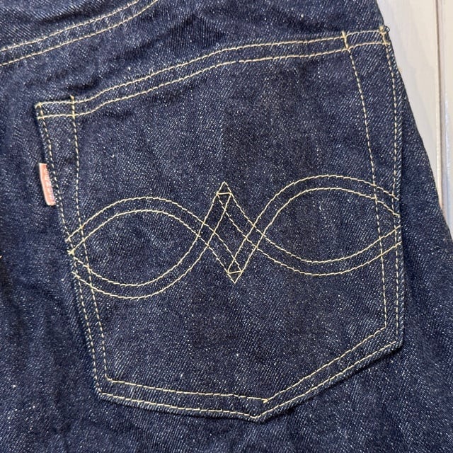 「デッドストック」という観点に、そのデニムを解析して糸番手から打ち込み本数まで新たに開発したデニムです。未使用のまま何十年も保管され、「酸化」した状態をイメージするため、全ての部材に経年変化を施しています。赤いピスネームは褪色しフェードピンクに。鉄製のボタンはその重みが伝わるかのような鈍い光沢を残したままやや黄変しています。鉄製で銅メッキされたリベットはそれぞれランダムな表情で穿たれ、革ラベルは当時の肉感と歪さを再現するため、アパレル製品では使用することの少ない「渋鞣し」のディアスキンを使用しています。